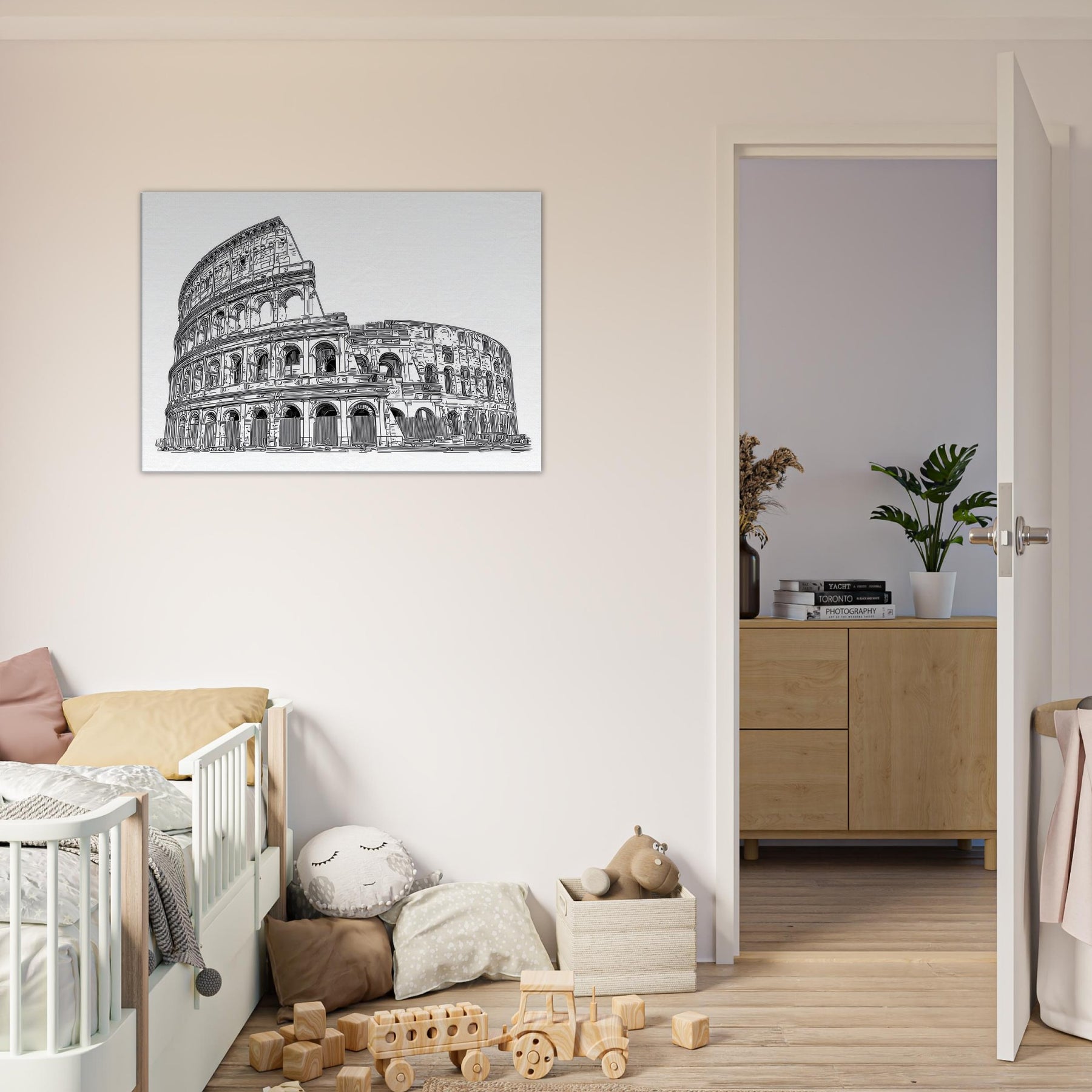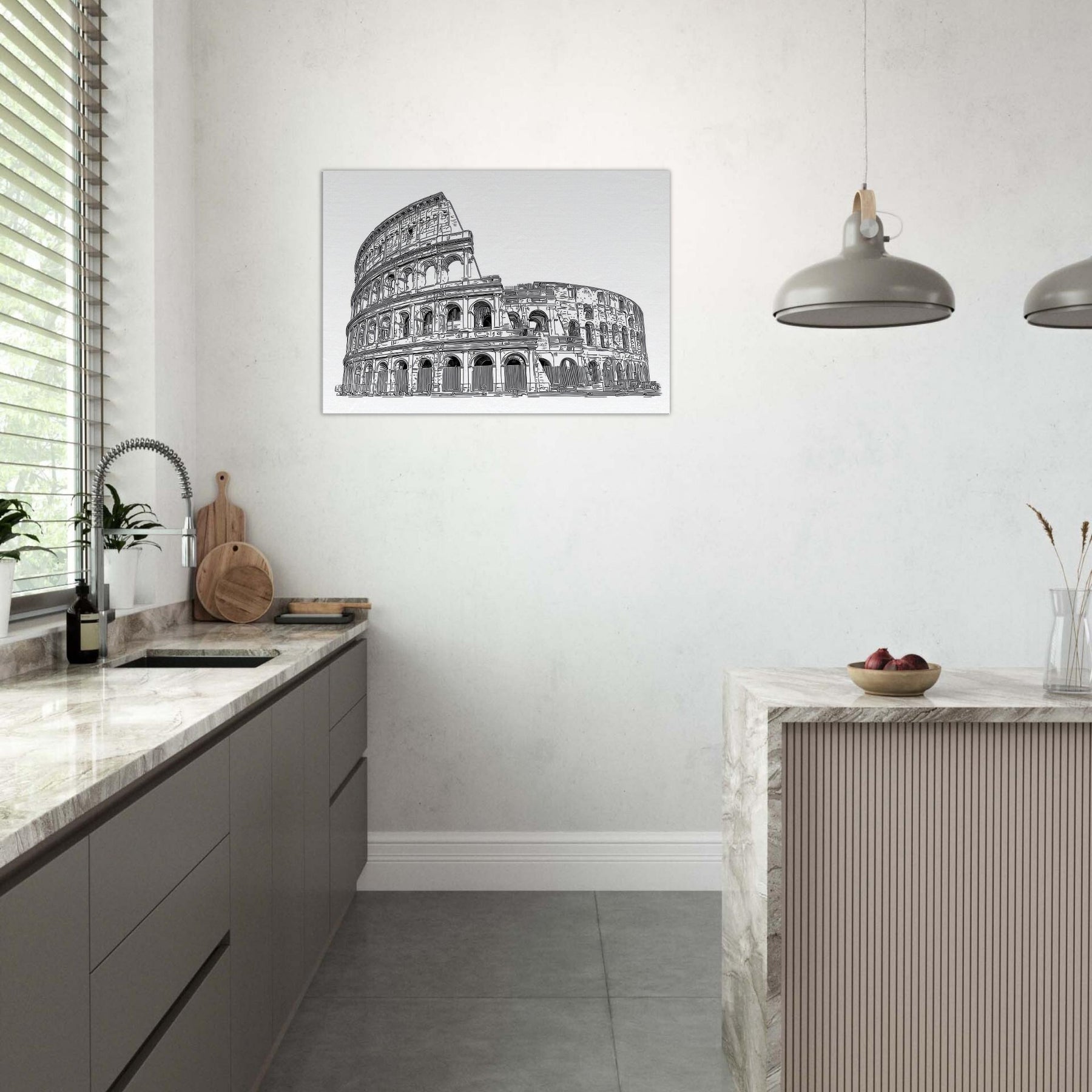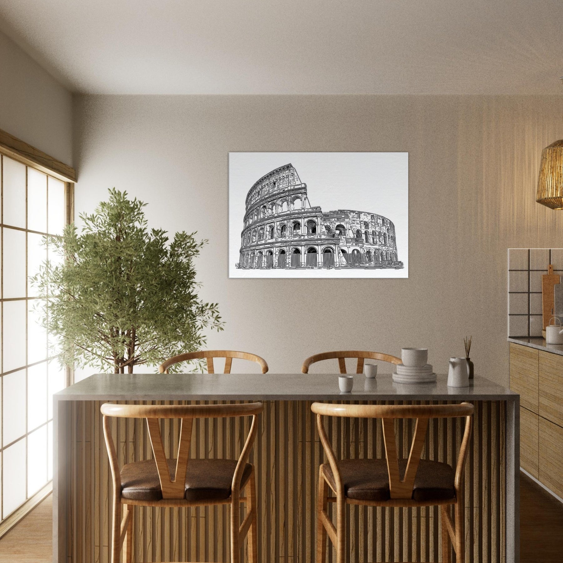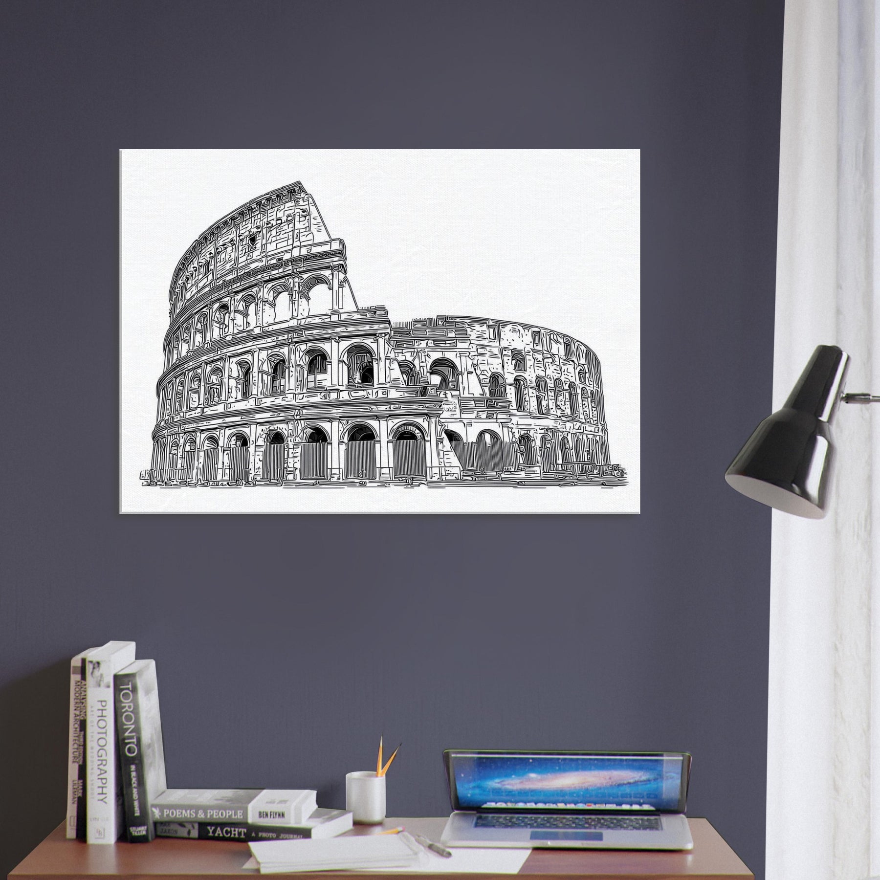 Let the timeless arches of Rome unfold in your space with quiet elegance. This refined line drawing captures the Colosseum's terraces and arches in a living room friendly monochrome, inviting the eye to trace its elegant contours. The minimalist black and white palette adds drama without overpowering, making it ideal for a serene corner, study, or above a sofa. In morning light or evening glow, the piece feels airy and timeless, turning everyday moments into a quiet passport to history and architectural poetry.