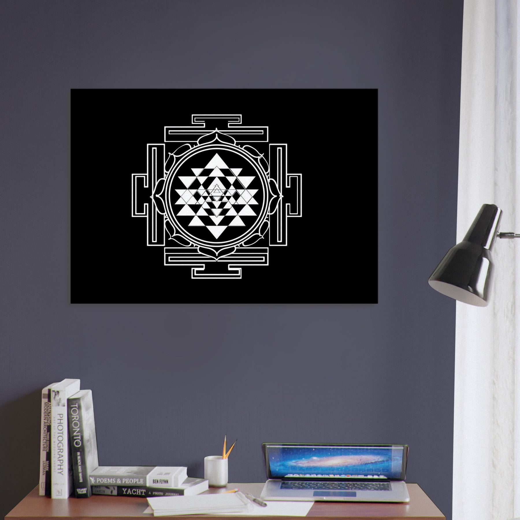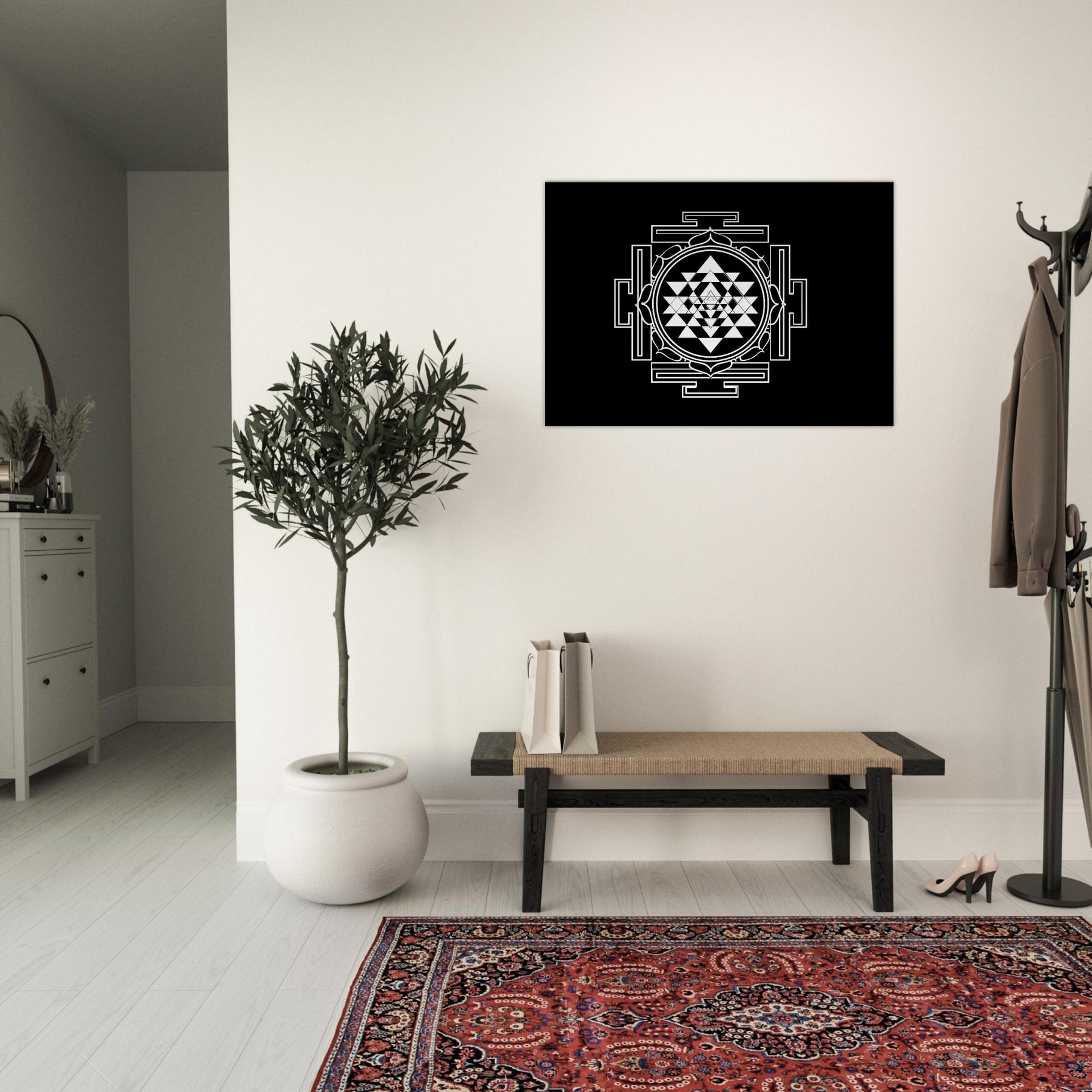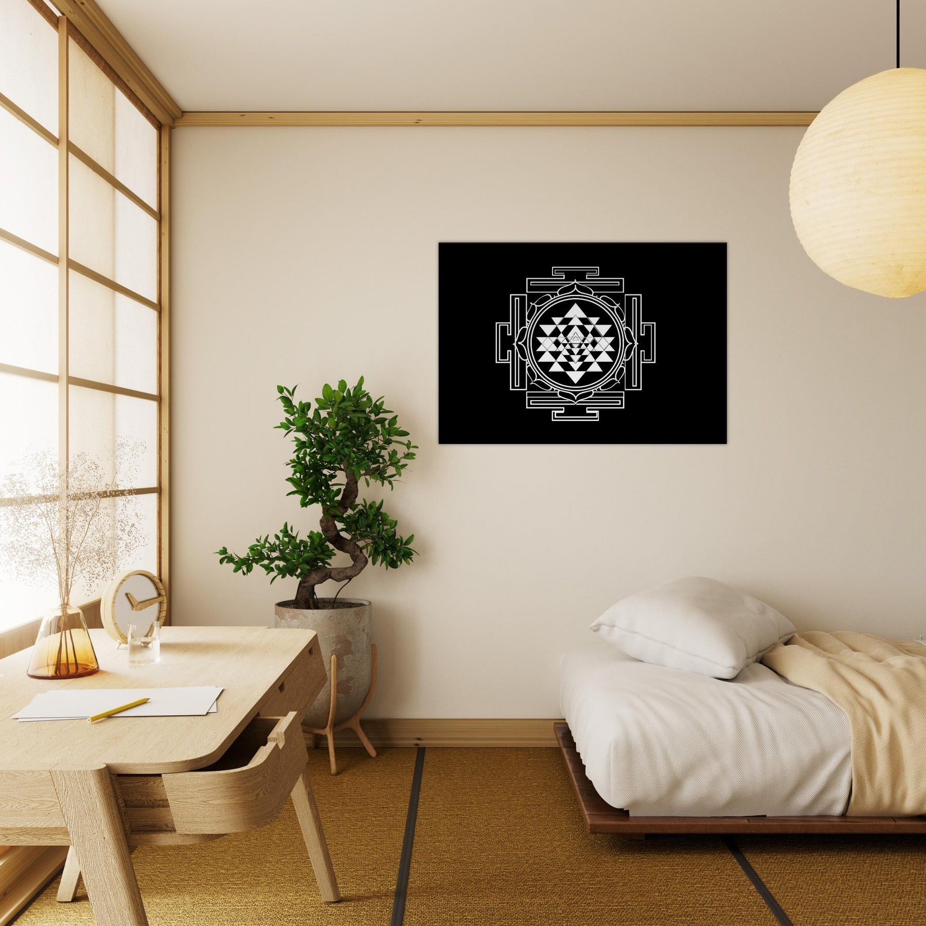 Immerse your wall in a meditative event of geometry and breath. This line art depiction of the Sri Yantra unfolds in crisp white contours, each triangle stepping toward center like whispered mantras. The circular frame and angular gateways create a calm, breathing rhythm that steadies a room and invites quiet reflection. Perfect above a sofa, in a corridor, or a study, it lends a sacred, mystical presence an ethereal focal point that deepens color with restraint and light with intention.