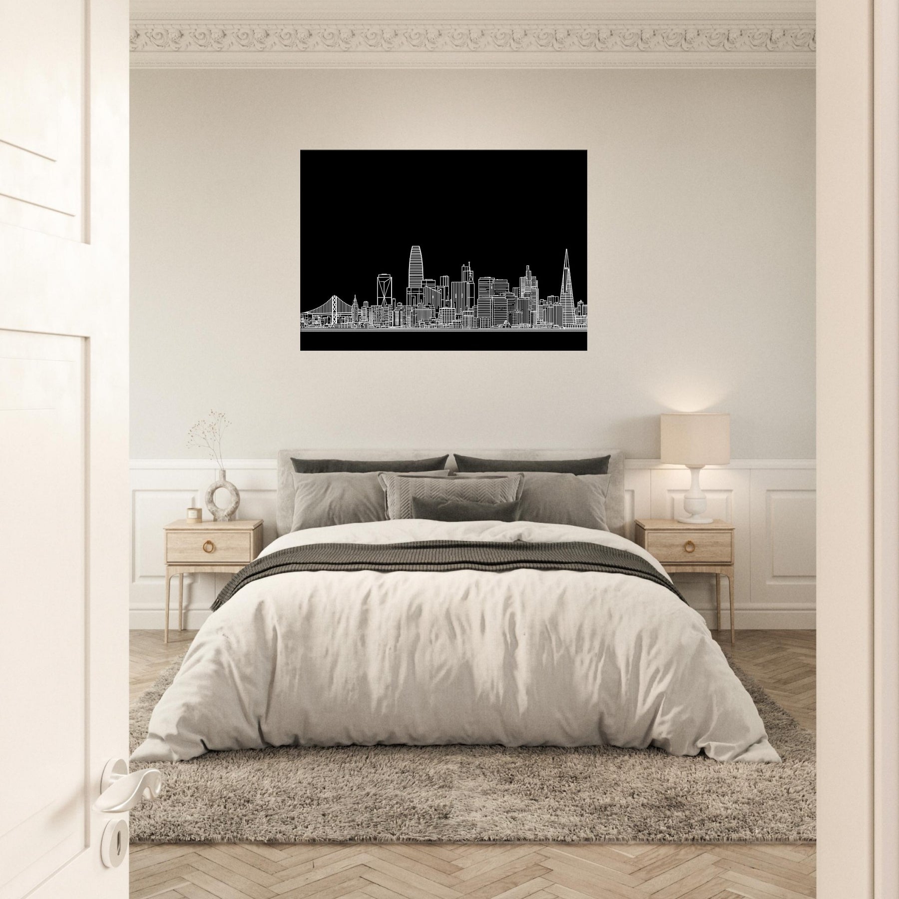 San Francisco rises in clean, continuous lines that breathe on the wall. This line art skyline channels the city's cadence the bridges, towers, and waterfront glow without crowding your space. The result is a calm, cinematic panorama that invites quiet reflection, pairs beautifully with warm wood or cool monochrome palettes, and adds urban elegance to any living room, study, or hallway. A subtle, everyday escape that makes rooms feel open, enlightened, and endlessly inspired.