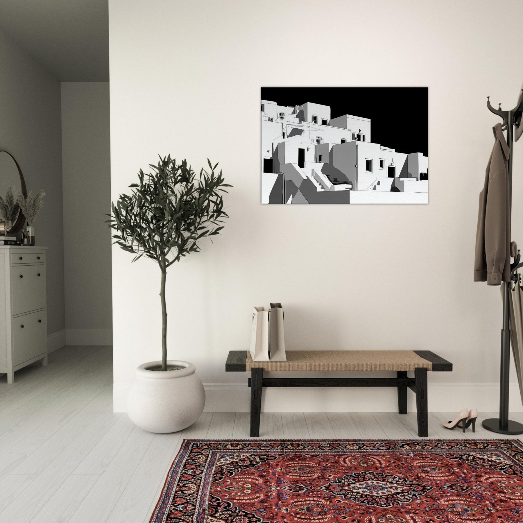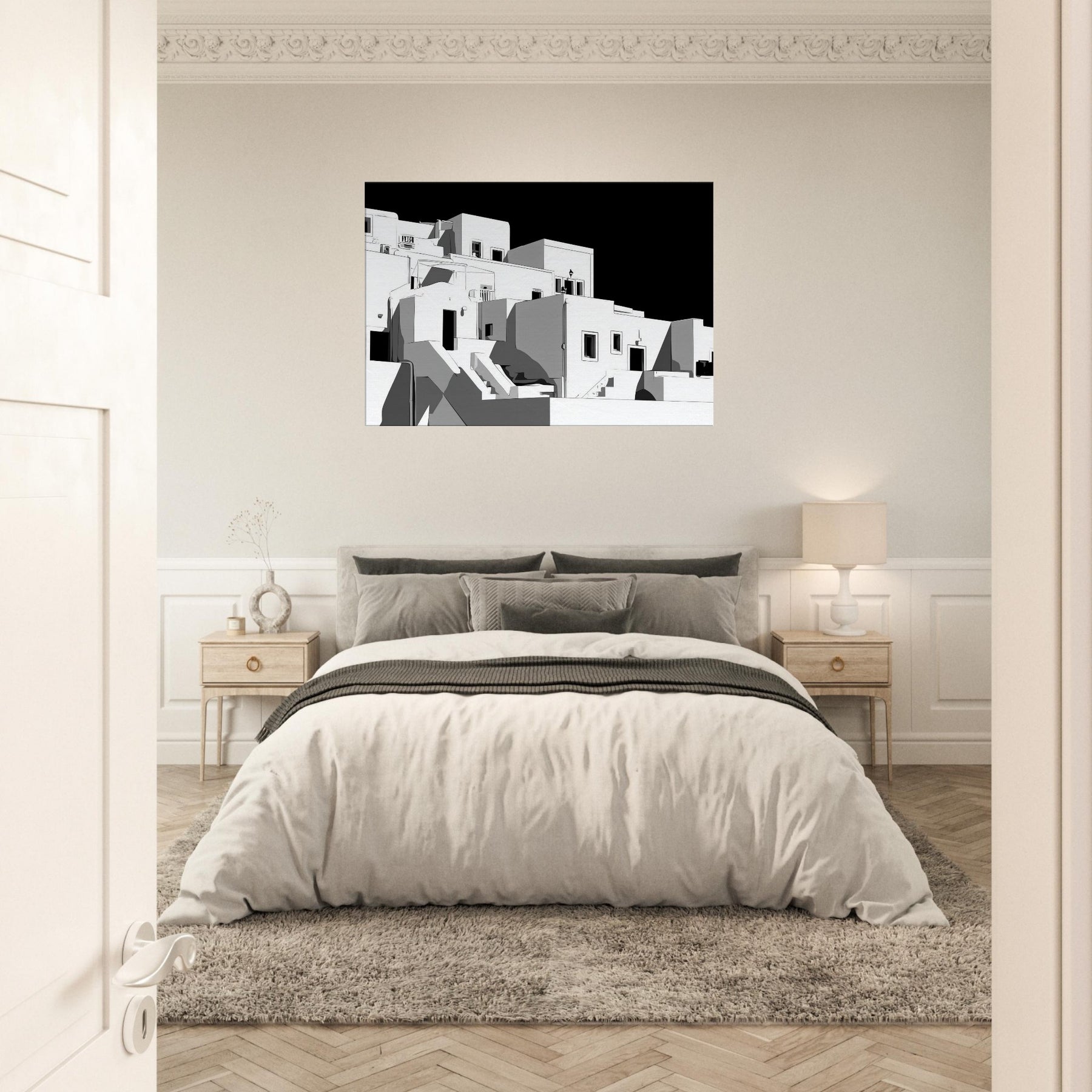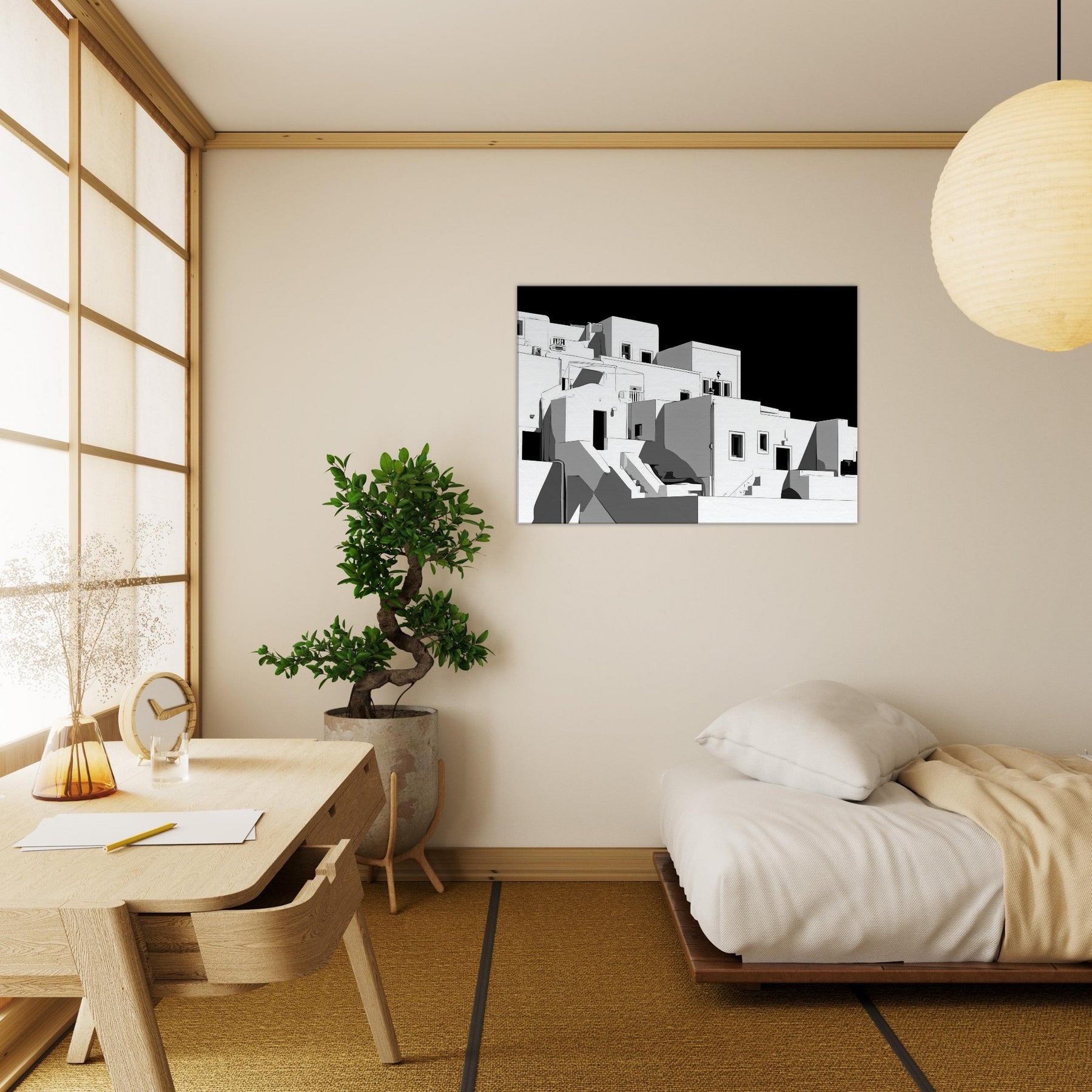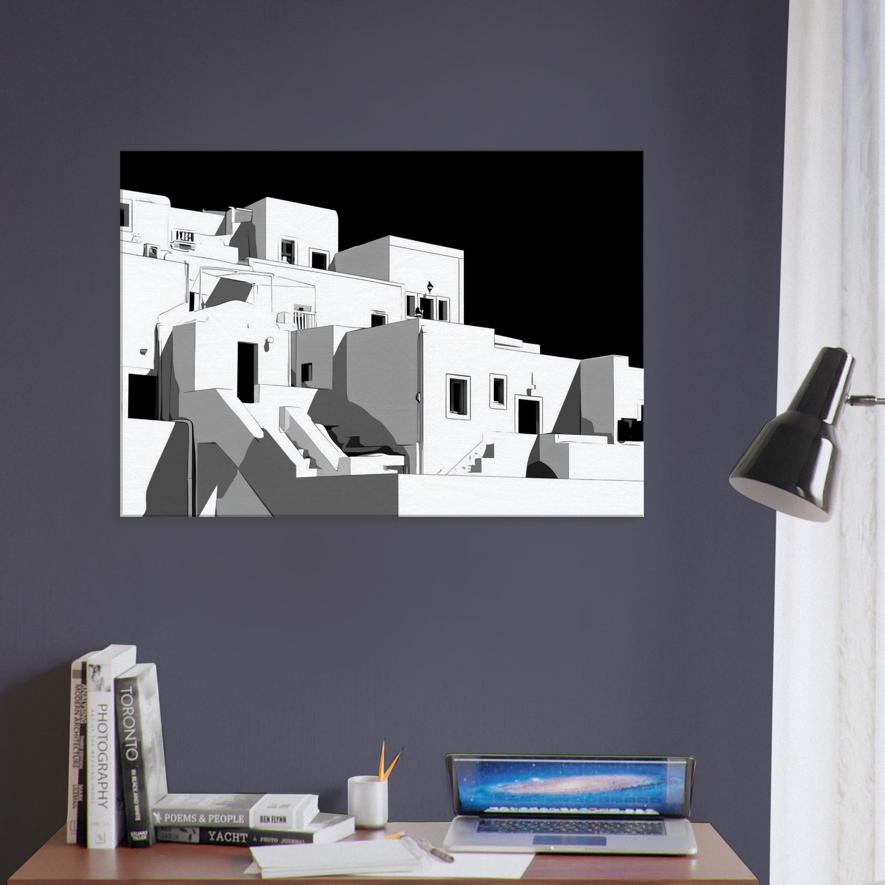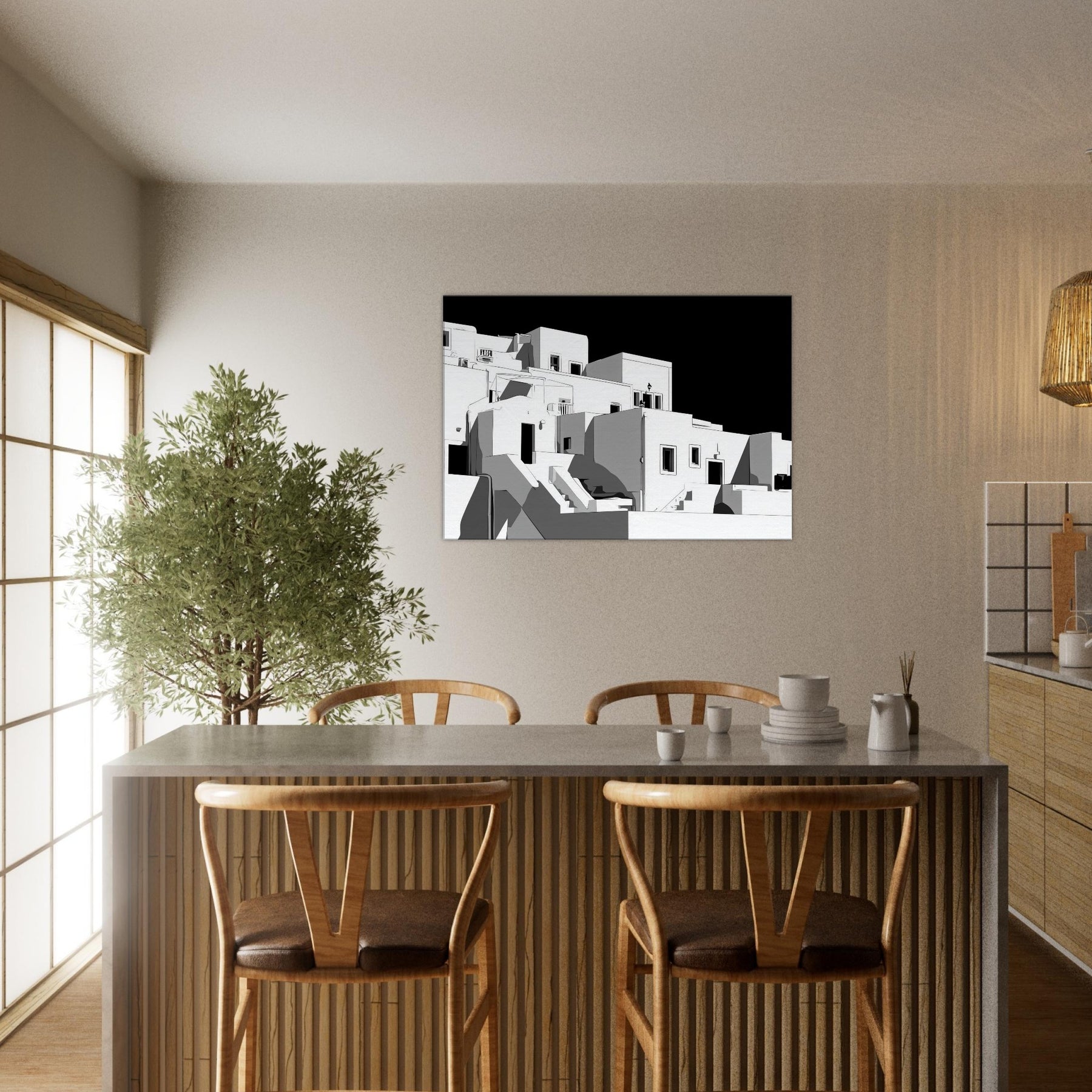 Immerse your living space in the serene geometry of Santorini, rendered as a refined line drawing. This piece captures the island’s crown of whitewashed steps, shadowed arches, and sun washed planes with quiet elegance. The high contrast black and white palette invites calm, while the crisp contours evoke Mediterranean breezes and long coastal horizons. Perfect over a console or in a reading nook, it adds architectural clarity and a sculptural breath, turning walls into a tranquil gallery of light and memory.