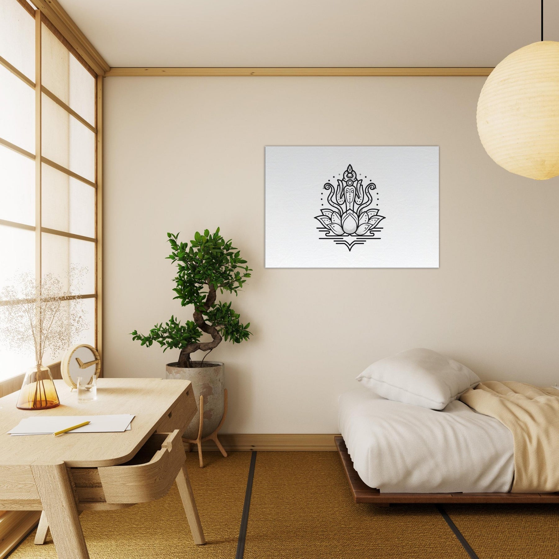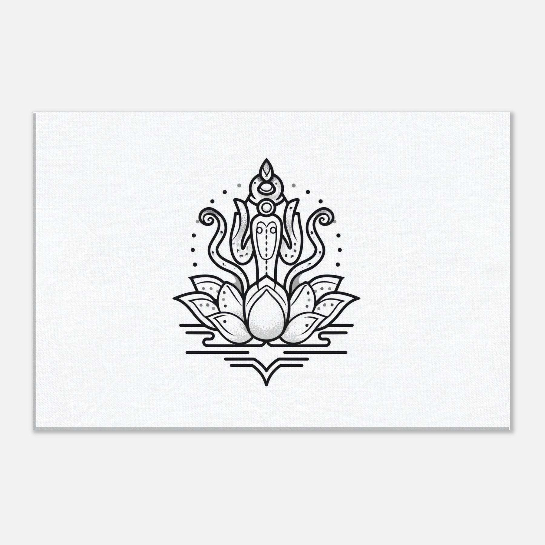 Saraswati blooms in quiet grace, rendered with elegant contours that invite a breath, a pause, a thoughtful moment. This minimalist line work captures the goddess of knowledge resting on a submerged lotus, surrounded by subtle halos and lunar dotwork. The result is a serene, monochrome presence that grows with your space, bringing clarity to a desk corner, calm to a living room, and a whisper of ritual to everyday life. Hang it where you study, write, or dream, and let inspiration flow.