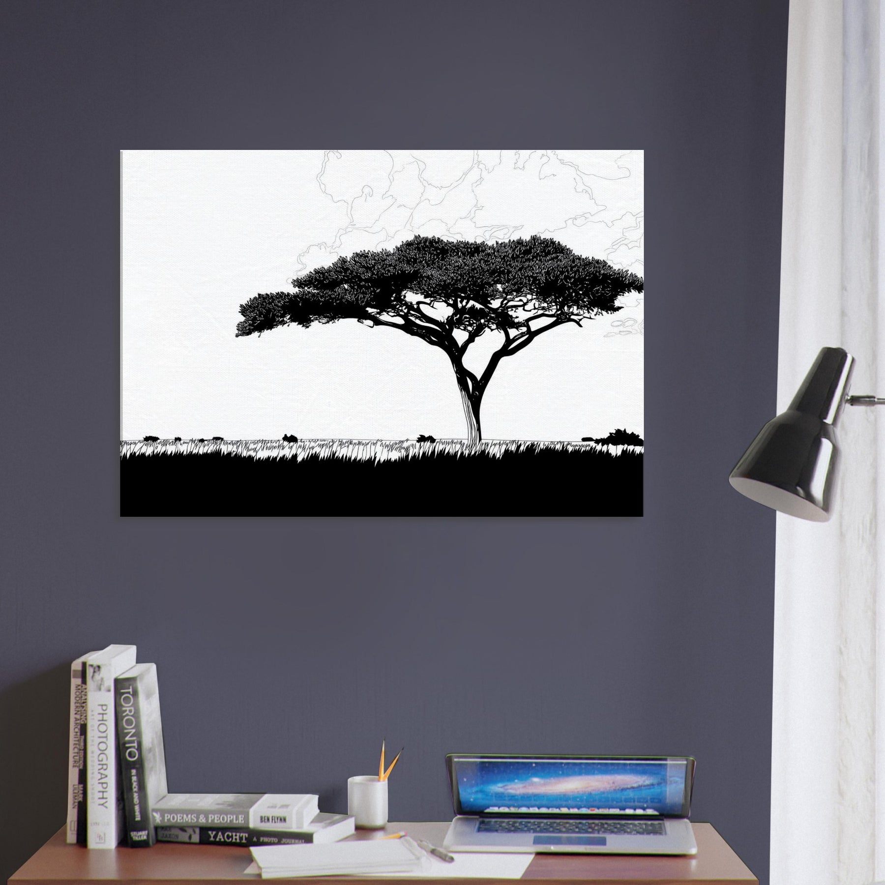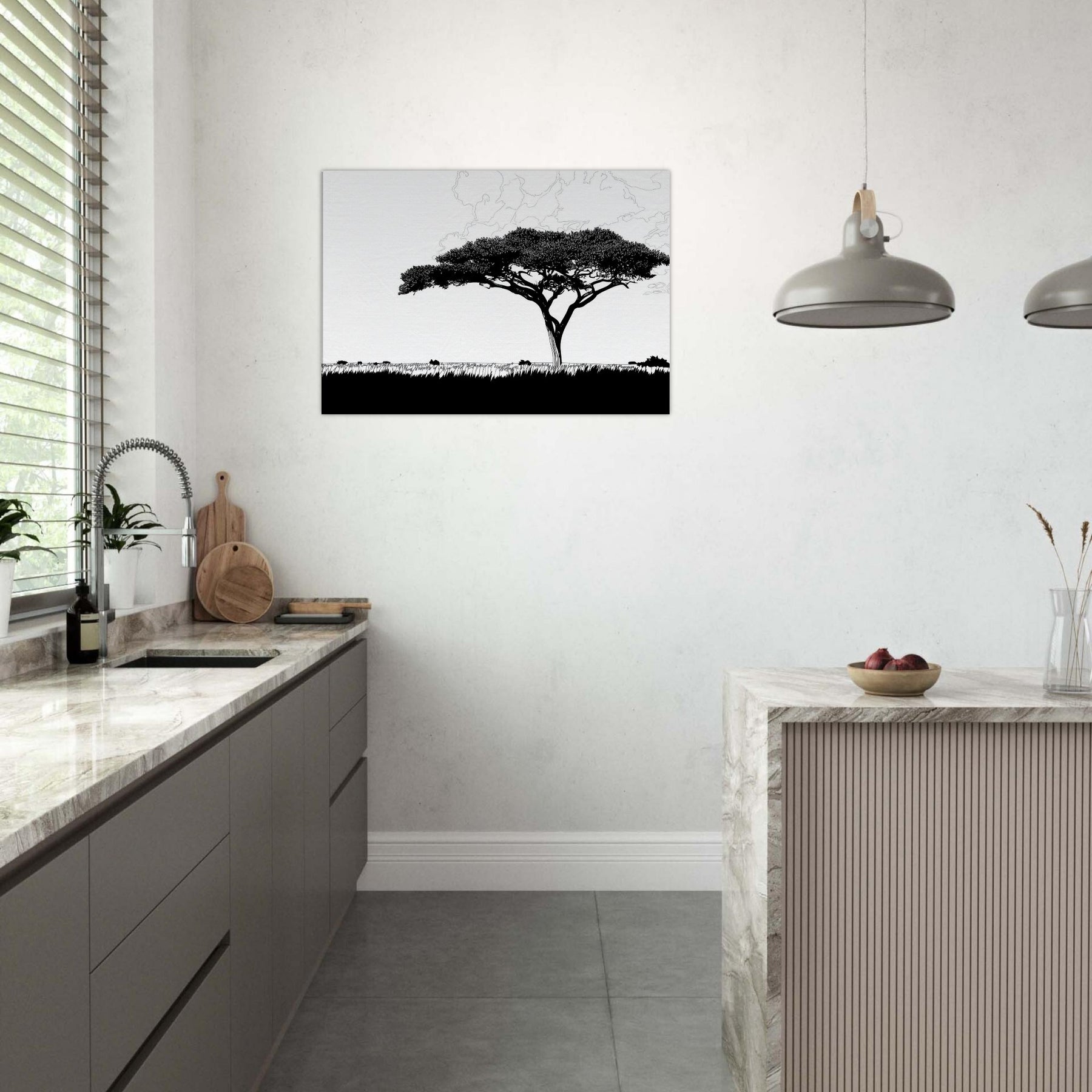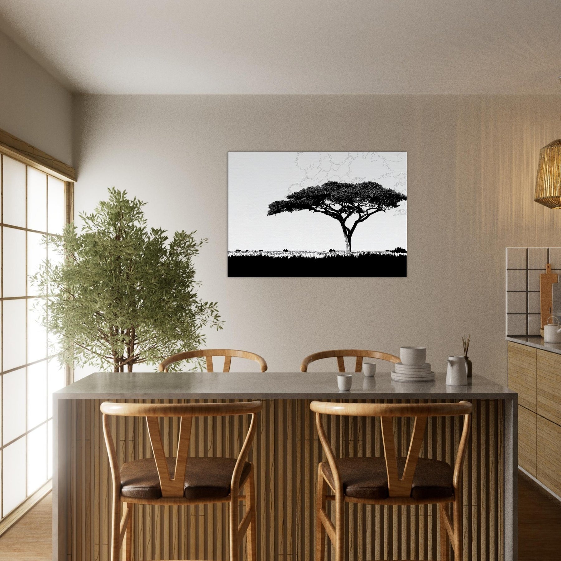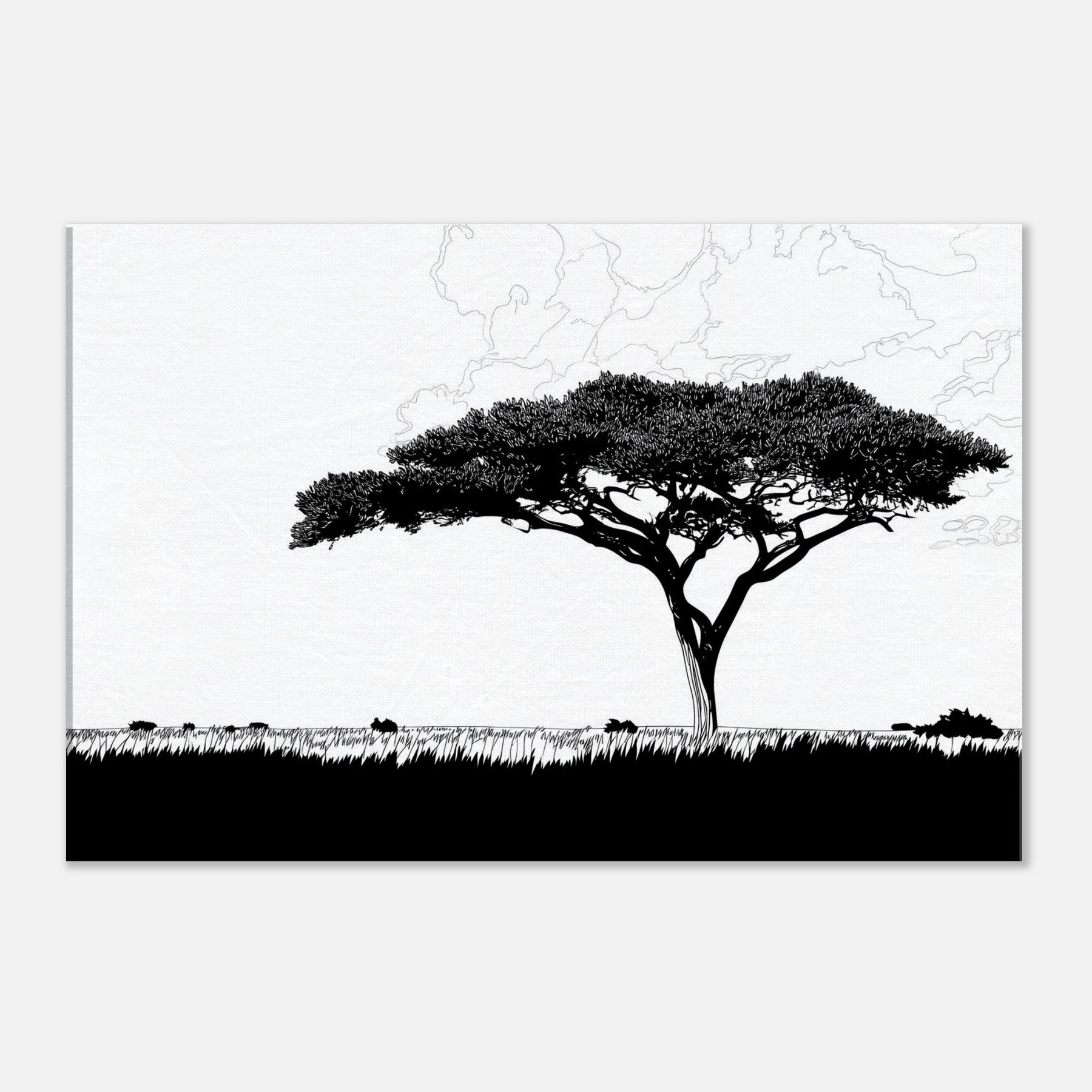 With a single, sweeping silhouette, this line art study of the Savannah invites stillness into your room. The tree’s elegant crown threads of black ink float above a pale horizon, breathing atmosphere into living spaces. Its restrained, continuous lash of lines evokes warm afternoon light, wind worn grass, and the vast calm of a distant Savannah. Hang it in a living room or hallway to sculpt negative space, create contrast, and invite a contemplative, nature forward mood into daily life.