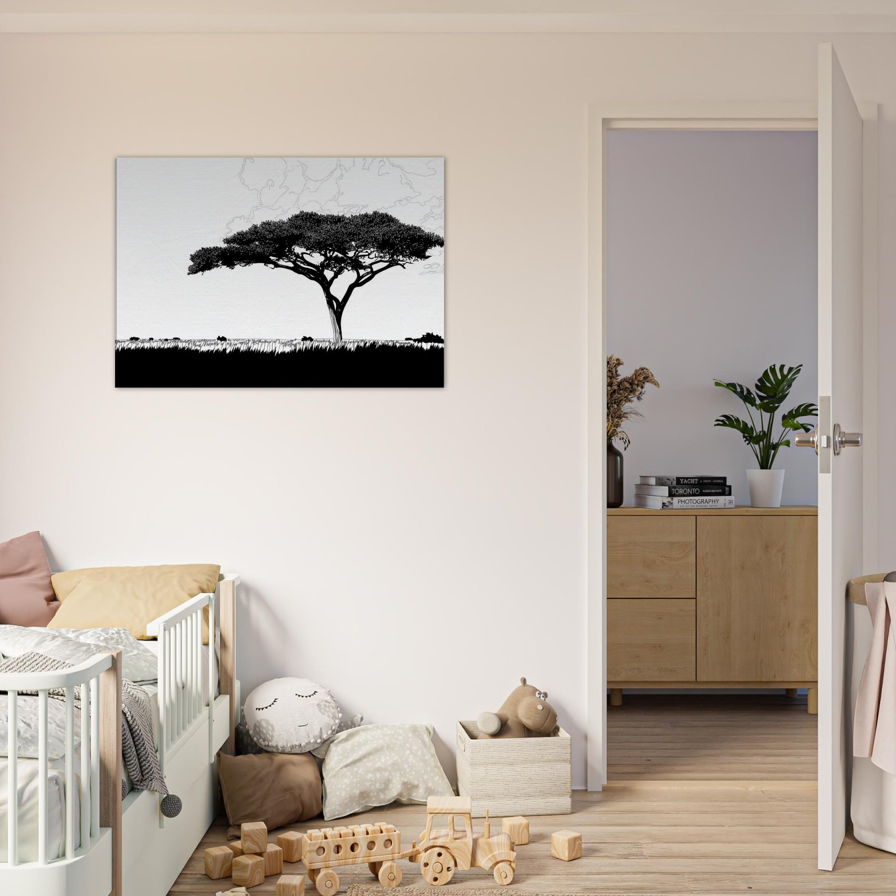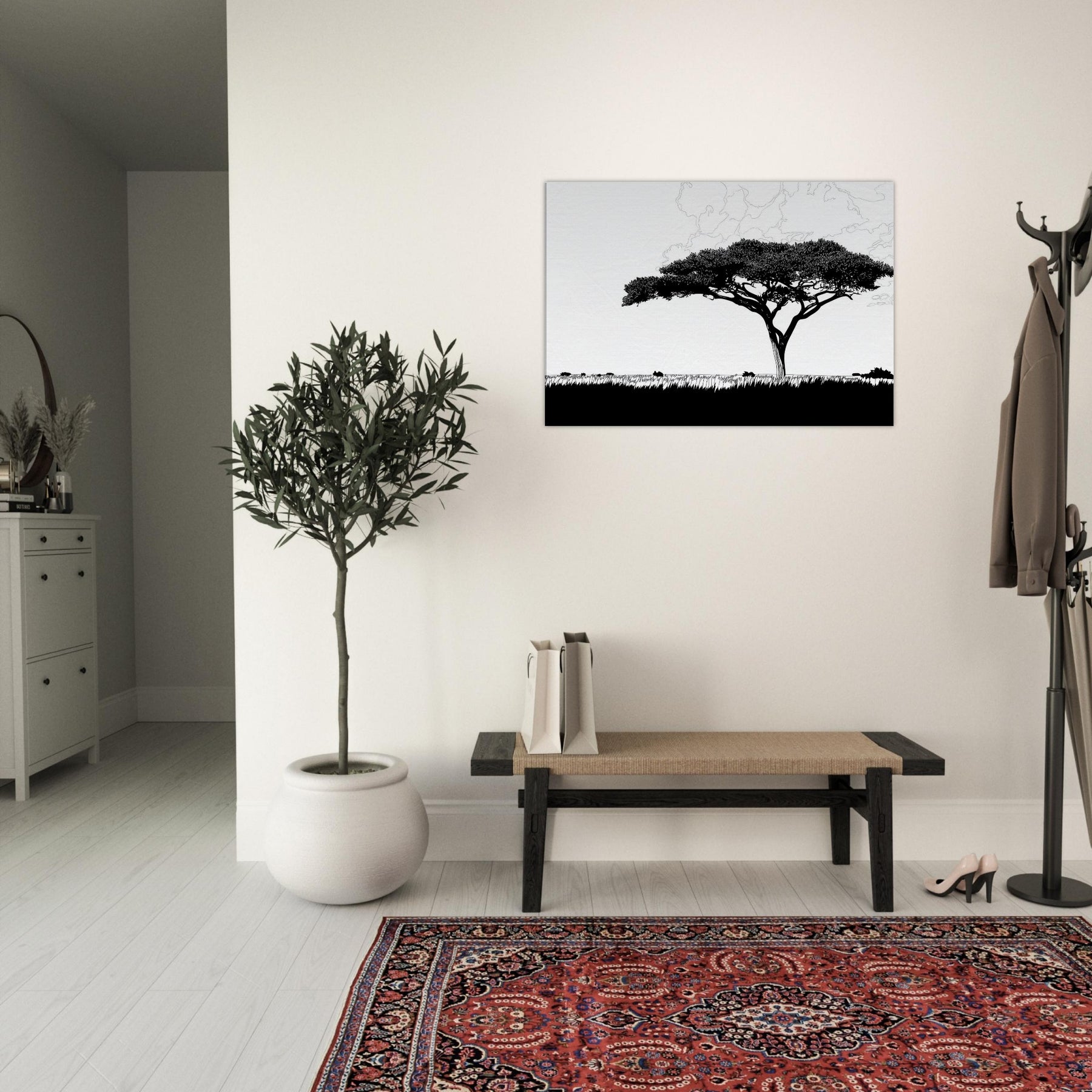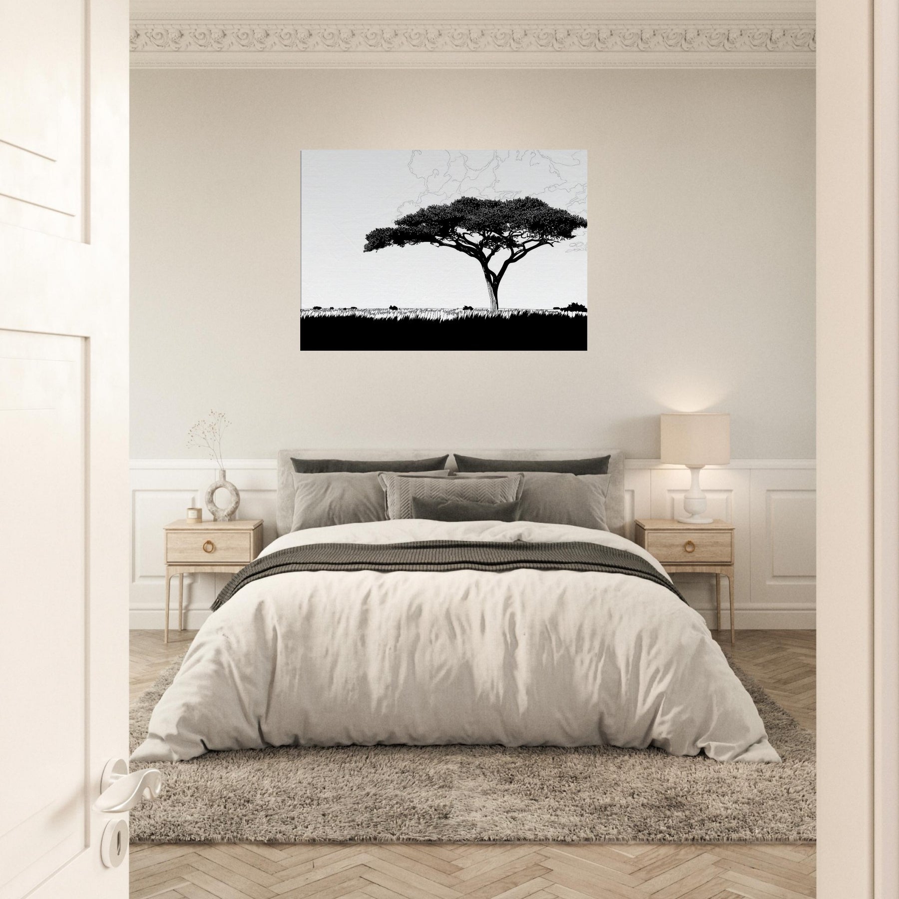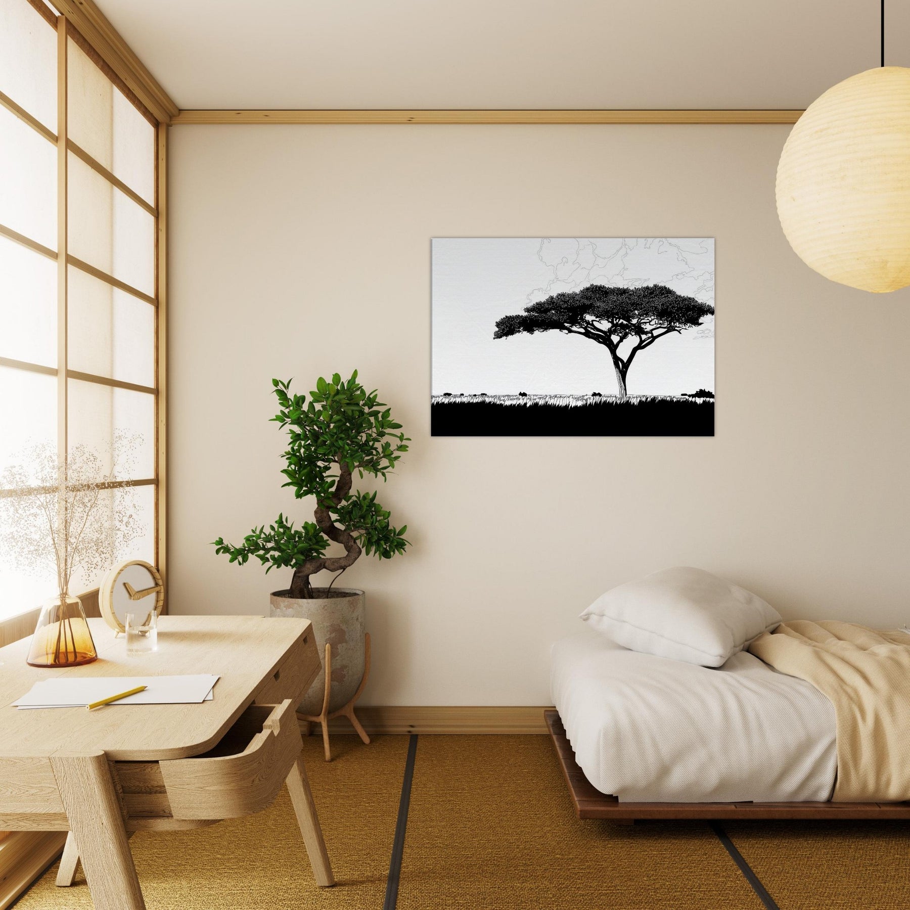 With a single, sweeping silhouette, this line art study of the Savannah invites stillness into your room. The tree’s elegant crown threads of black ink float above a pale horizon, breathing atmosphere into living spaces. Its restrained, continuous lash of lines evokes warm afternoon light, wind worn grass, and the vast calm of a distant Savannah. Hang it in a living room or hallway to sculpt negative space, create contrast, and invite a contemplative, nature forward mood into daily life.