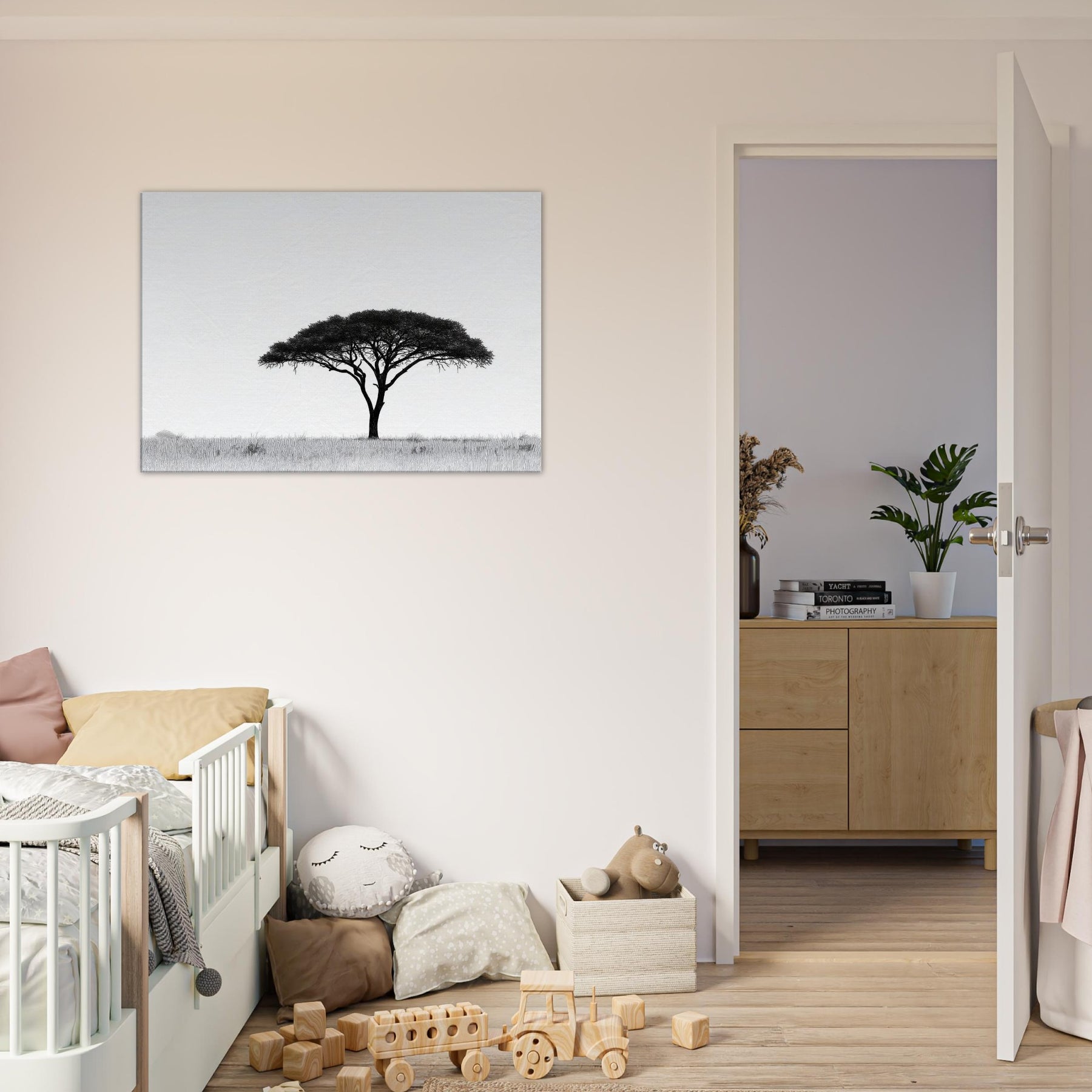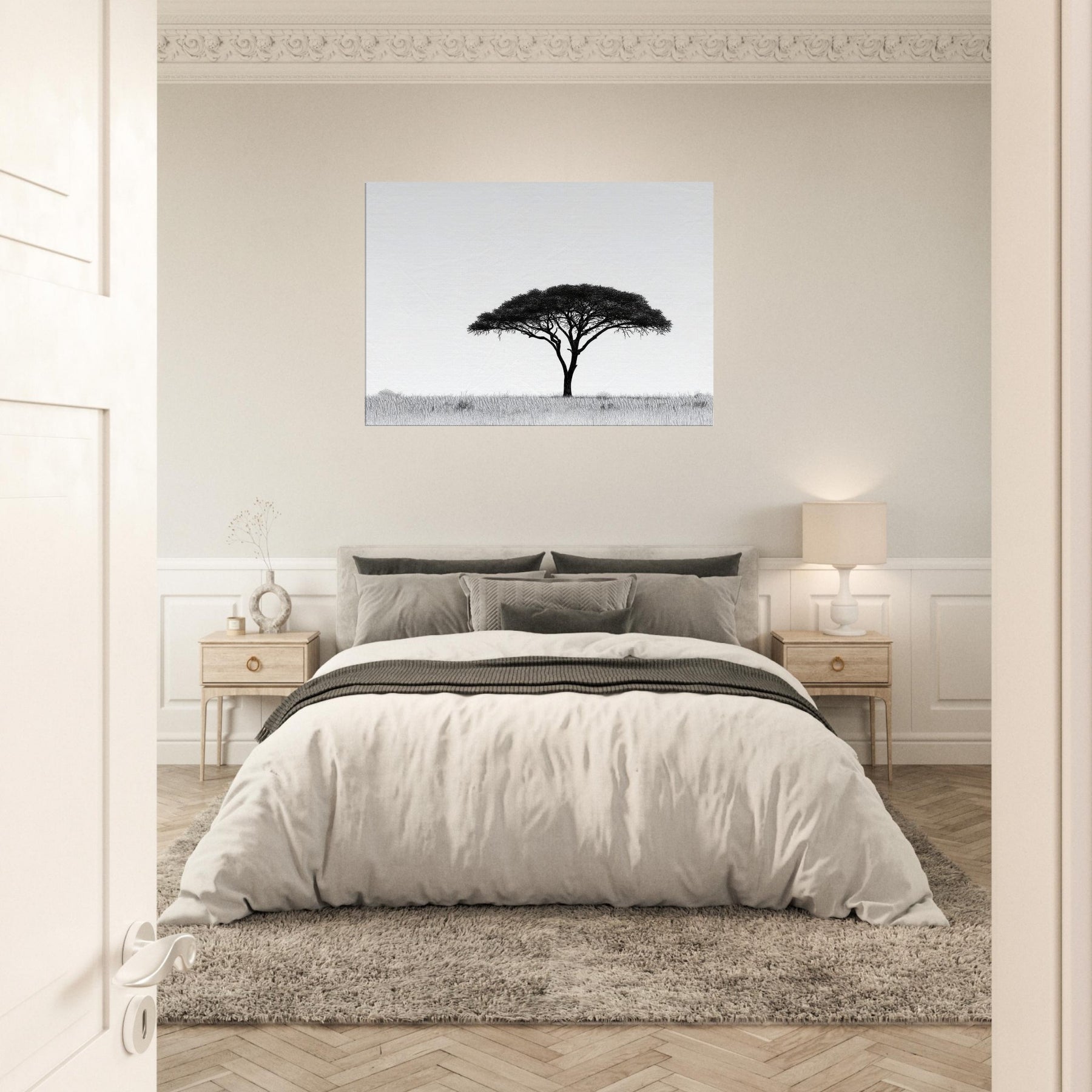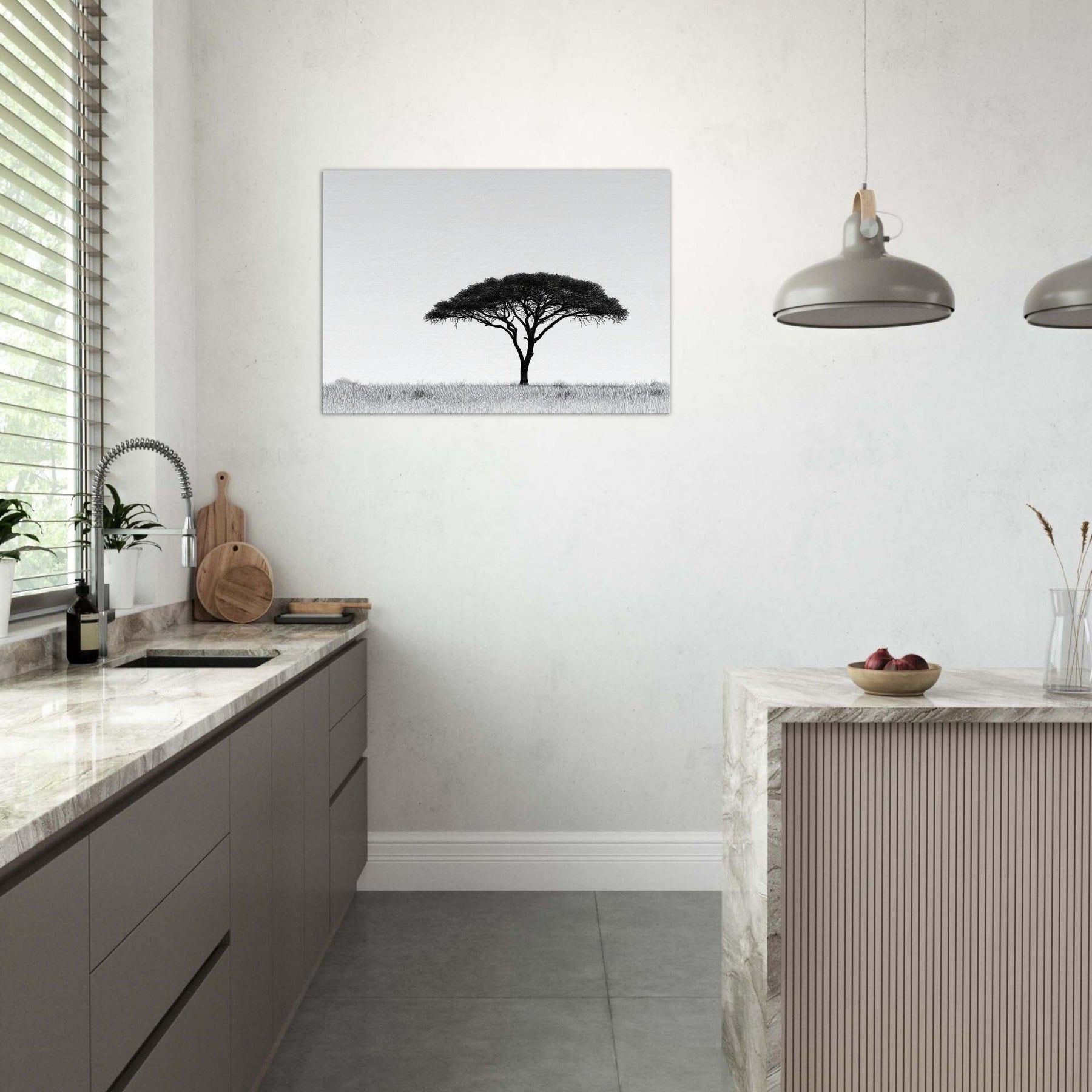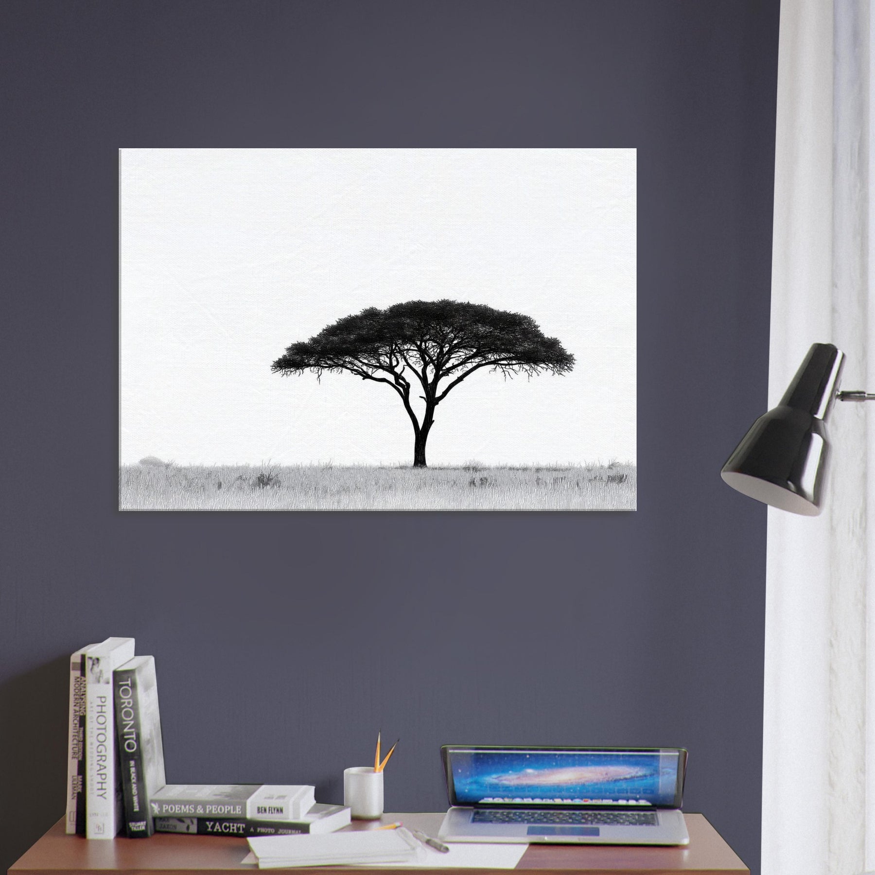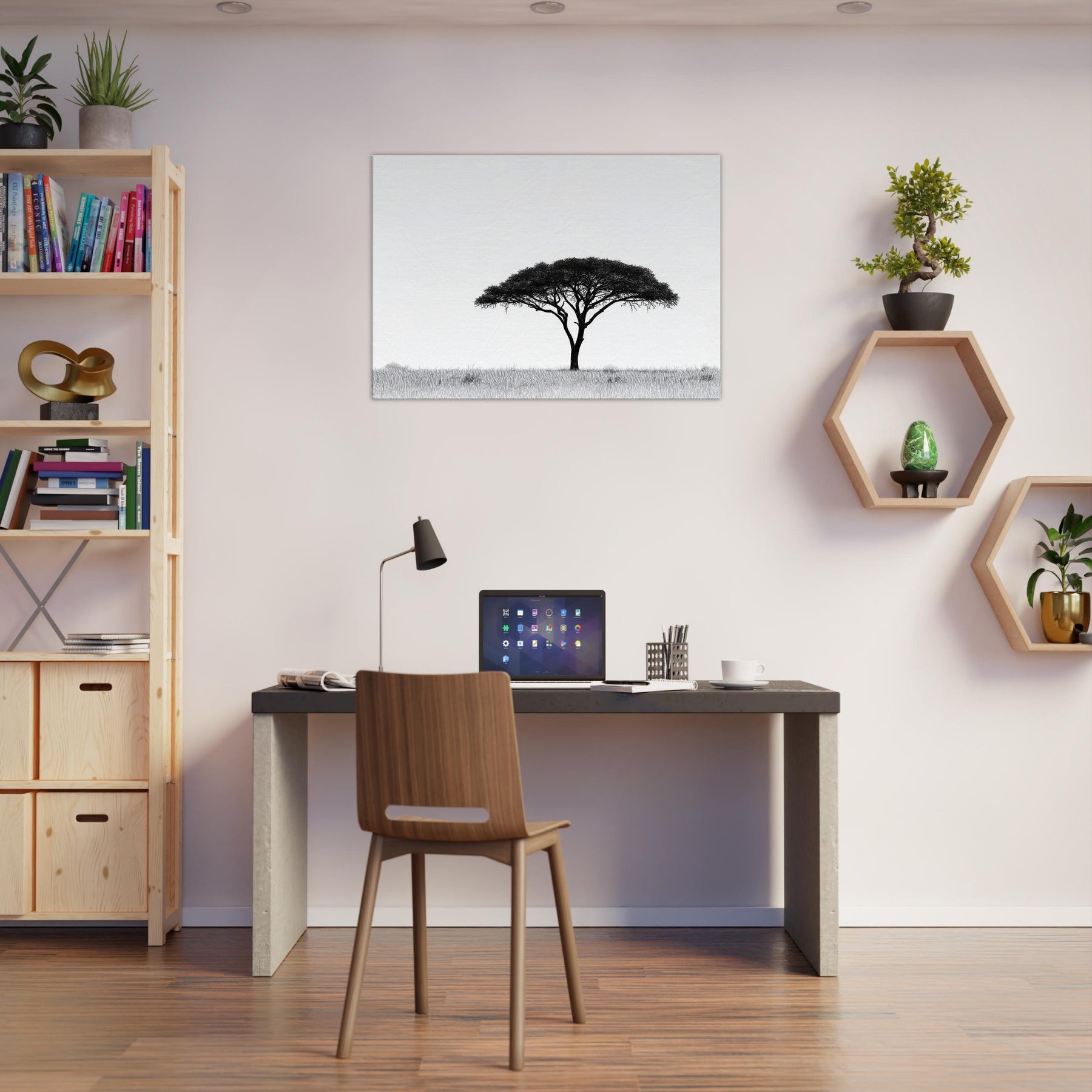A solitary Savannah tree stands beneath a vast, white expanse, rendered in clean, continuous line art. Each branch fans in quiet intricacy, inviting the eye to wander and breathe with the image. The Savannah's silhouette carries a timeless stillness, translating a wide open into a subtle, intimate moment for your wall. This piece brings calm, atmospheric light and a sense of space to living rooms or offices, turning walls into a horizon of possibility minimal, elegant, and endlessly serene.