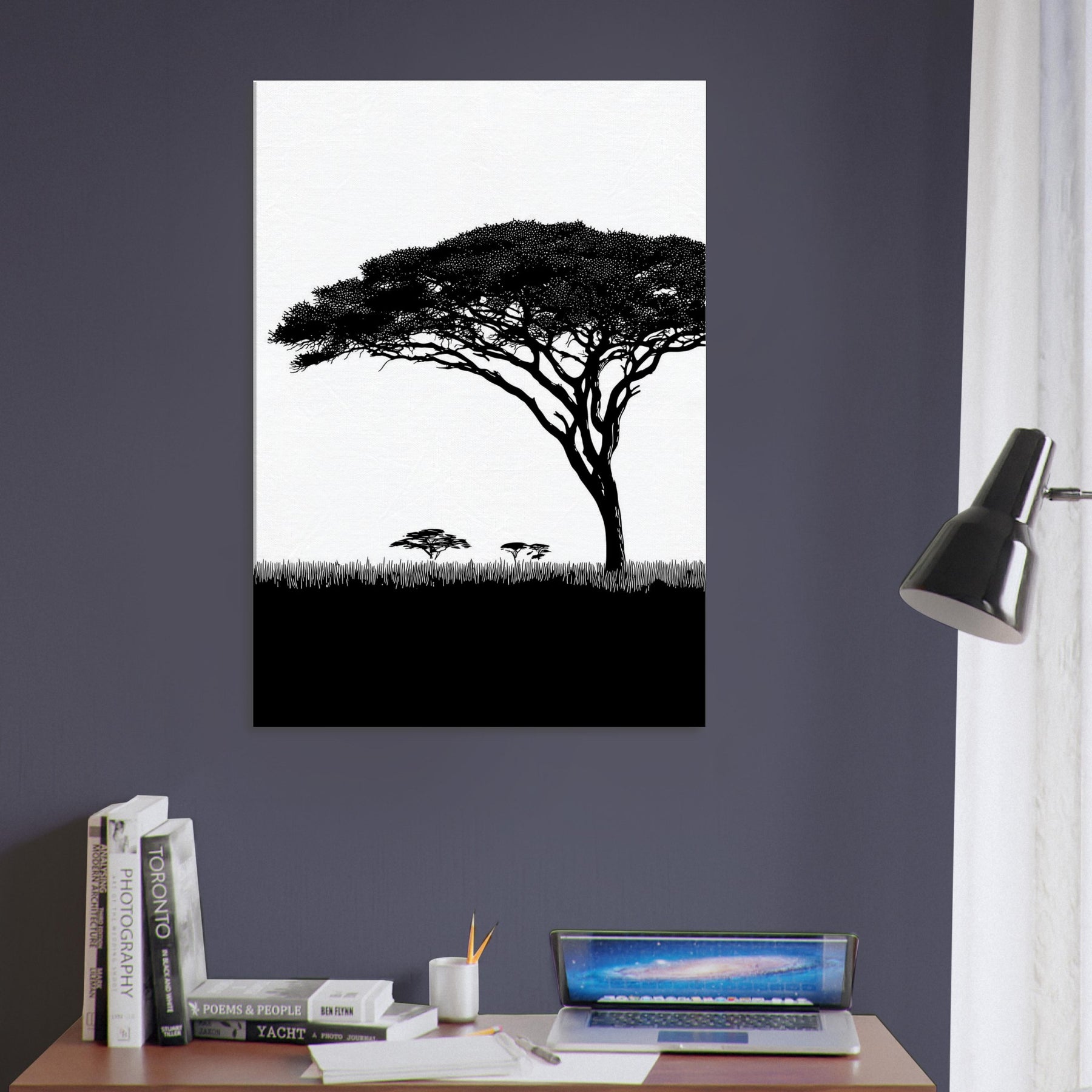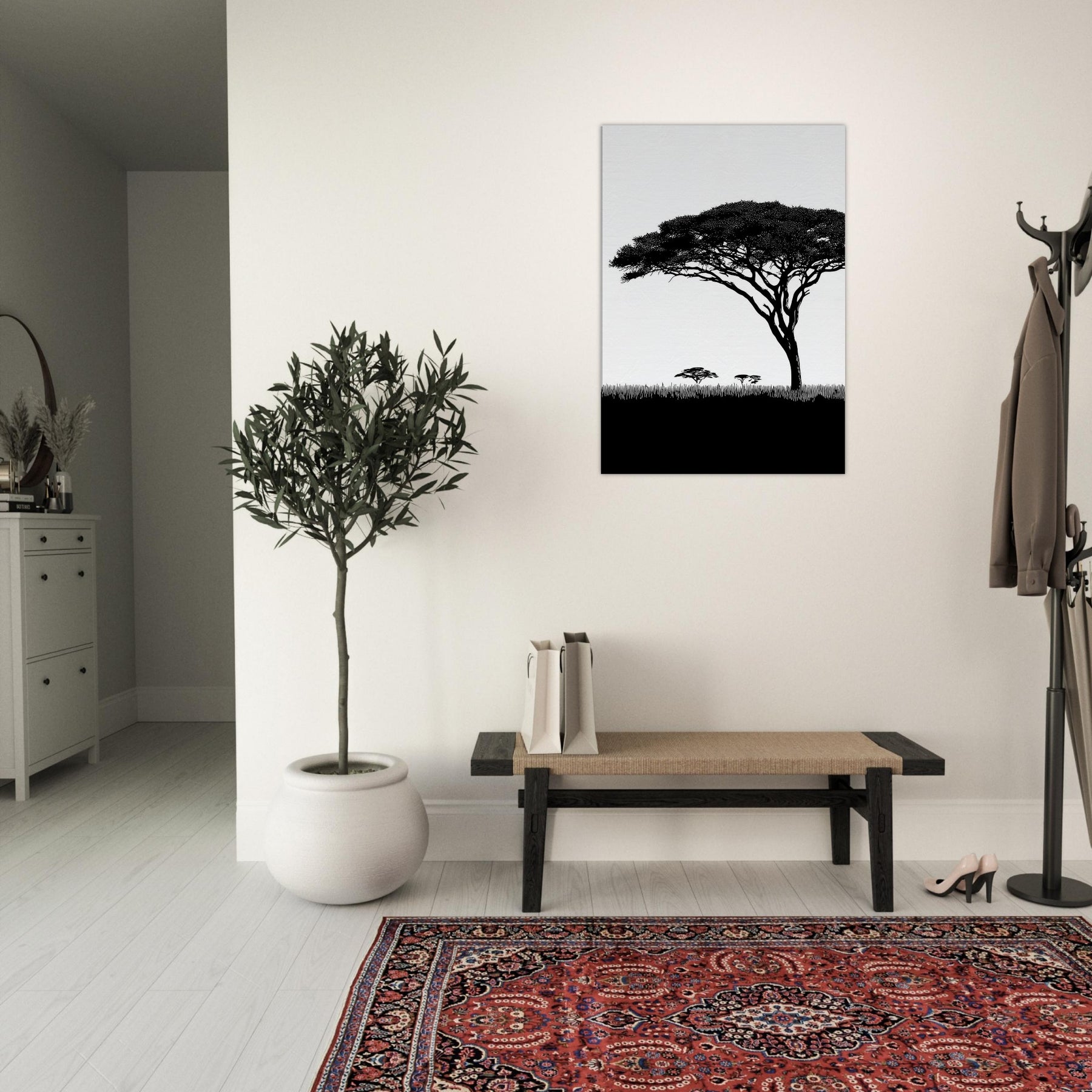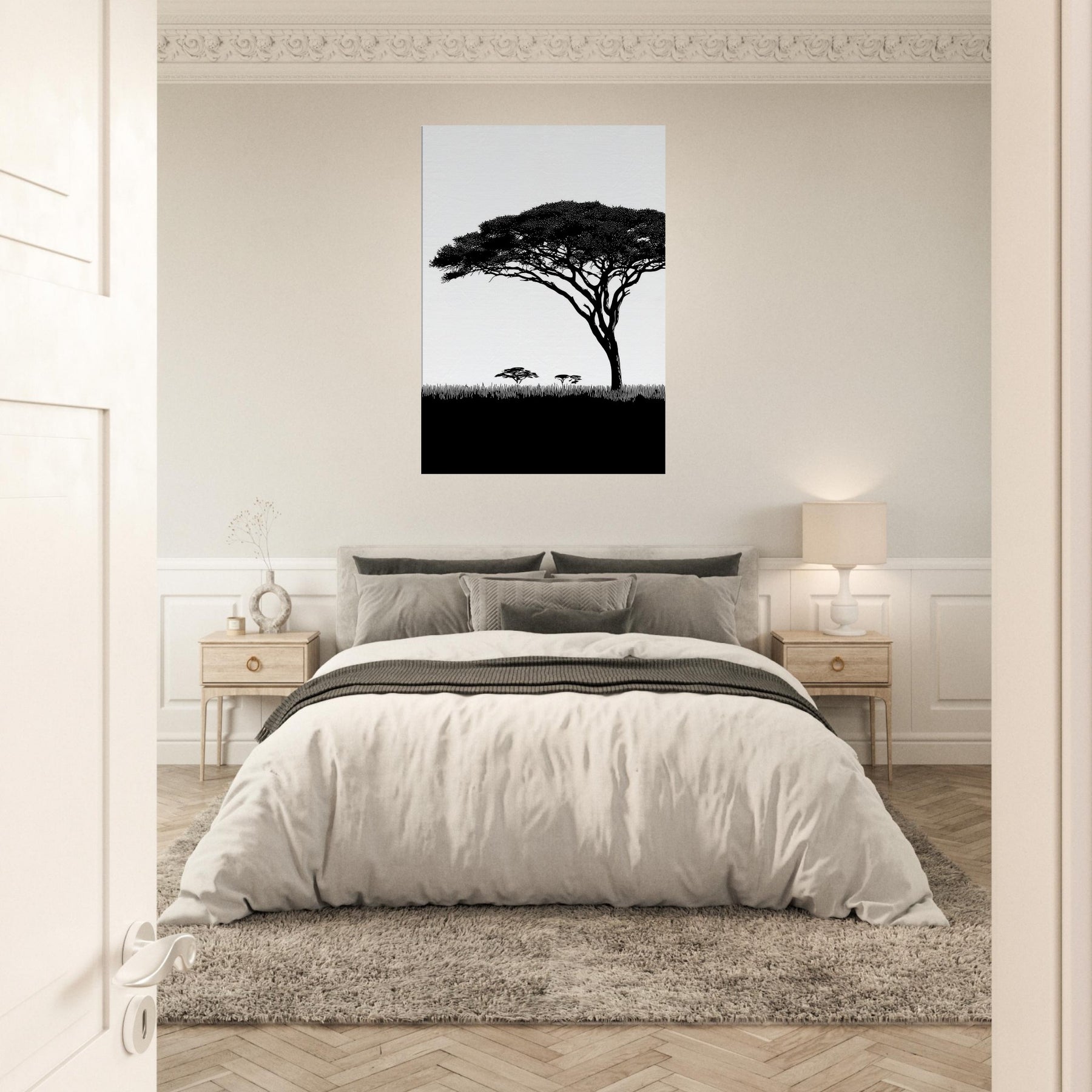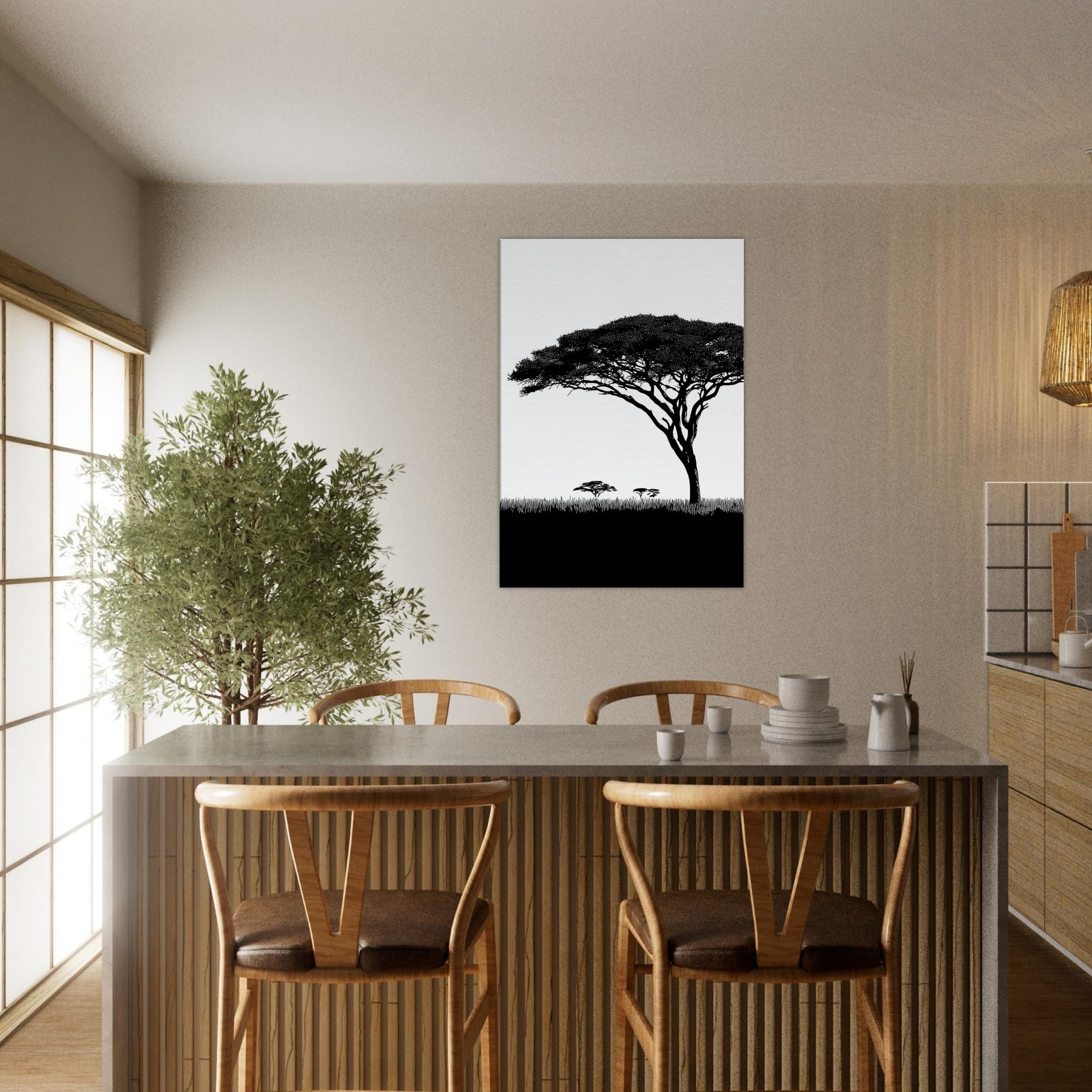 Savannah unfolds in bold, elegant lines that breathe simplicity into any room. This monochrome silhouette captures a timeless neighborhood of grasses and a lone, expansive tree, inviting stillness and contemplation. The contrast of stark black against pale walls creates a sense of horizon and refuge, echoing quiet mornings and expansive vistas. Hang this piece where light shifts across the day it will illuminate your living space with a gentle drama, grounding your space in nature and grace. The Savannah invites you to pause.