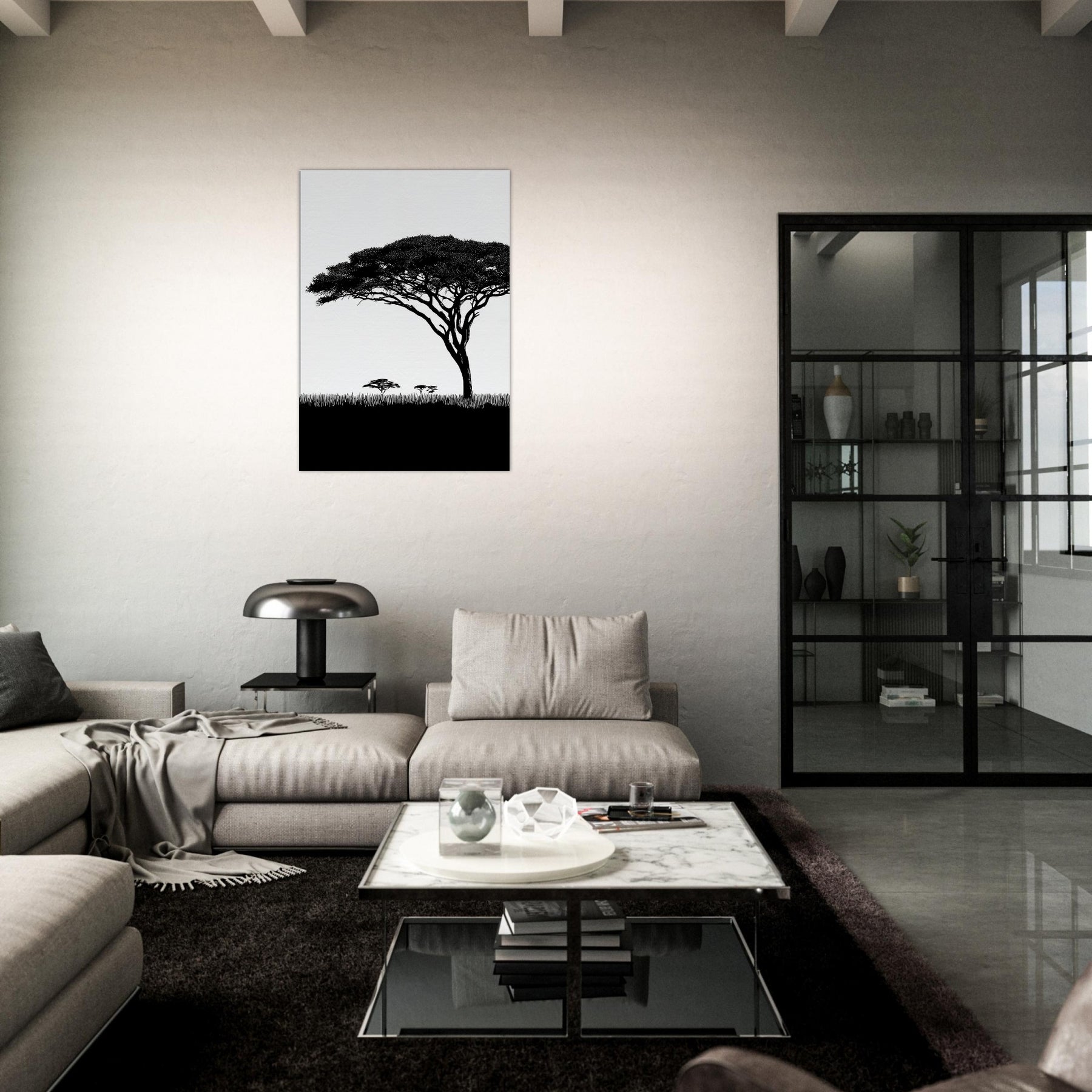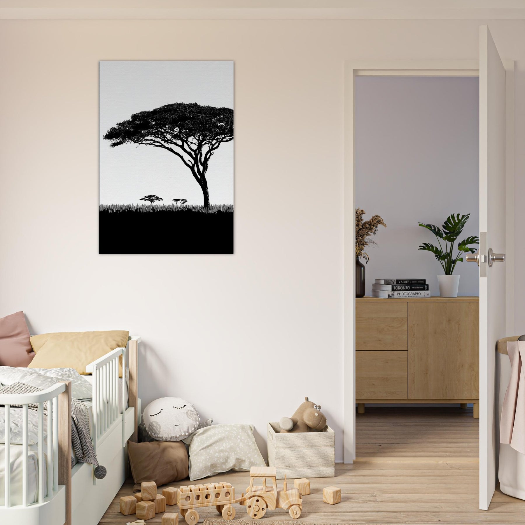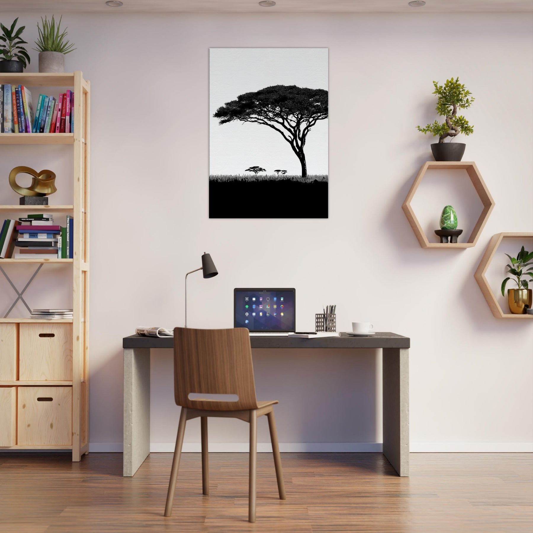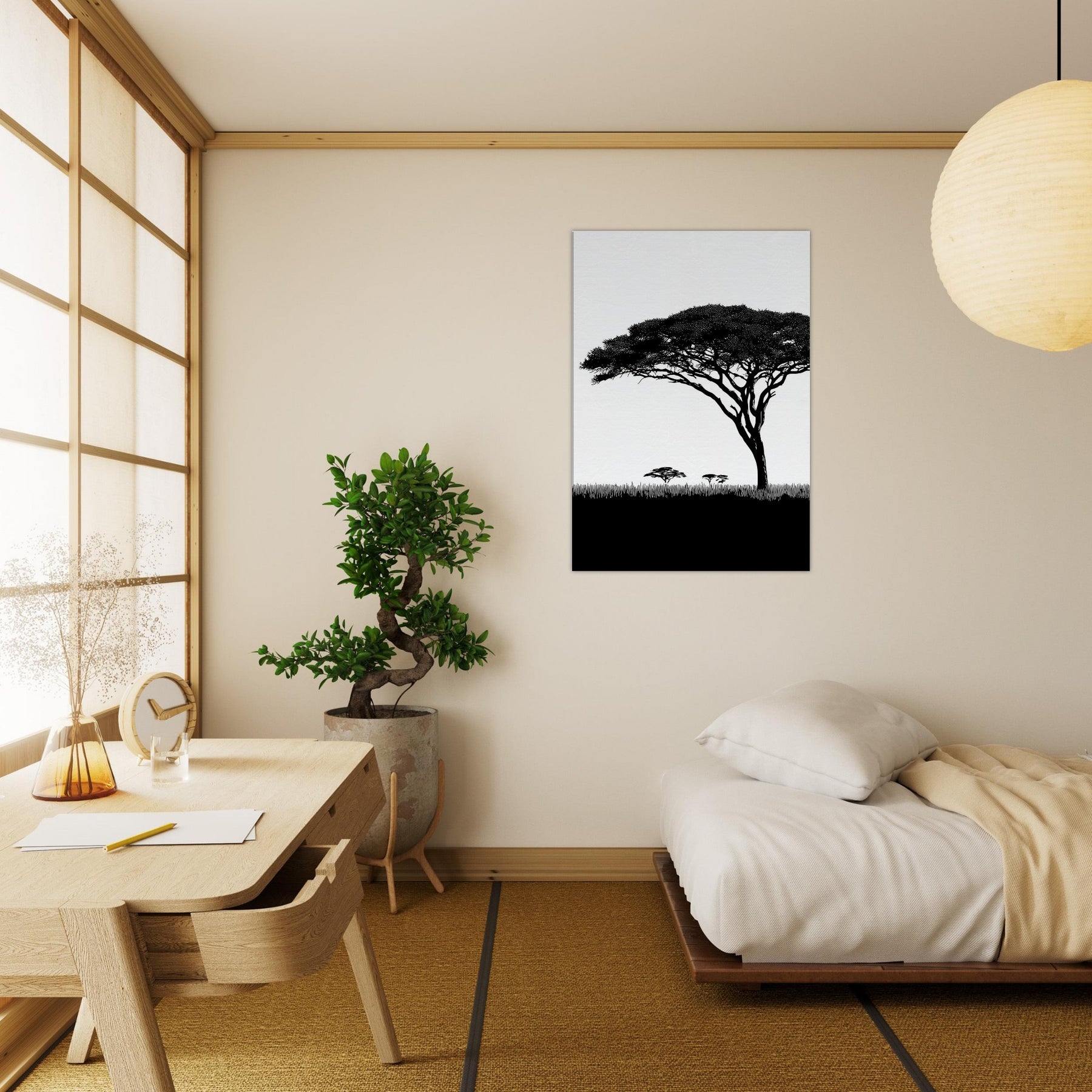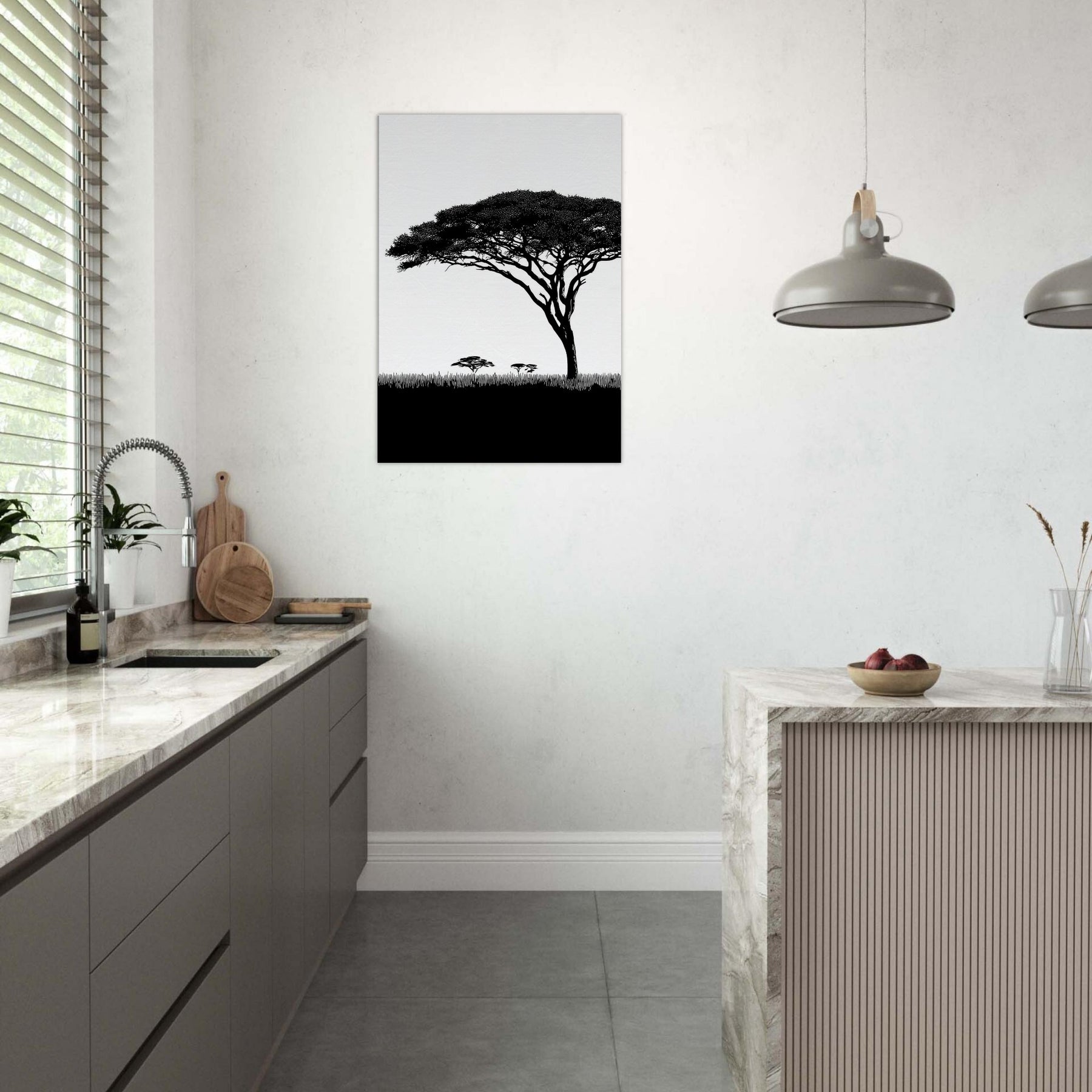 Savannah unfolds in bold, elegant lines that breathe simplicity into any room. This monochrome silhouette captures a timeless neighborhood of grasses and a lone, expansive tree, inviting stillness and contemplation. The contrast of stark black against pale walls creates a sense of horizon and refuge, echoing quiet mornings and expansive vistas. Hang this piece where light shifts across the day it will illuminate your living space with a gentle drama, grounding your space in nature and grace. The Savannah invites you to pause.