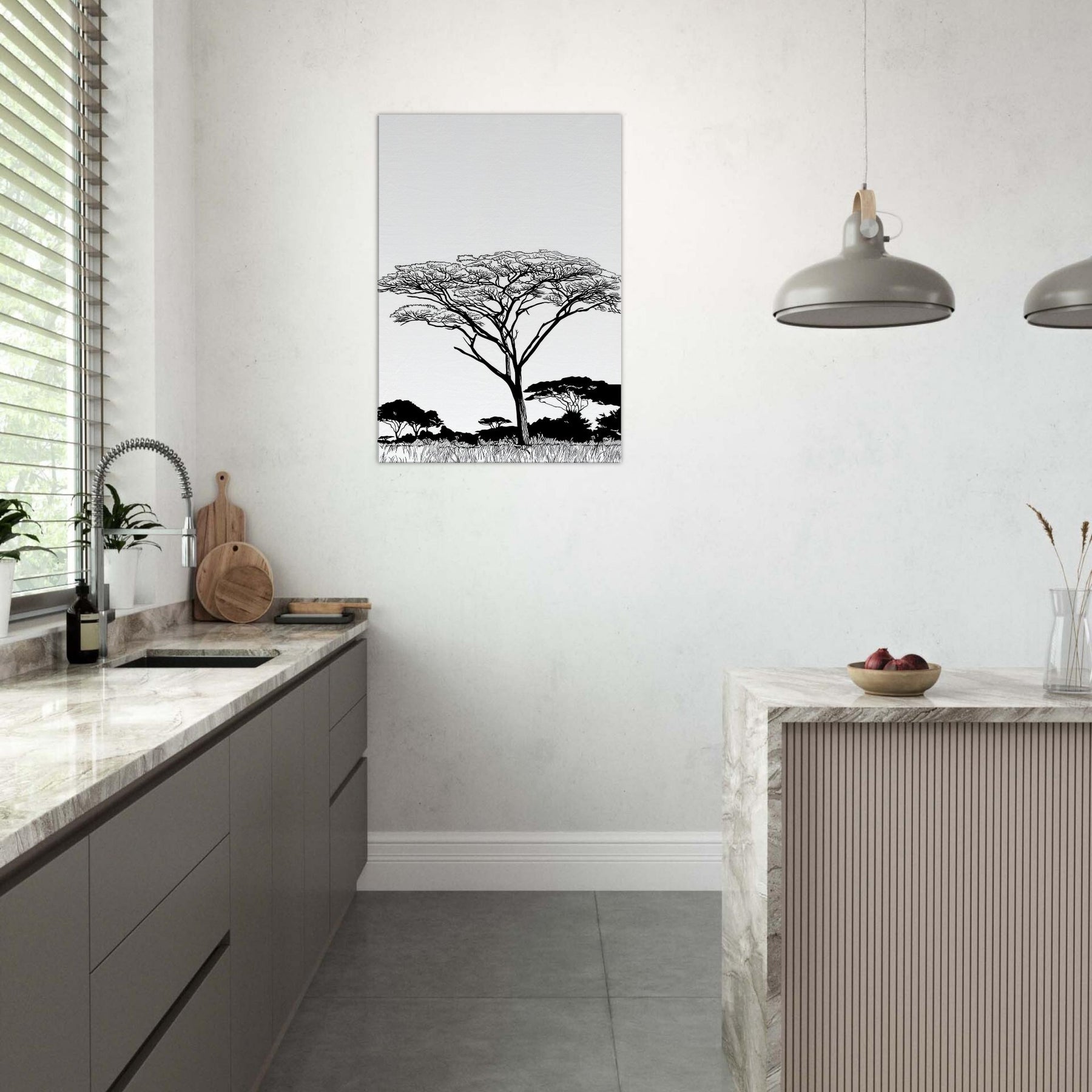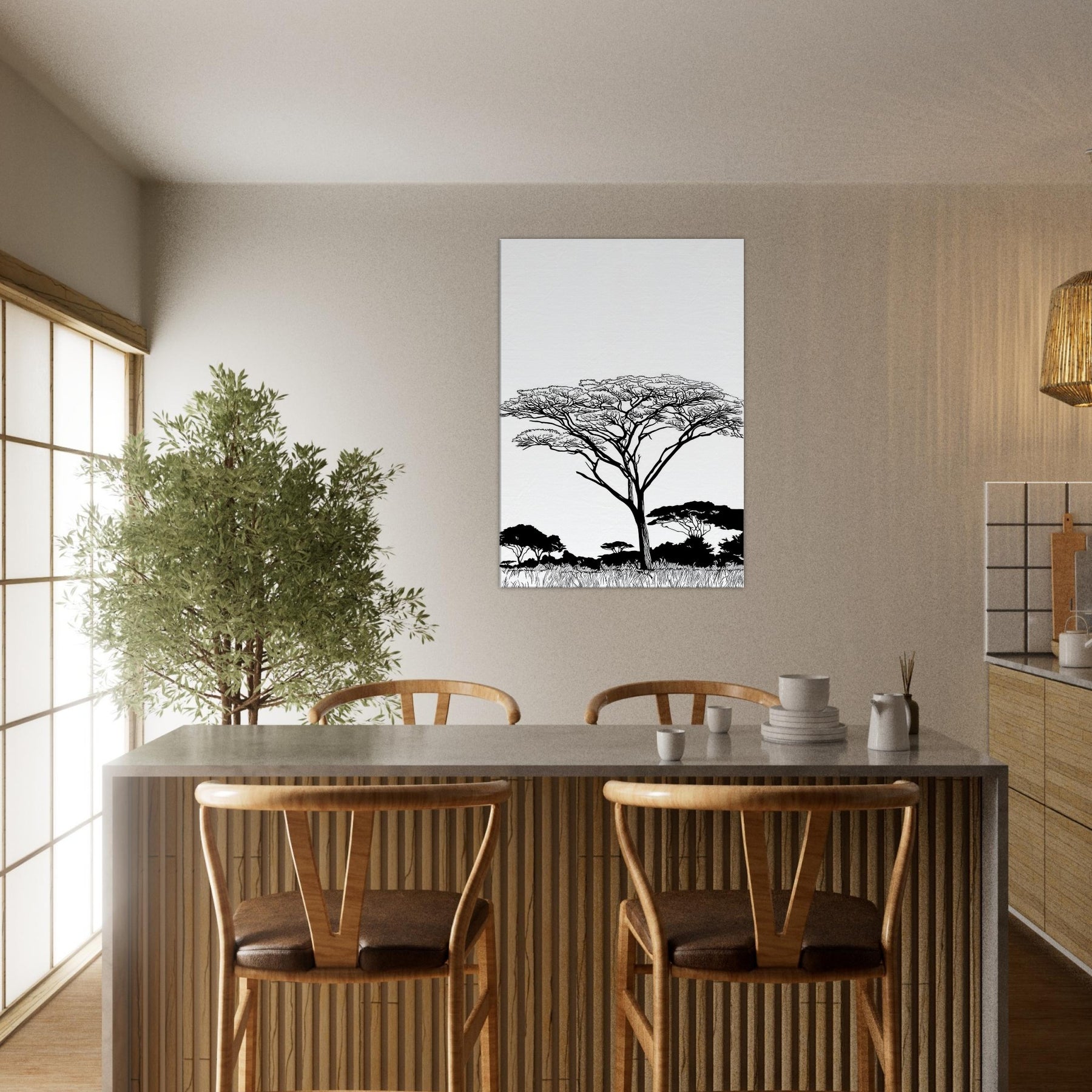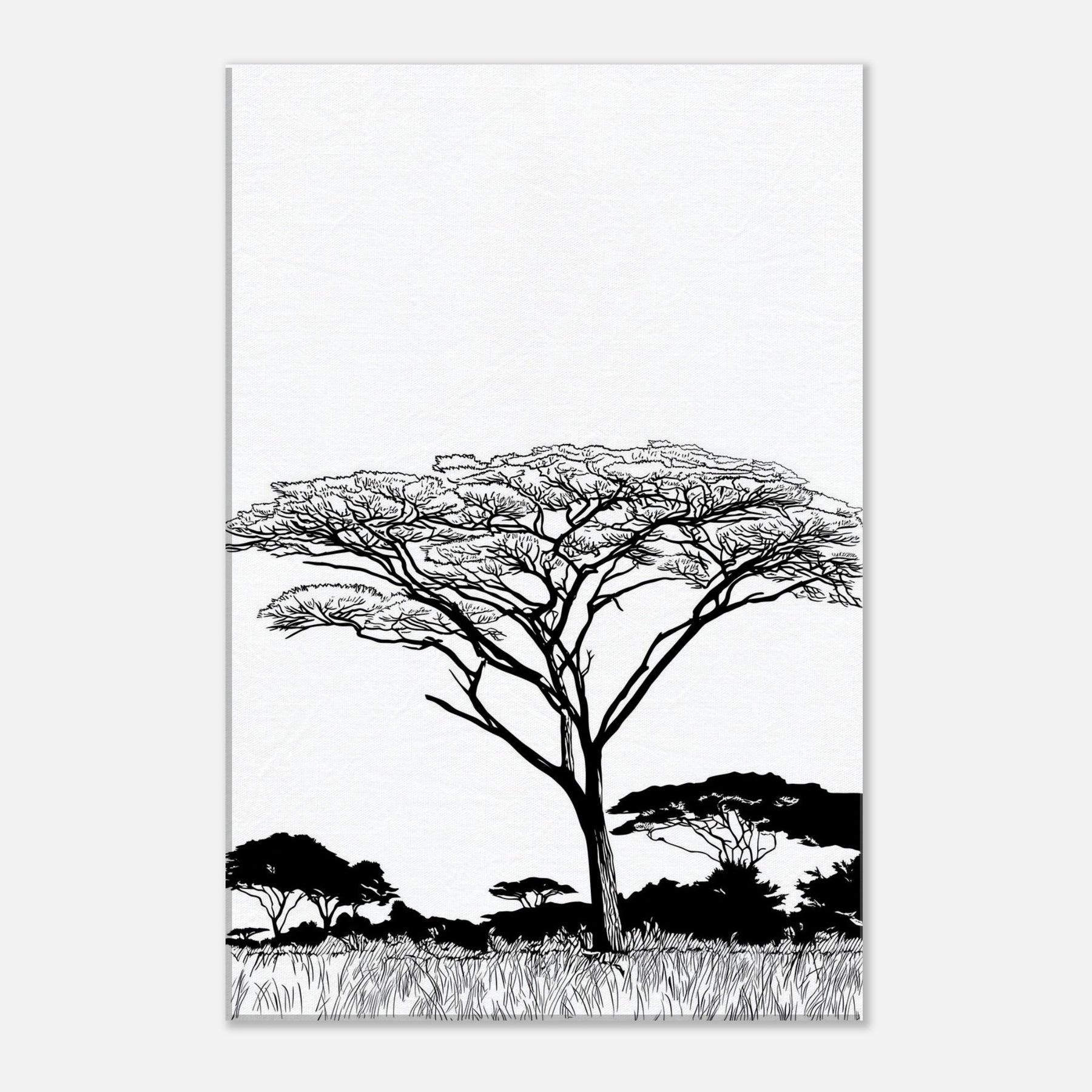 Across a white field, a solitary Savannah tree rises in elegant linework, its branching crown lace like and alive with wind. The composition reduces the scene to essential forms, inviting quiet focus and a breath of warm, sunlit air into any room. In living spaces, this Savannah inspired piece pairs best with neutral palettes, letting light and shadow dance along walls and stoke a mood of calm, expansive comfort.
