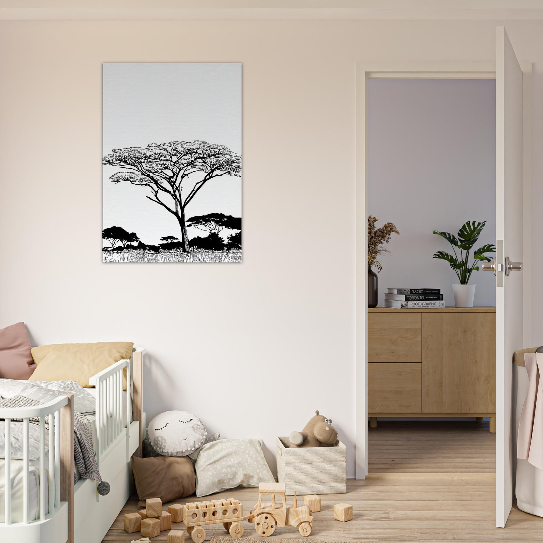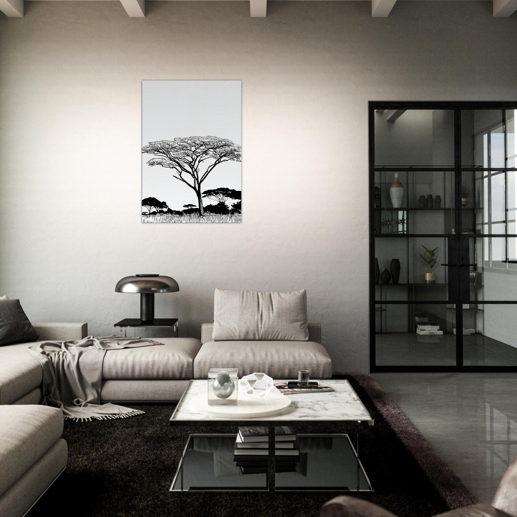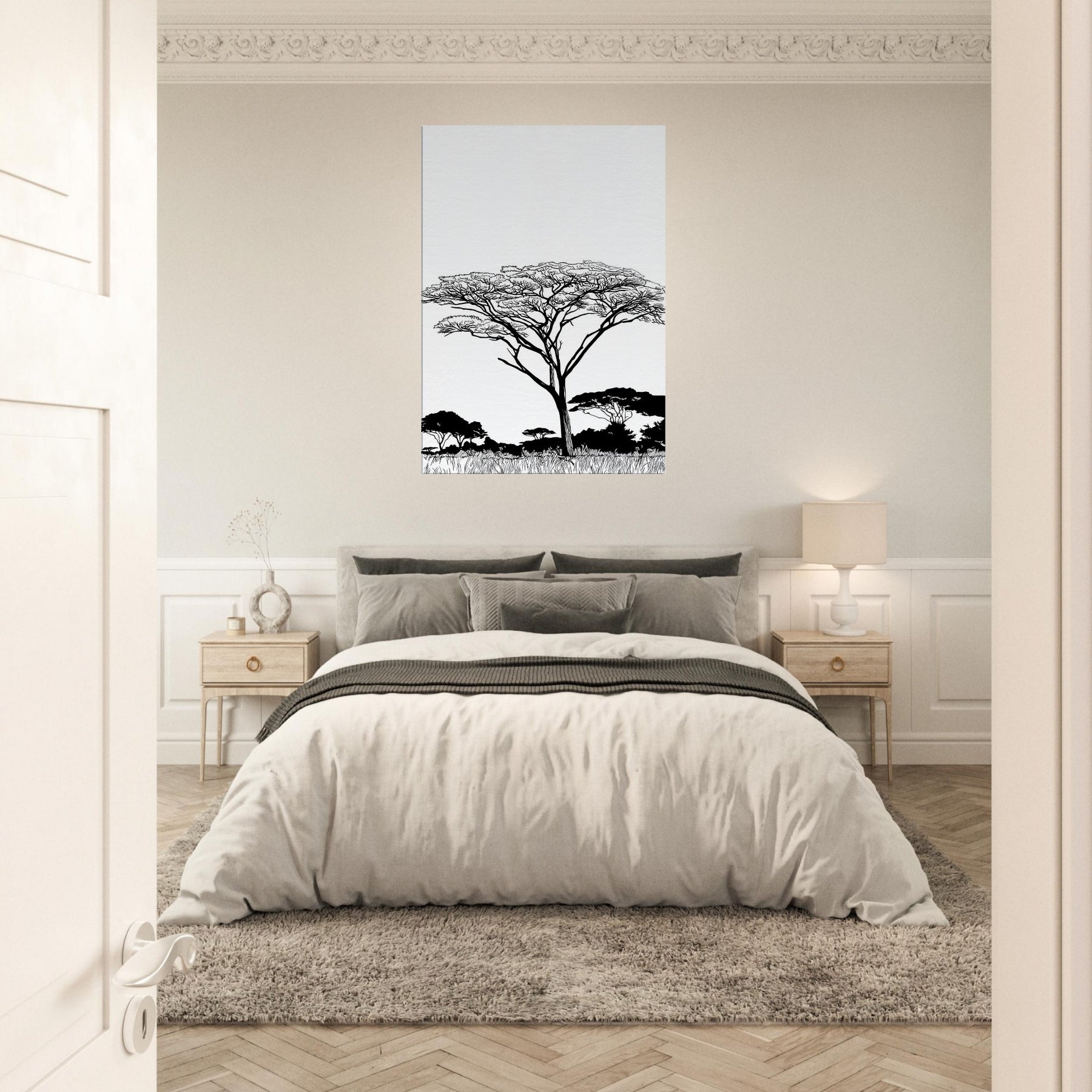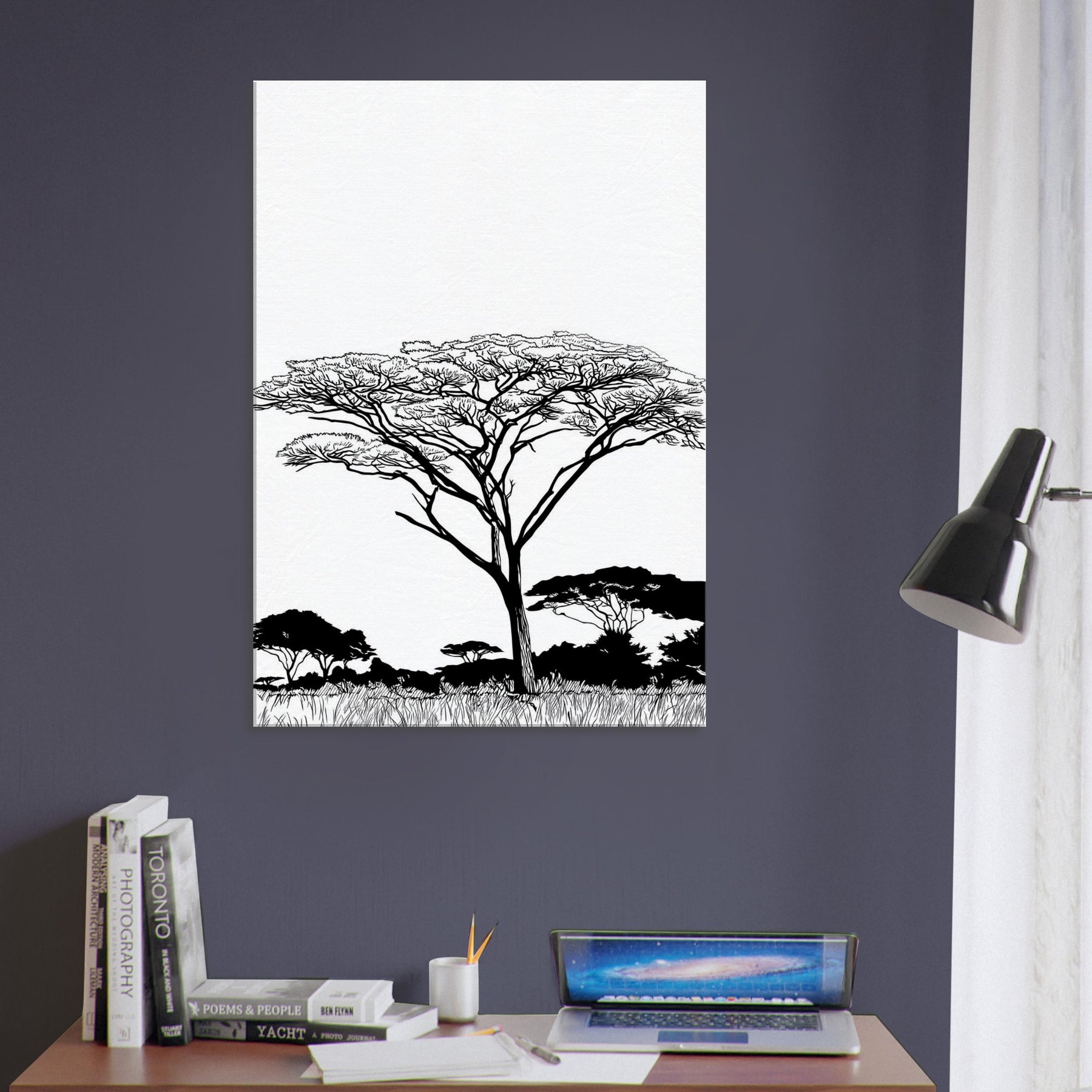 Across a white field, a solitary Savannah tree rises in elegant linework, its branching crown lace like and alive with wind. The composition reduces the scene to essential forms, inviting quiet focus and a breath of warm, sunlit air into any room. In living spaces, this Savannah inspired piece pairs best with neutral palettes, letting light and shadow dance along walls and stoke a mood of calm, expansive comfort.