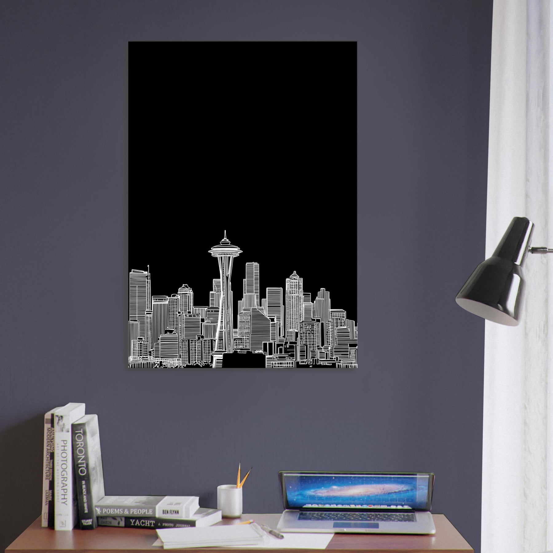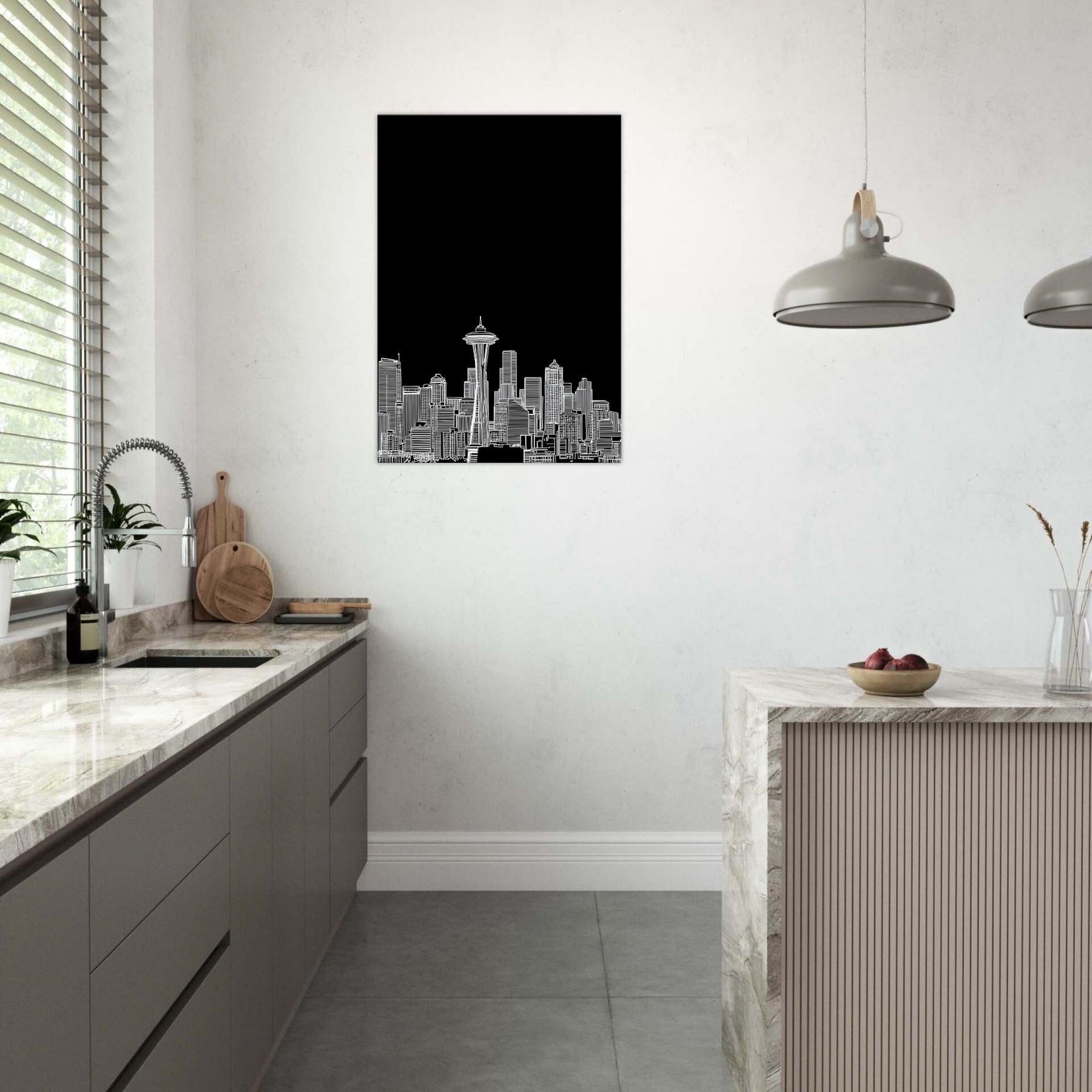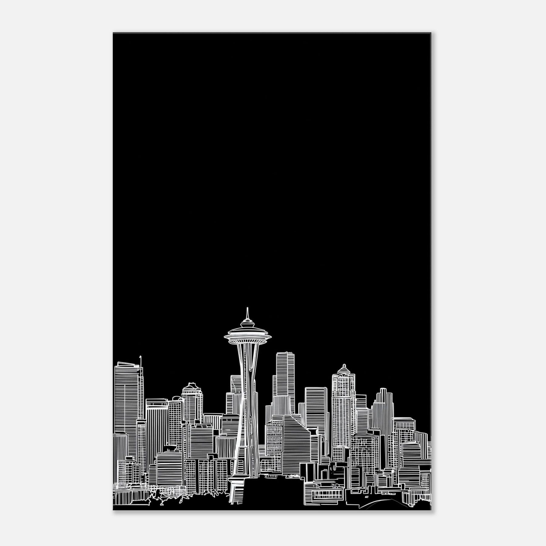 Seattle in silhouette blooms against a midnight field, a delicate line art skyline that hums with quiet energy. This piece invites the city's heartbeat into your space the soft whisper of rain on windows, the distant thrum of traffic, and the glow of city lights reflected in calm, white contours. It anchors a living room or study with sophisticated, contemporary balance, pairing effortlessly with leather, glass, or wood. A poetic nod to urban grace, it heightens mood without shouting color.