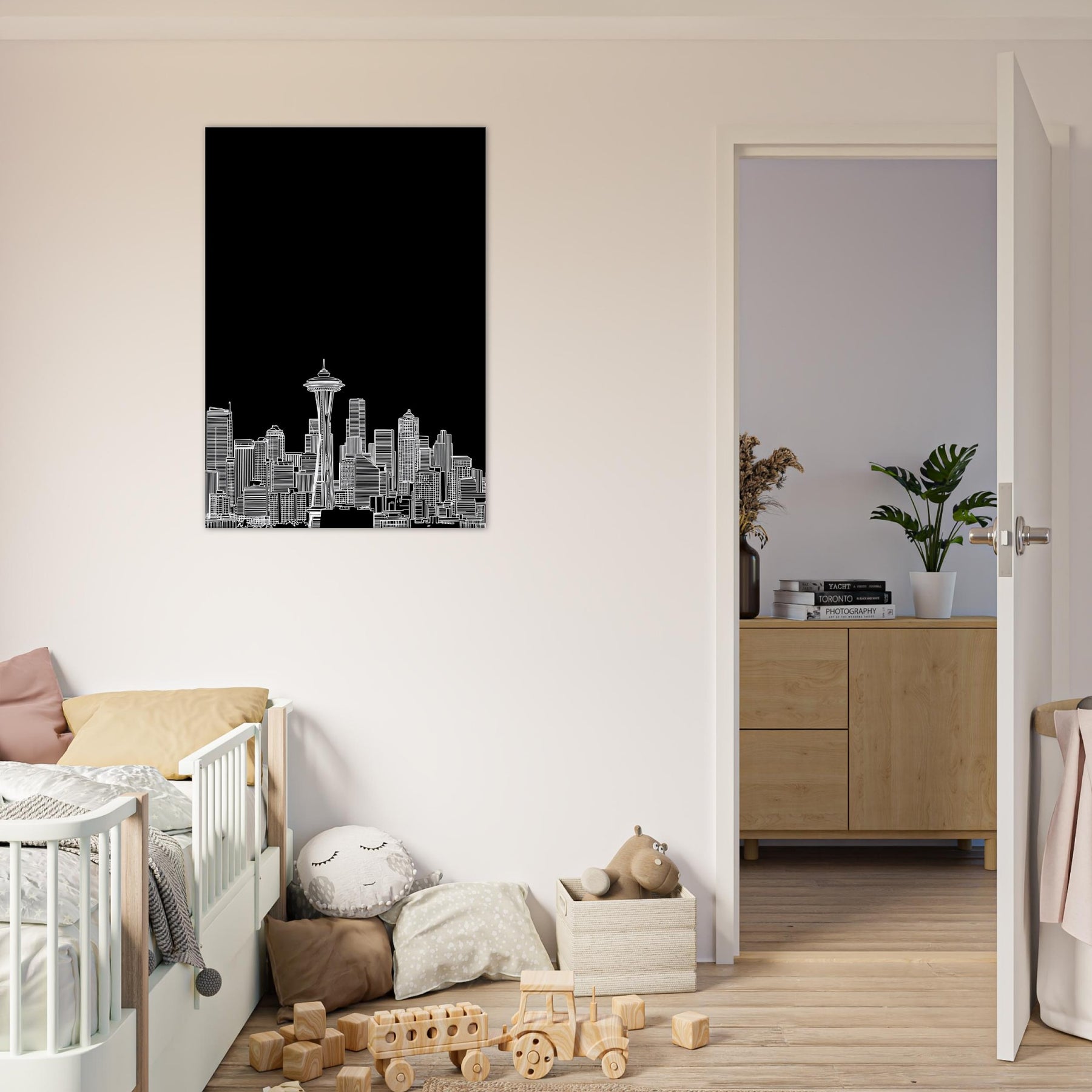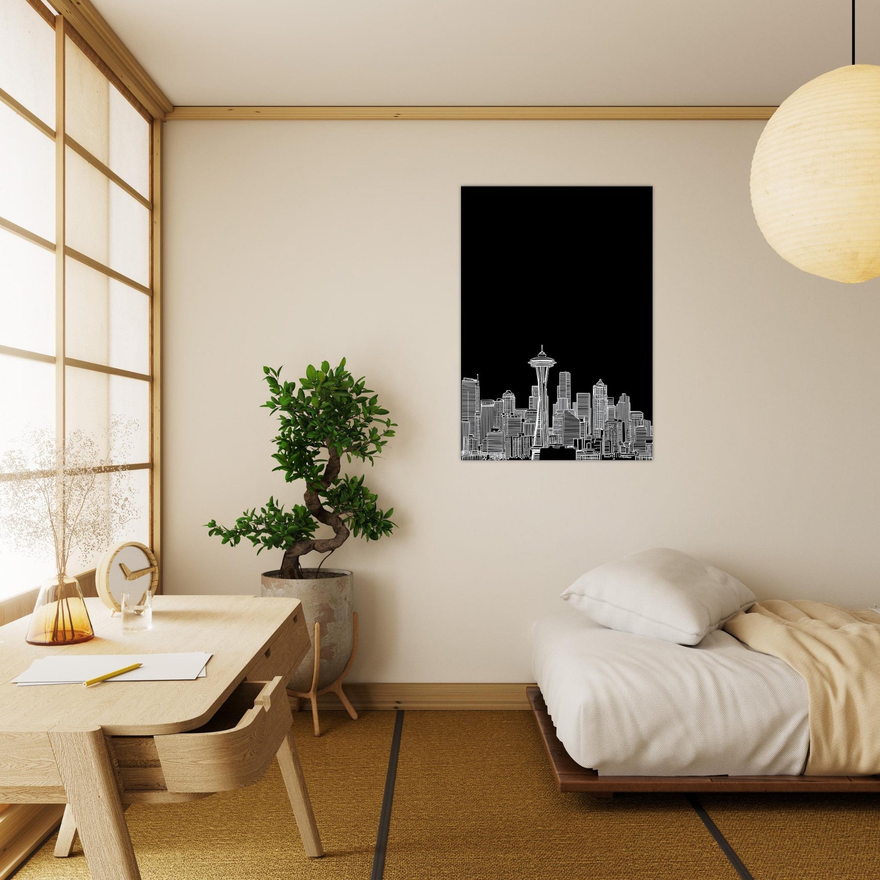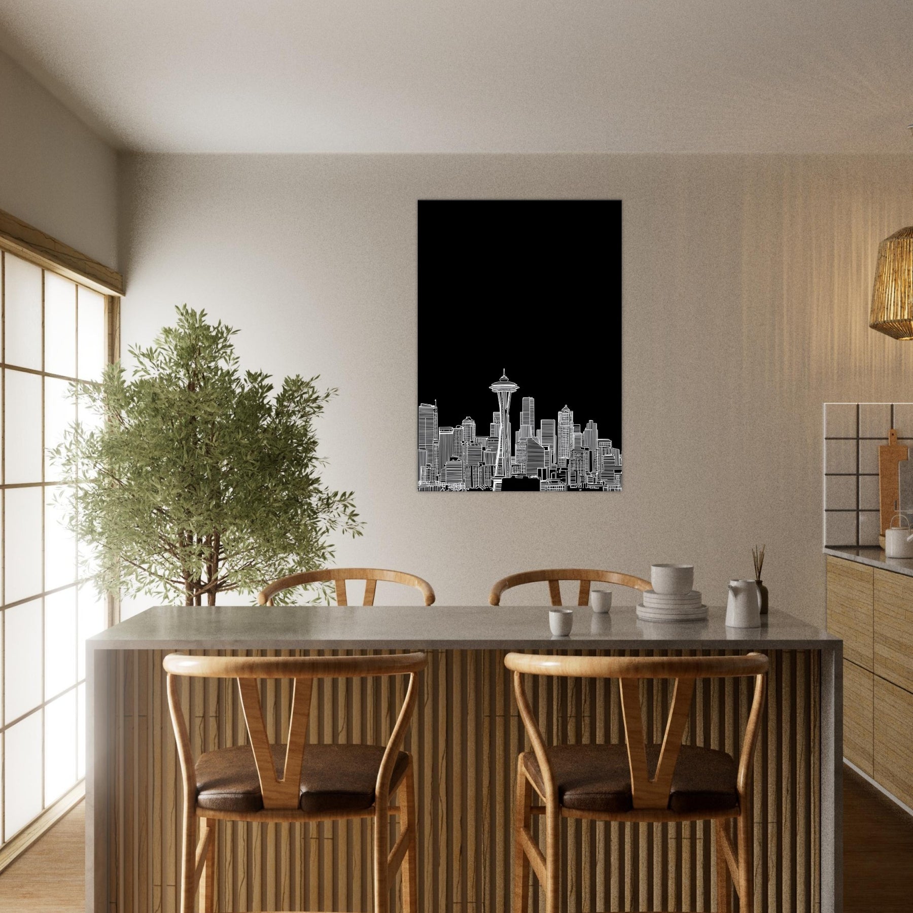 Seattle in silhouette blooms against a midnight field, a delicate line art skyline that hums with quiet energy. This piece invites the city's heartbeat into your space the soft whisper of rain on windows, the distant thrum of traffic, and the glow of city lights reflected in calm, white contours. It anchors a living room or study with sophisticated, contemporary balance, pairing effortlessly with leather, glass, or wood. A poetic nod to urban grace, it heightens mood without shouting color.