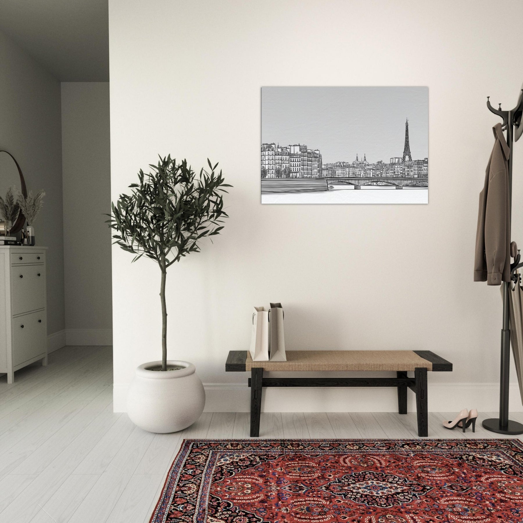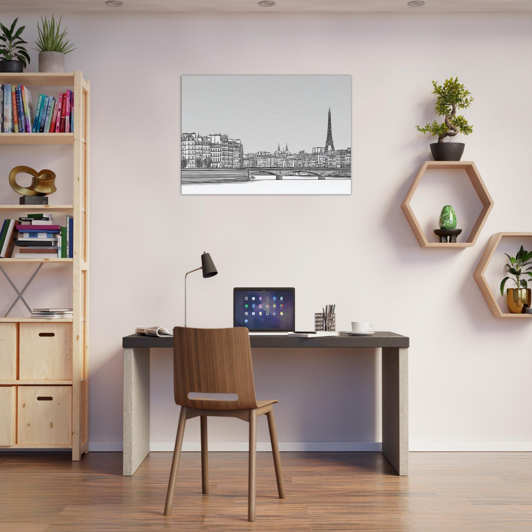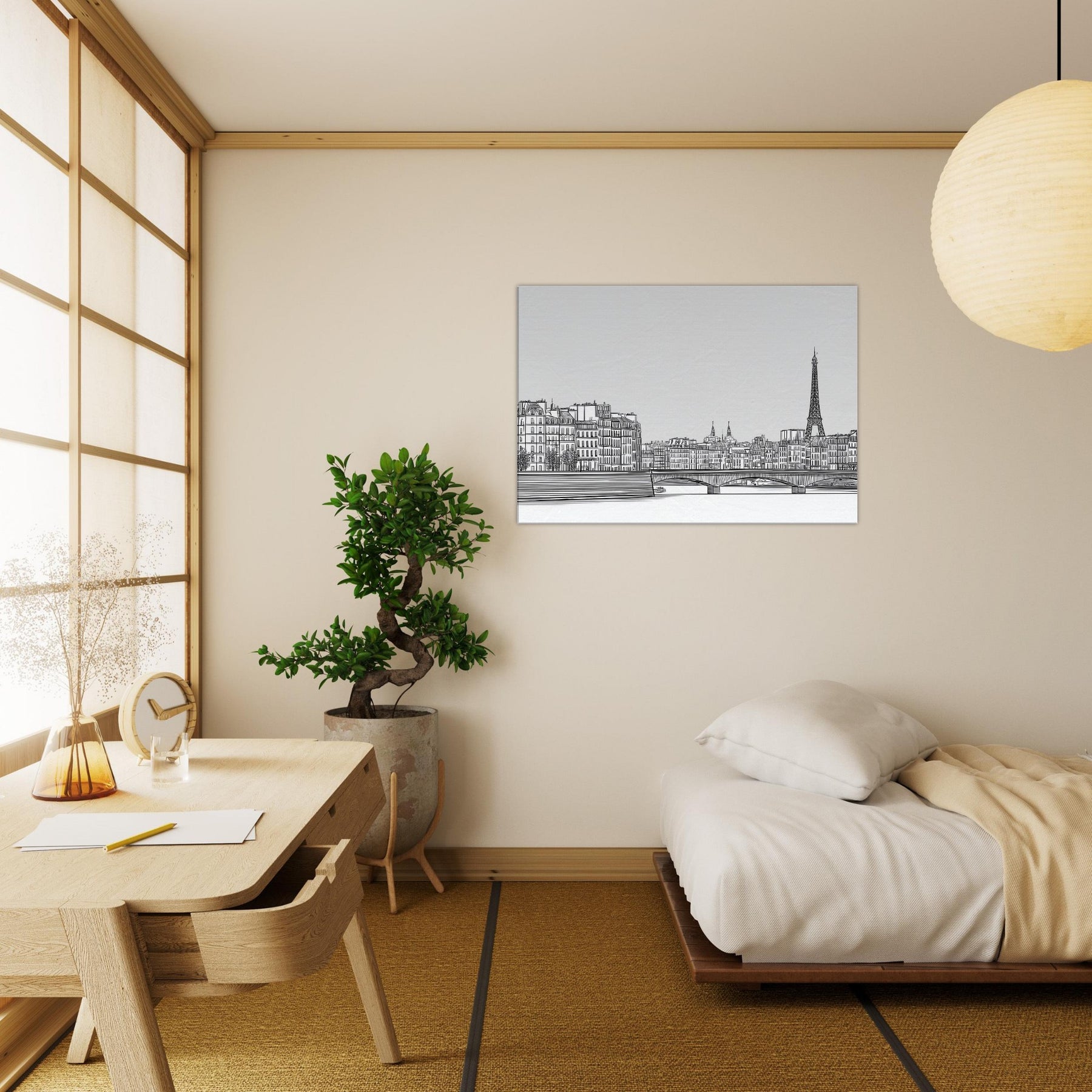Paris rises in a single, continuous line: a cityscape pared to its essentials, where windows, rooftops, and bridges become a quiet lyric. This line art piece breathes with restraint, inviting the eye to drift along the river while the room remains calm and grounded. The black on white strokes evoke late afternoon light and cool stone, creating a serene atmosphere that enhances any living space without shouting. Hang it above a sofa or beside a doorway to anchor conversations in timeless Parisian chic.