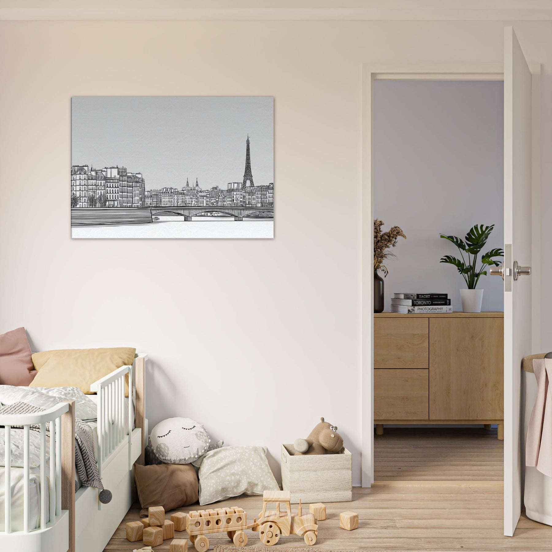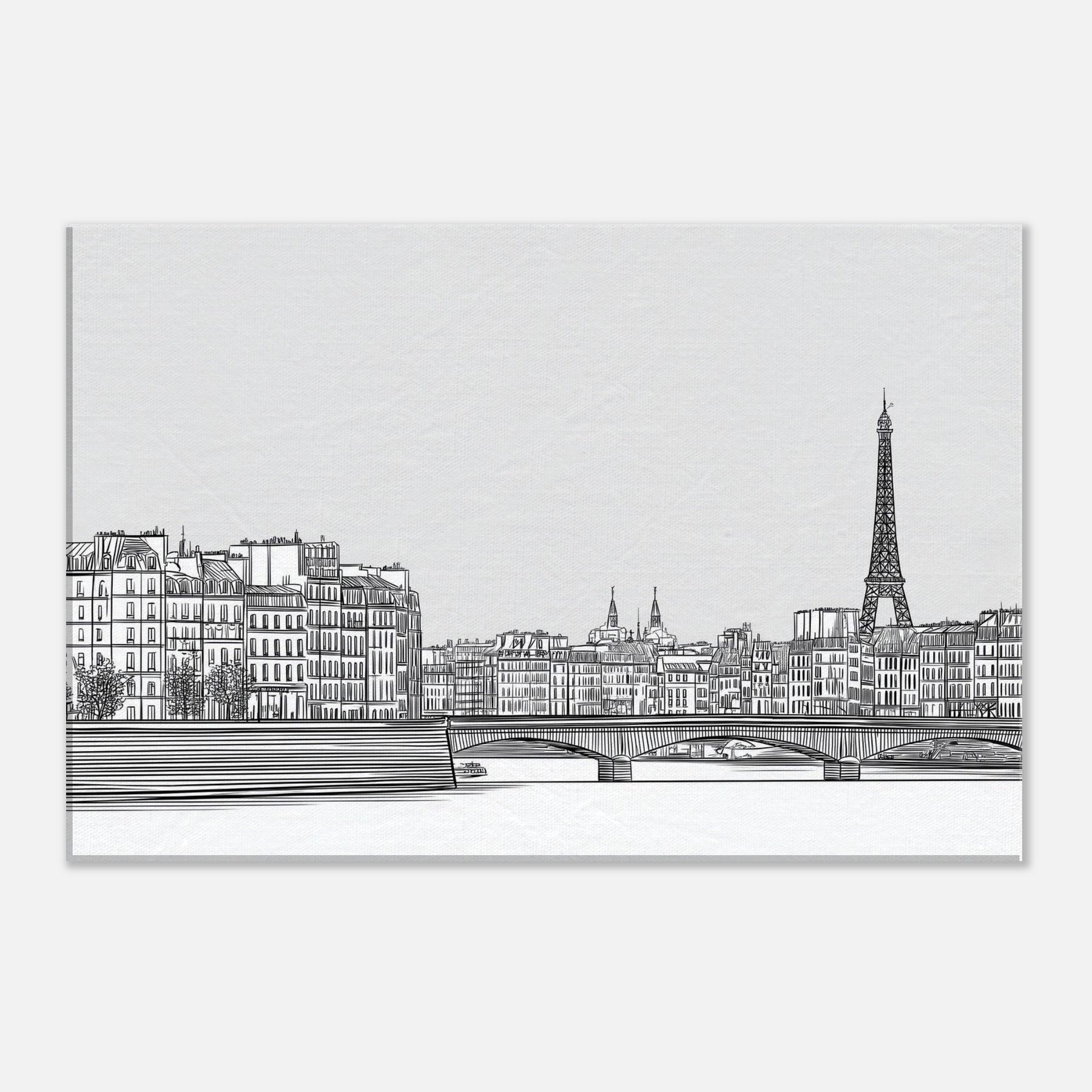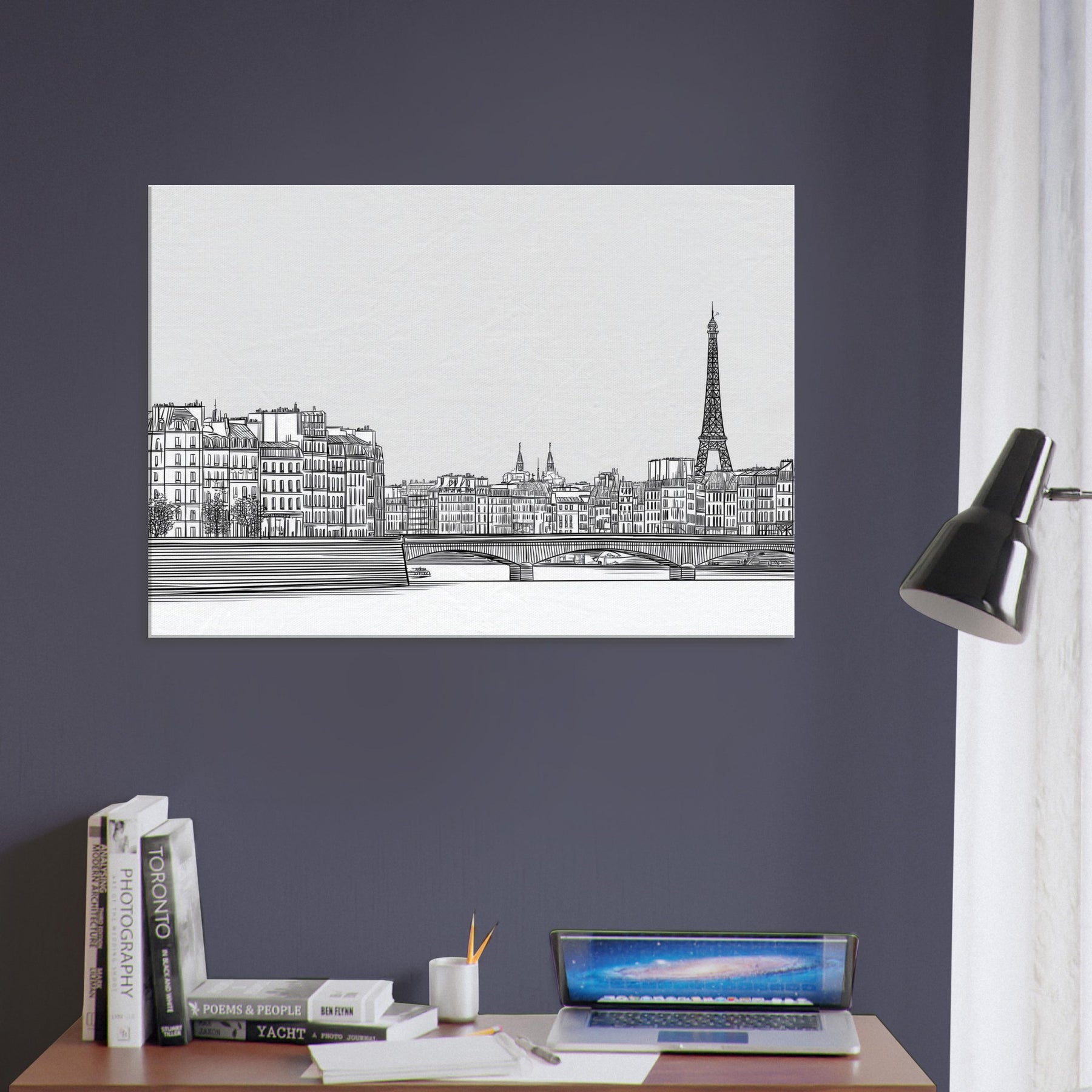 Paris rises in a single, continuous line: a cityscape pared to its essentials, where windows, rooftops, and bridges become a quiet lyric. This line art piece breathes with restraint, inviting the eye to drift along the river while the room remains calm and grounded. The black on white strokes evoke late afternoon light and cool stone, creating a serene atmosphere that enhances any living space without shouting. Hang it above a sofa or beside a doorway to anchor conversations in timeless Parisian chic.