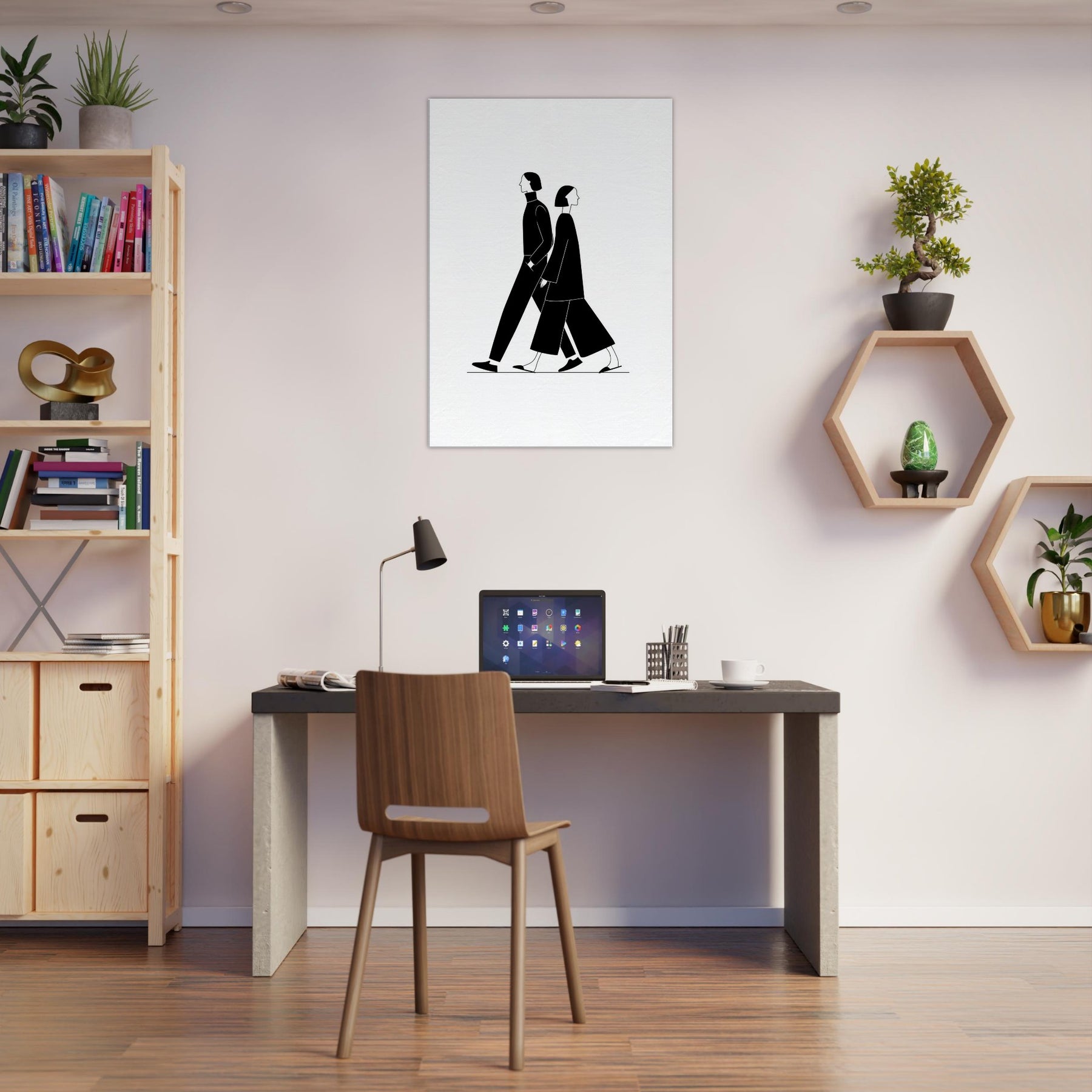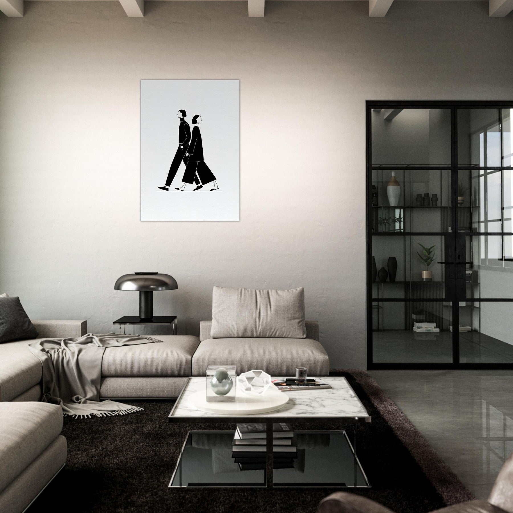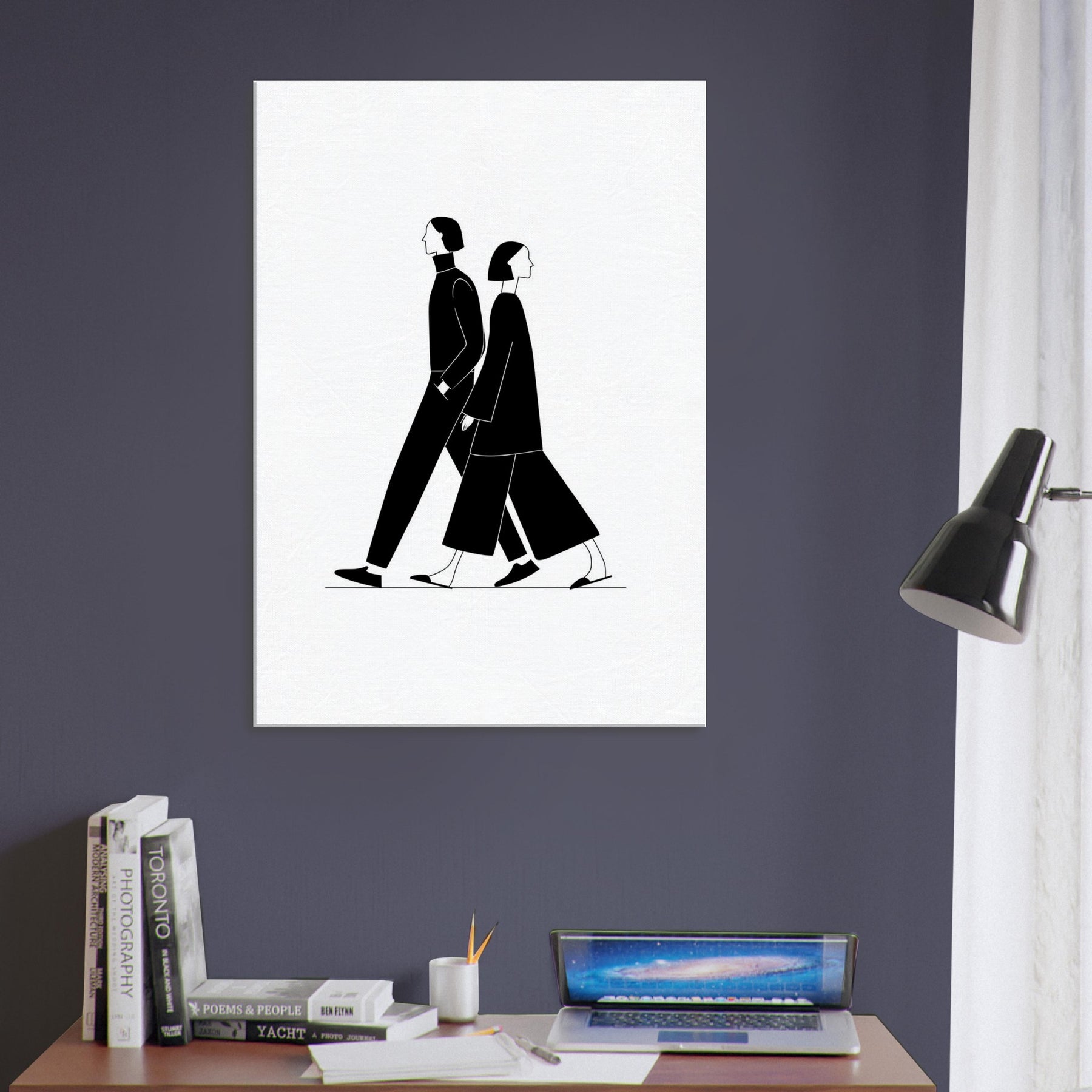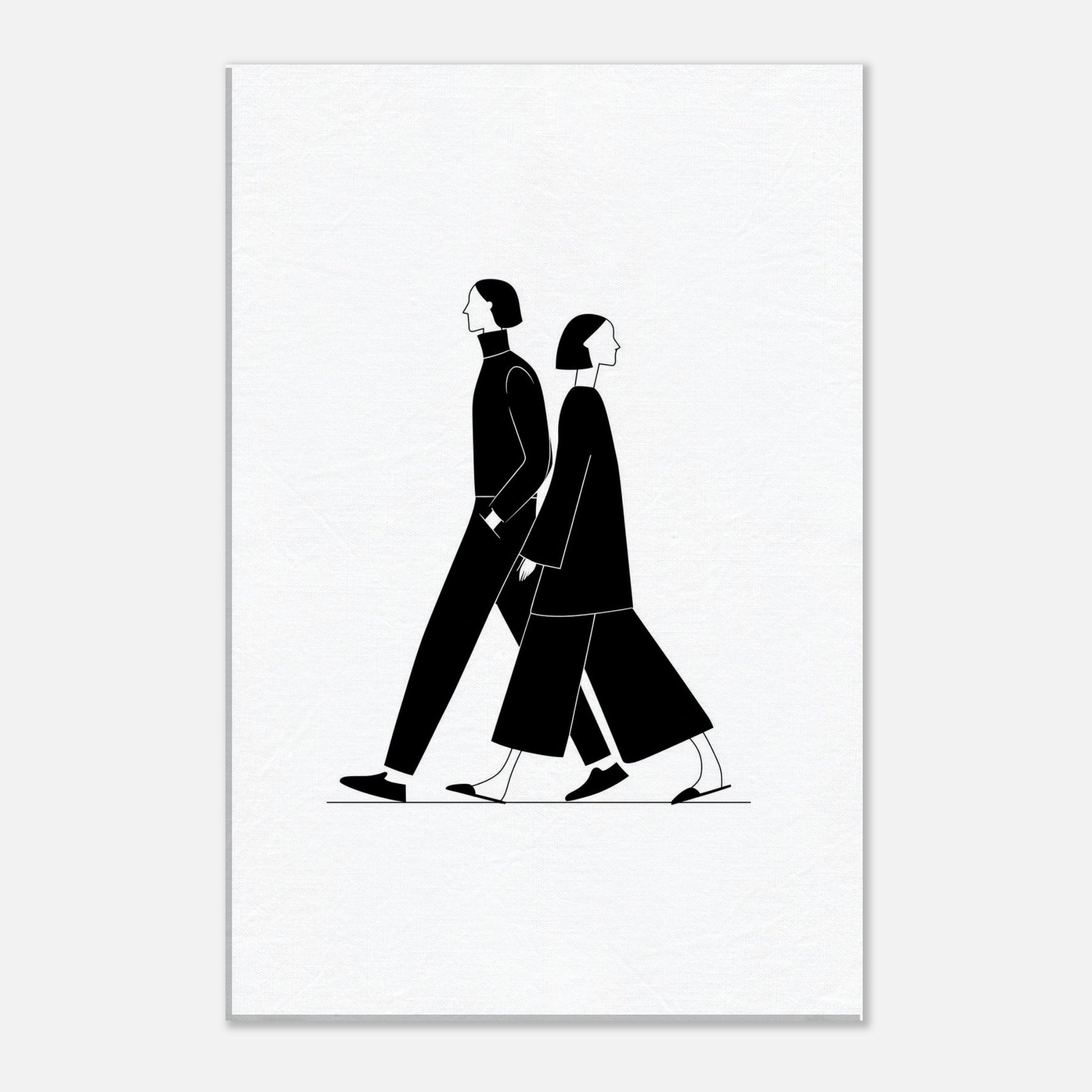 Centered on the Couple Walking, this minimalist line art captures a quiet duet of motion and intention. The bold black silhouettes glide across the white space, inviting calm into a living space and suggesting distance, proximity, and the gentle rhythm of two lives in step. Perfect for a modern hallway, living room, or bedroom, the piece adds cinematic contrast, tactile elegance, and a serene focal point that elevates everyday moments with a sense of quiet companionship.