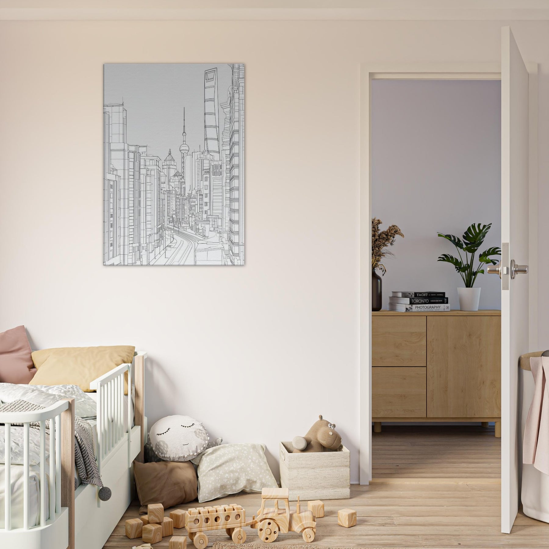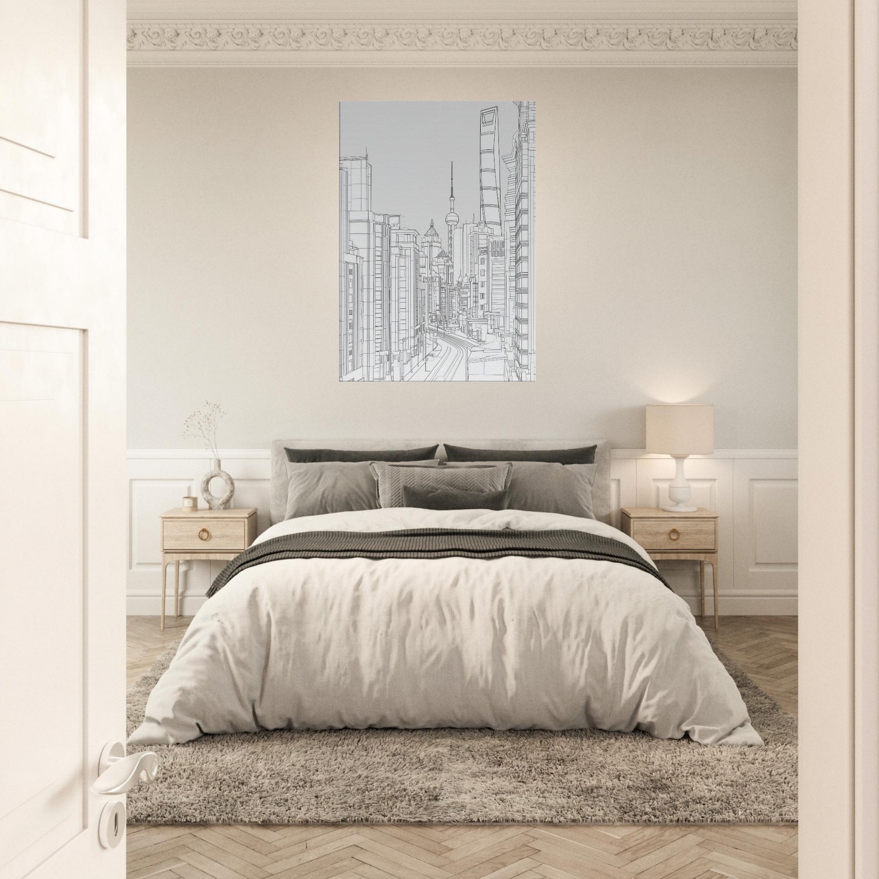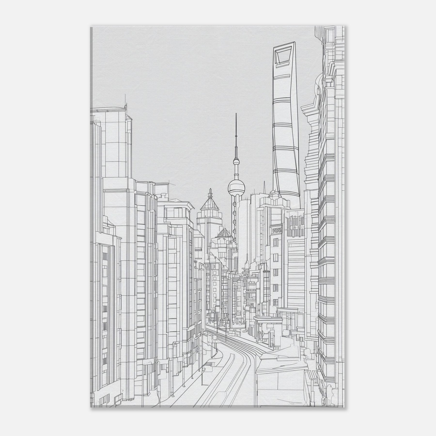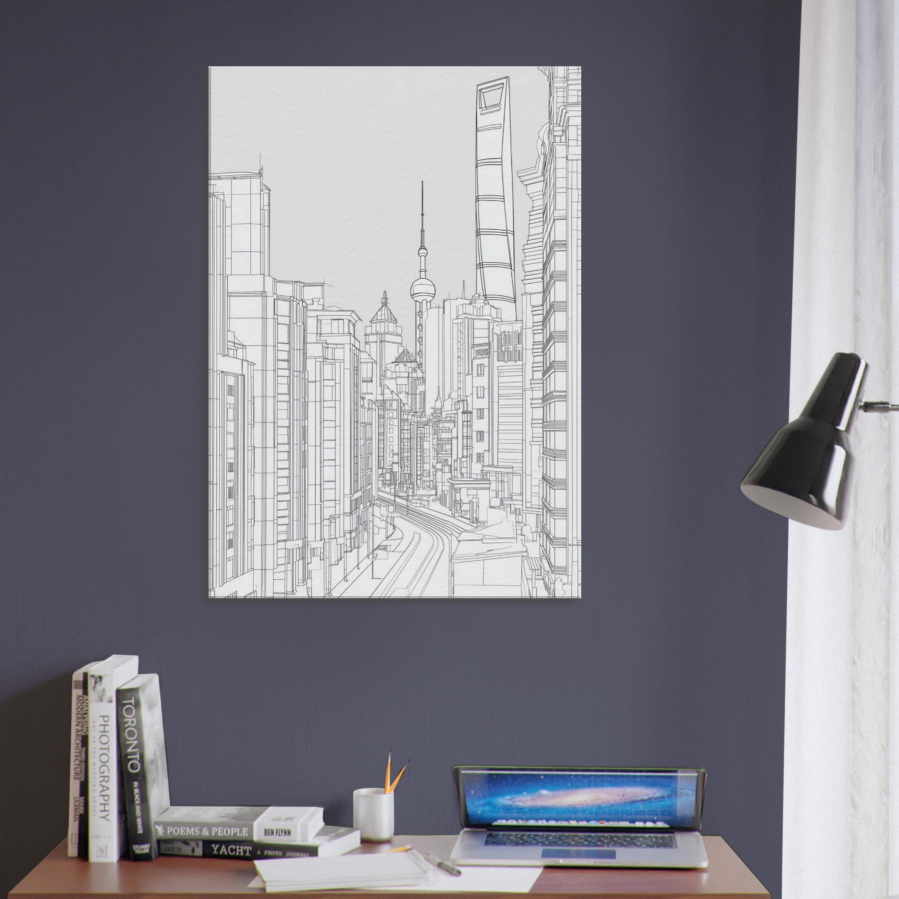 Immerse your space in the quiet poetry of Shanghai rendered in clean line art. This architectural skyline, stripped to graceful contours, carries the city's rhythm, with towering silhouettes, winding avenues, and the hush between street and sky. The understated elegance brings a timeless urban calm to a living room or office, catching the light with subtle shadows and inviting slow, thoughtful moments. Perfect for a gallery wall or a contemplative nook, it pairs with modern furnishings to evoke cosmopolitan sophistication.