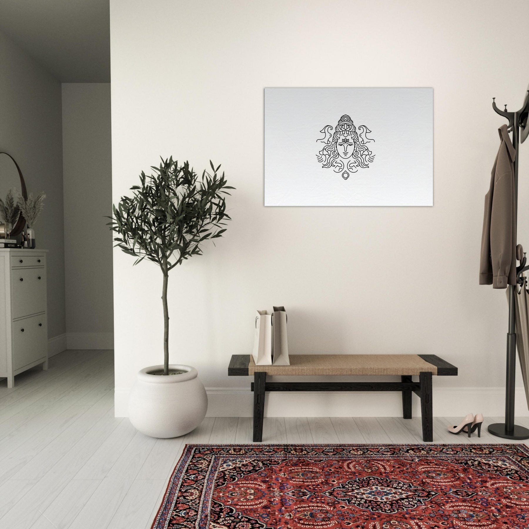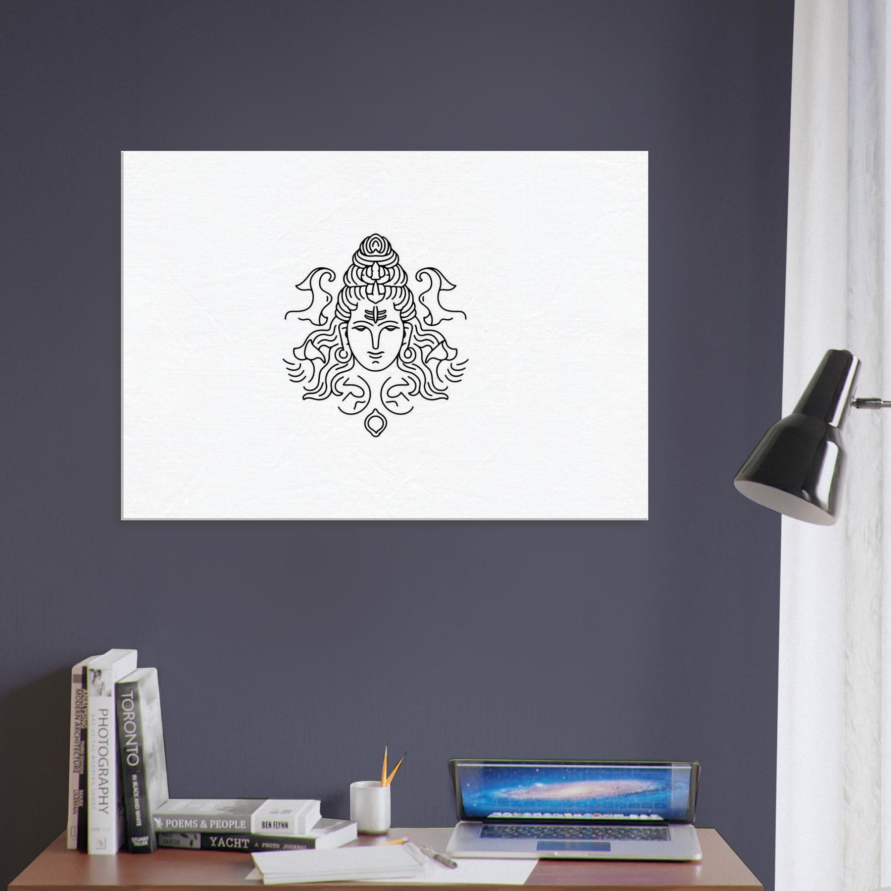 Immerse your space in the hush of the cosmos with this line art of Shiva Nataraja. Every curve feels like a whispered mantra, capturing motion and grace in a single, continuous stroke. The mystical presence of the deity is rendered with elegant restraint, inviting contemplation while adding a sculptural focal point to any room. Printed in pristine monochrome, it pairs effortlessly with modern interiors from living rooms to bedrooms turning walls into a serene sanctuary of balance and wonder.