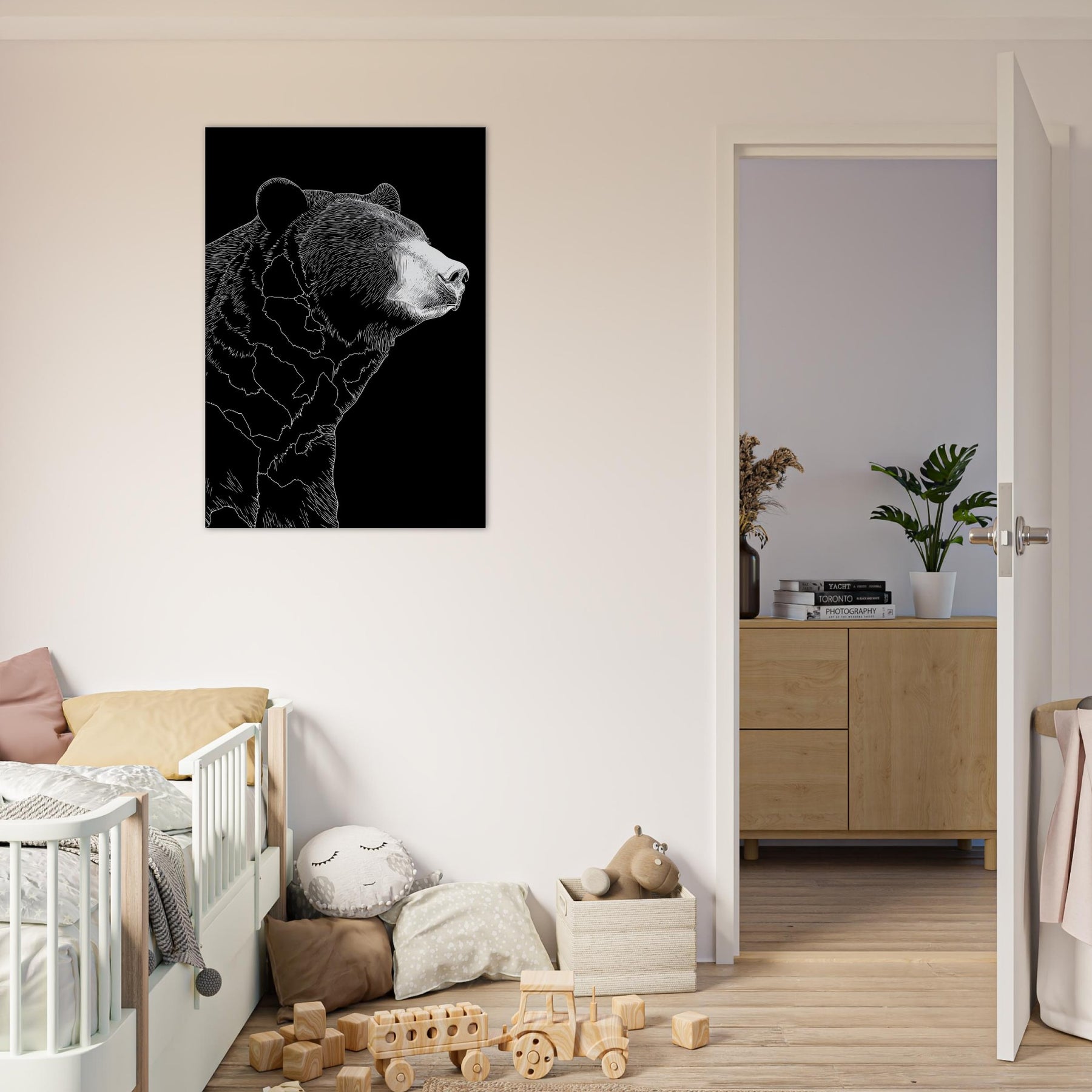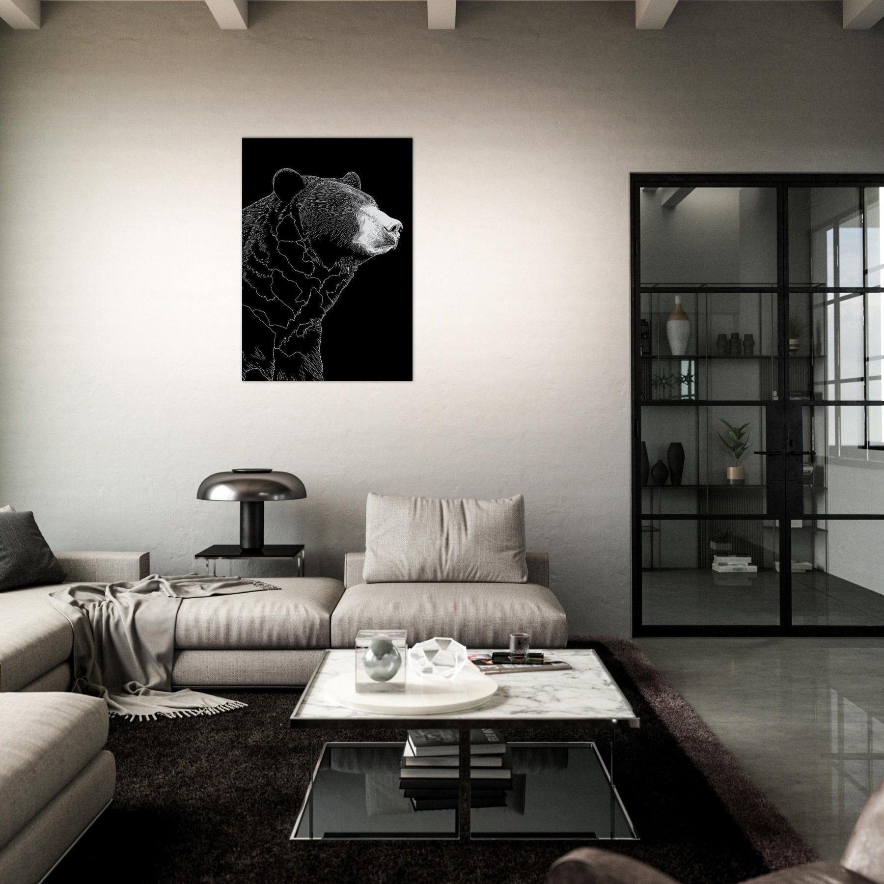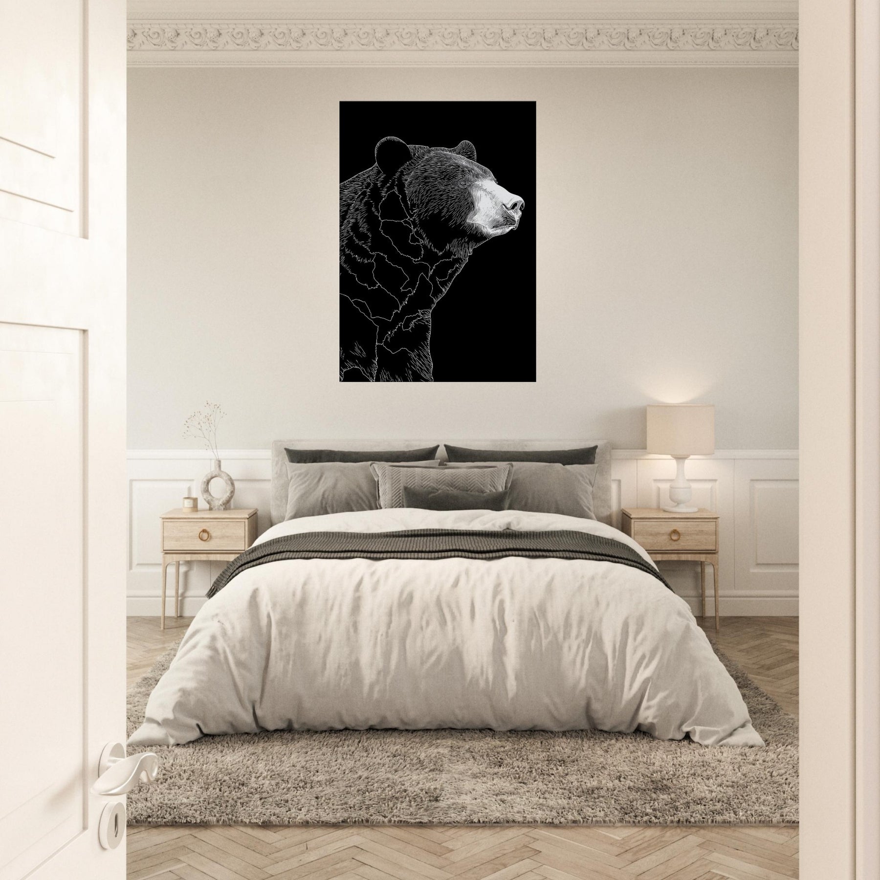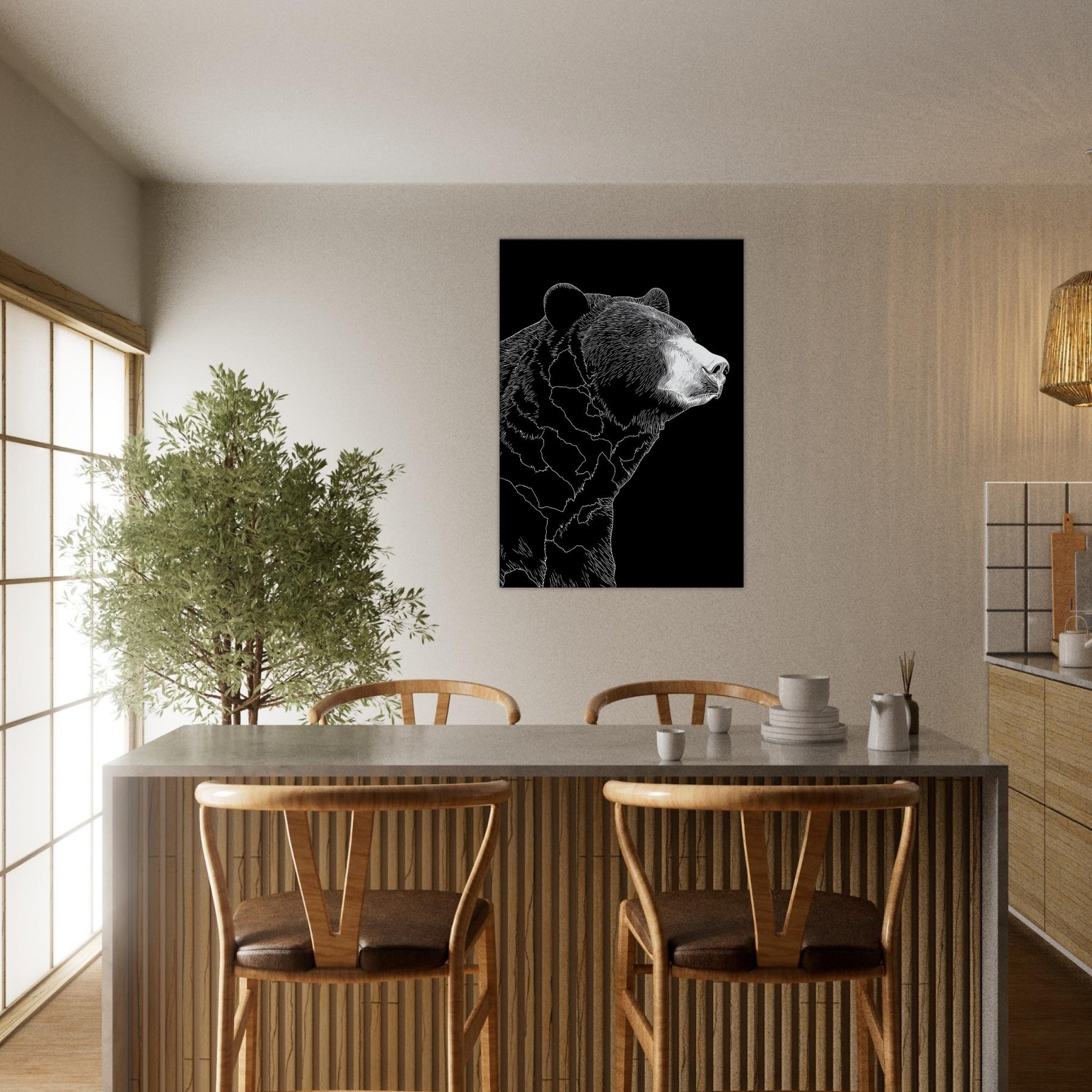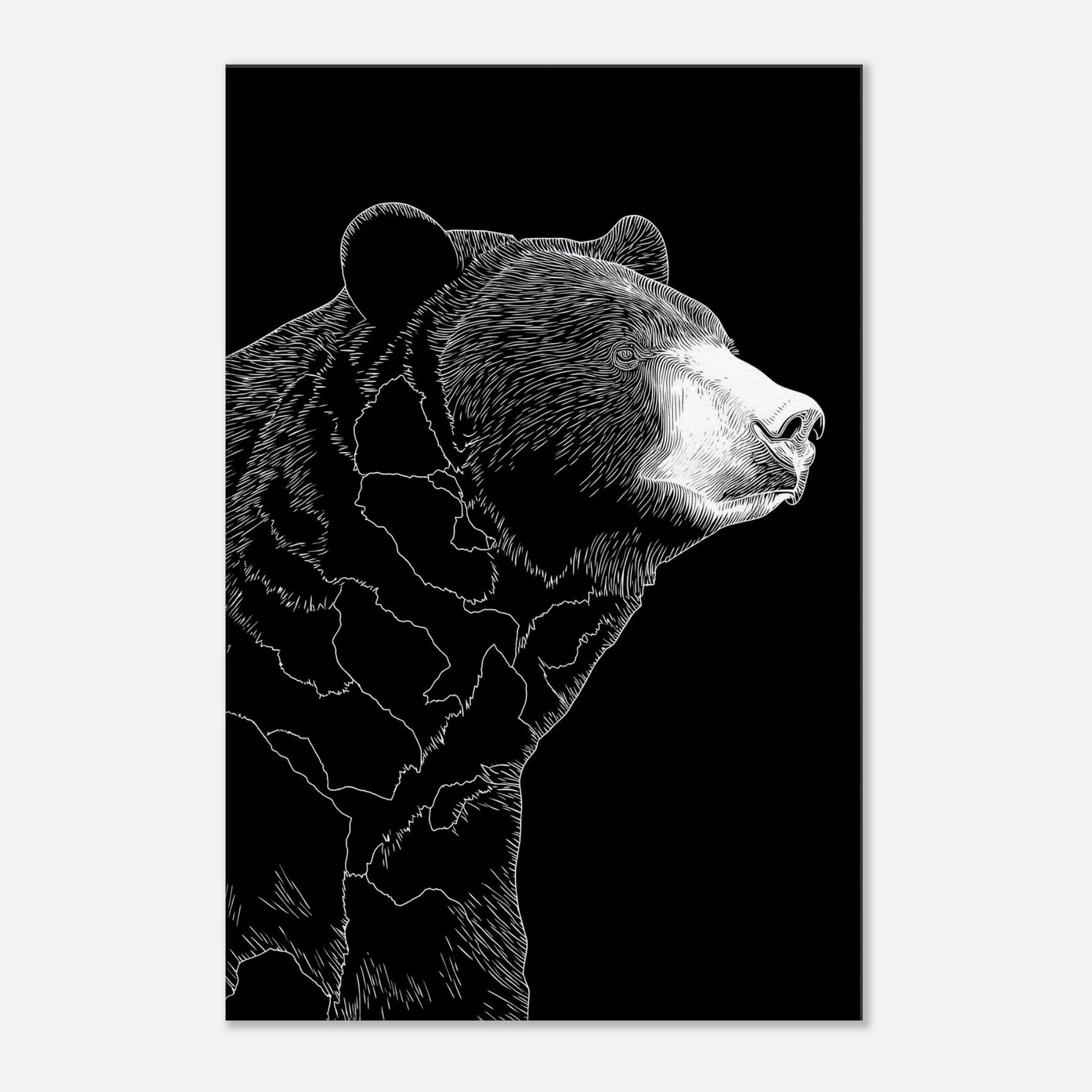 Neatly pared down lines sculpt a patient bear in quiet repose, turning a living space into a tranquil retreat. The stark black and white contrast invites calm focus, as if a single stroke of ice on a winter night captured the bear’s quiet dignity. This minimalist study of form and shadow mingles with soft textures and warm lighting, elevating a sofa corner or bedside nook into a place of stillness, presence, and humane elegance.