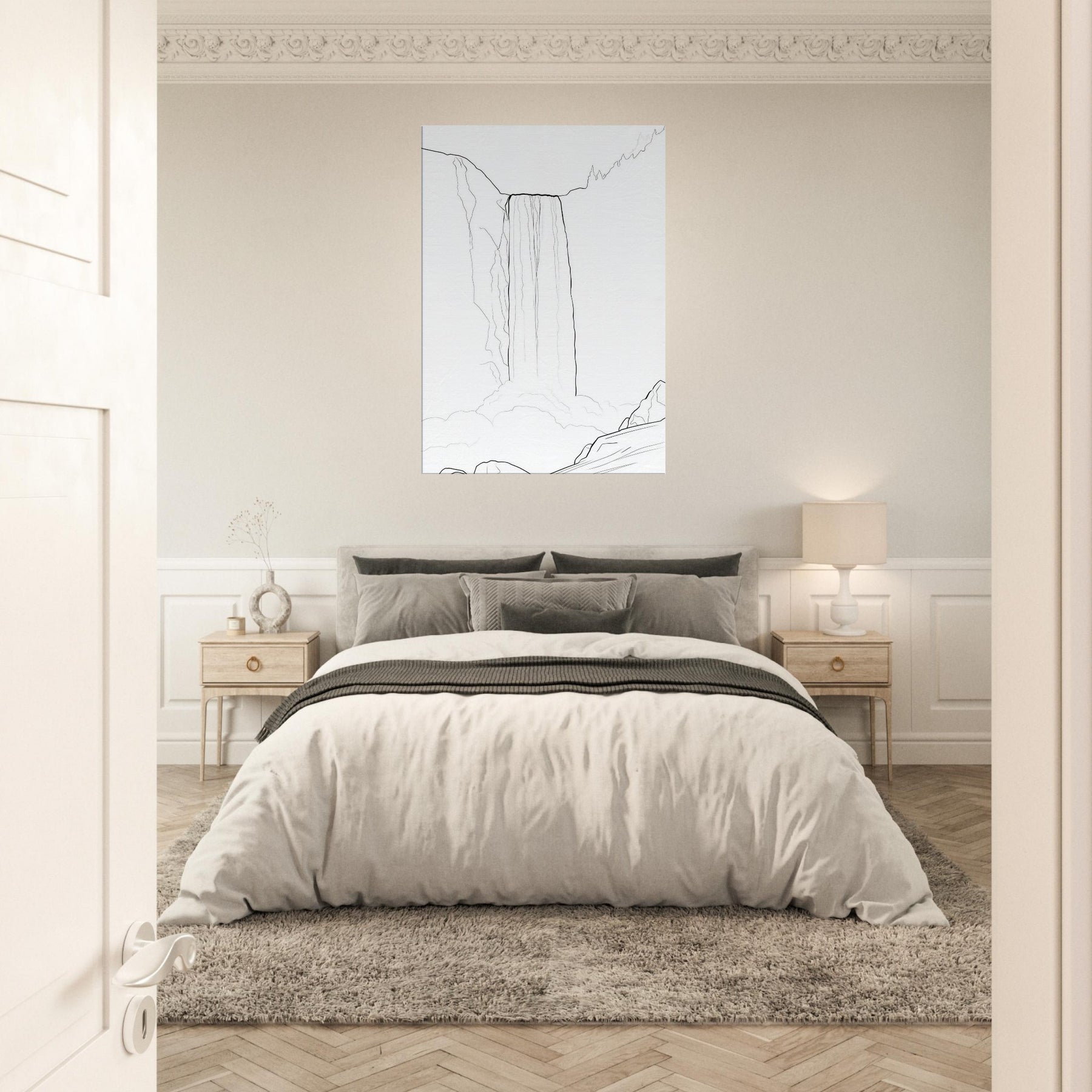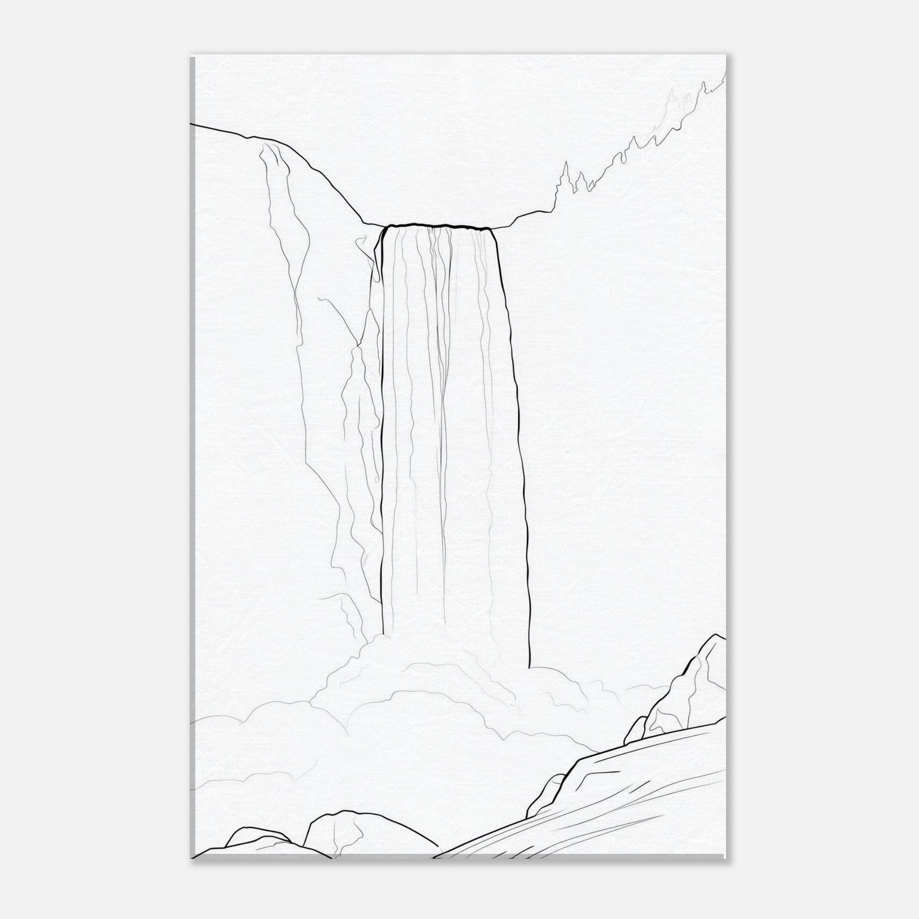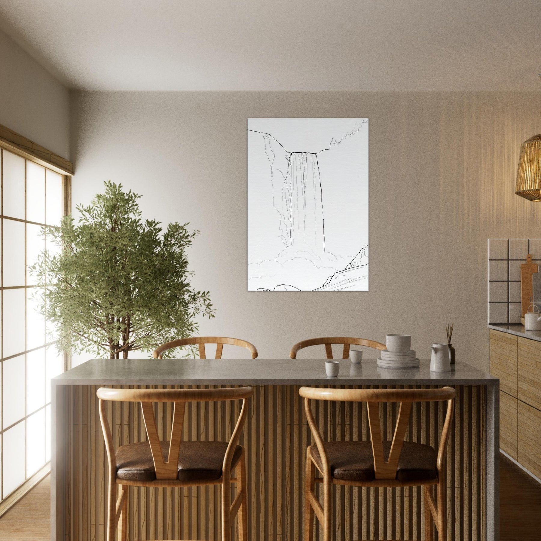 Waterfall appears here as a poised line drawing that invites the eye to wander along the fall and mist. This minimal portrayal of the Waterfall channels quiet energy into your space, turning a wall into a window for contemplation. The airy white backdrop and clean black strokes evoke fresh air, cool spray, and distant thunder, making the room feel more open, serene, and alive with nature.