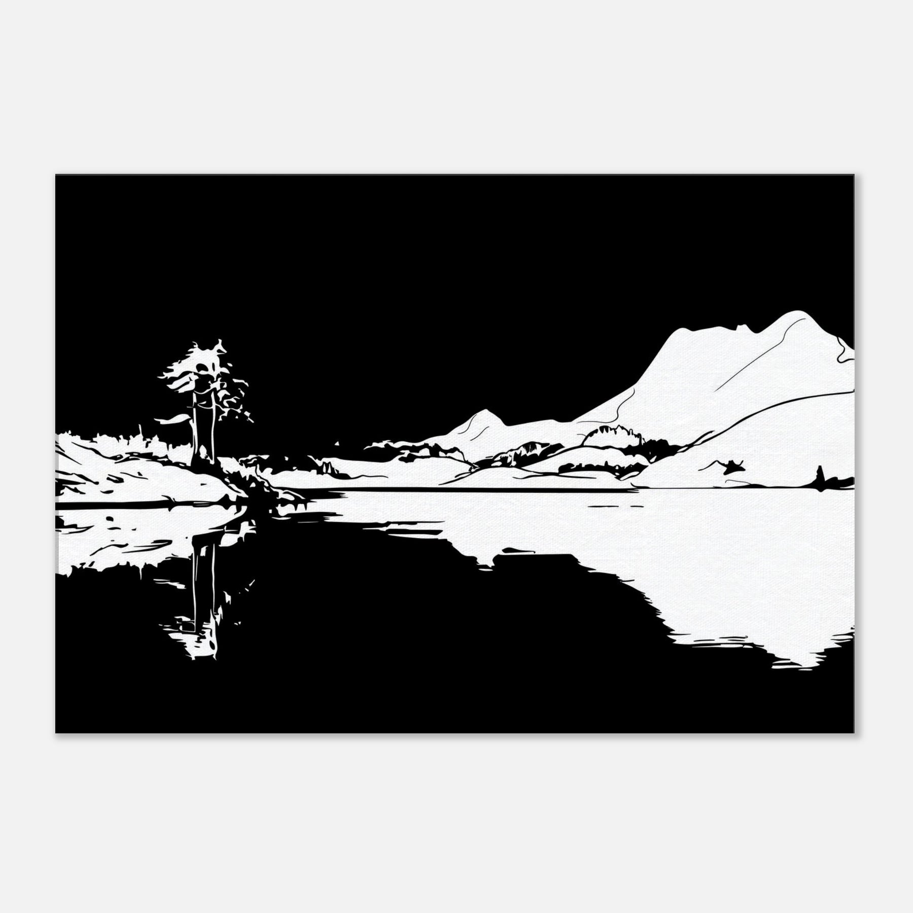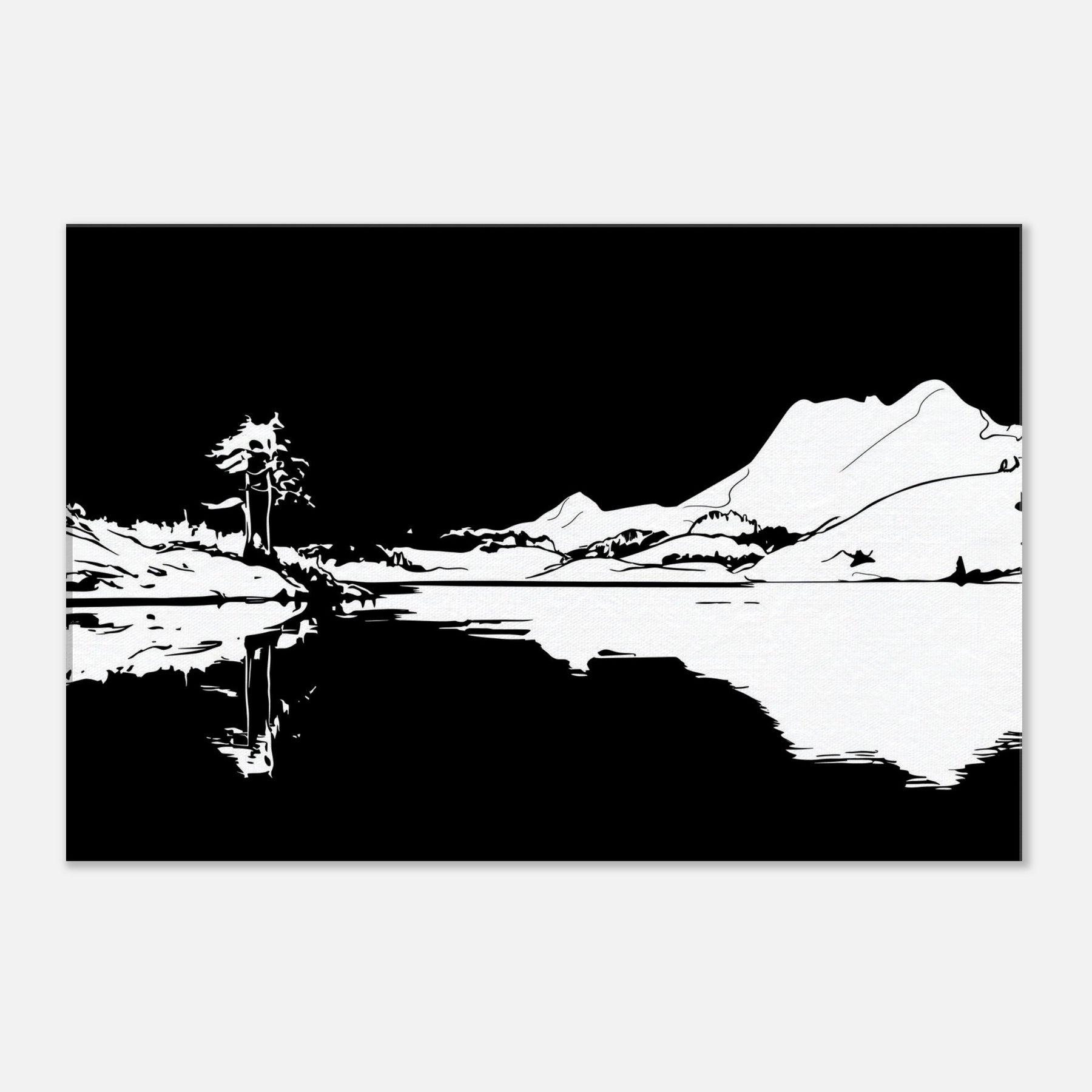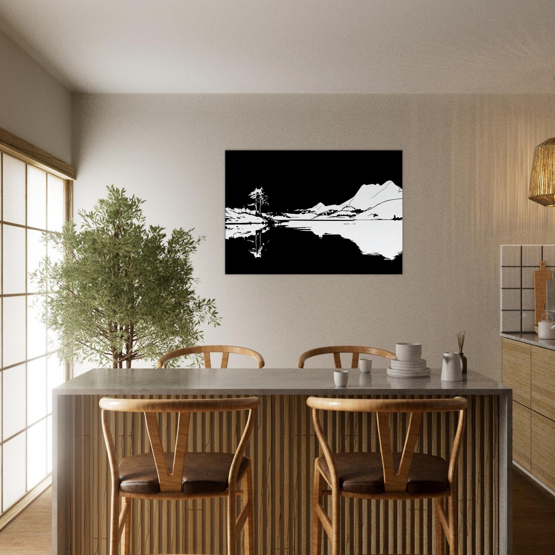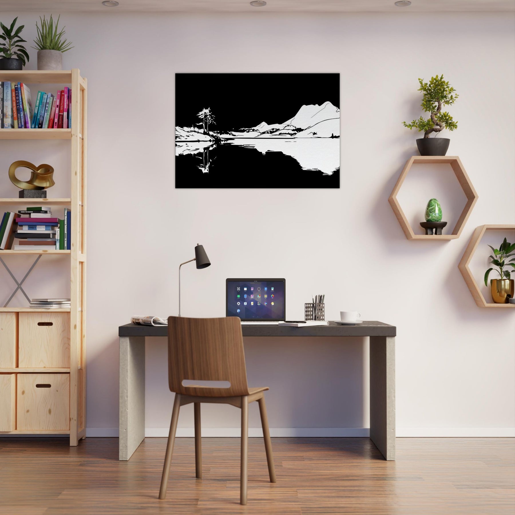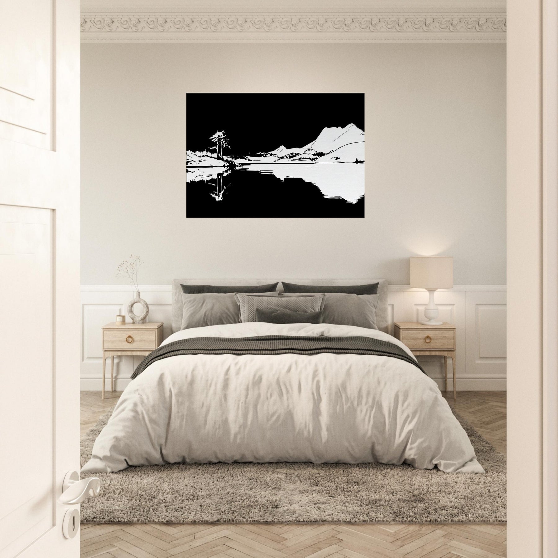 As you step into a room of quiet, this Lake line drawing unfolds in bold black ink and pristine white space. The scene invites a hushed, reflective mood mountains sketch across the horizon, a lone tree leans toward the water, and the surface mirrors every contour with a glassy stillness. It anchors a living space with calm, uncluttered elegance, turning walls into a window of dawn light. Perfect above a sofa or console, it rhythms the room with nature’s simplest, most honest mood.