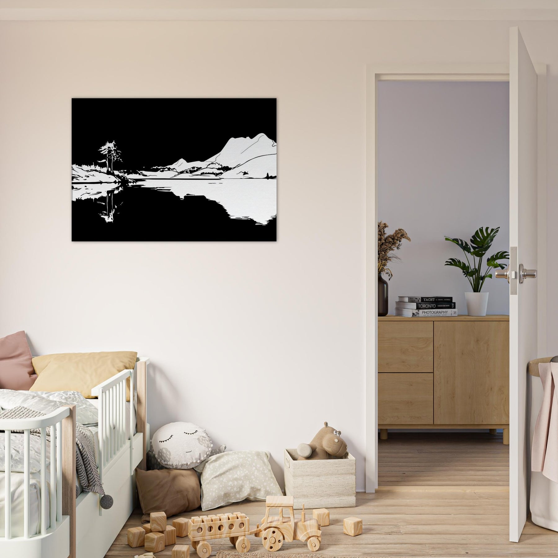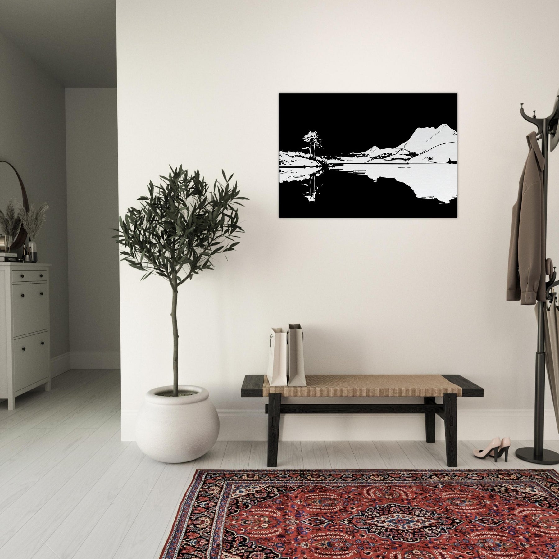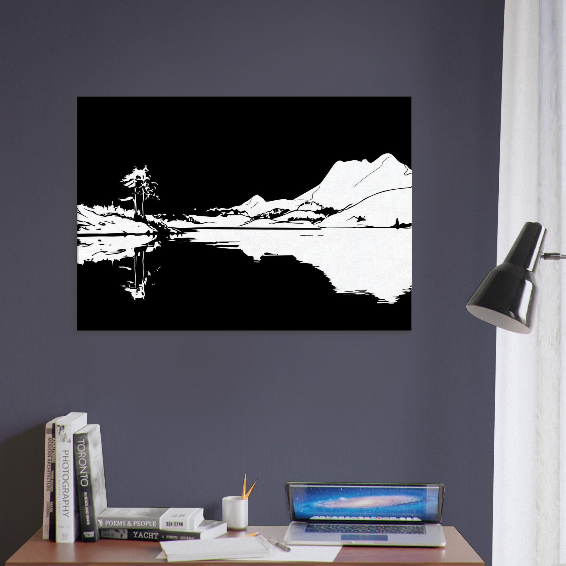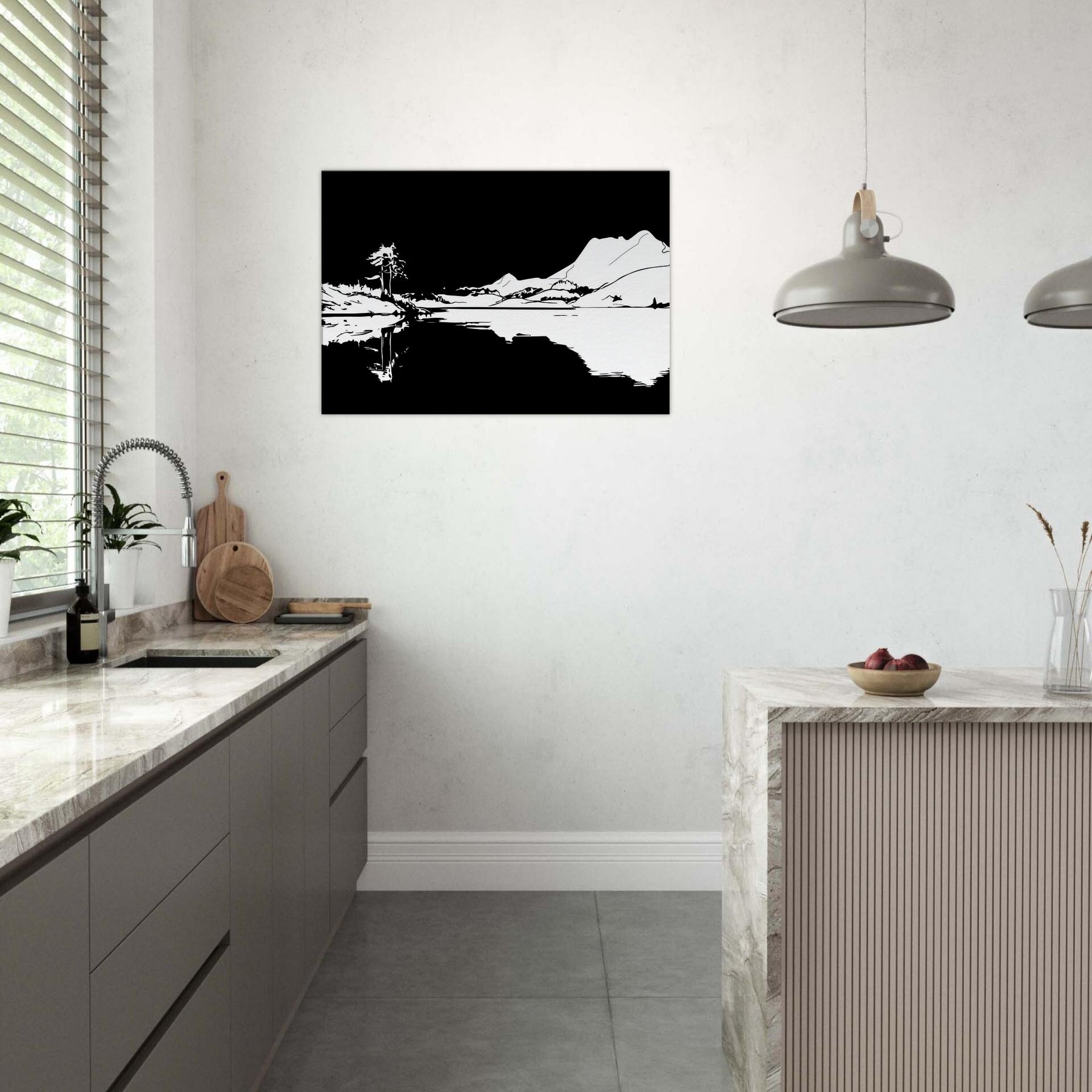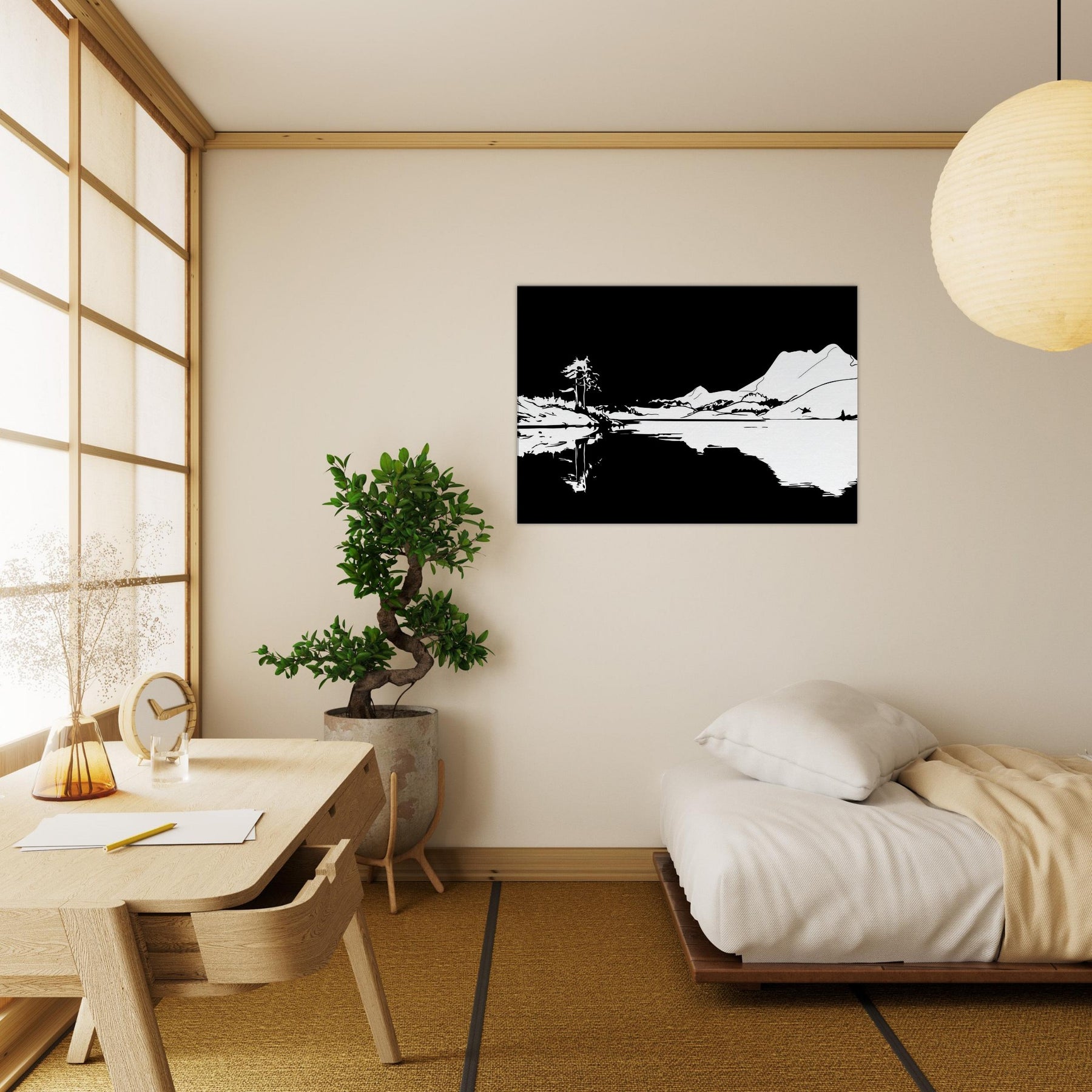As you step into a room of quiet, this Lake line drawing unfolds in bold black ink and pristine white space. The scene invites a hushed, reflective mood mountains sketch across the horizon, a lone tree leans toward the water, and the surface mirrors every contour with a glassy stillness. It anchors a living space with calm, uncluttered elegance, turning walls into a window of dawn light. Perfect above a sofa or console, it rhythms the room with nature’s simplest, most honest mood.