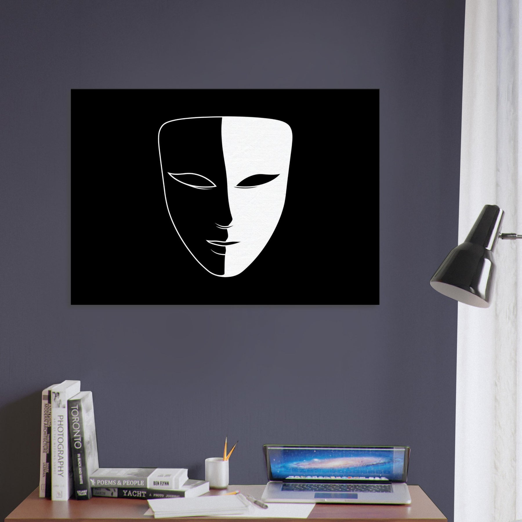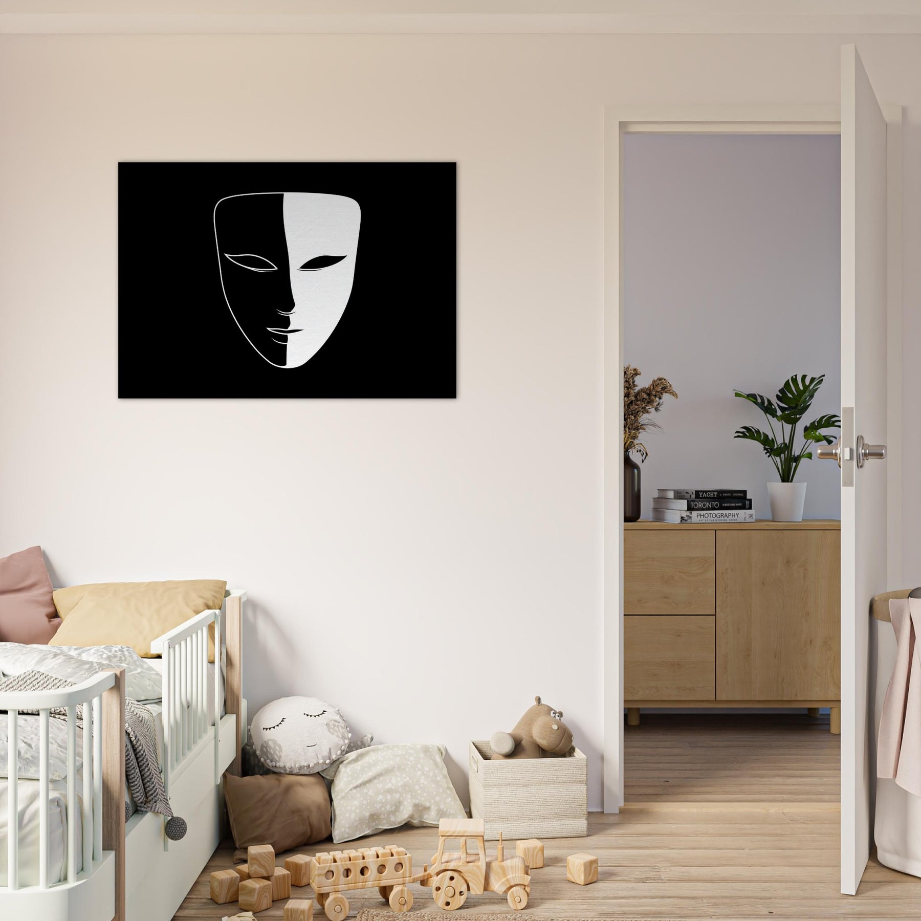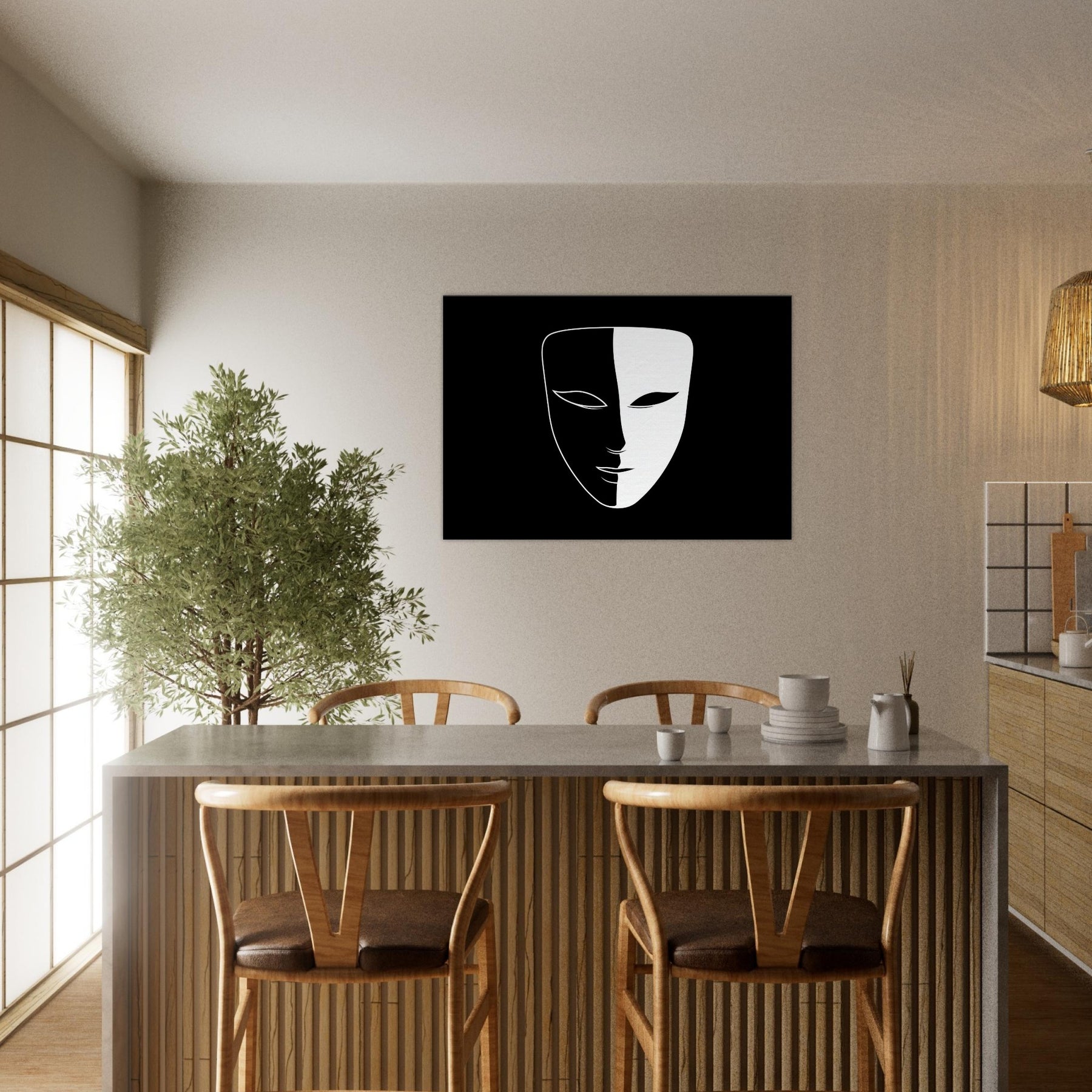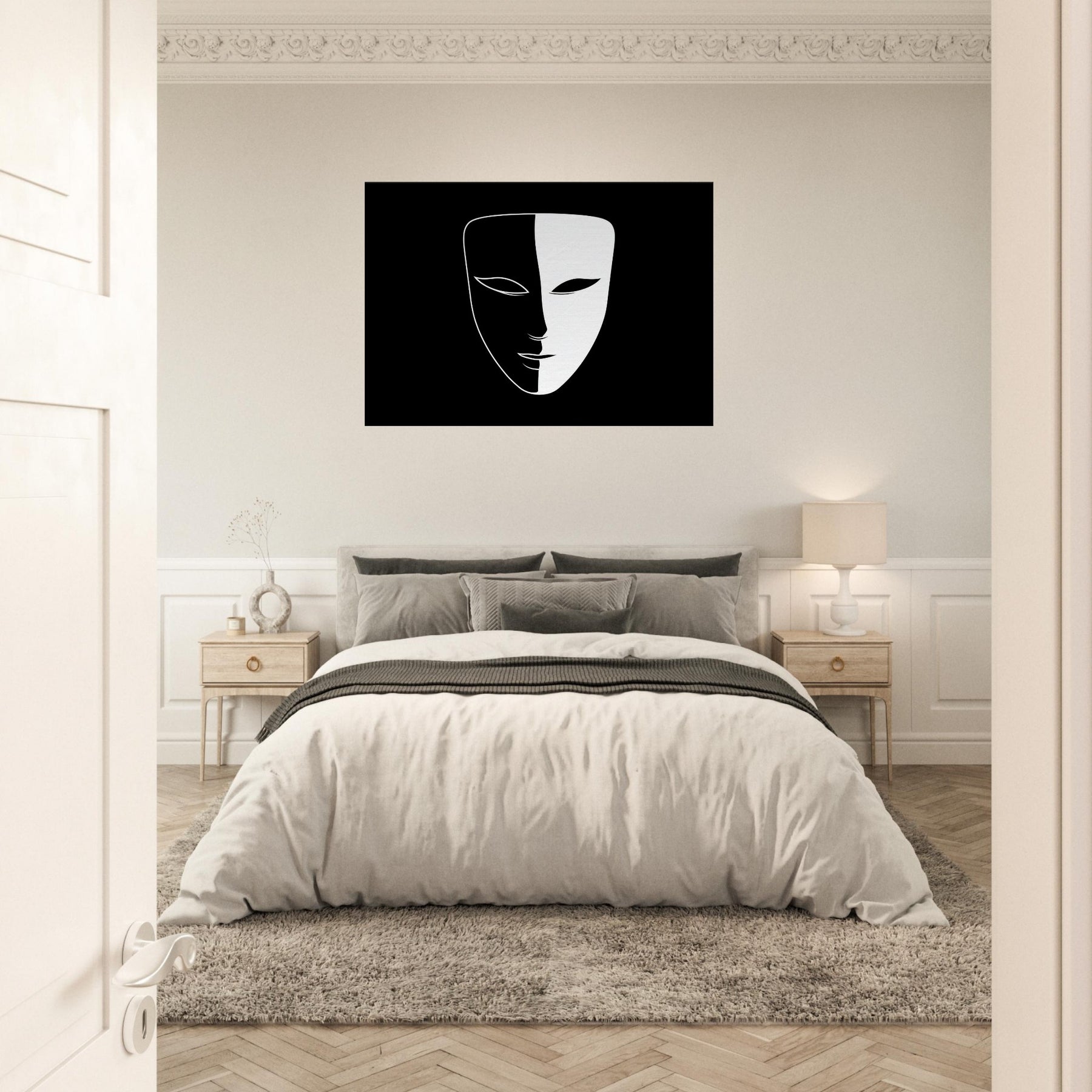 The Mask (Neutral Theater) Silhouette hangs as a quiet, cinematic presence. Split in stark black and white, the minimalist line art traces a serene face, offering mystery and clarity in equal measure. The subject feels both theatrical and intimate a quiet hero that resonates in a living room or entryway. Its balanced contrast invites soft light to play across the wall, turning everyday spaces into a stage for reflection and refined taste.