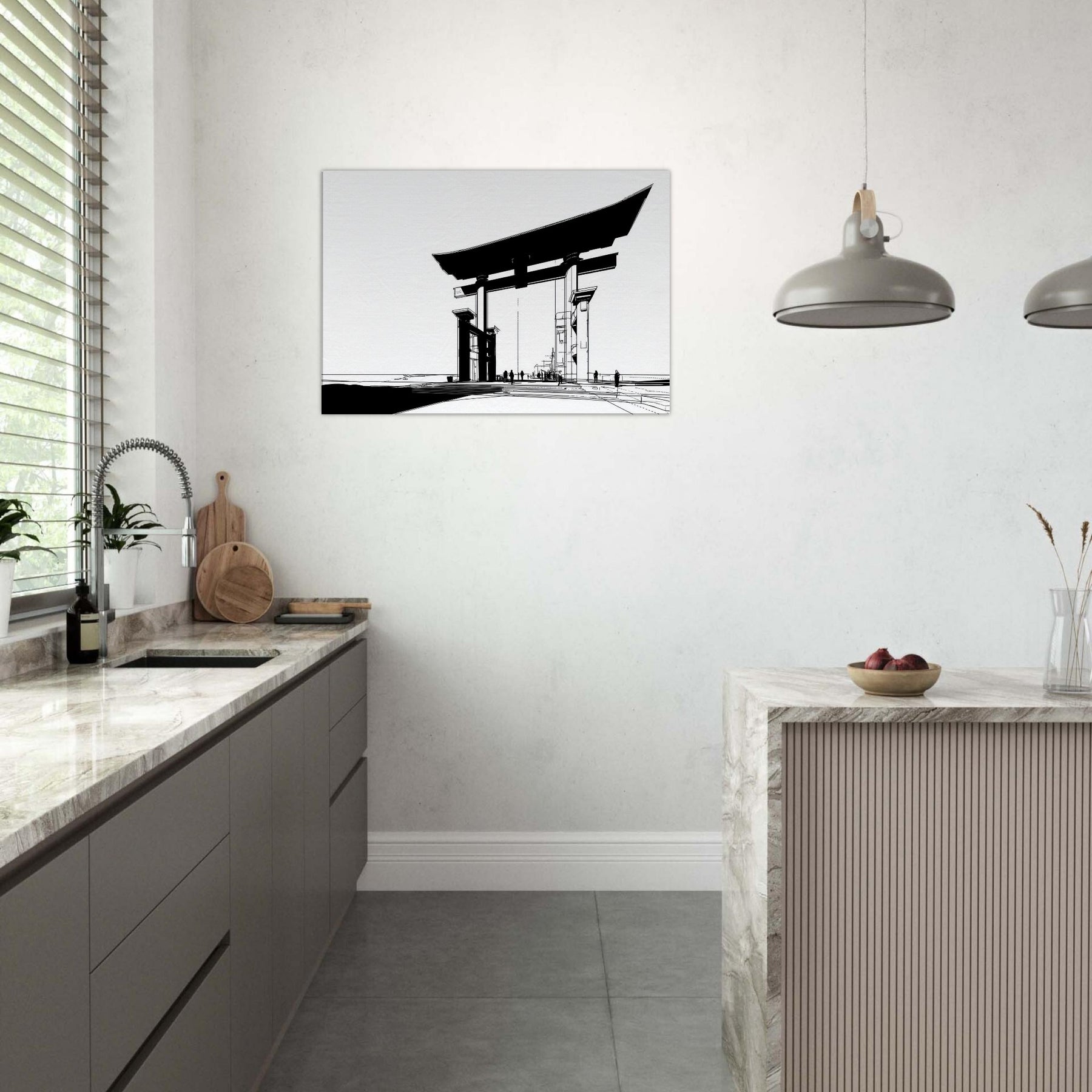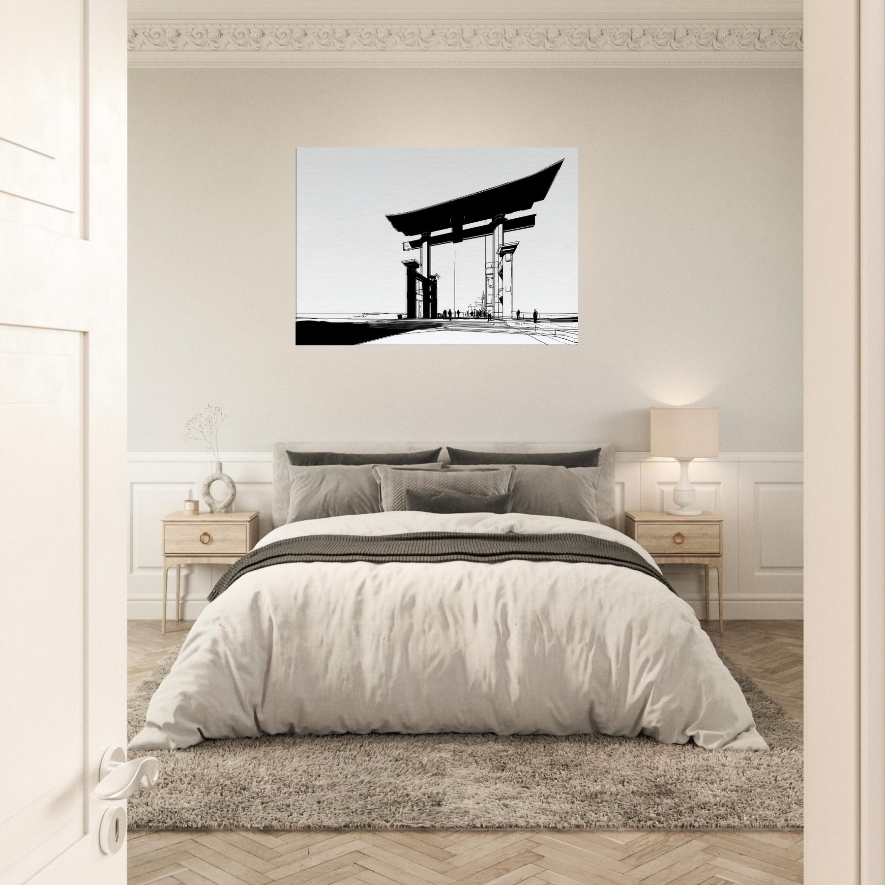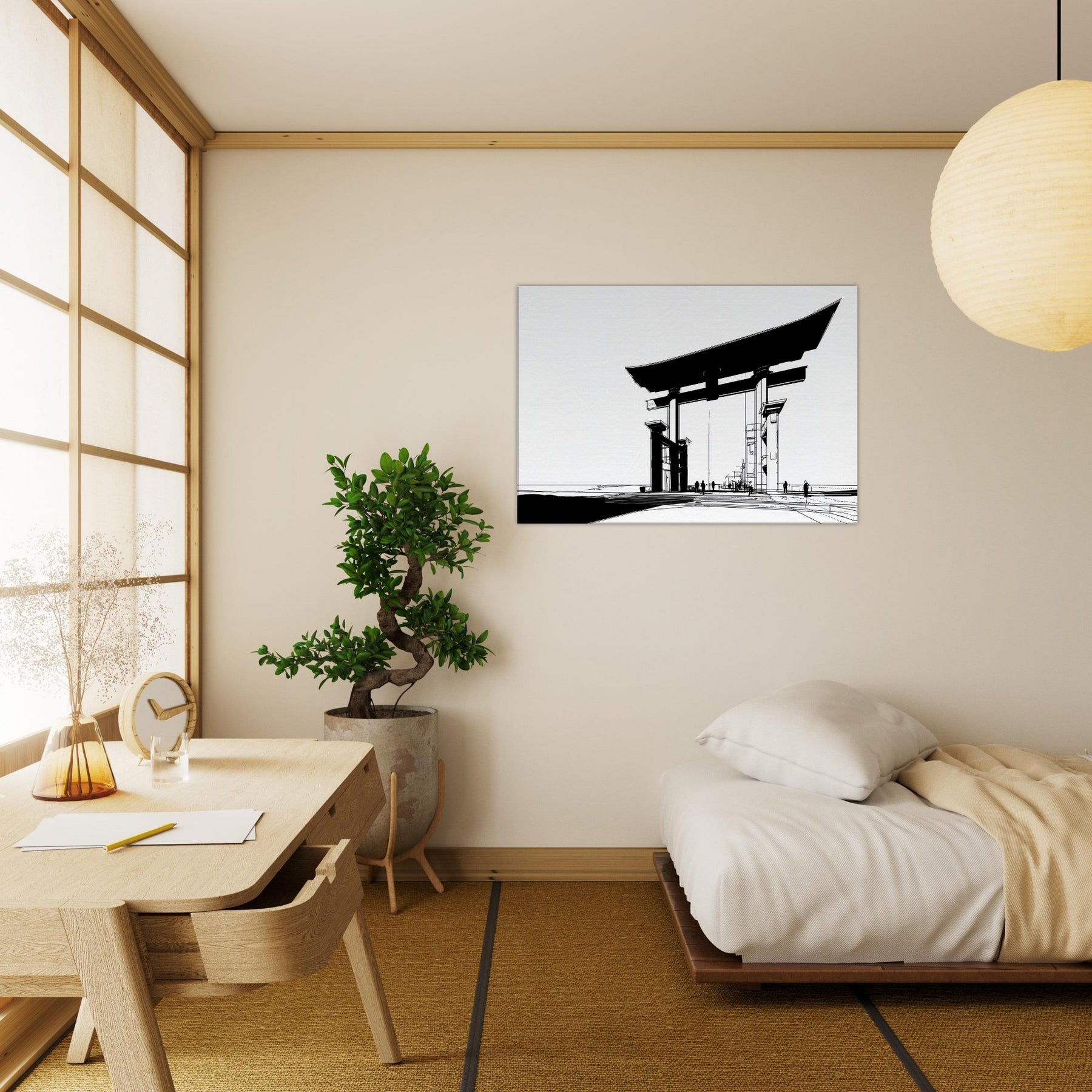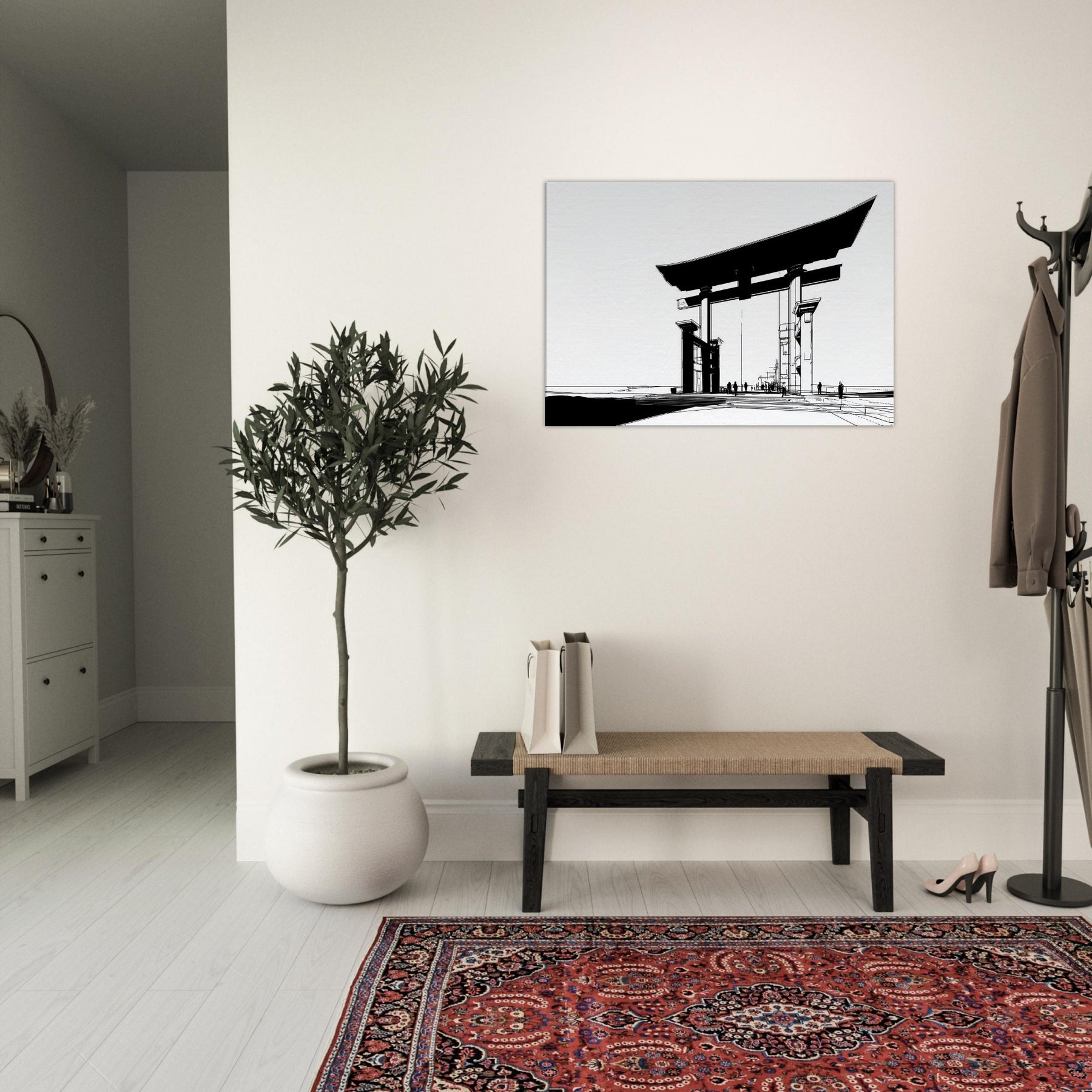 Made of clean, bold lines, this Torii Gate unfolds with quiet grandeur across a horizon of white space. The line art silhouette invites your eye to wander along its graceful arch, echoing ritual calm and urban possibility. In a living room, it becomes a contemplative backdrop architectural poetry that pairs with glass and wood, casting shadows that shift with the day. A singular, modern moment of balance, it elevates a minimalist space with a sense of travel, memory, and serene invitation.