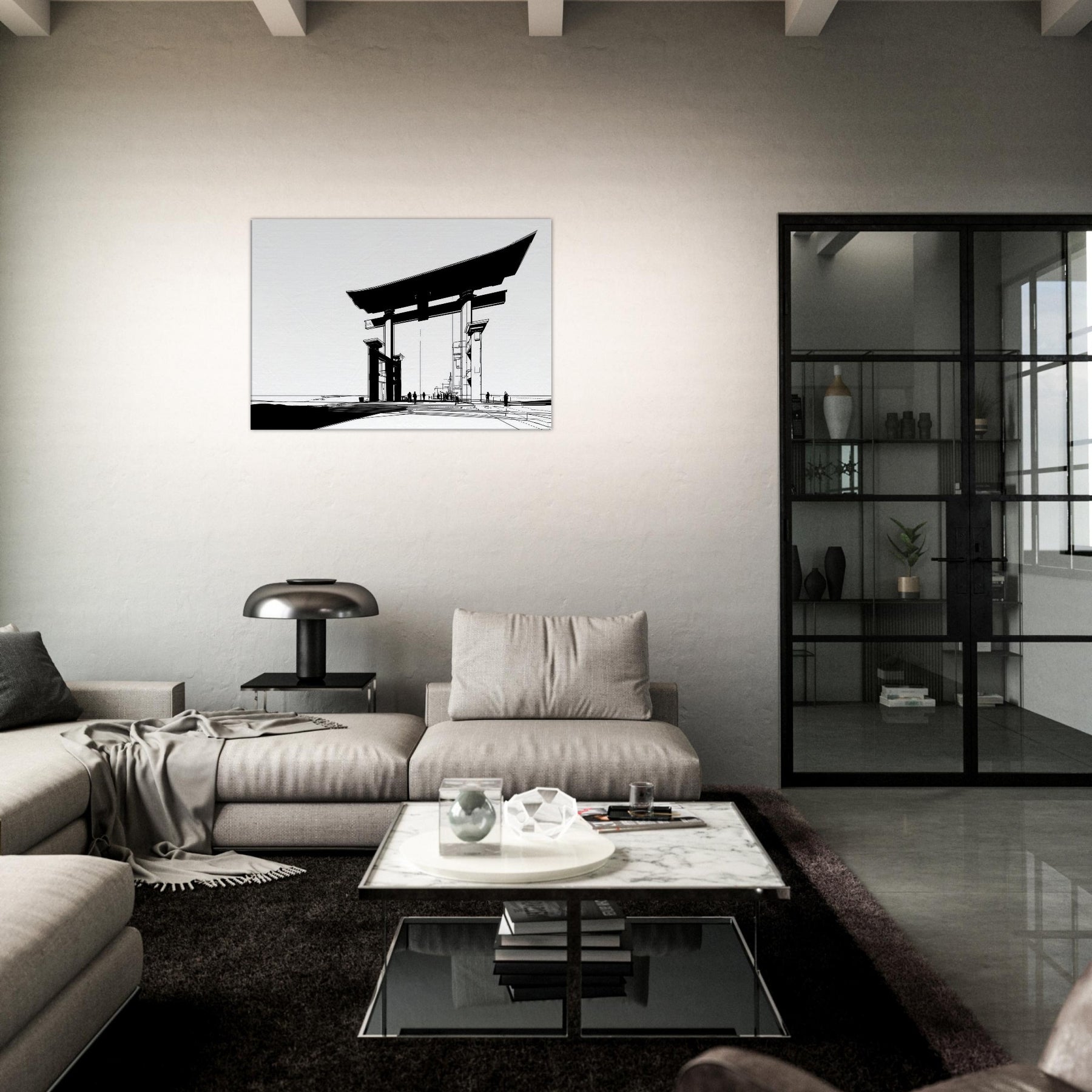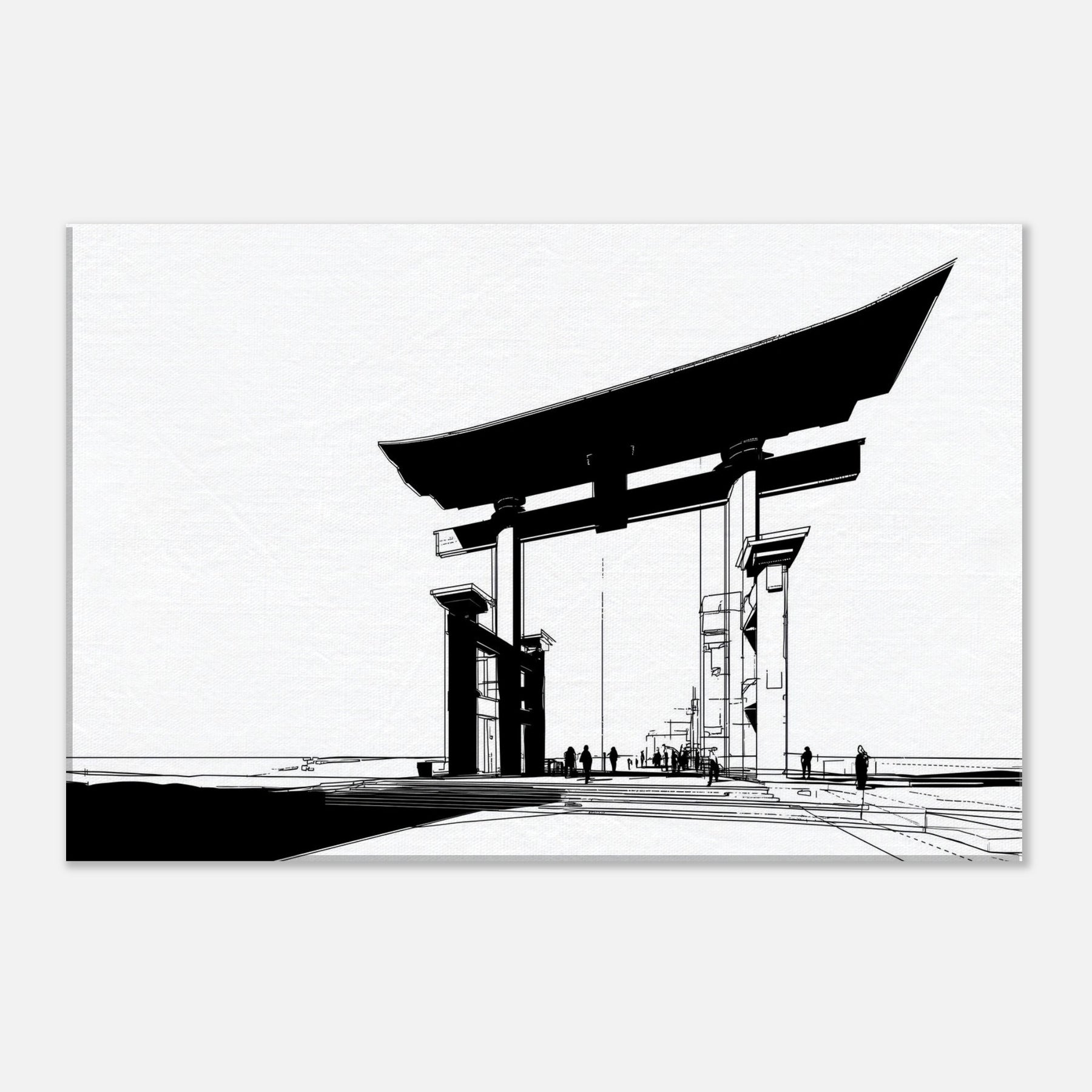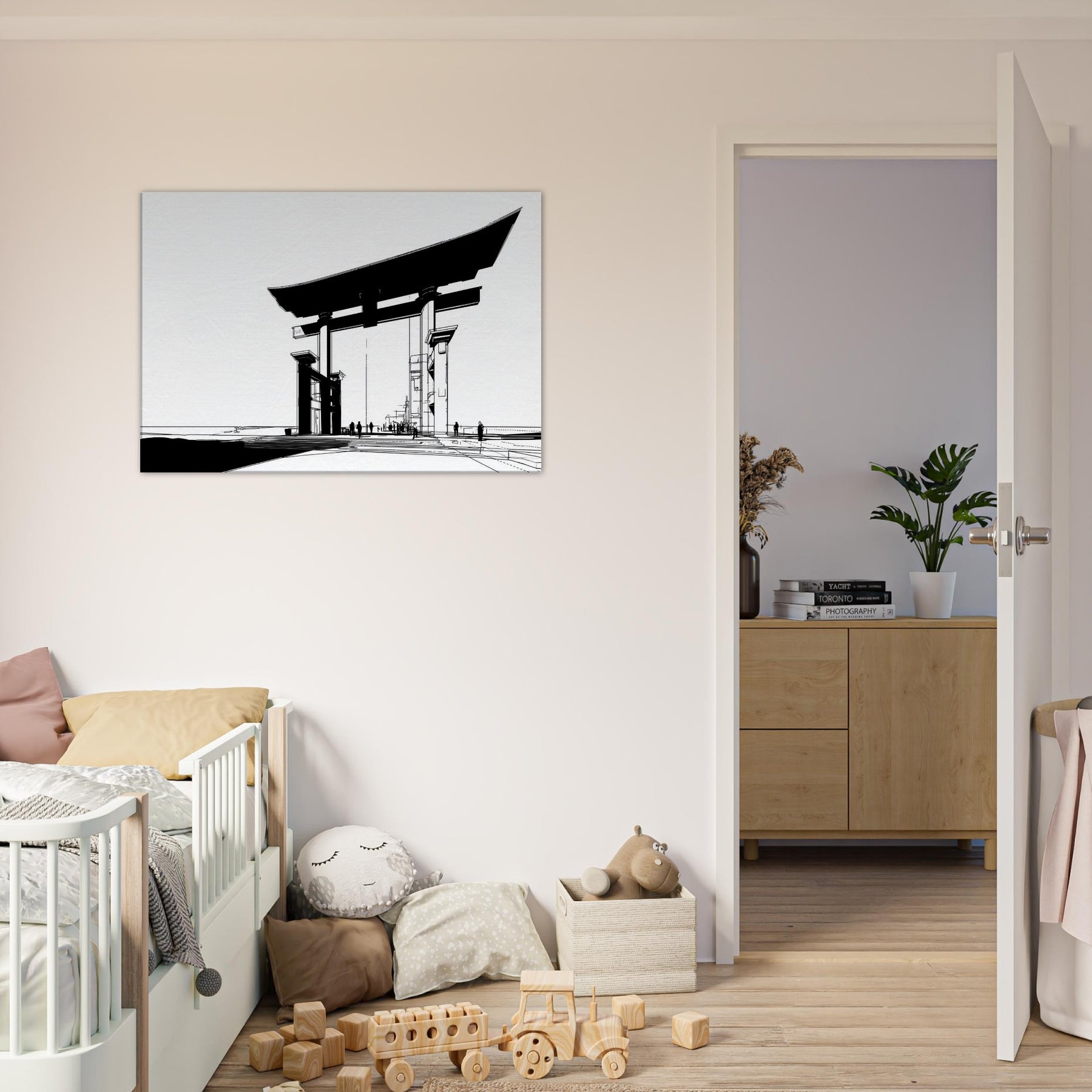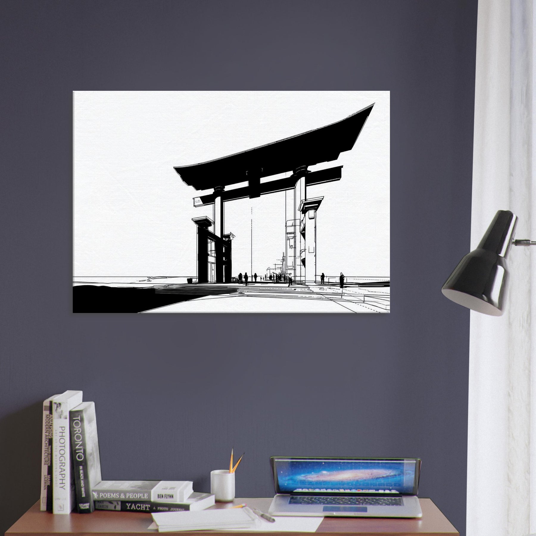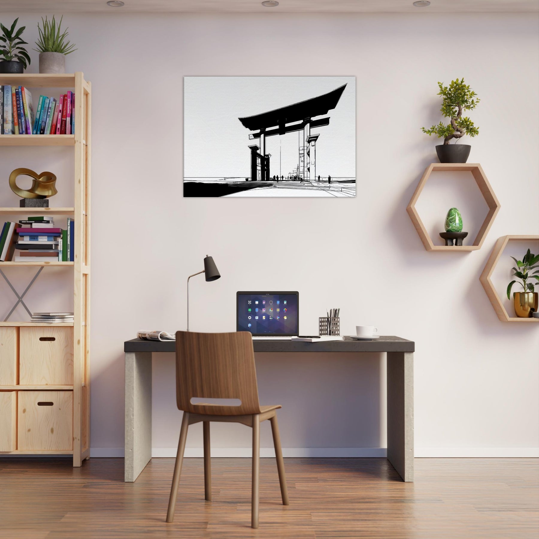 Made of clean, bold lines, this Torii Gate unfolds with quiet grandeur across a horizon of white space. The line art silhouette invites your eye to wander along its graceful arch, echoing ritual calm and urban possibility. In a living room, it becomes a contemplative backdrop architectural poetry that pairs with glass and wood, casting shadows that shift with the day. A singular, modern moment of balance, it elevates a minimalist space with a sense of travel, memory, and serene invitation.