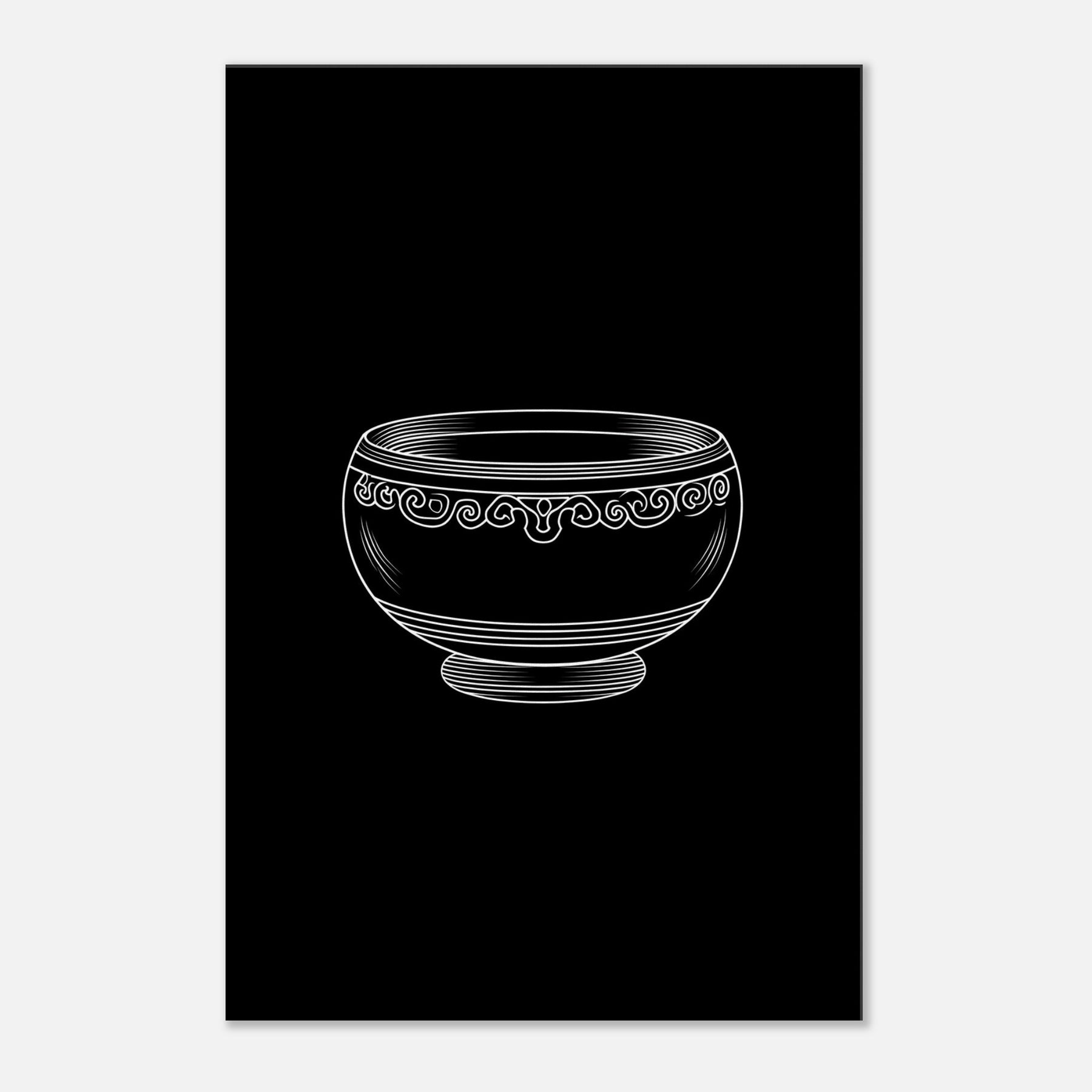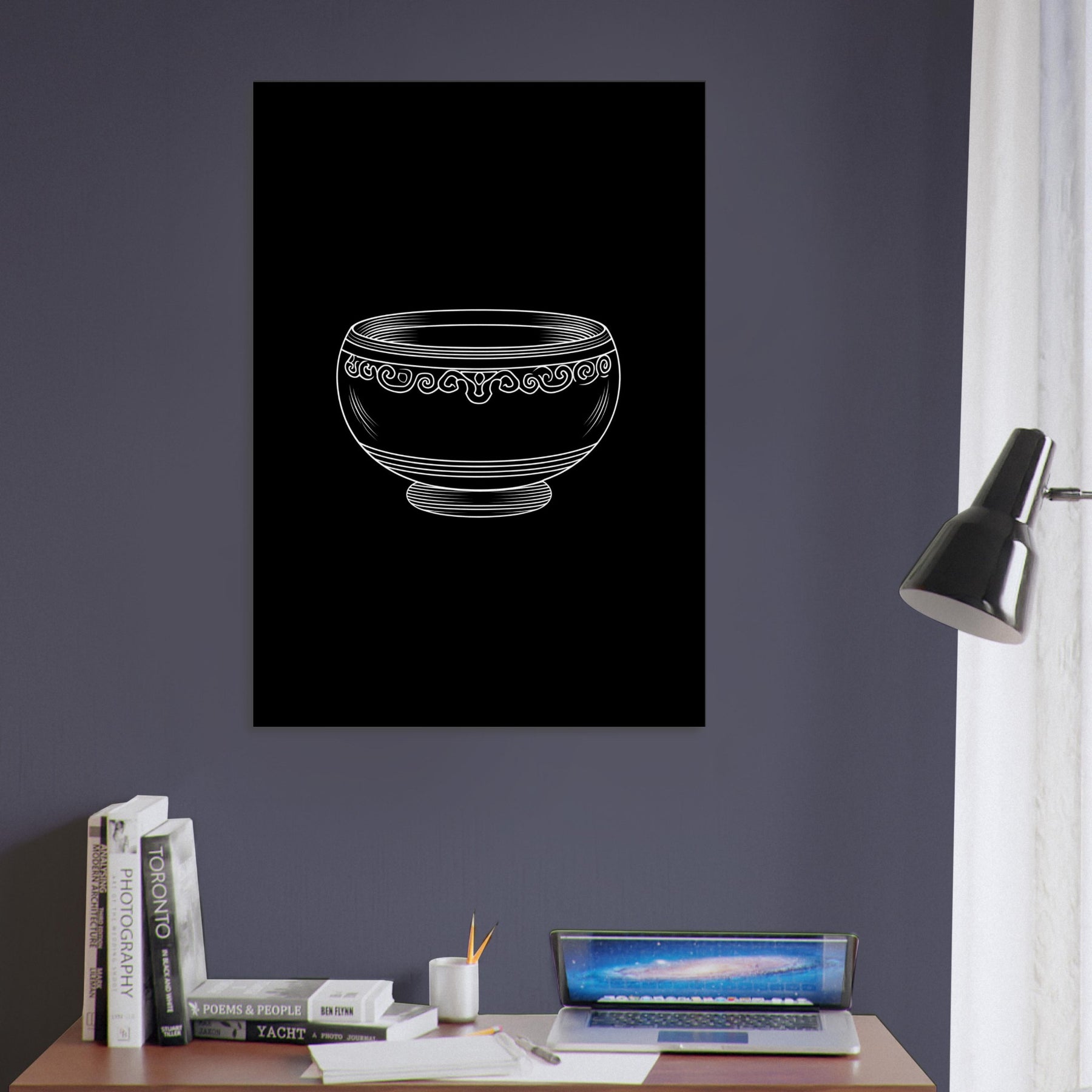 Immerse your space in a soft, magnetic calm with this Singing Bowl line drawing. The stark white outline against a velvet black field radiates restrained grace, as if a quiet bell is about to chime. The floating circumference and decorative scrolls suggest ritual and memory, inviting contemplation without clutter. Hang it where morning light spills across a sofa or beside a serene corner; its mystical aura nourishes focus, balance, and a sense of timeless invitation.