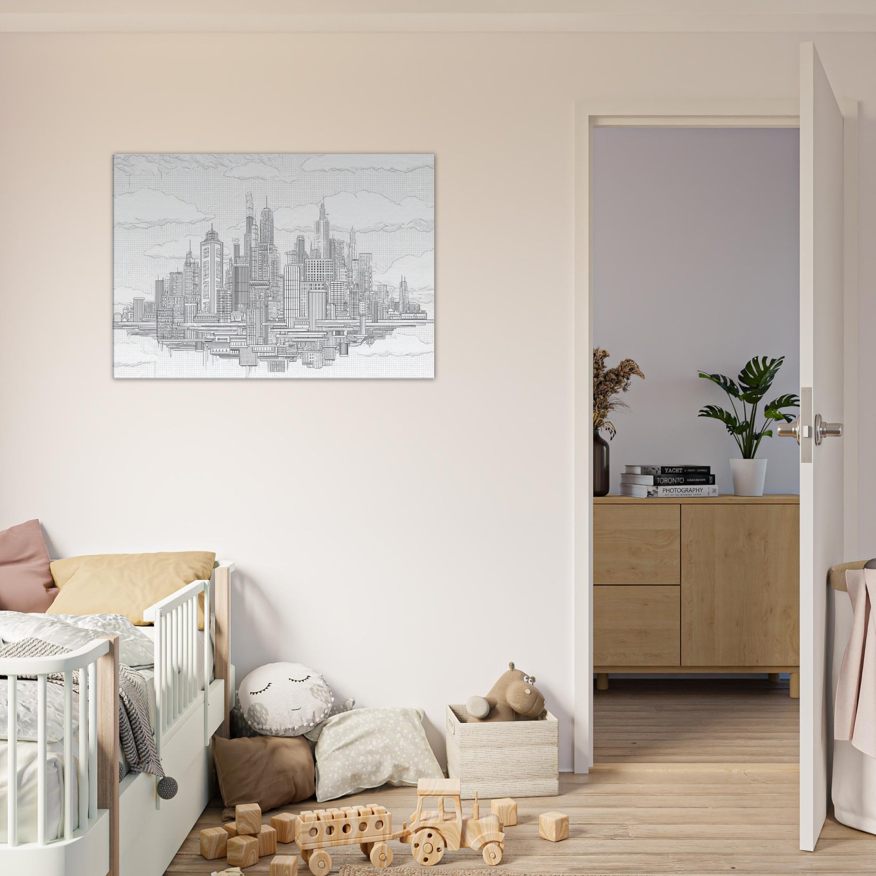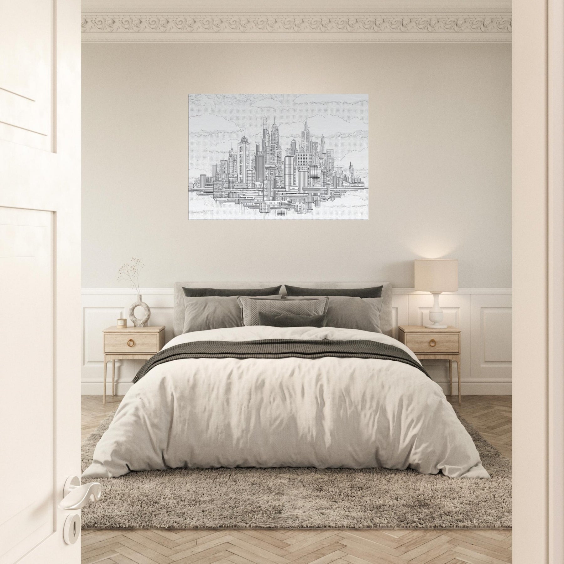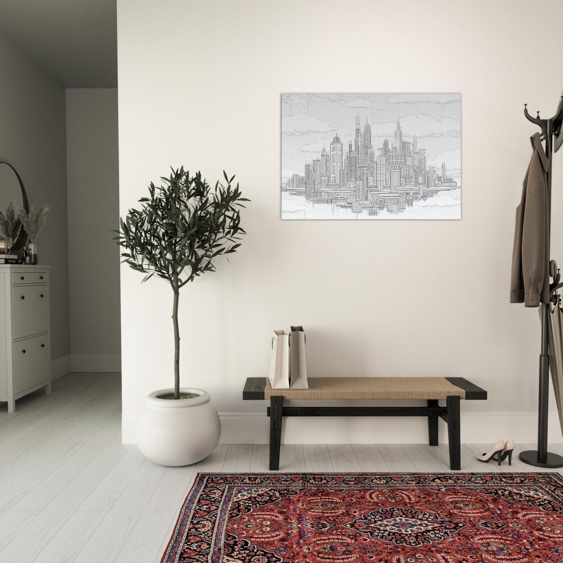 Let your room rise with a skyline drawn in delicate lines and quiet grandeur. The Floating City in the Sky unfolds in pristine line art, inviting the eye to wander airy terraces and glassy spires. In a living space, it becomes a calm horizon minimal, architectural, and dreamlike casting soft shadows and a buoyant, imaginative energy. Perfect above a sofa or in a reading nook, this piece lends mythic scale and refined serenity to everyday life.
