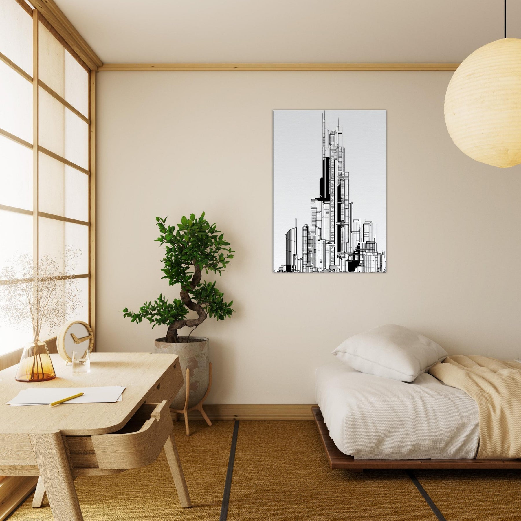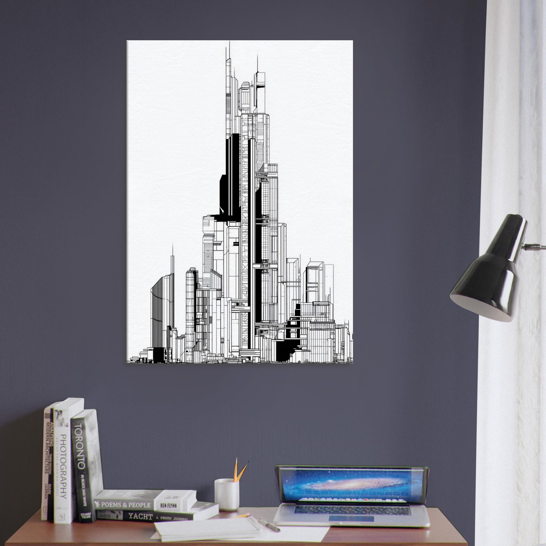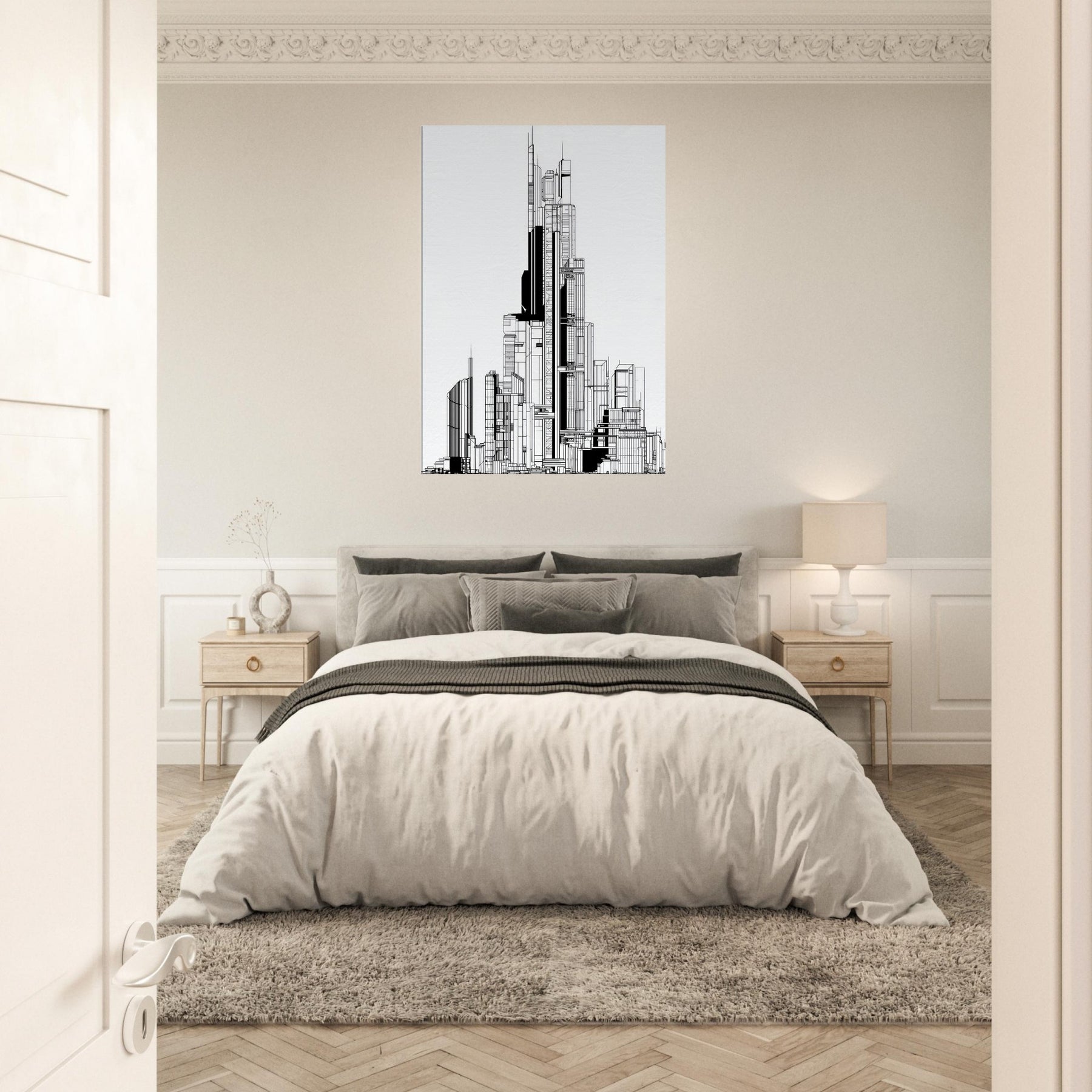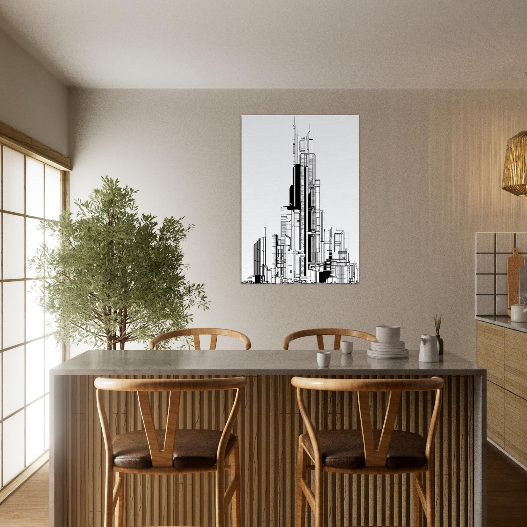 Rendered in precise line art, this wall piece gives life to a city that breathes in order and possibility. Futuristic Skyscrapers rise in stark black contours against generous white, their angles catching light and shadow like a quiet chorus. The composition exudes calm, contemporary energy perfect for a living room or home office where clarity of form sharpens focus and imagination. Hung alone or in a series, it invites slow, thoughtful reflection amid daily motion.