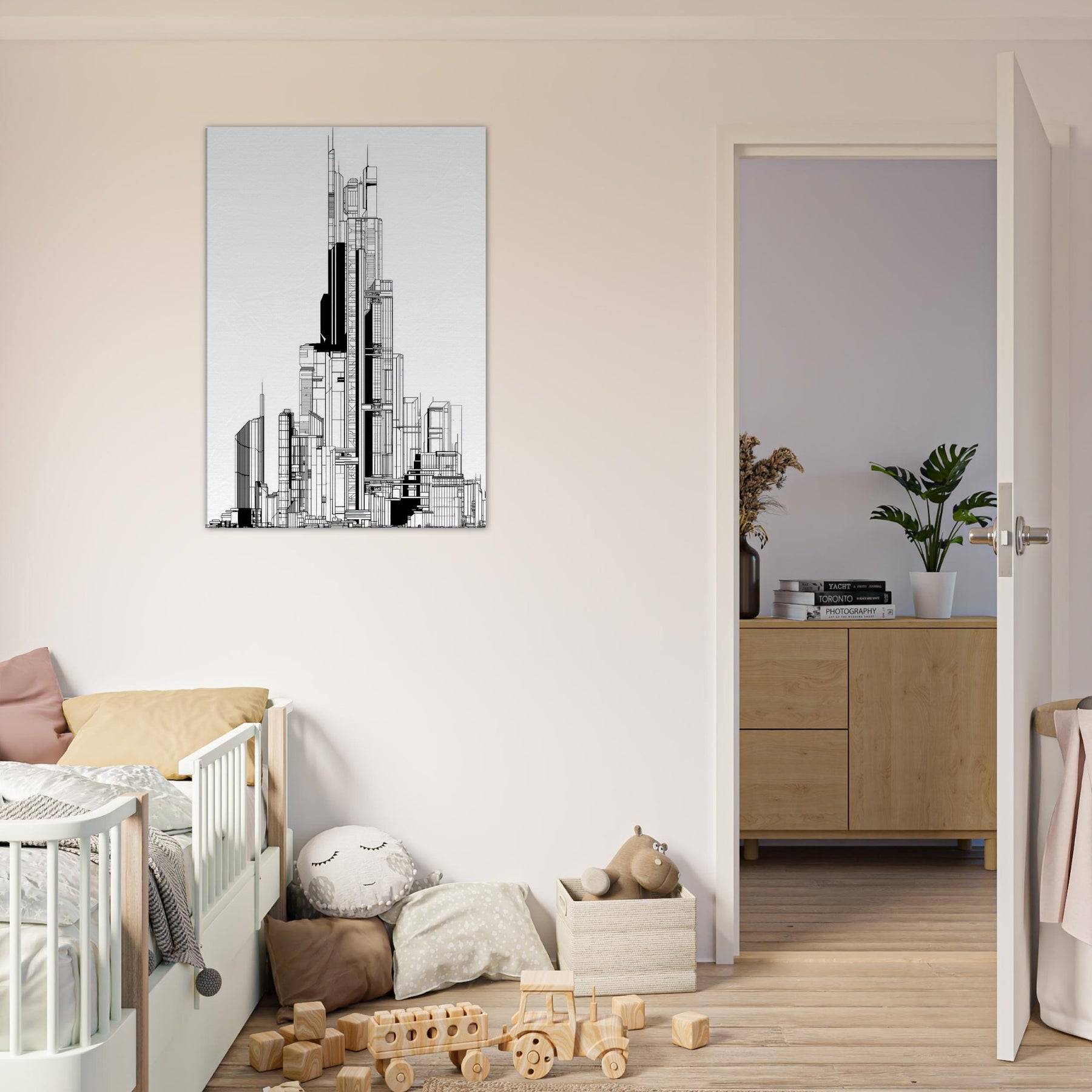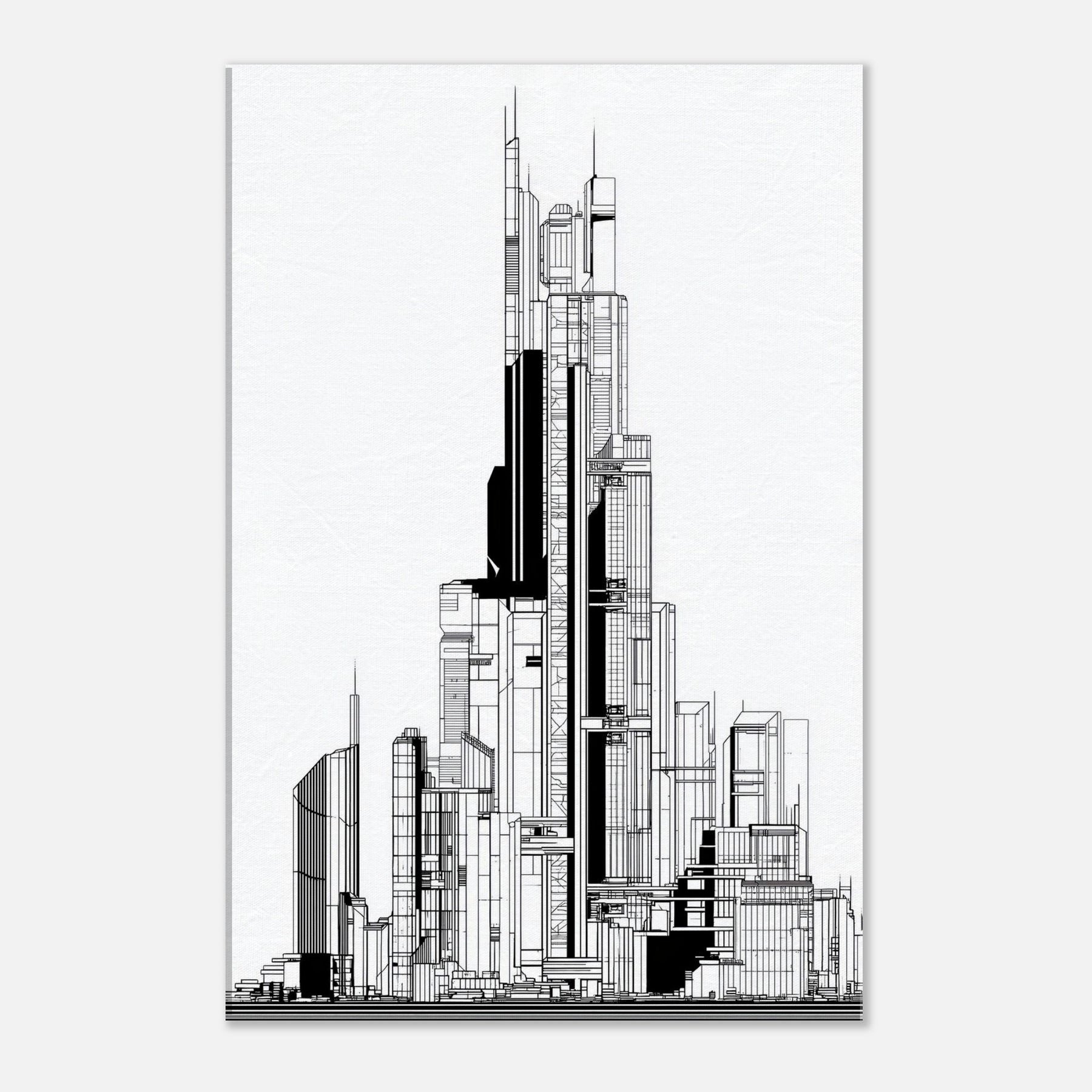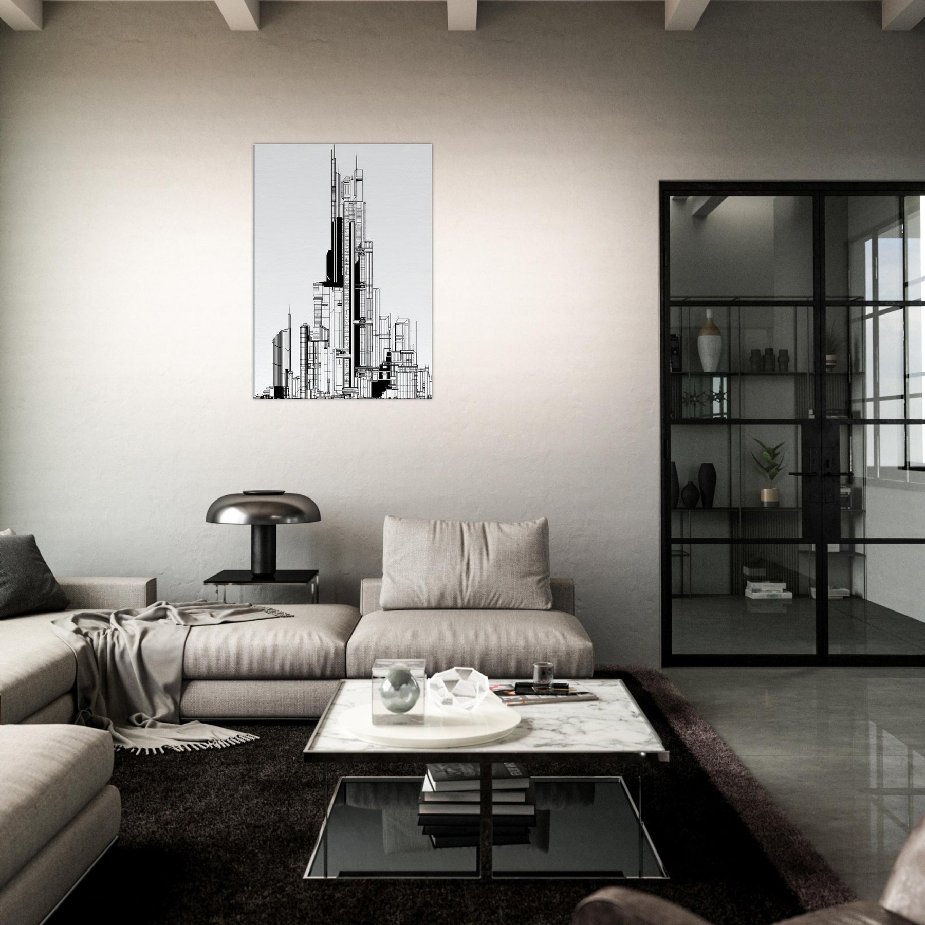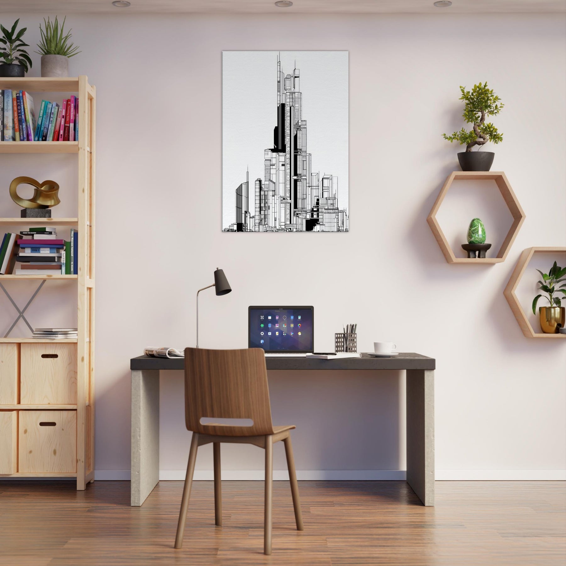 Rendered in precise line art, this wall piece gives life to a city that breathes in order and possibility. Futuristic Skyscrapers rise in stark black contours against generous white, their angles catching light and shadow like a quiet chorus. The composition exudes calm, contemporary energy perfect for a living room or home office where clarity of form sharpens focus and imagination. Hung alone or in a series, it invites slow, thoughtful reflection amid daily motion.