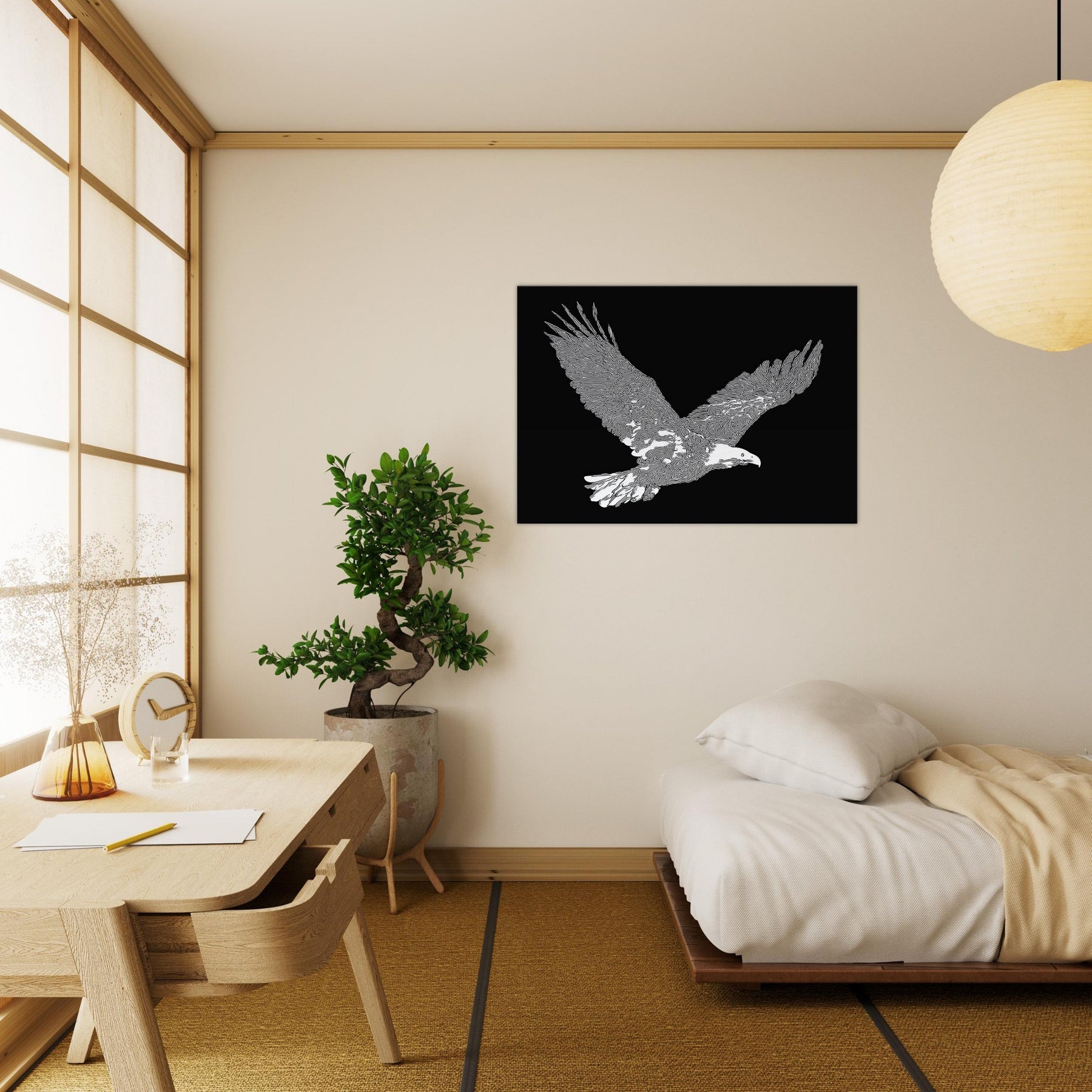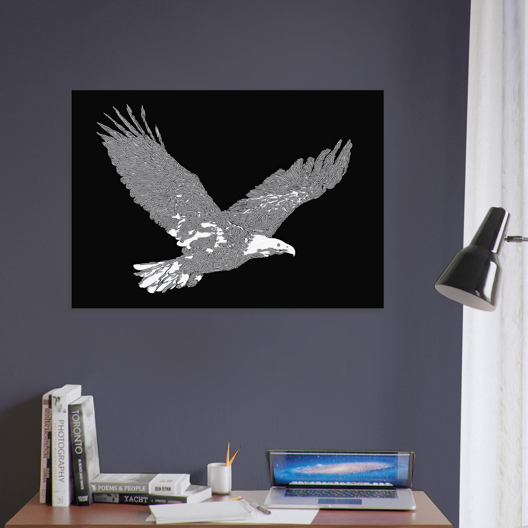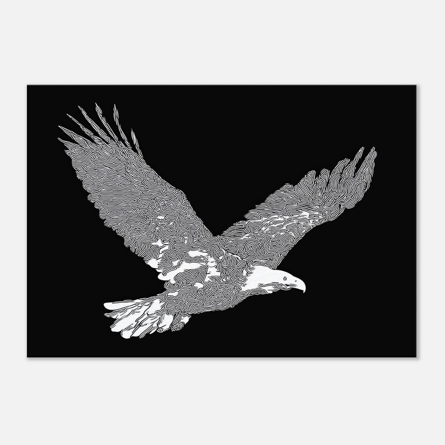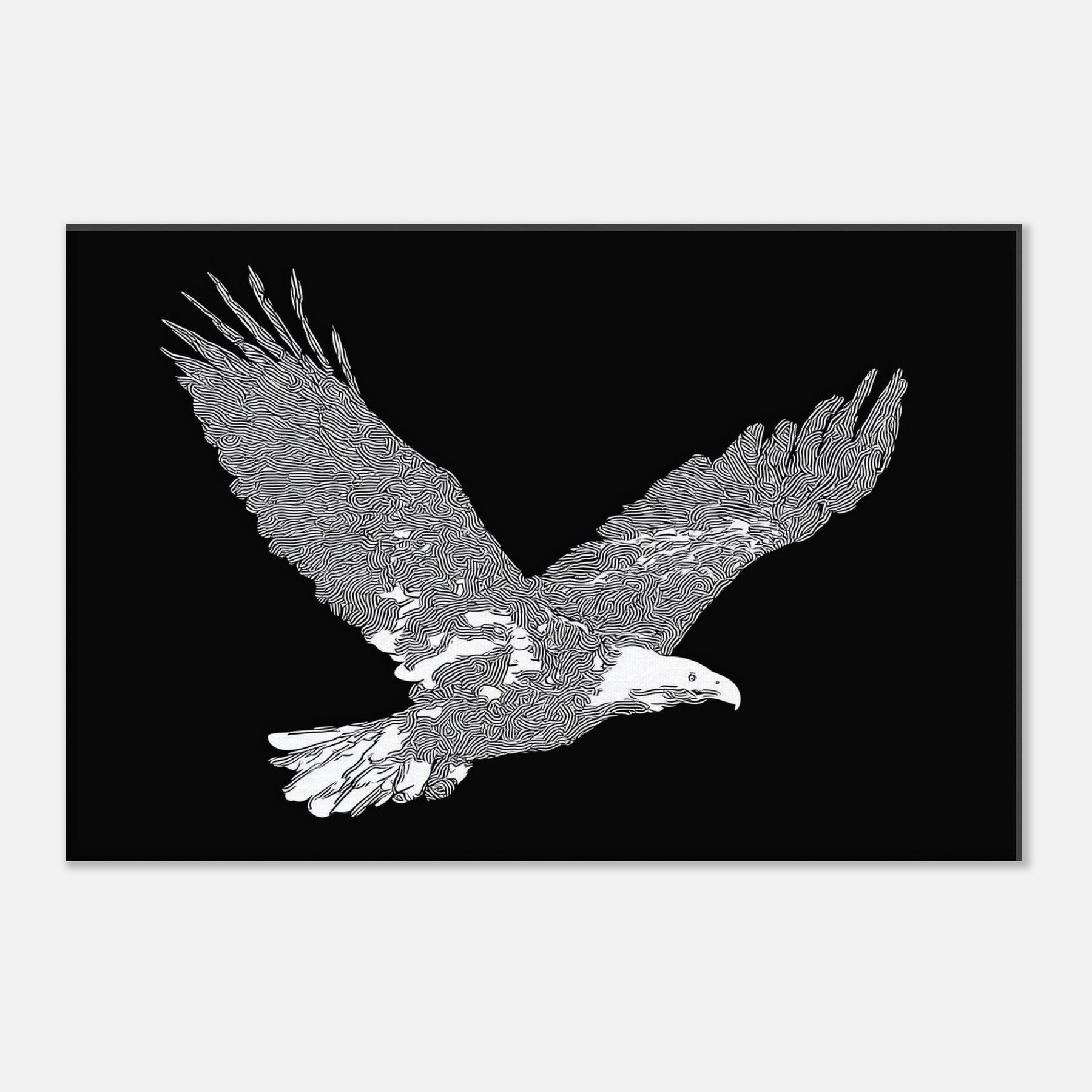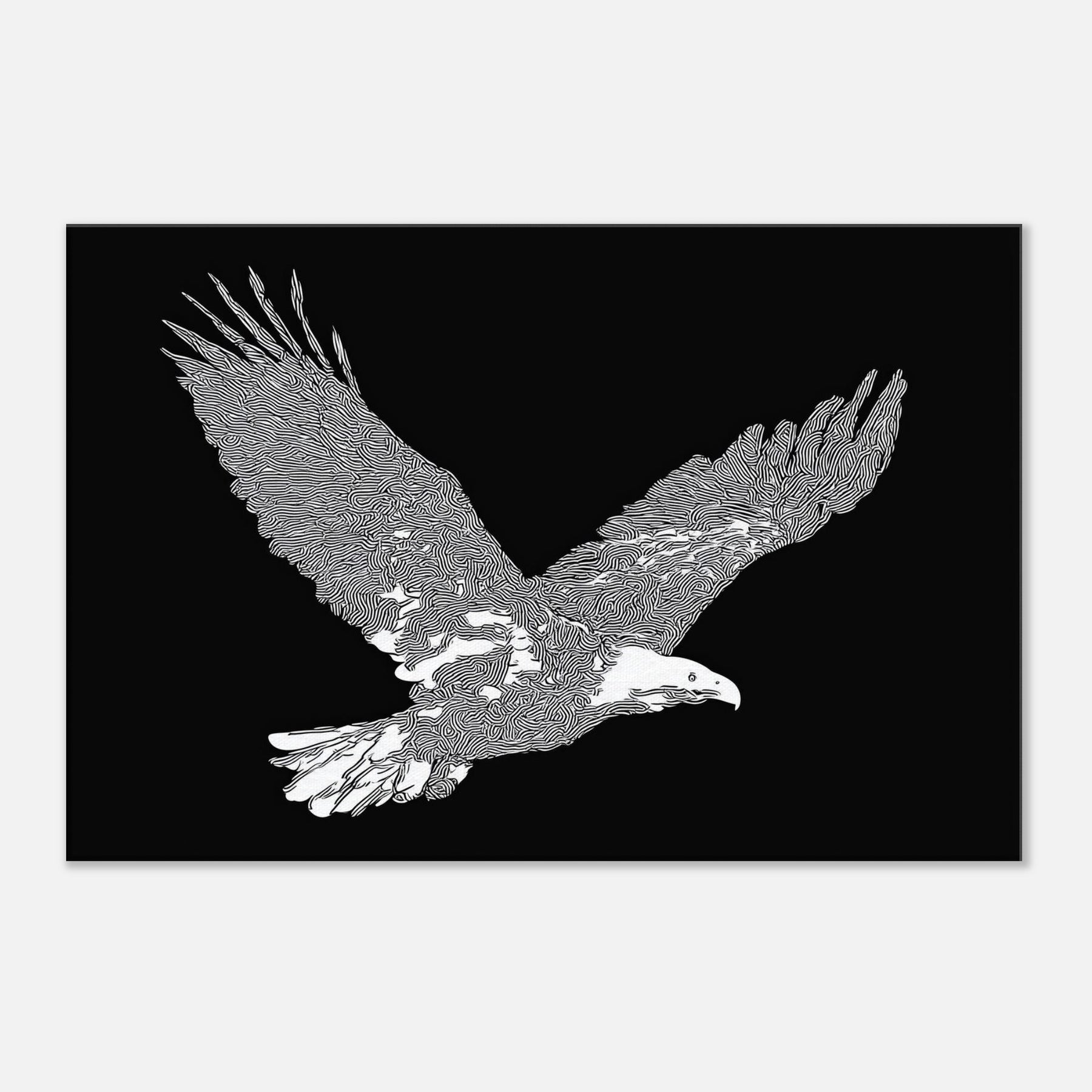 This piece captures the majesty of the eagle in flight, rendered in crisp white linework against a velvet black field. The restrained, flowing contours evoke wind and focus, inviting quiet contemplation. As the eye travels along the wingtips, a sense of motion unfolds perfect for a living room or study where calm becomes an invitation to pause. The eagle's silhouette brings nature indoors with elegance and restraint, turning everyday walls into a scene of poised energy and refined, cinematic atmosphere.