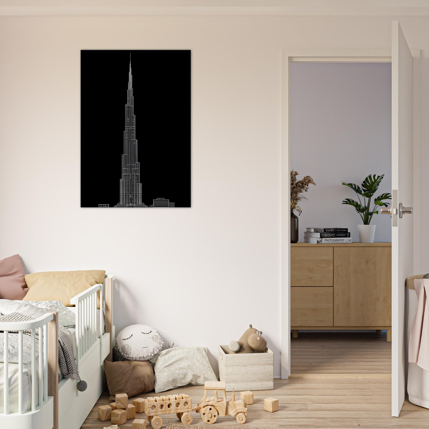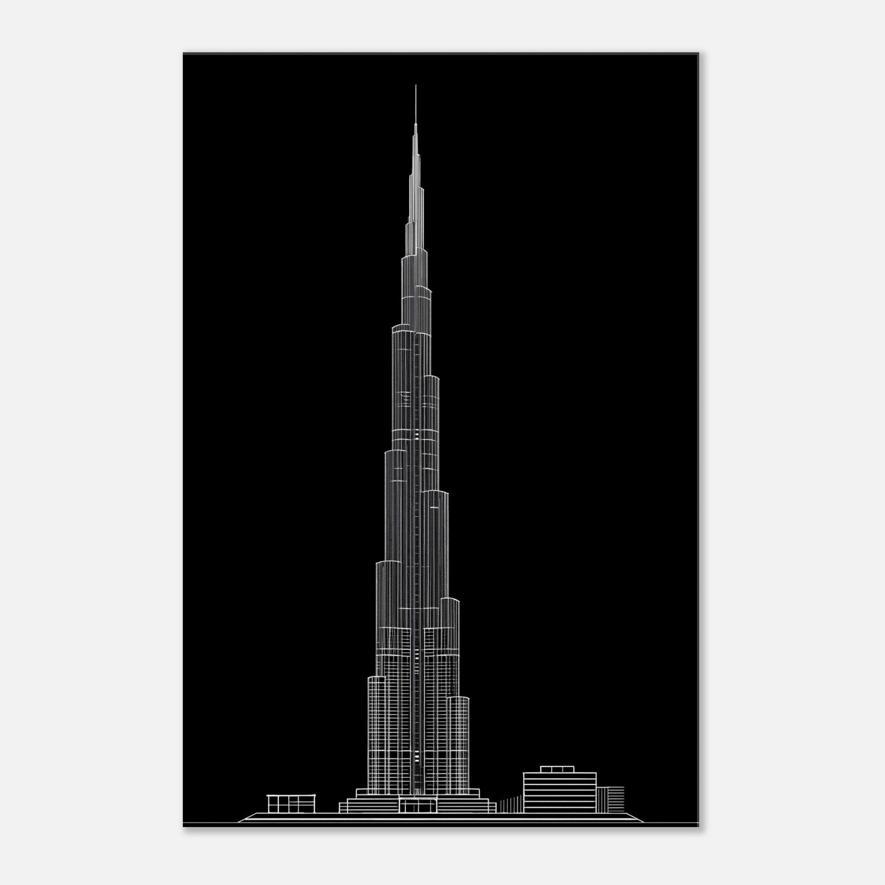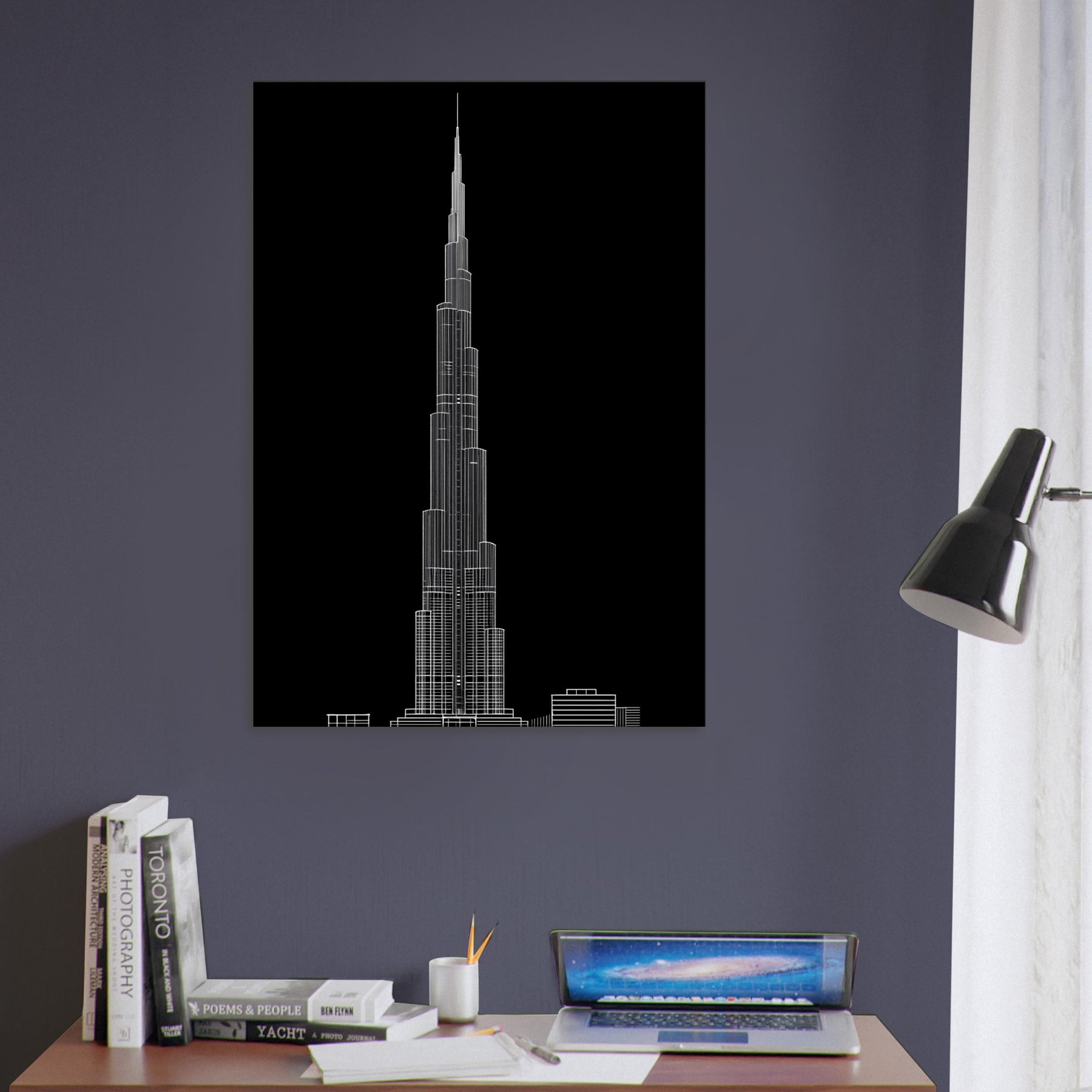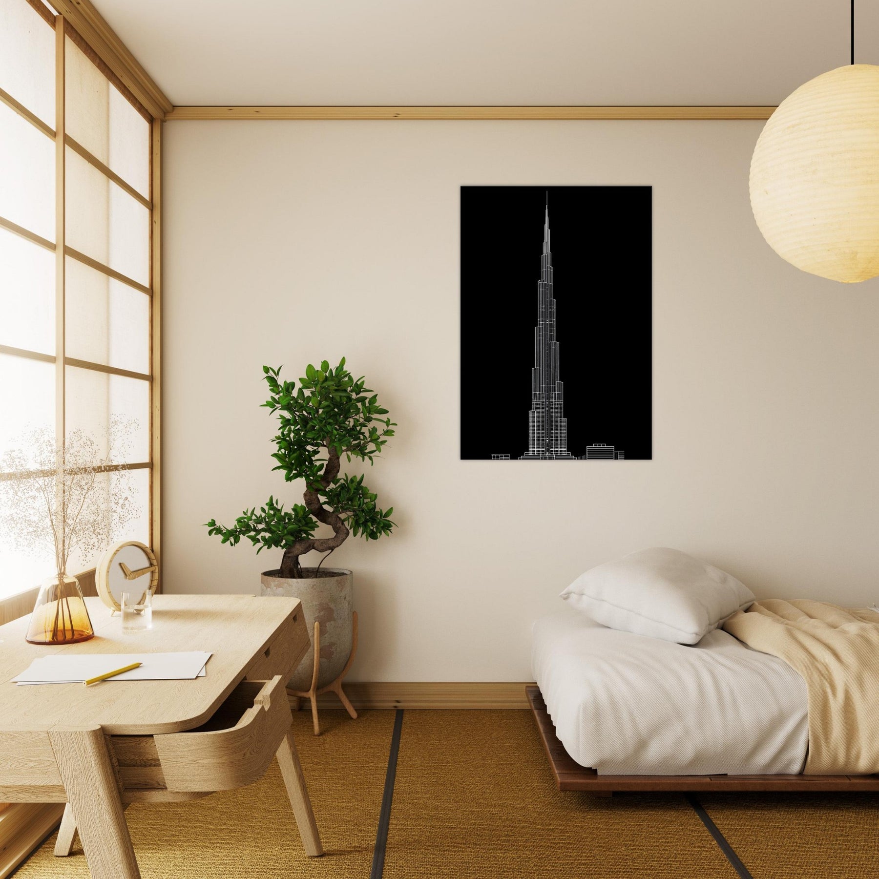 Burj Khalifa rises in quiet architectural poetry, rendered in crisp line work against a velvet black field. This line art print captures the building's ascent with clinical grace, inviting a calm glow into a living room or study. The slender silhouette becomes a meditative focal point a reminder of scale, ambition, and clarity while the stark contrast adds depth and mood. Hang it where natural light softens its edges and the room breathes with modern elegance, urban sophistication, and timeless silhouette.