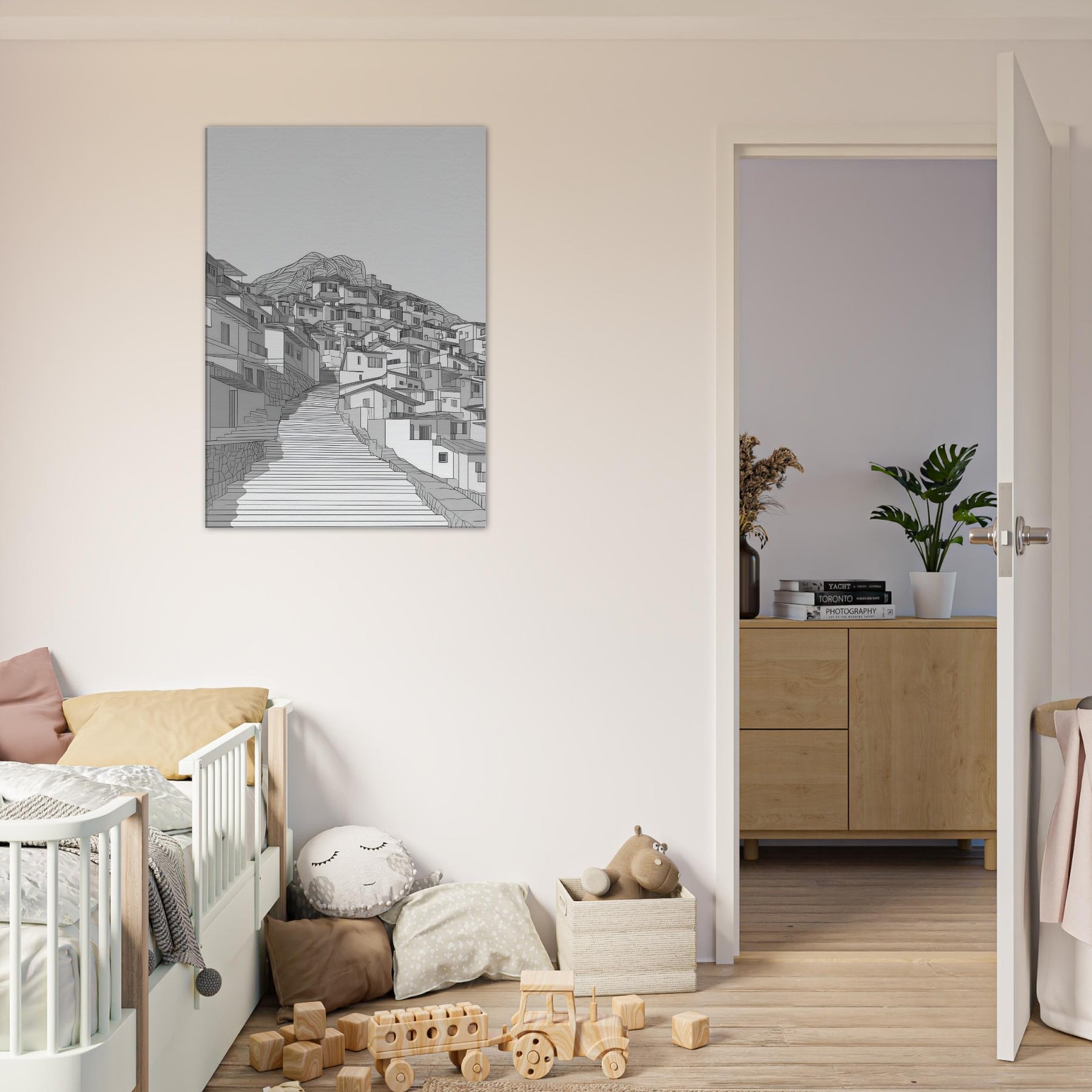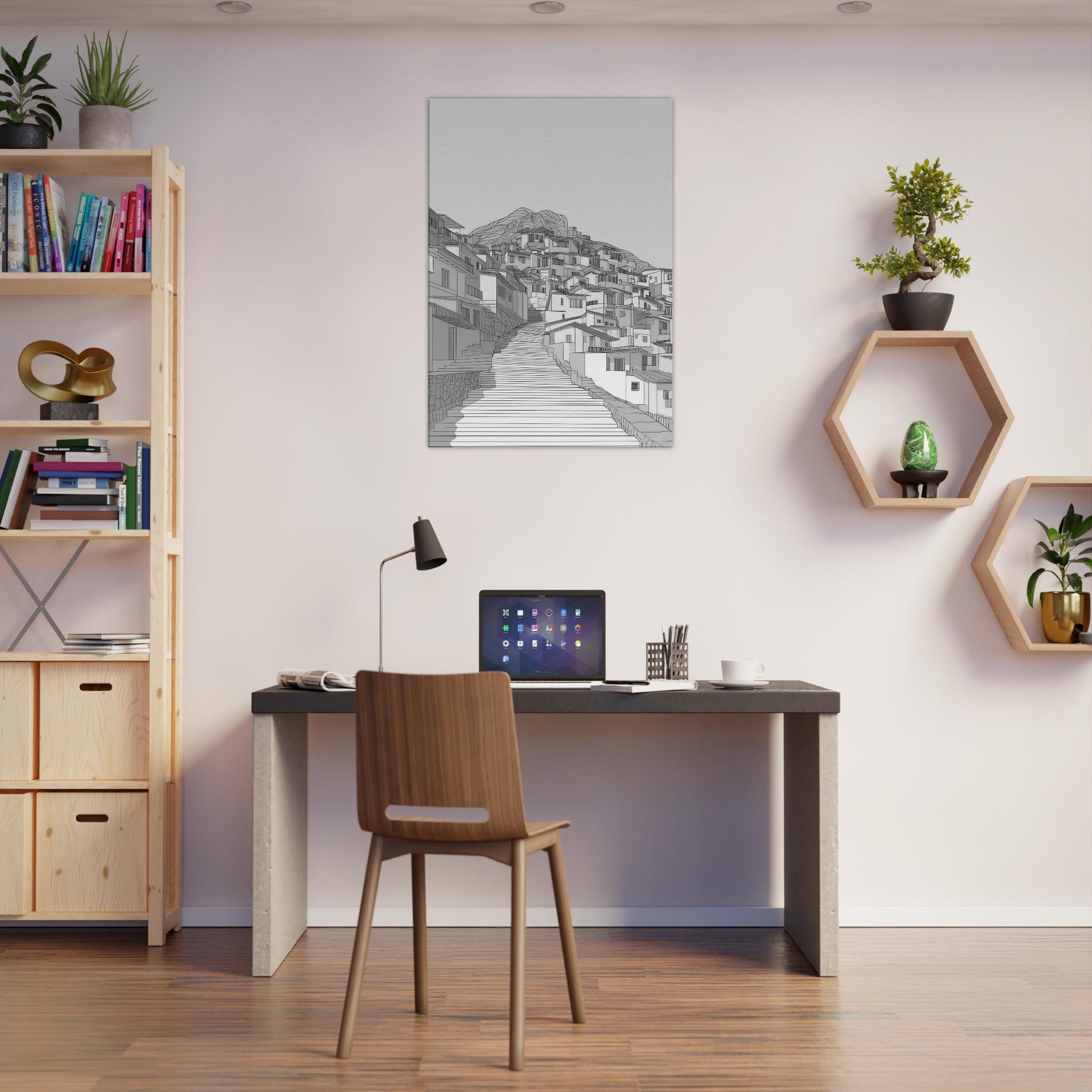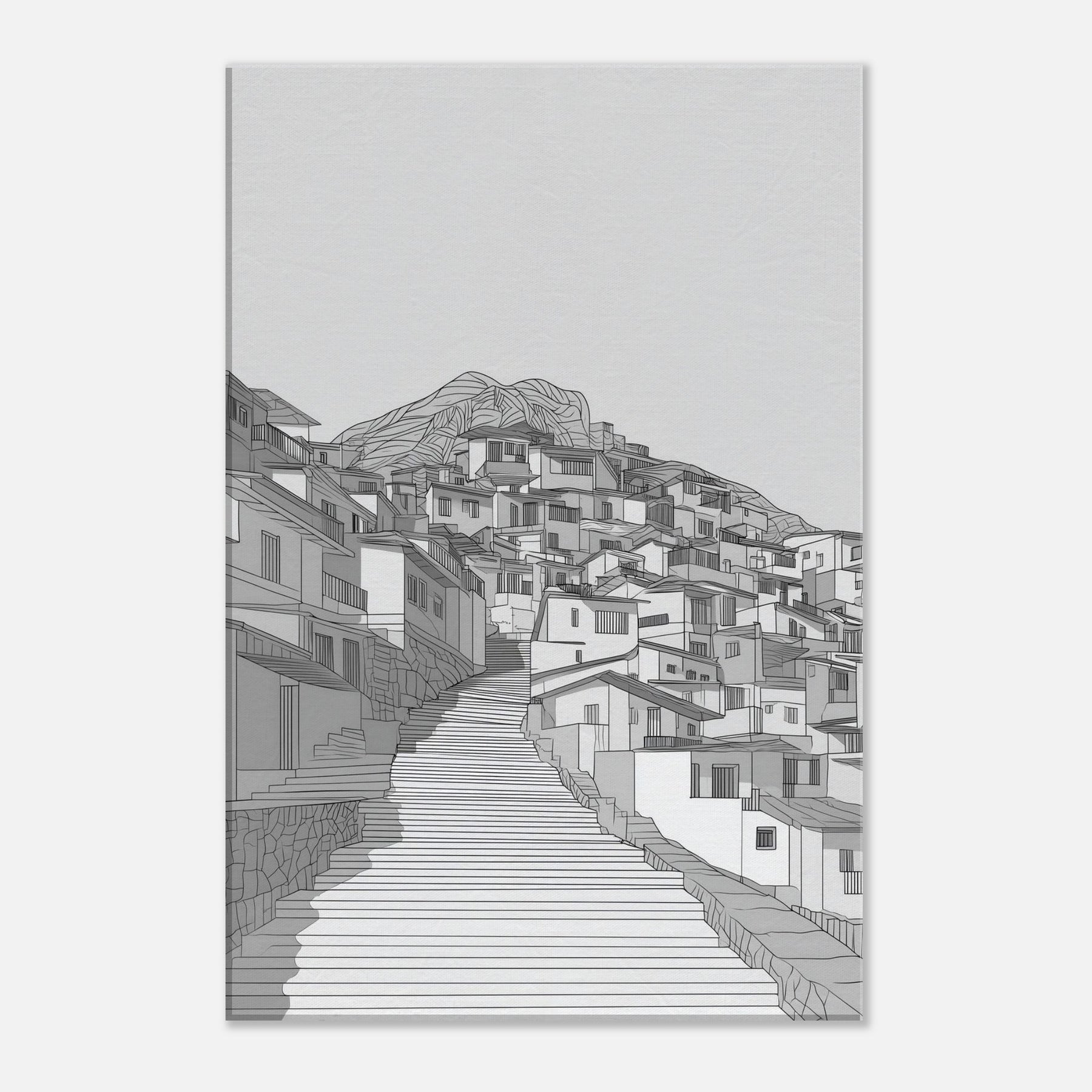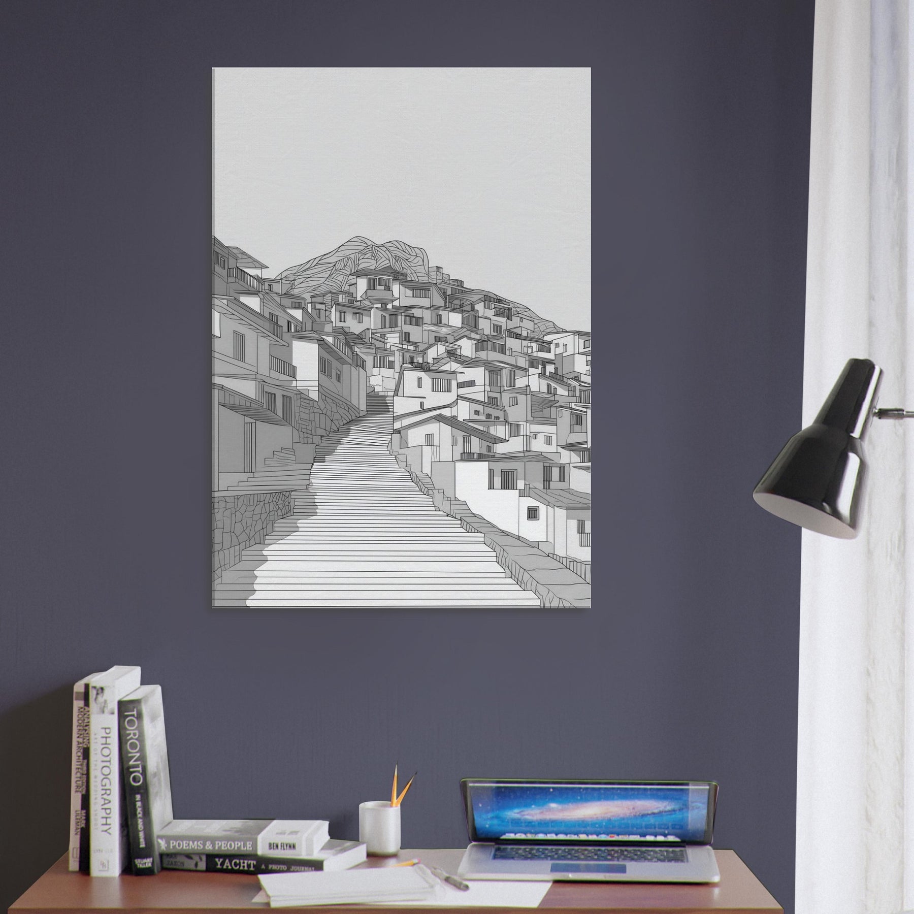 Let your space breathe with a delicate line drawing of a Mountain Village, where terraces stack upon each other in quiet, architectural rhythm. The monochrome contours evoke morning light slipping over stone and stair, inviting a moment of pause. This wall art adds a refined, contemplative atmosphere to any living space hallway, study, or lounge creating a focal point that feels both spacious and intimate. The clean lines carry a sense of ascent and memory, making the room seem taller and brighter as you linger with a coffee or a book.