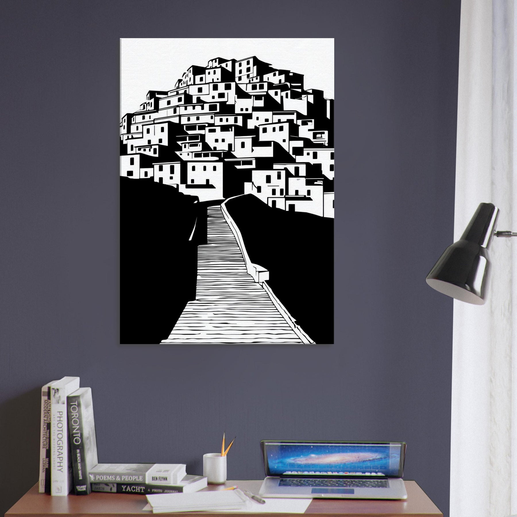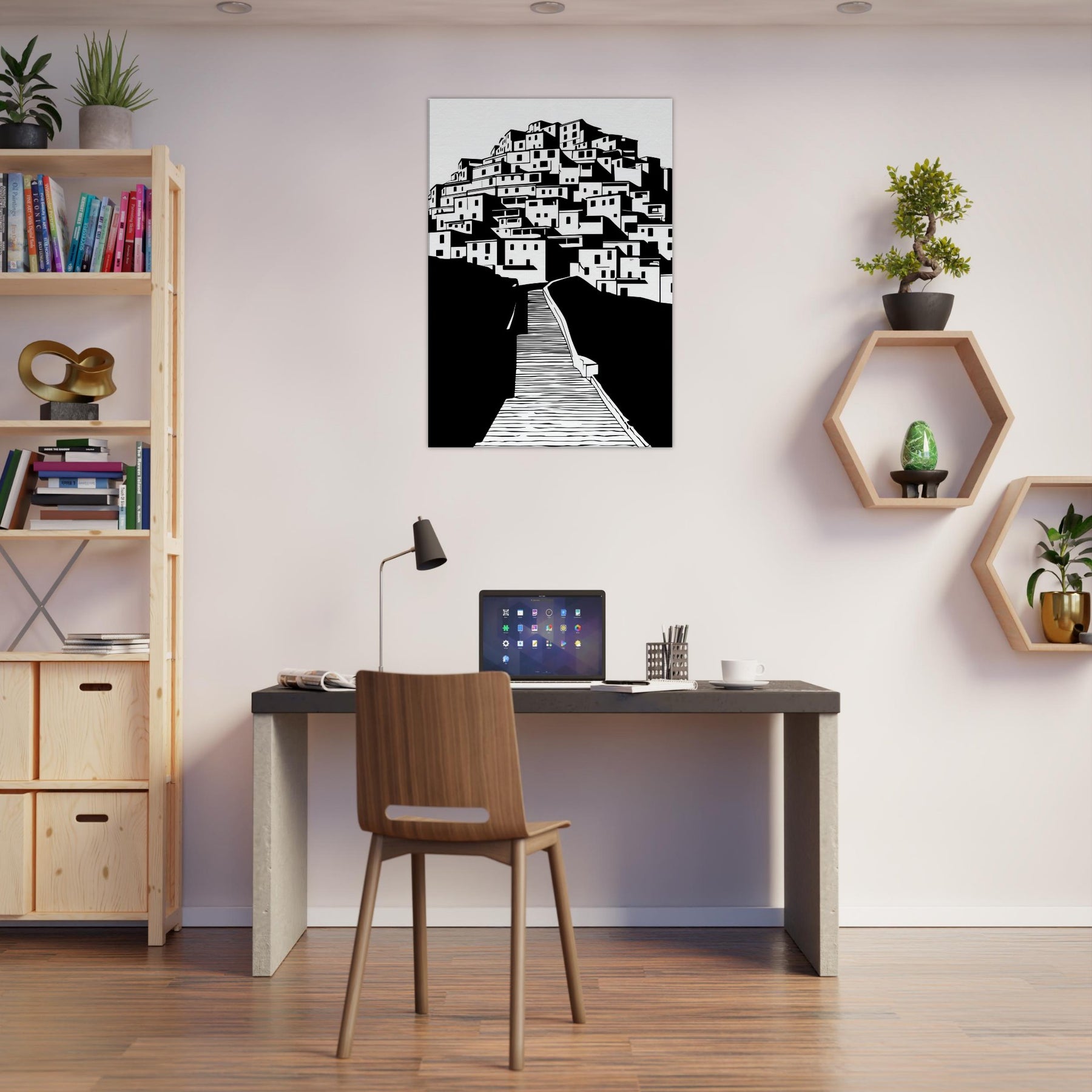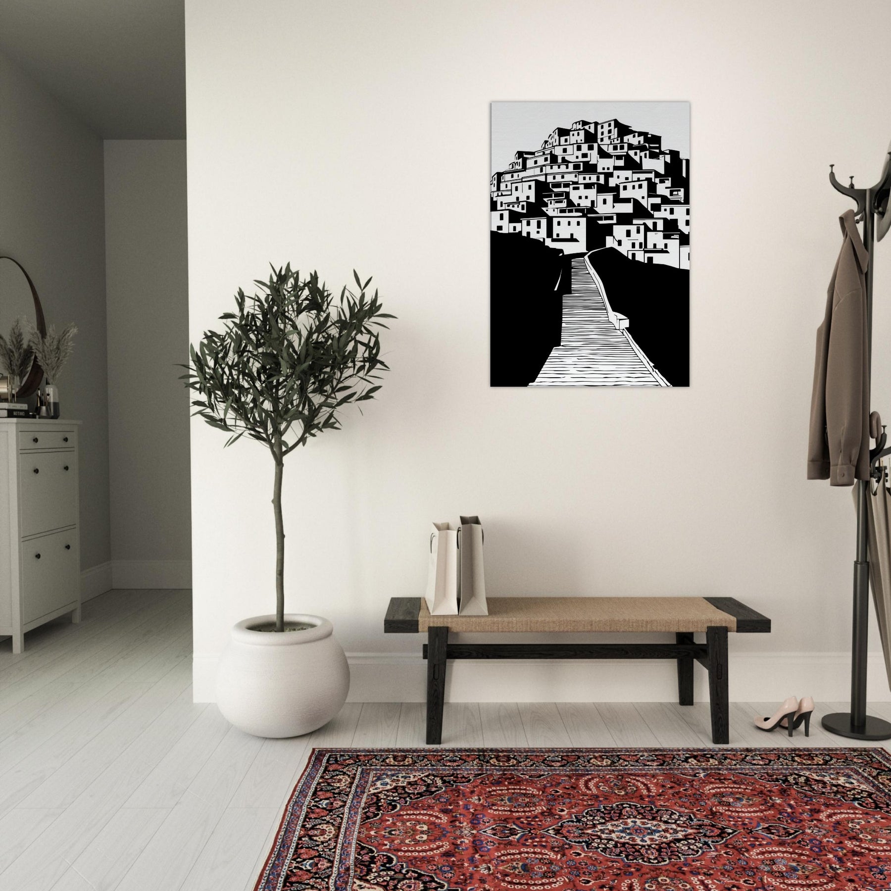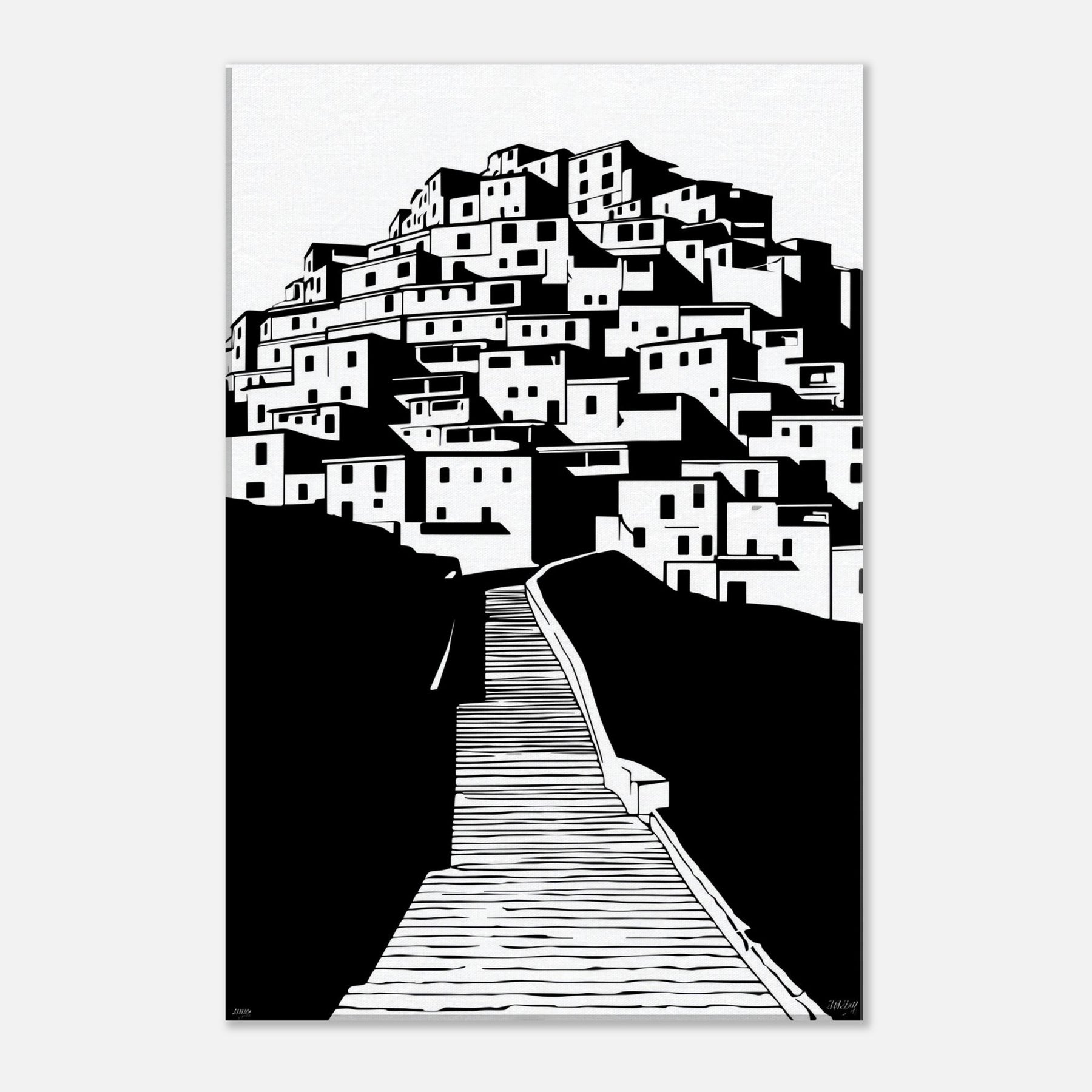 Let the clean lines of this Mountain Village drawing draw you into a quiet ascent of memory and light. The stark black and white geometry creates a soft, architectural hush that makes stairs and rooftops feel almost lyrical. Hang this piece to channel a calm, expansive mood in a living room or study, inviting gaze upward and a moment of stillness amid daily motion.