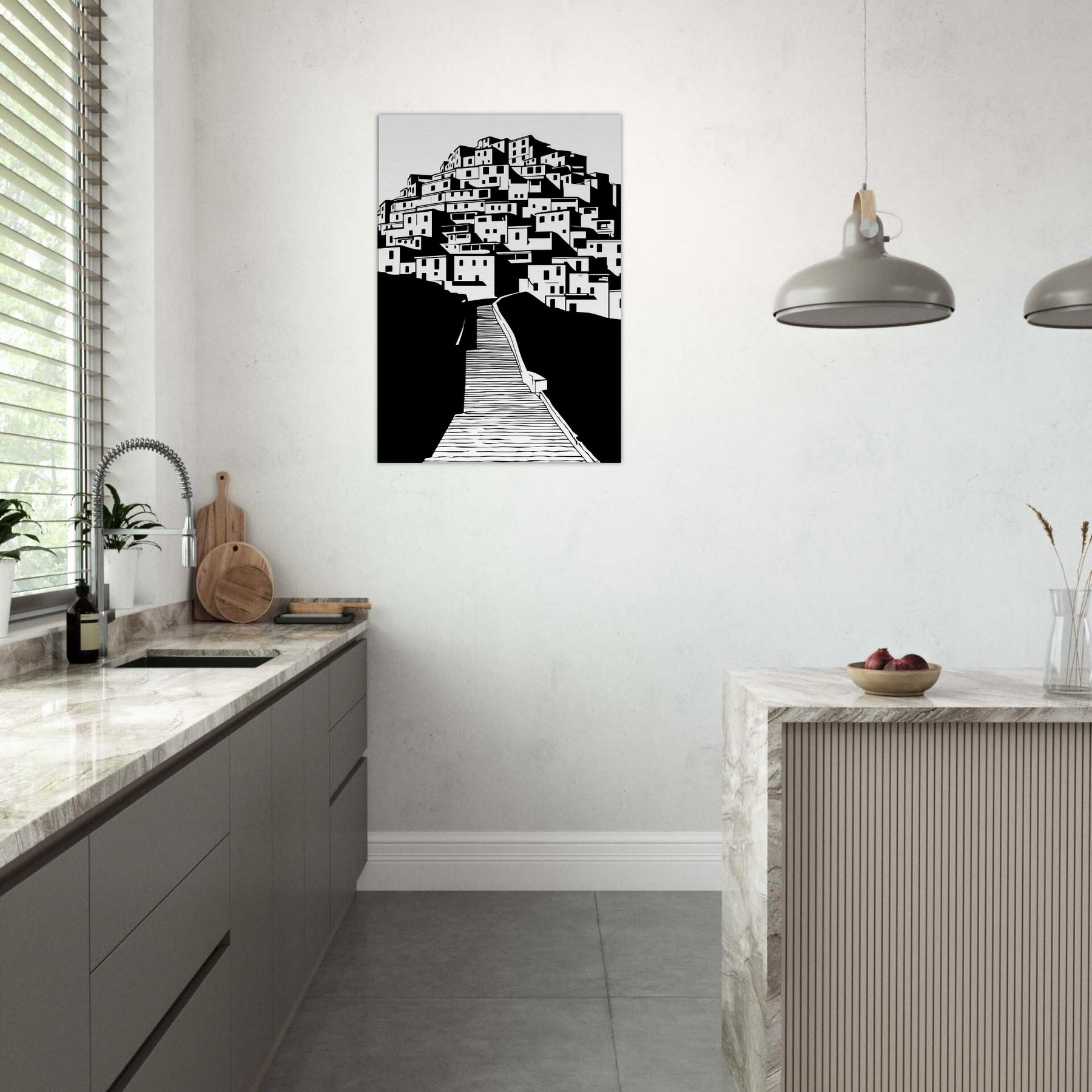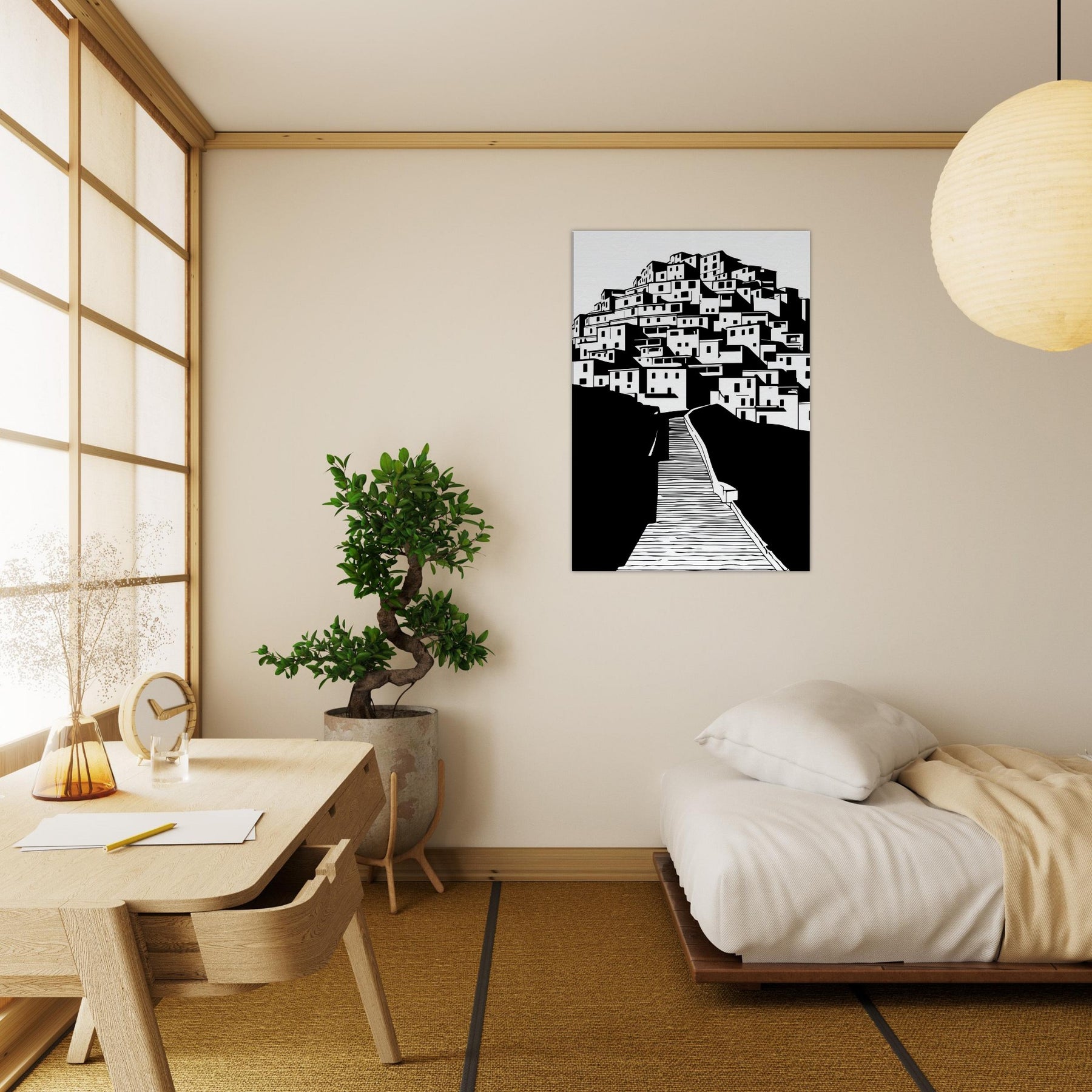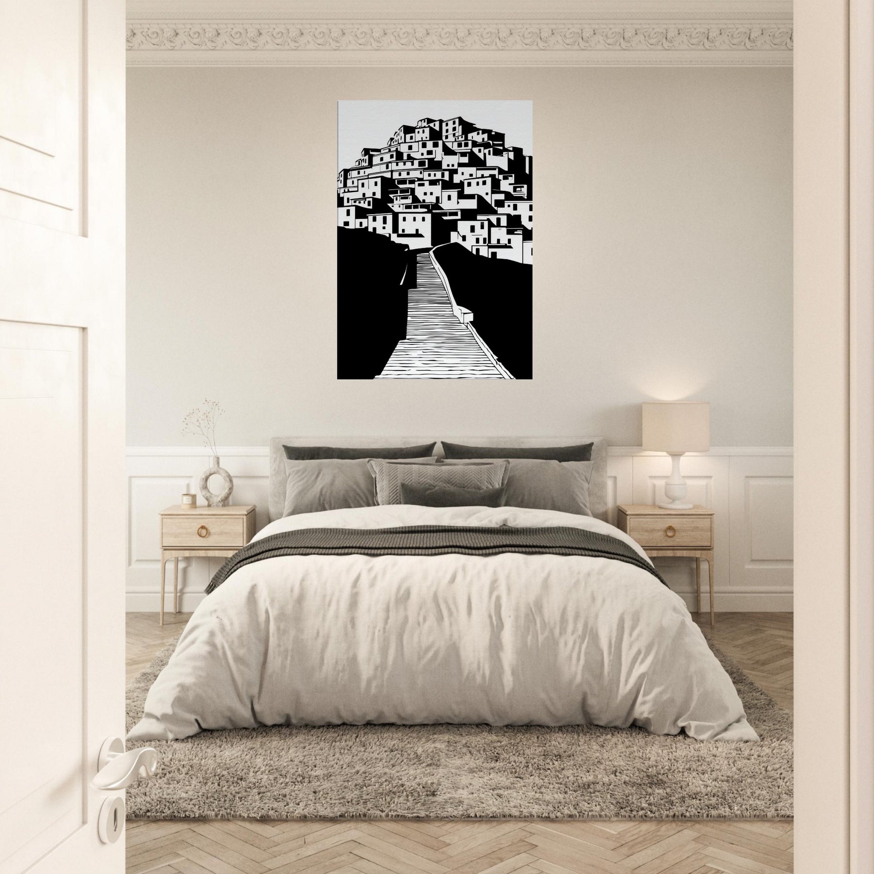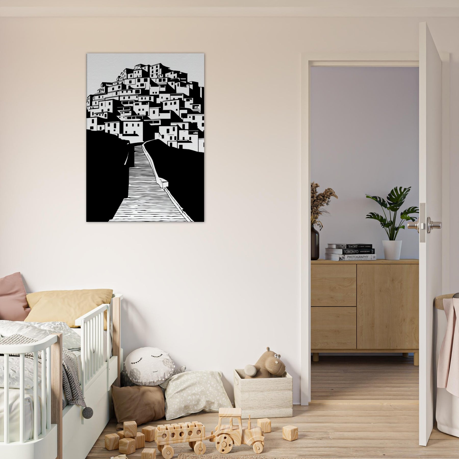 Let the clean lines of this Mountain Village drawing draw you into a quiet ascent of memory and light. The stark black and white geometry creates a soft, architectural hush that makes stairs and rooftops feel almost lyrical. Hang this piece to channel a calm, expansive mood in a living room or study, inviting gaze upward and a moment of stillness amid daily motion.