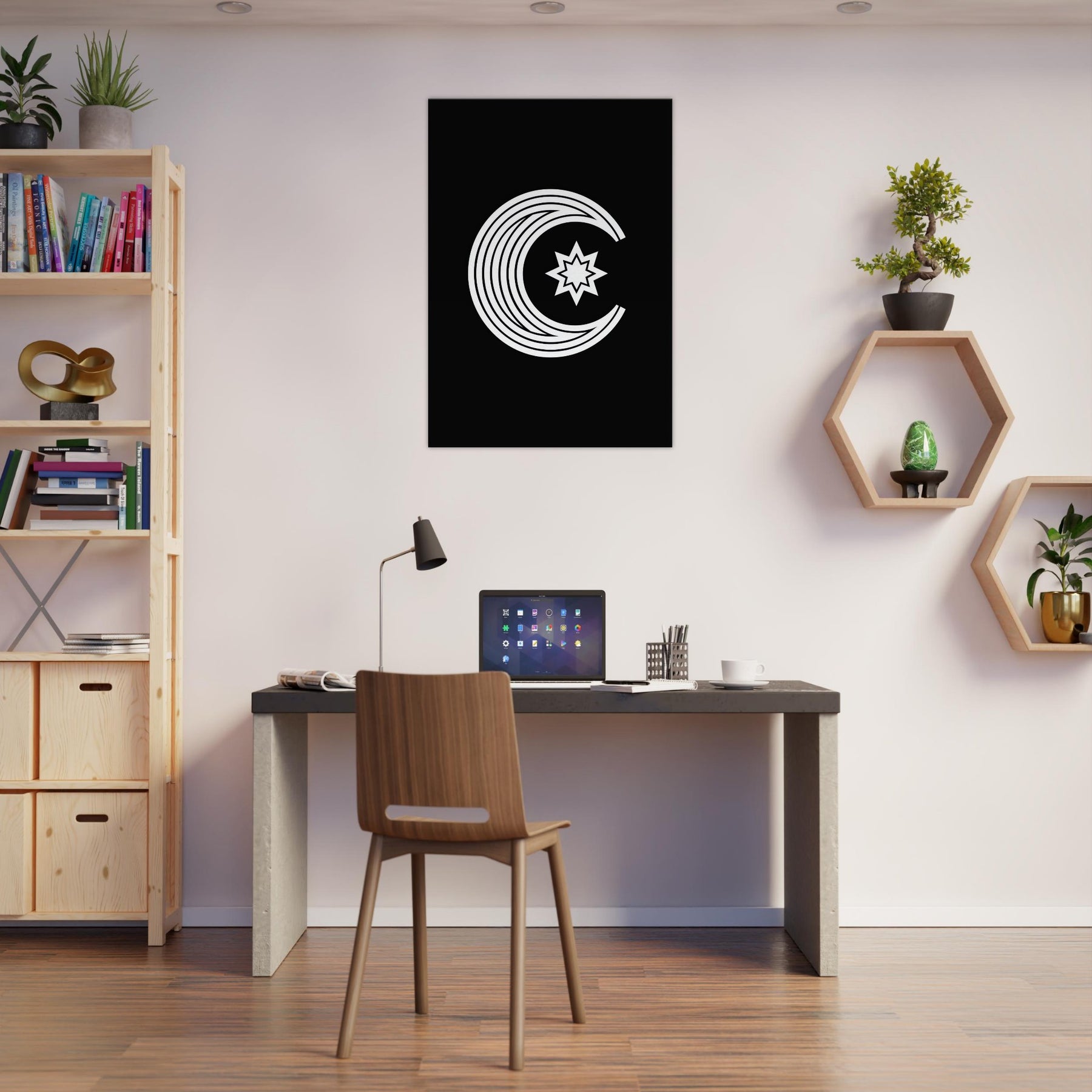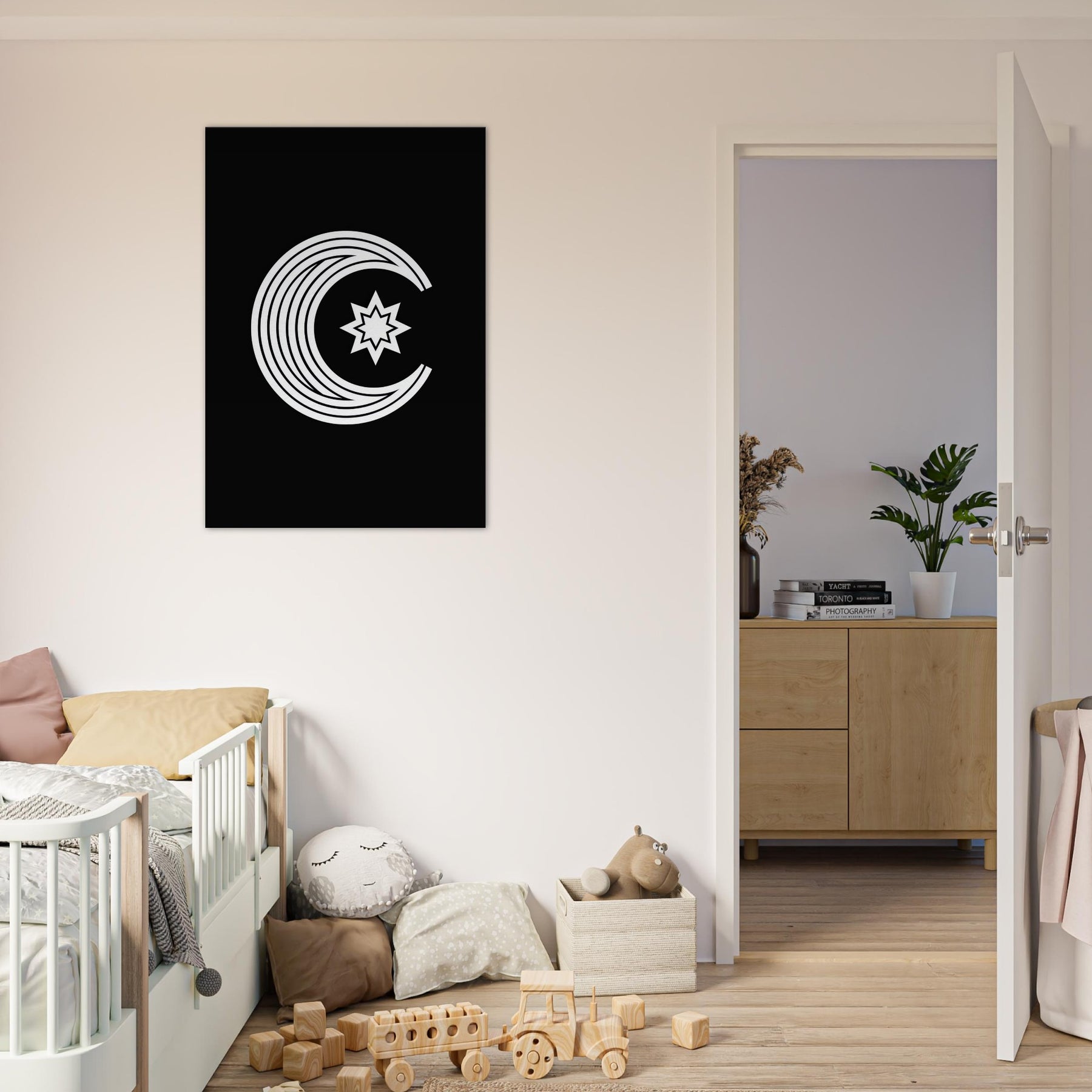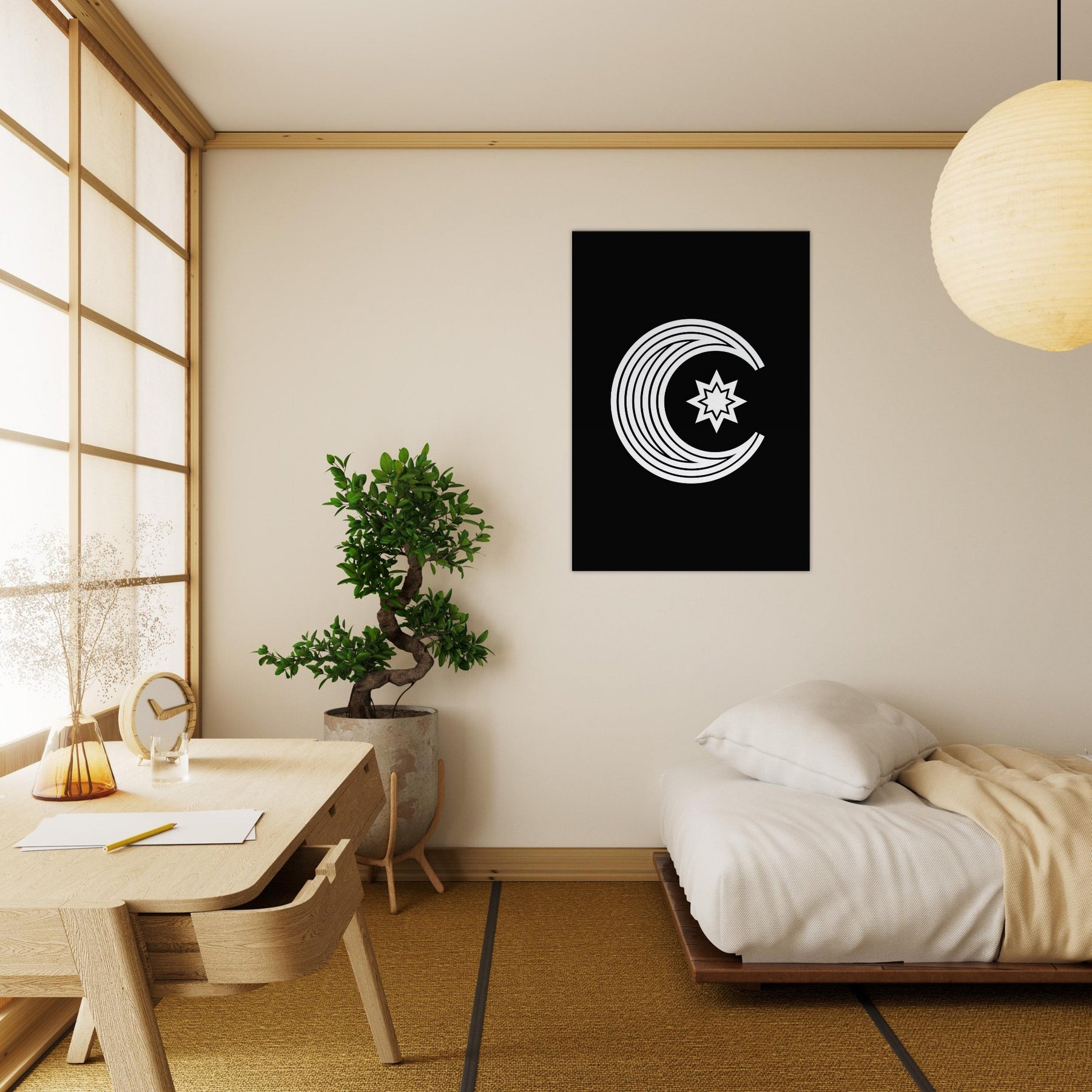 Crescent & Star radiate in a refined line study, a minimal emblem that feels timeless and serene. The clean white contour against midnight black conjures quiet nights, soft shadow, and a gentle pulse of wonder. Hang this piece to elevate a living room, bedroom, or study with a subtle, magnetic presence the kind that invites slow breaths and thoughtful pauses. Its mystical simplicity pairs beautifully with modern textures, creating a tranquil focus for conversation, contemplation, and everyday elegance. The central subject is Crescent & Star (Minimal).