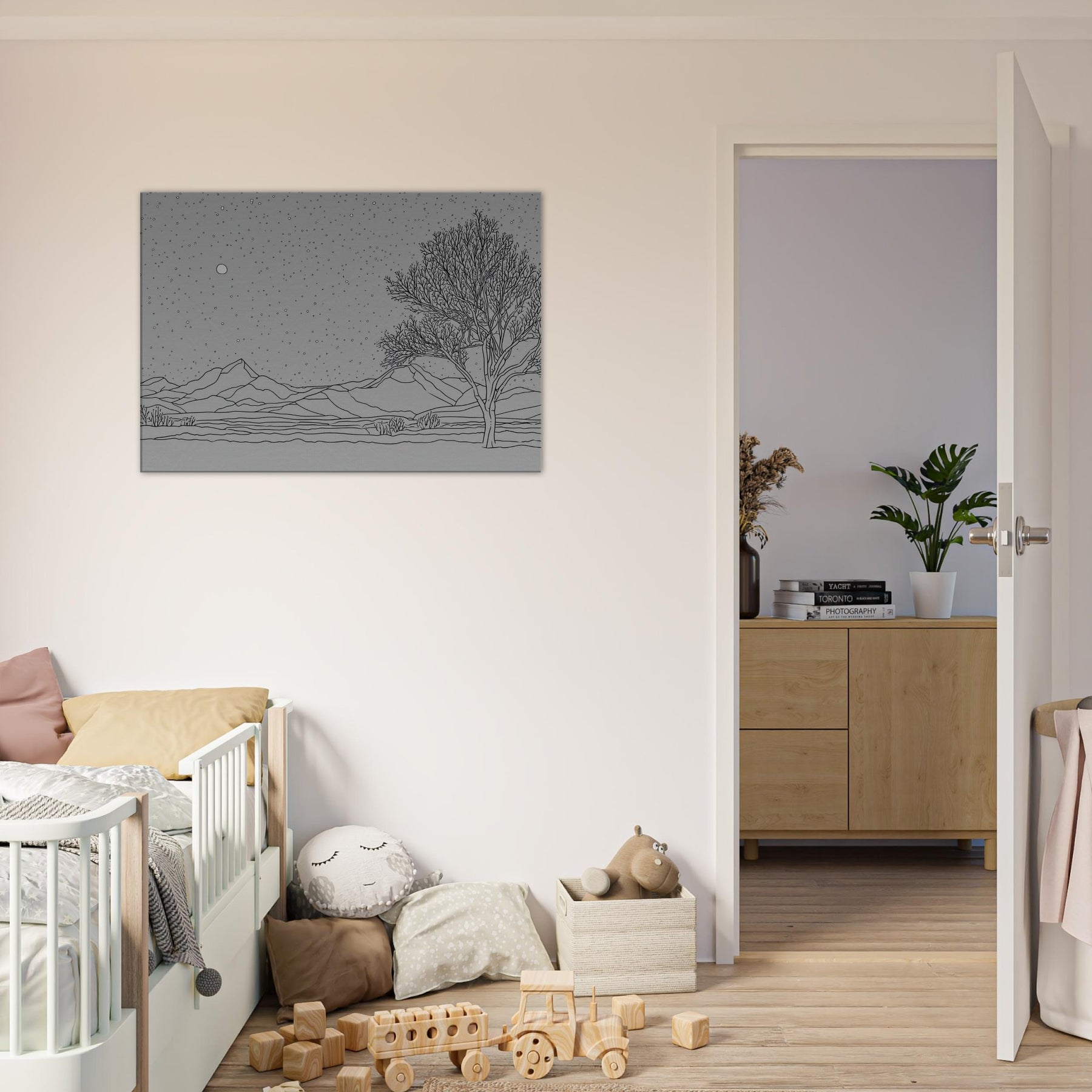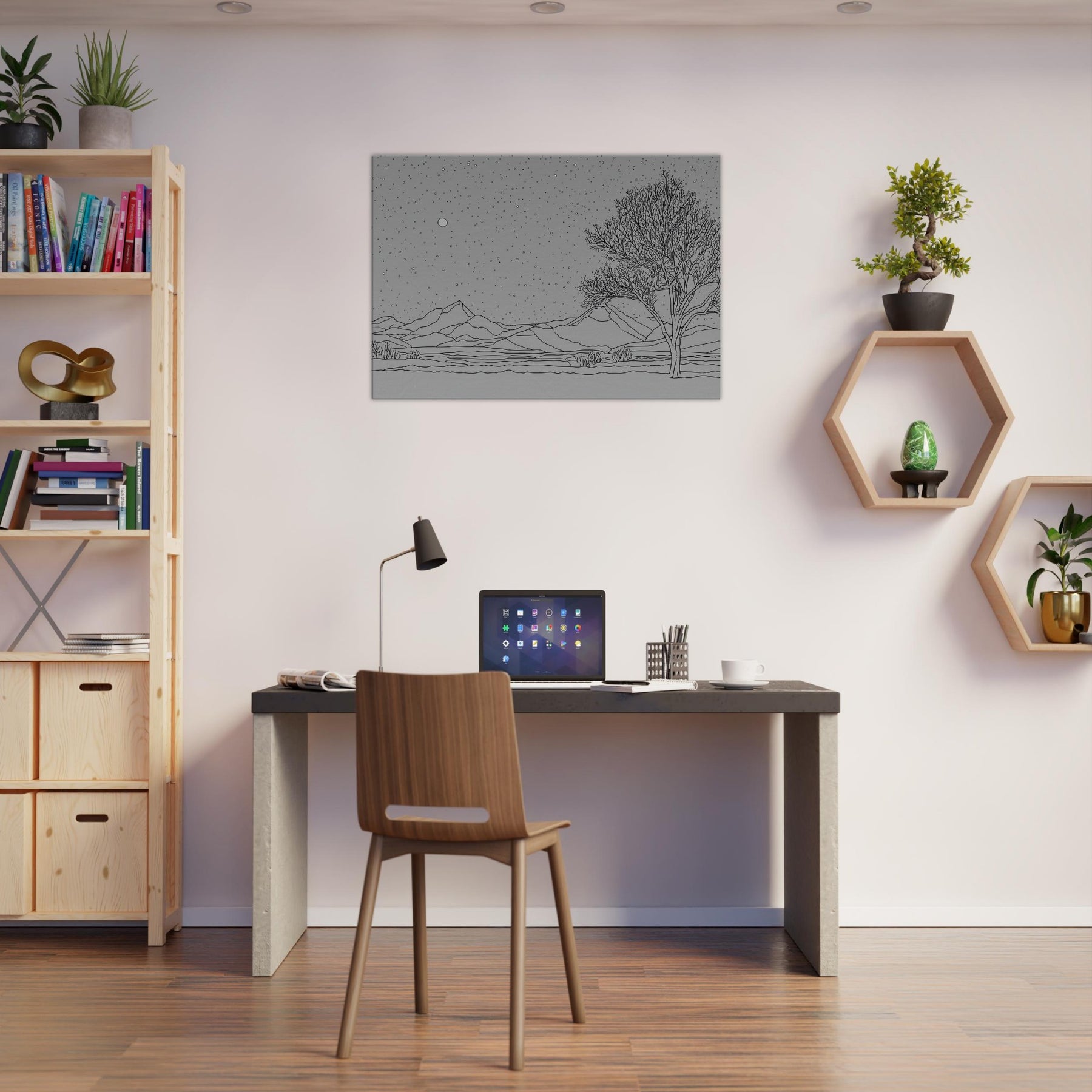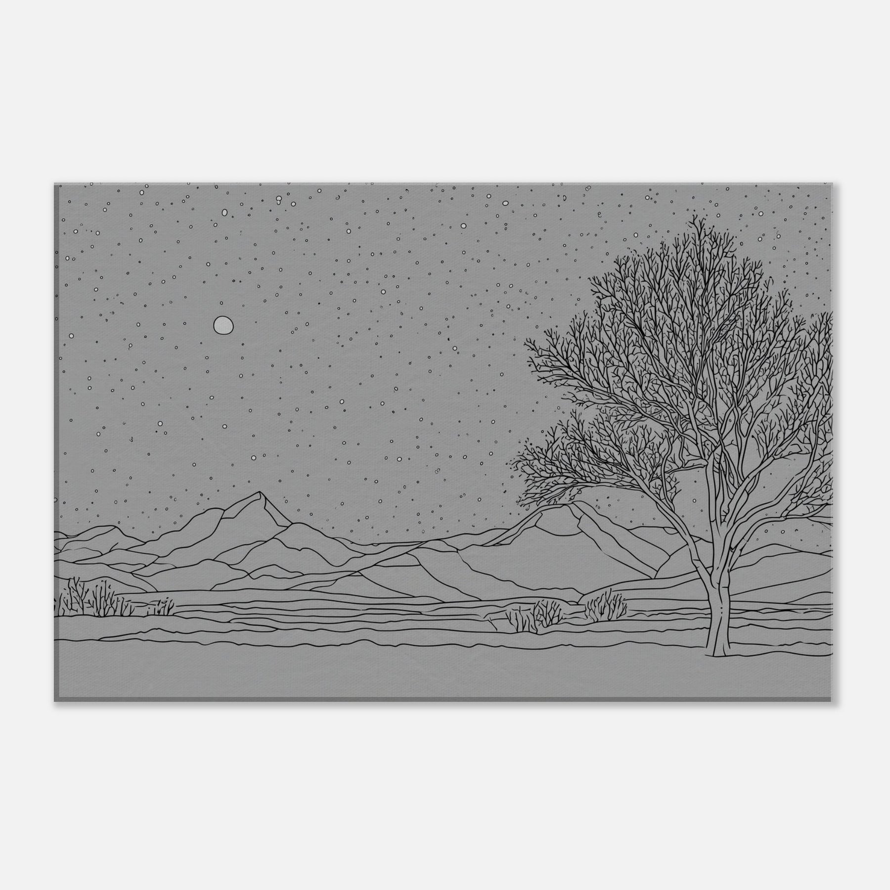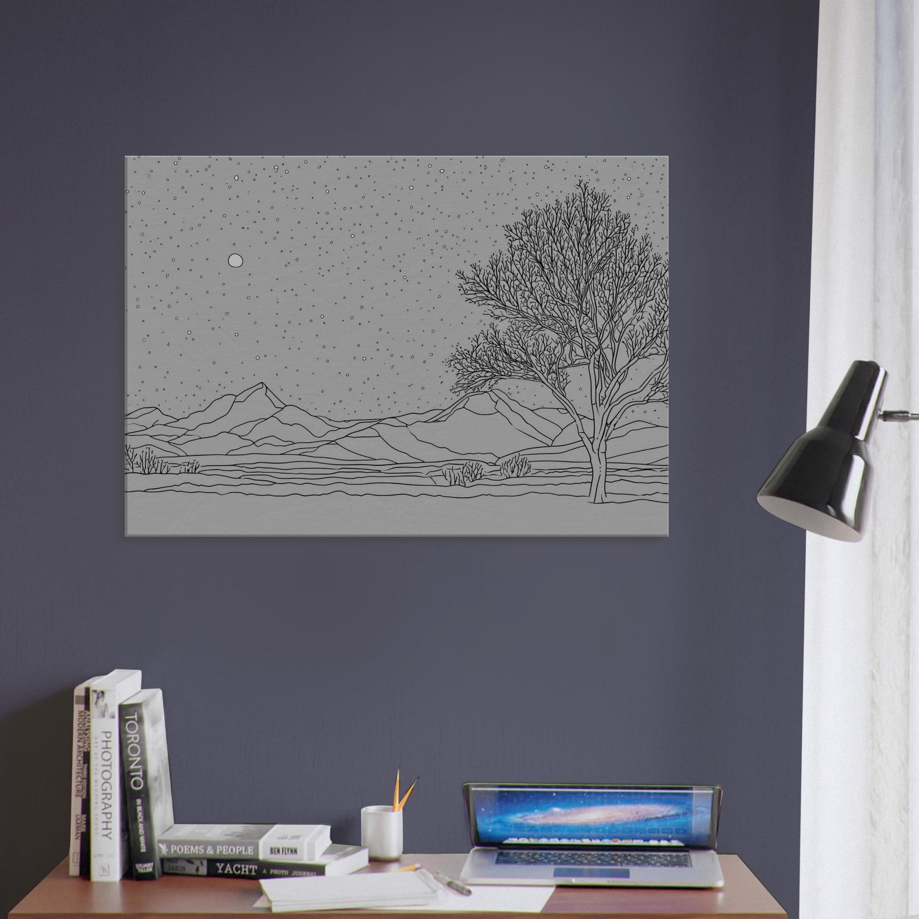 Starry Night in graceful line art unfurls over a quiet horizon. The delicate contours of mountains and a lone tree rise from a bed of stillness as a generous canopy of stars glitters above. This piece invites calm, night time reverie into any living space, turning ordinary walls into a tranquil that whispers of memory and wonder. Its monochrome simplicity pairs with modern furnishings, enriching a room with atmosphere, texture, and a subtle sense of expansive sky.