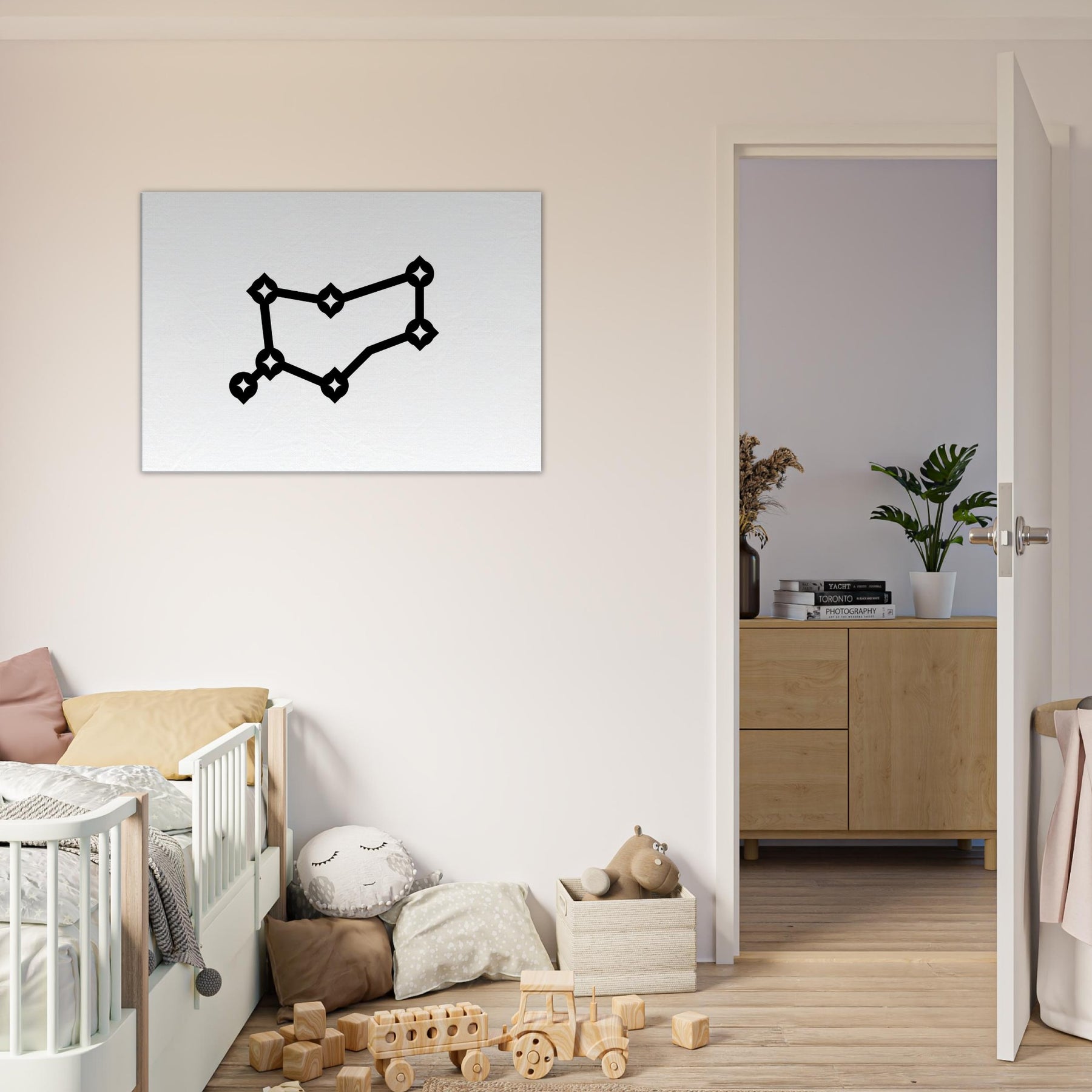 Zodiac Constellation (Minimal Line) unfurls across your wall with a quiet, magnetic rhythm. The clean, unbroken trace moves from star to star, as if you could follow a celestial map with your gaze. This minimalist line work invites meditation, transforming a blank panel into a celestial corridor of calm. In living rooms or bedrooms, the silhouette catches soft light, casting slender shadows that shift with the day. A refined, mystical accent that elevates modern spaces without overpowering them.
