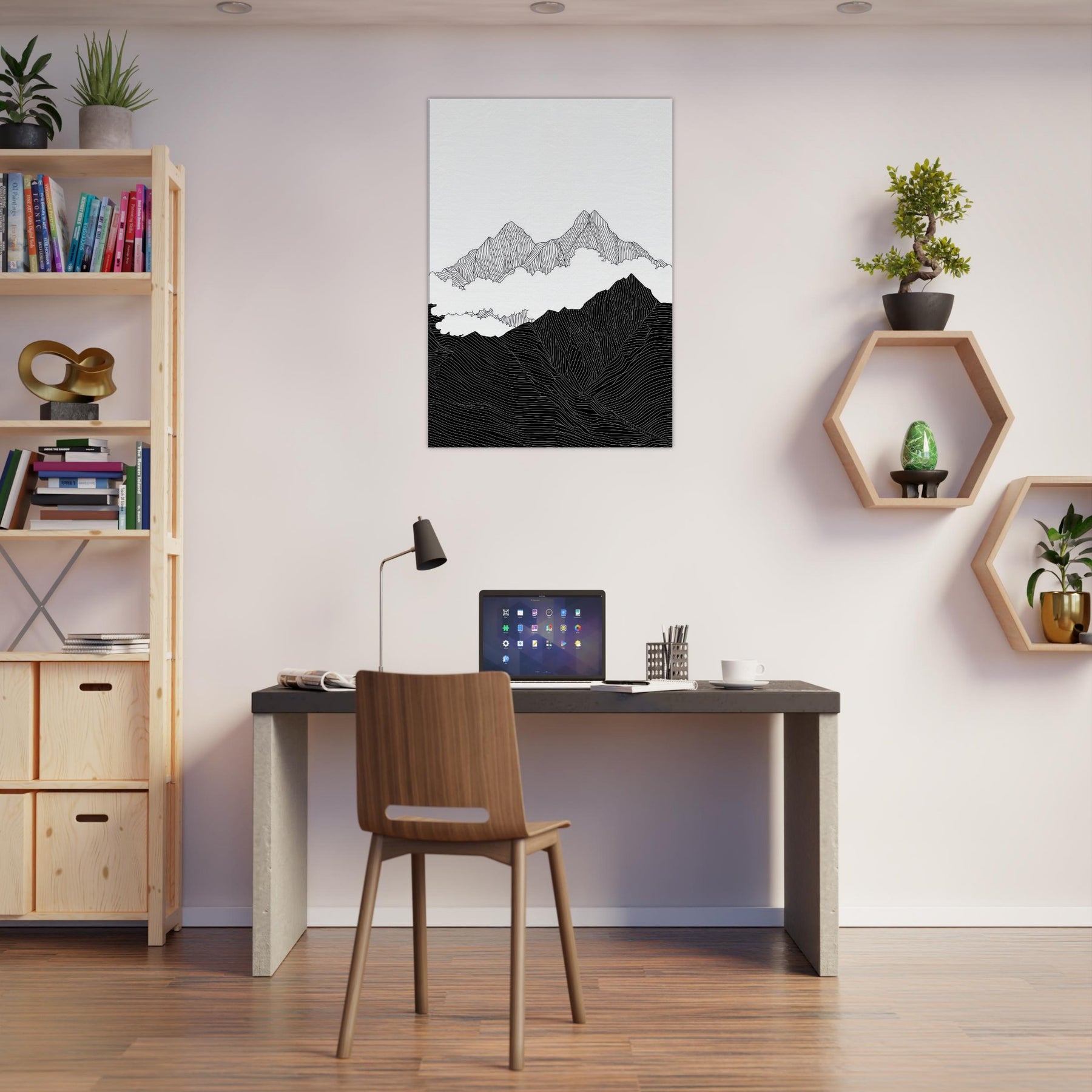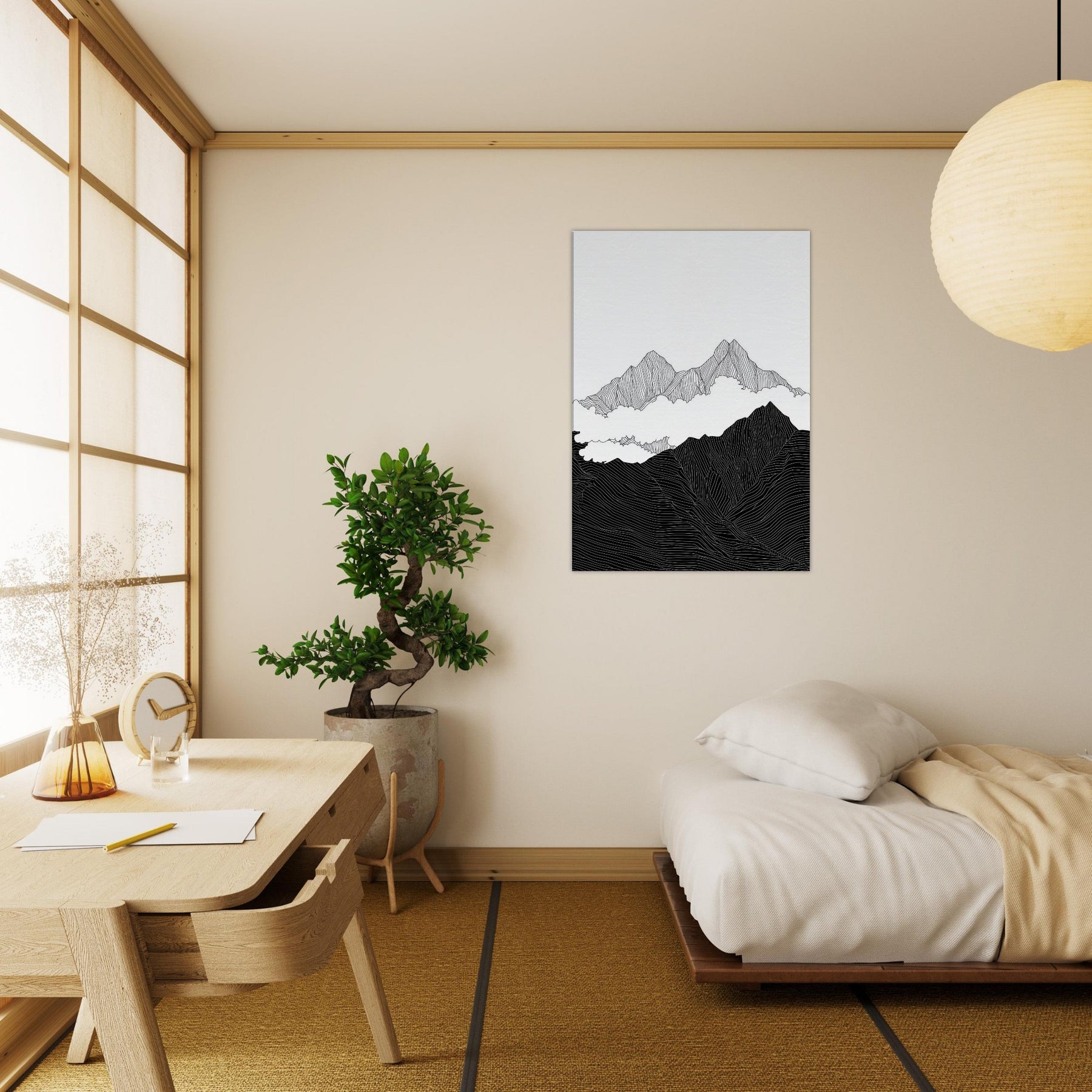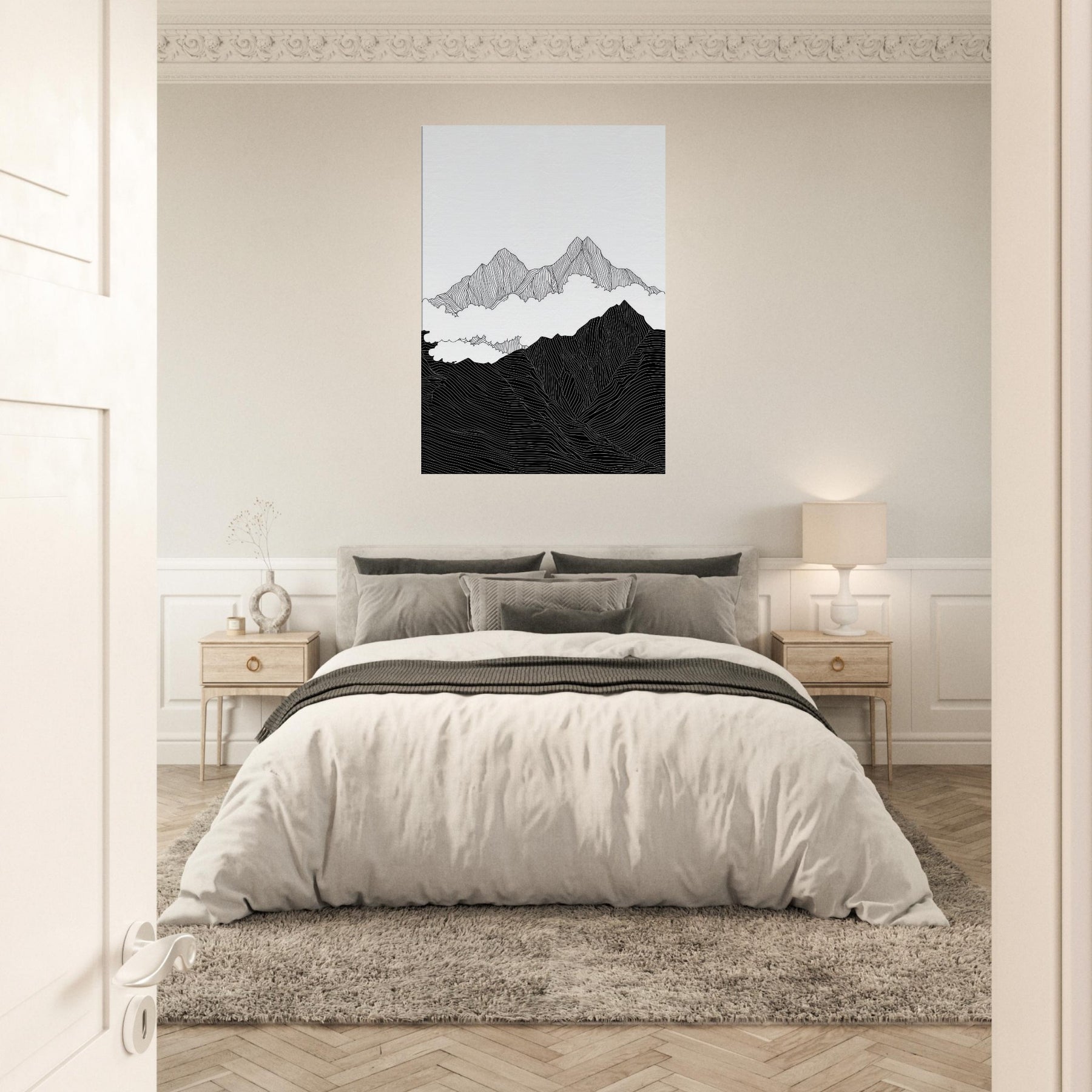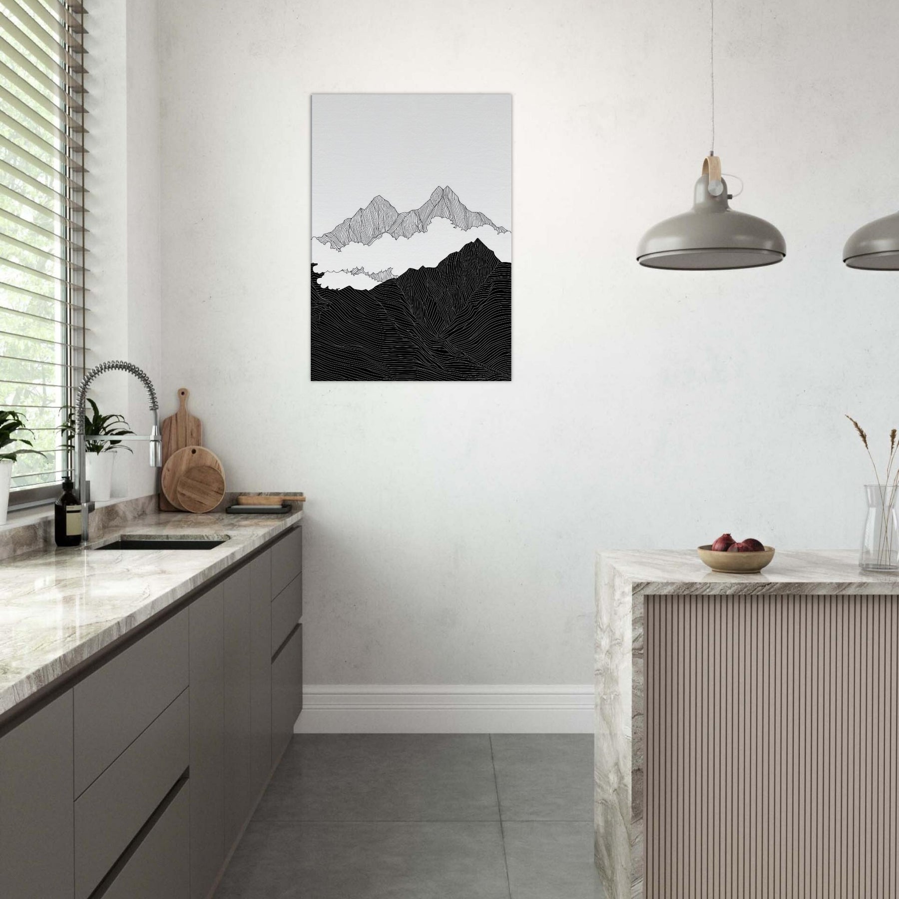 Mountains rise in elegant line work, a quiet ode to nature’s geometry. This minimalist study breathes a tranquil rhythm into any room, where each contour traces light and shadow with measured grace. The stark black lines against white space evoke fresh air, open skies, and the hush before dawn. Hang it over a sofa or beside a desk to invite focus, depth, and a sense of ascent. The mountains become a living backdrop, calming the mood while sharpening the eye and inspiring quiet, thoughtful moments.