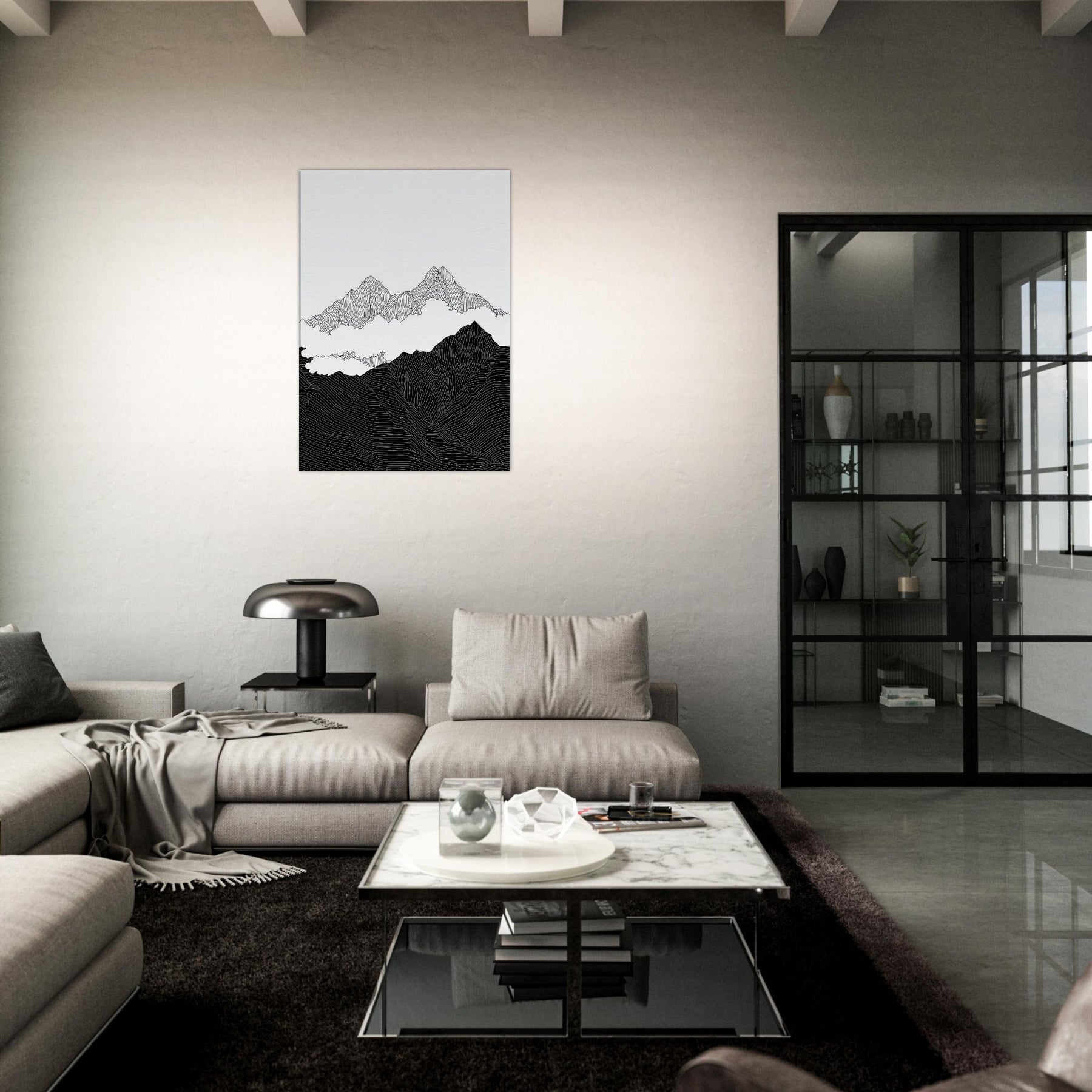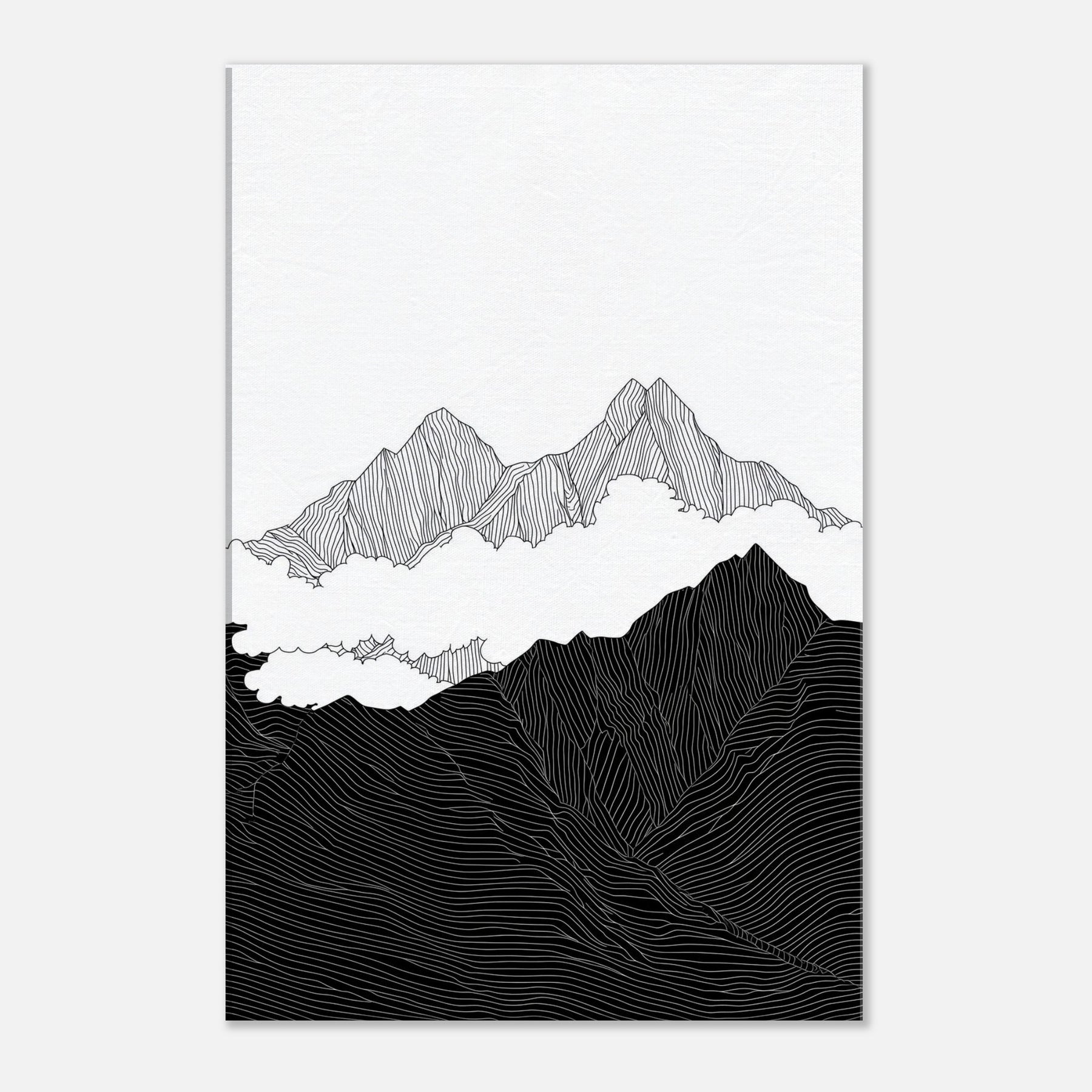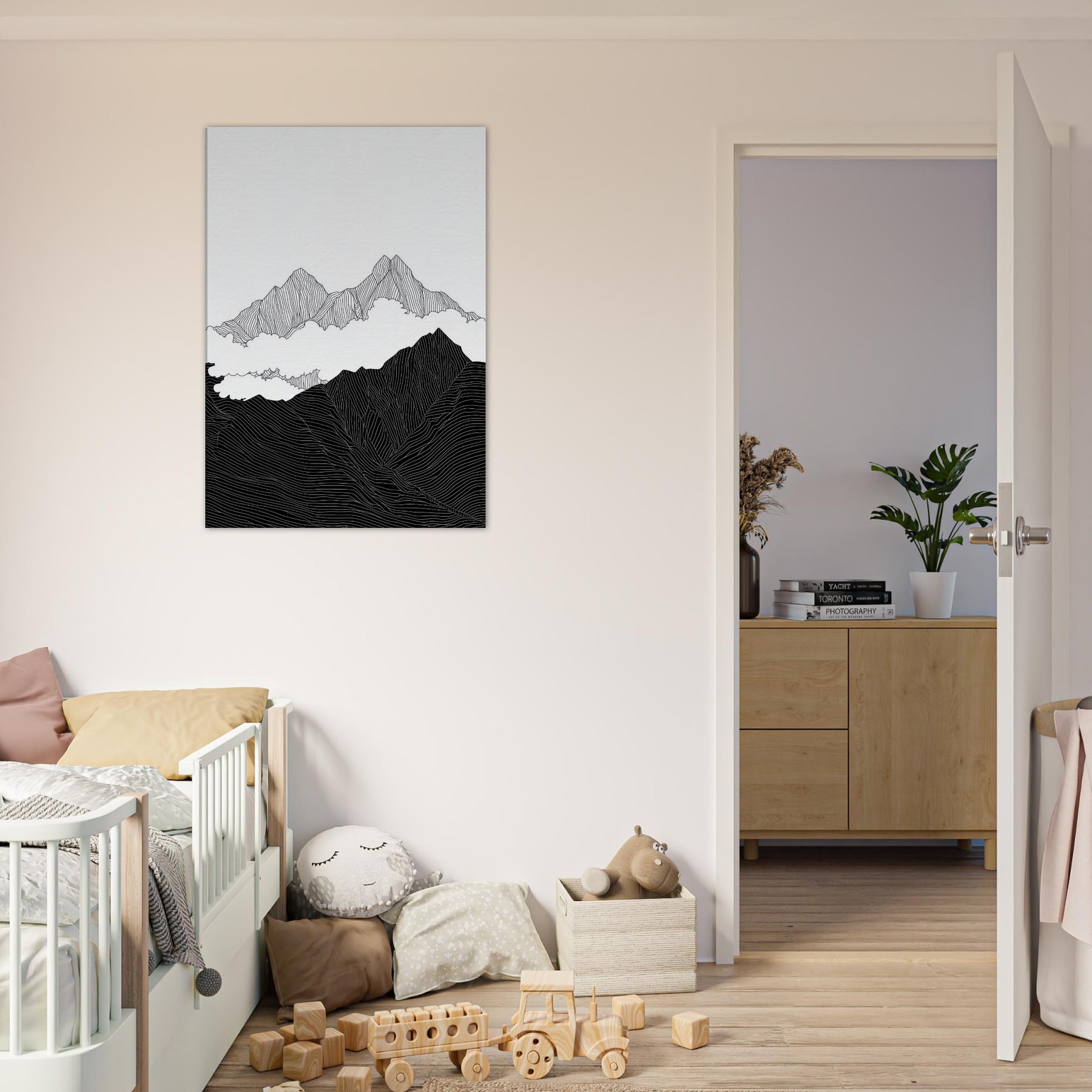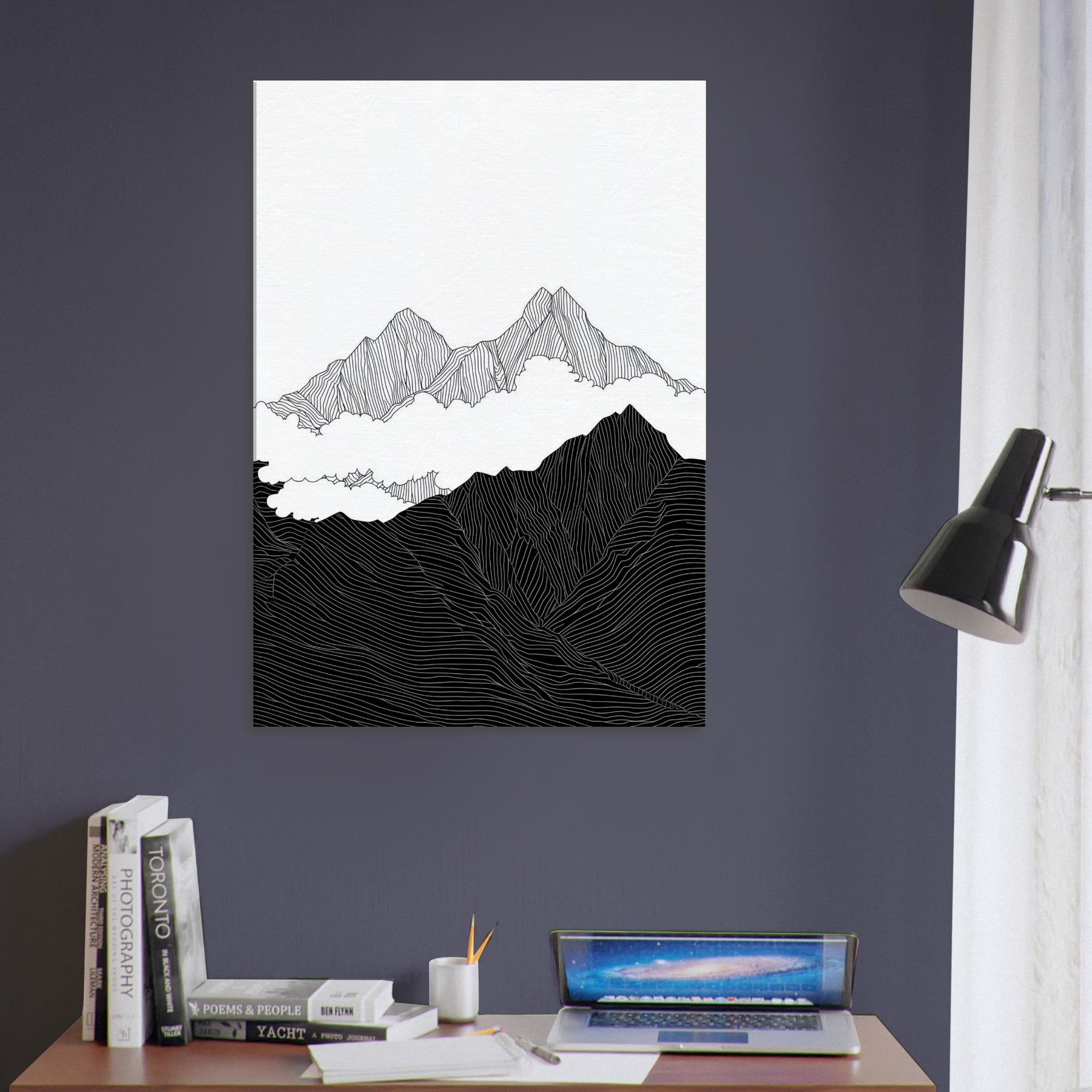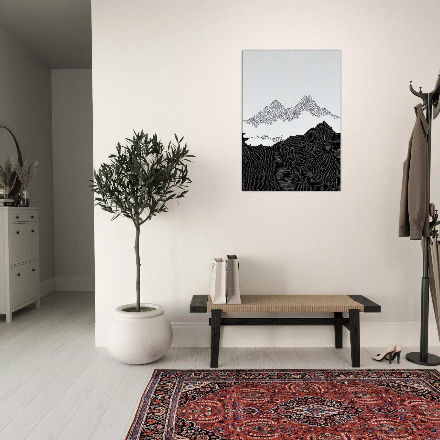 Mountains rise in elegant line work, a quiet ode to nature’s geometry. This minimalist study breathes a tranquil rhythm into any room, where each contour traces light and shadow with measured grace. The stark black lines against white space evoke fresh air, open skies, and the hush before dawn. Hang it over a sofa or beside a desk to invite focus, depth, and a sense of ascent. The mountains become a living backdrop, calming the mood while sharpening the eye and inspiring quiet, thoughtful moments.