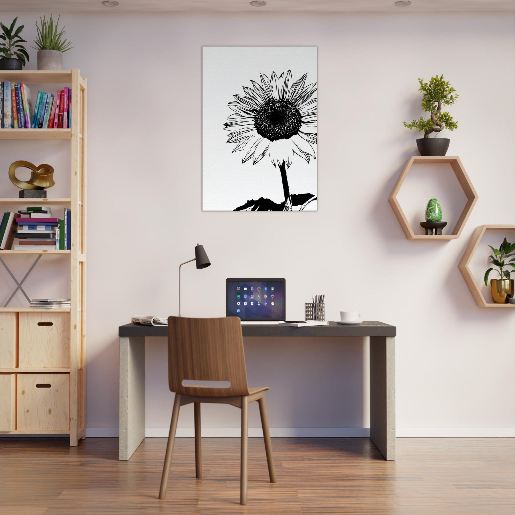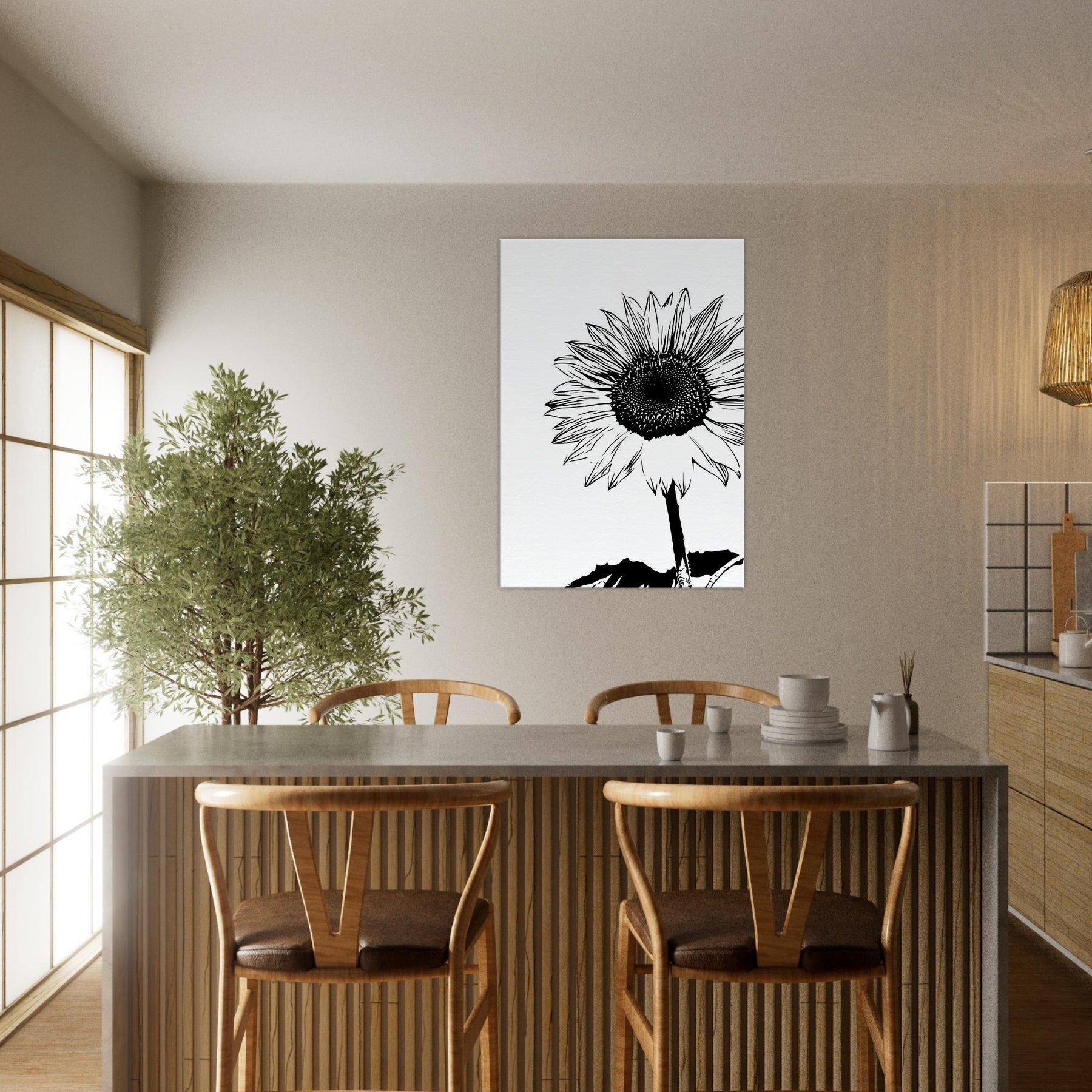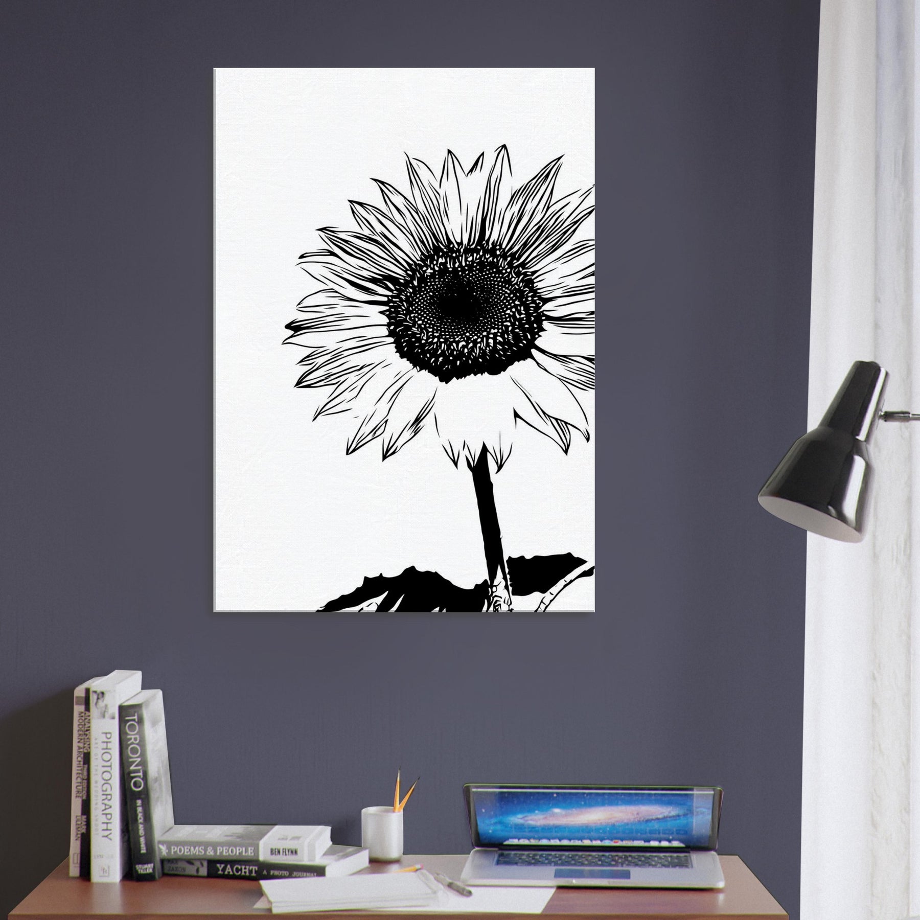 Elegant in black and white, this Sunflower line art captures a bold, minimalist heartbeat of nature. The slender stem rises with quiet resolve, while the radiating petals unfold like sunlit chatter against a clean canvas. Hang it in a living room or bedroom to invite morning light, calm focus, and a moment of wild, botanical simplicity. Its contrast free silhouette lends timeless chic to contemporary decor, pairing with wood, linen, or metal accents, turning walls into a serene field that still breathes.