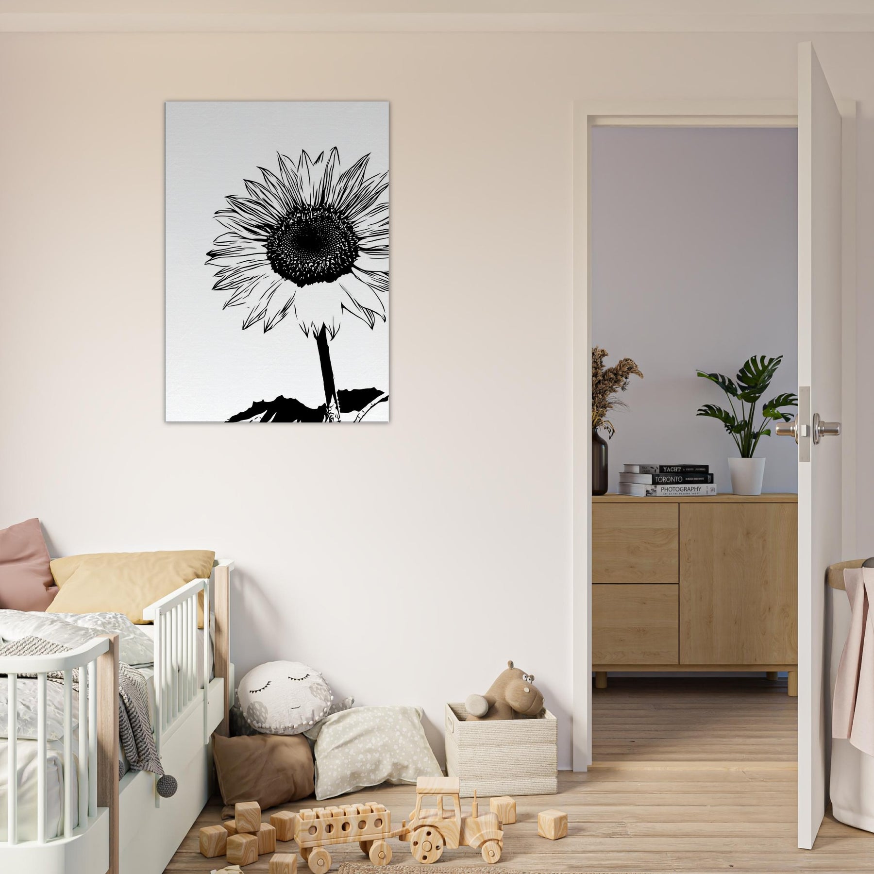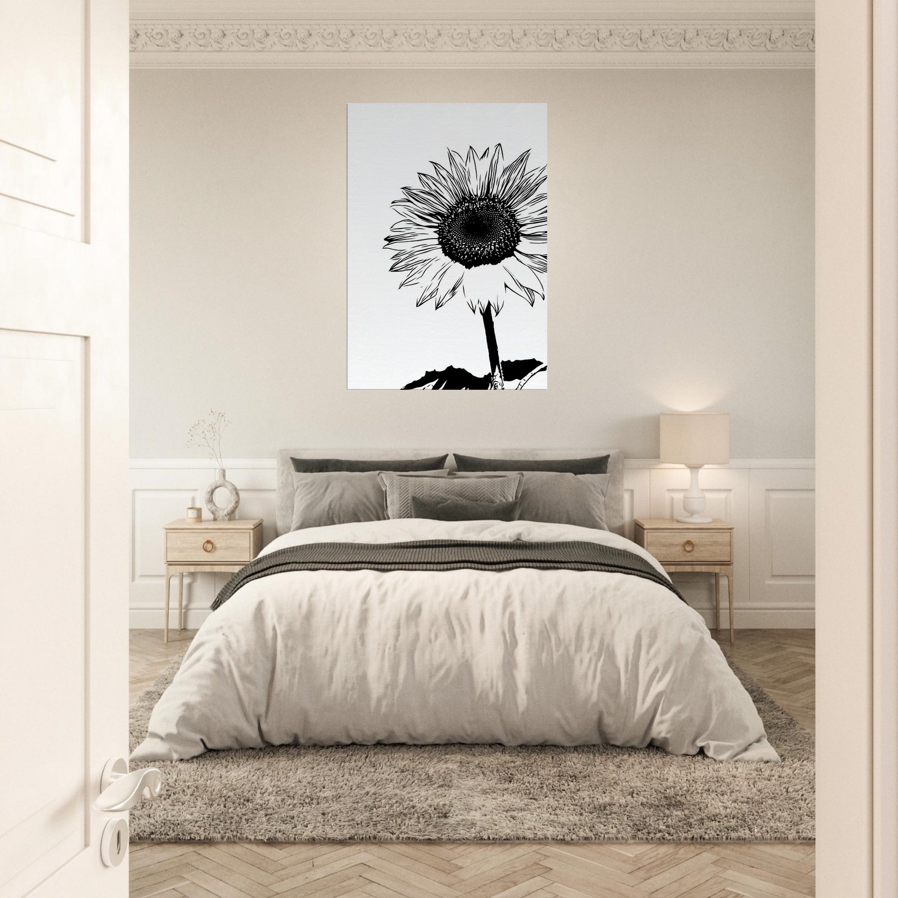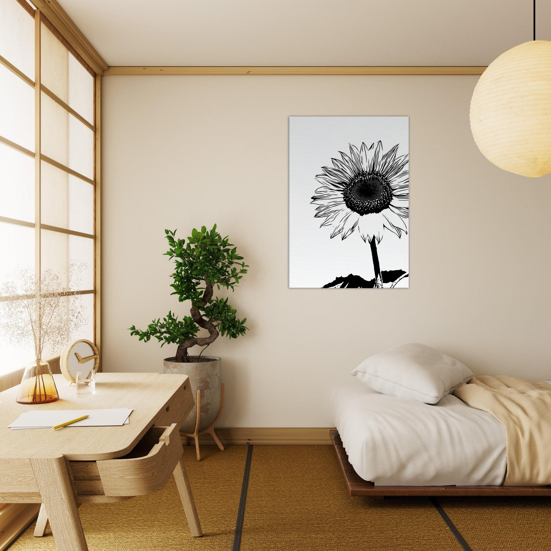 Elegant in black and white, this Sunflower line art captures a bold, minimalist heartbeat of nature. The slender stem rises with quiet resolve, while the radiating petals unfold like sunlit chatter against a clean canvas. Hang it in a living room or bedroom to invite morning light, calm focus, and a moment of wild, botanical simplicity. Its contrast free silhouette lends timeless chic to contemporary decor, pairing with wood, linen, or metal accents, turning walls into a serene field that still breathes.
