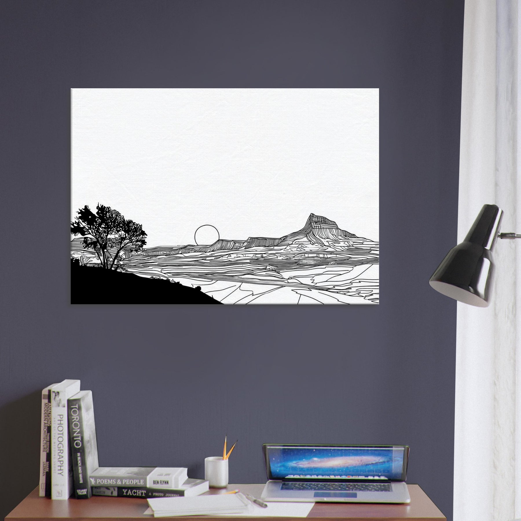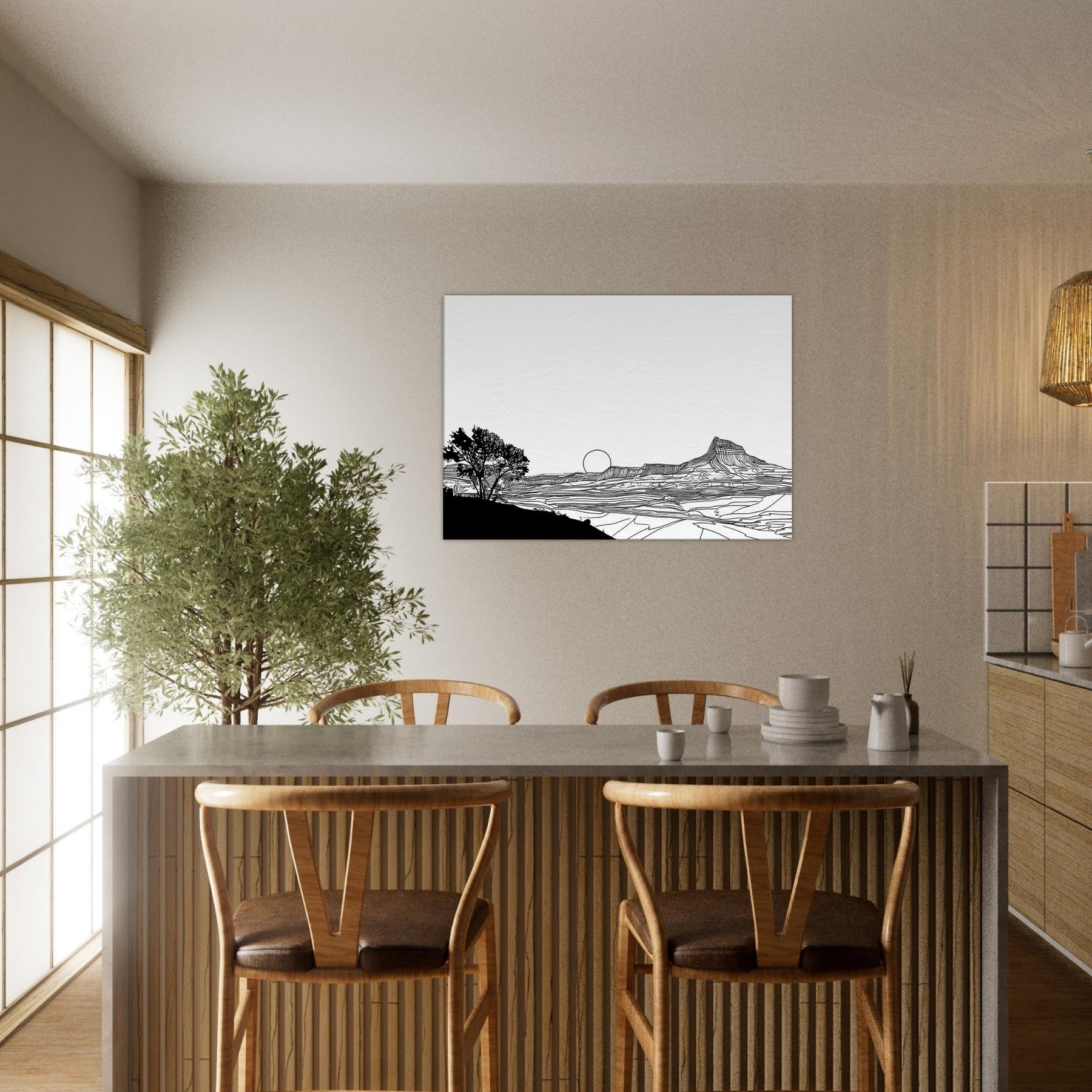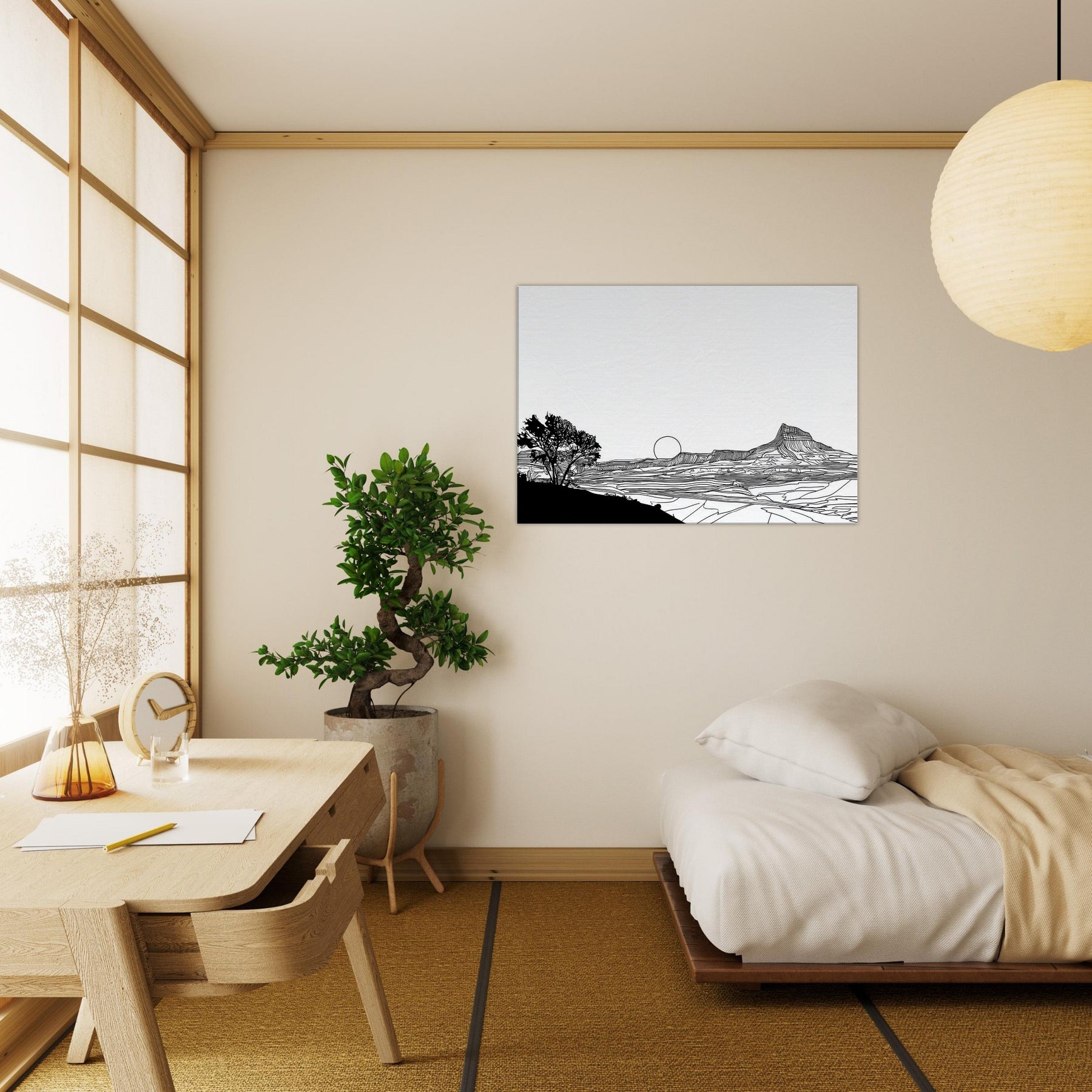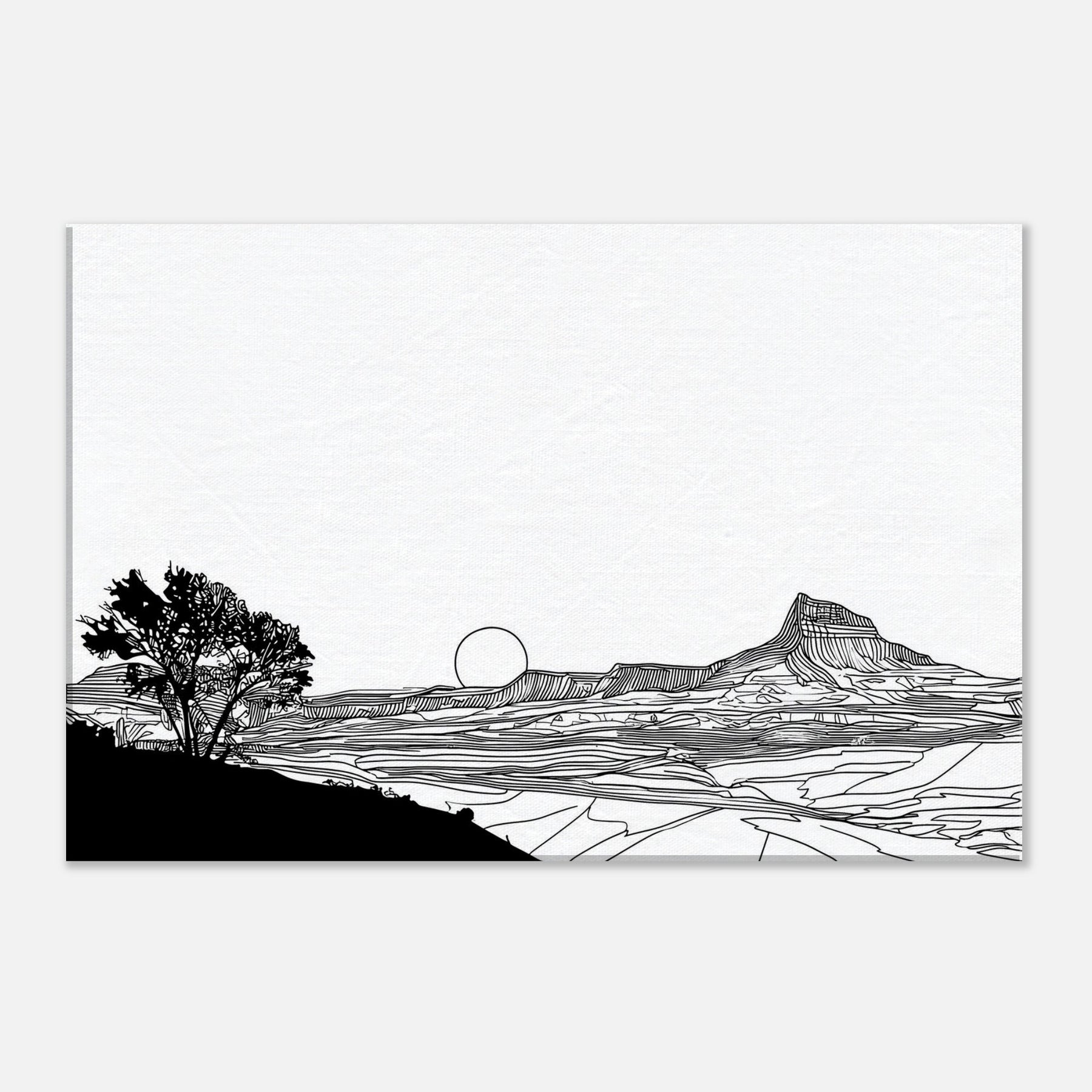 Let the quiet drama of a Sunset unfold in your living space. This line art dissolves into clean arcs and gentle contours, where a solitary tree anchors the foreground and a setting sun lingers on the horizon. The stark black lines against white space invites calm reflection, turning your wall into a window of quiet dusk. Perfect above a sofa or desk, it adds sophistication without shouting, inviting nature’s serenity to breathe through your home and soften modern interiors with timeless elegance.
