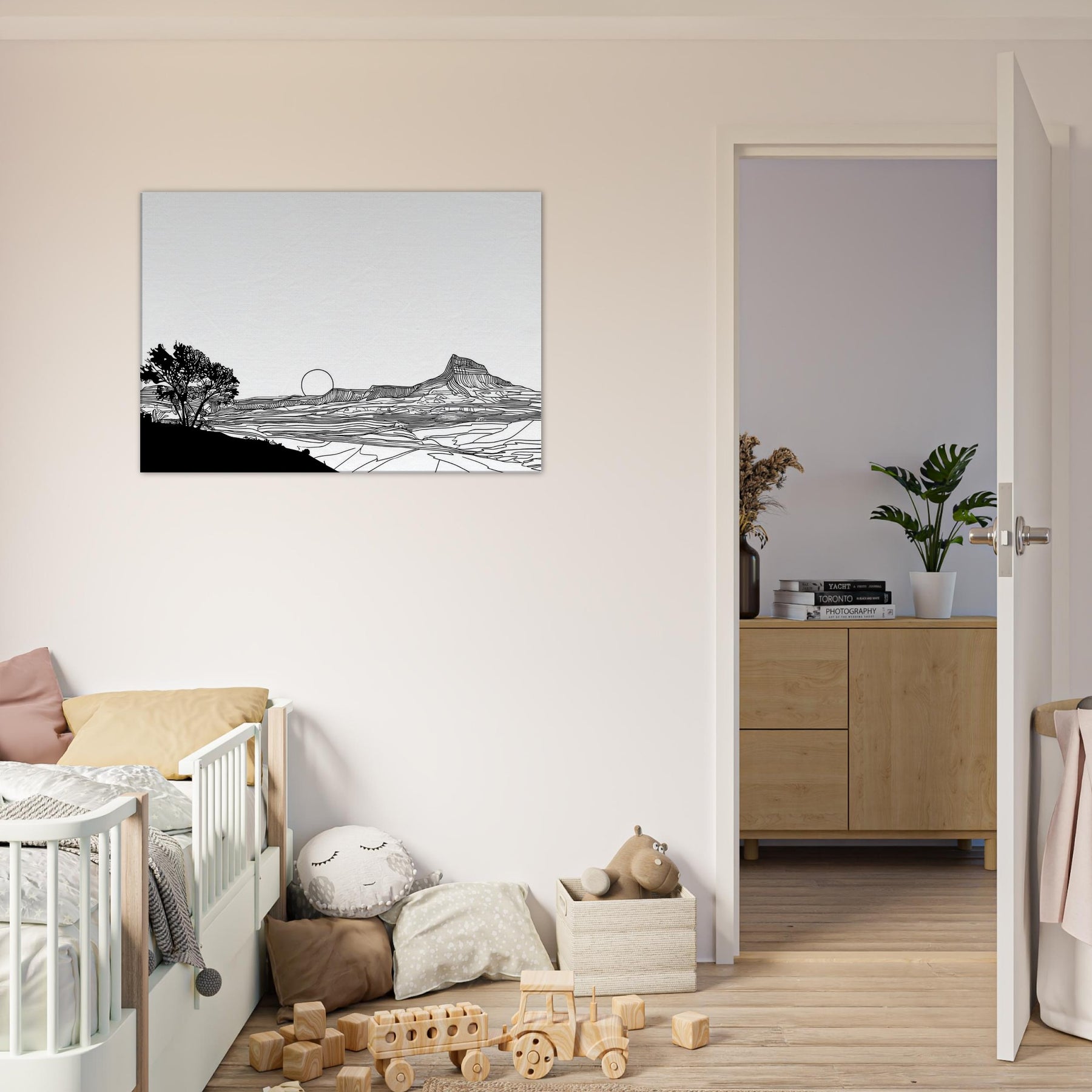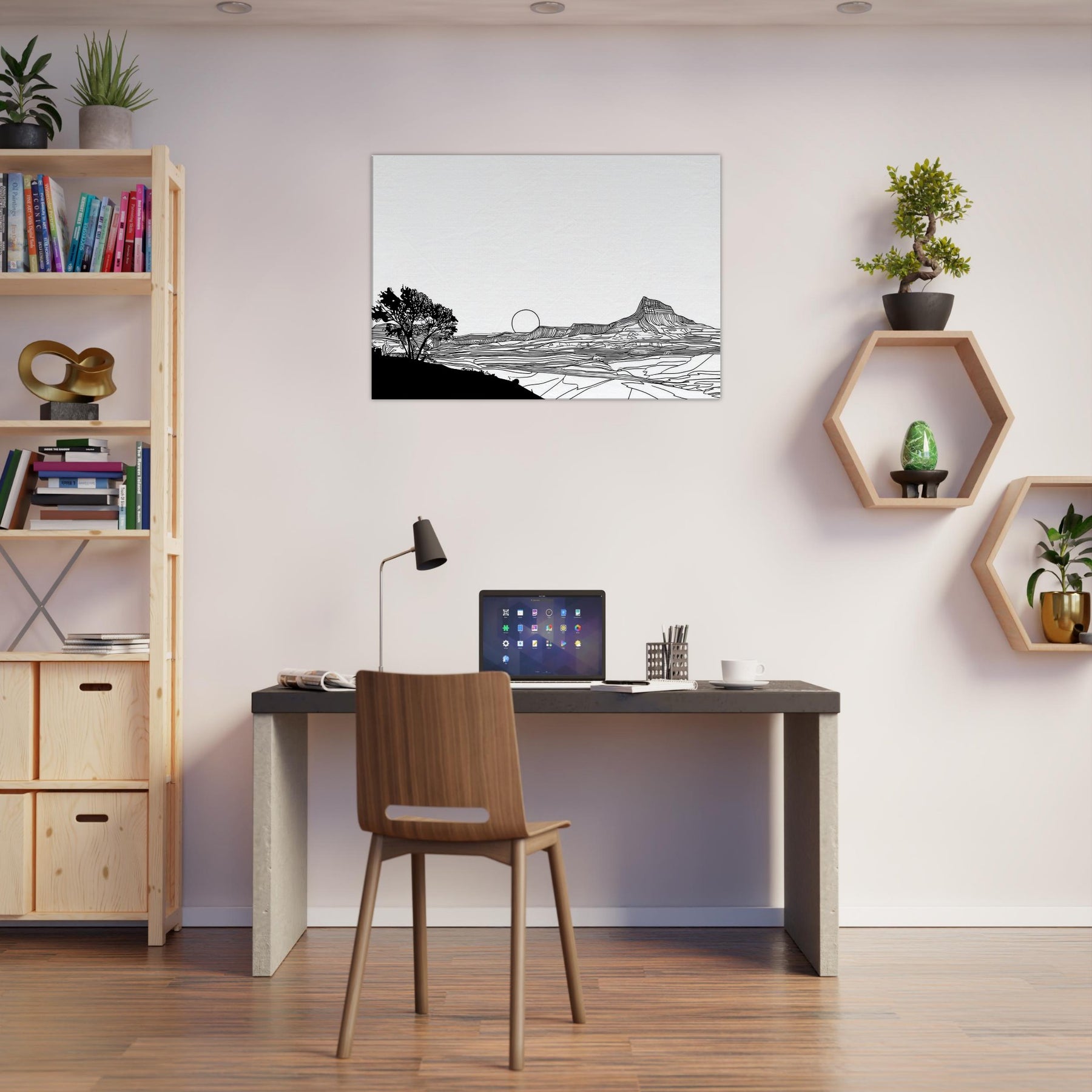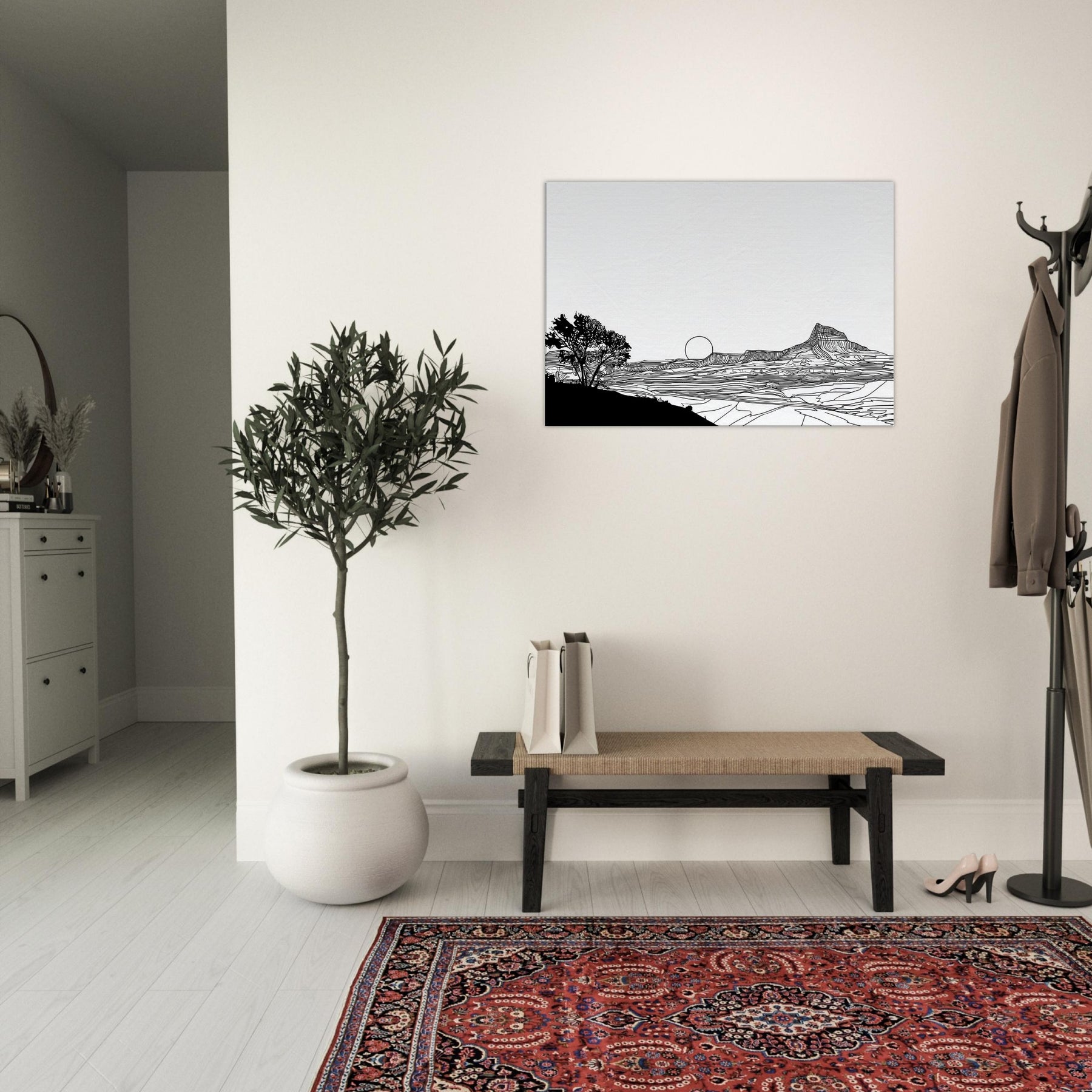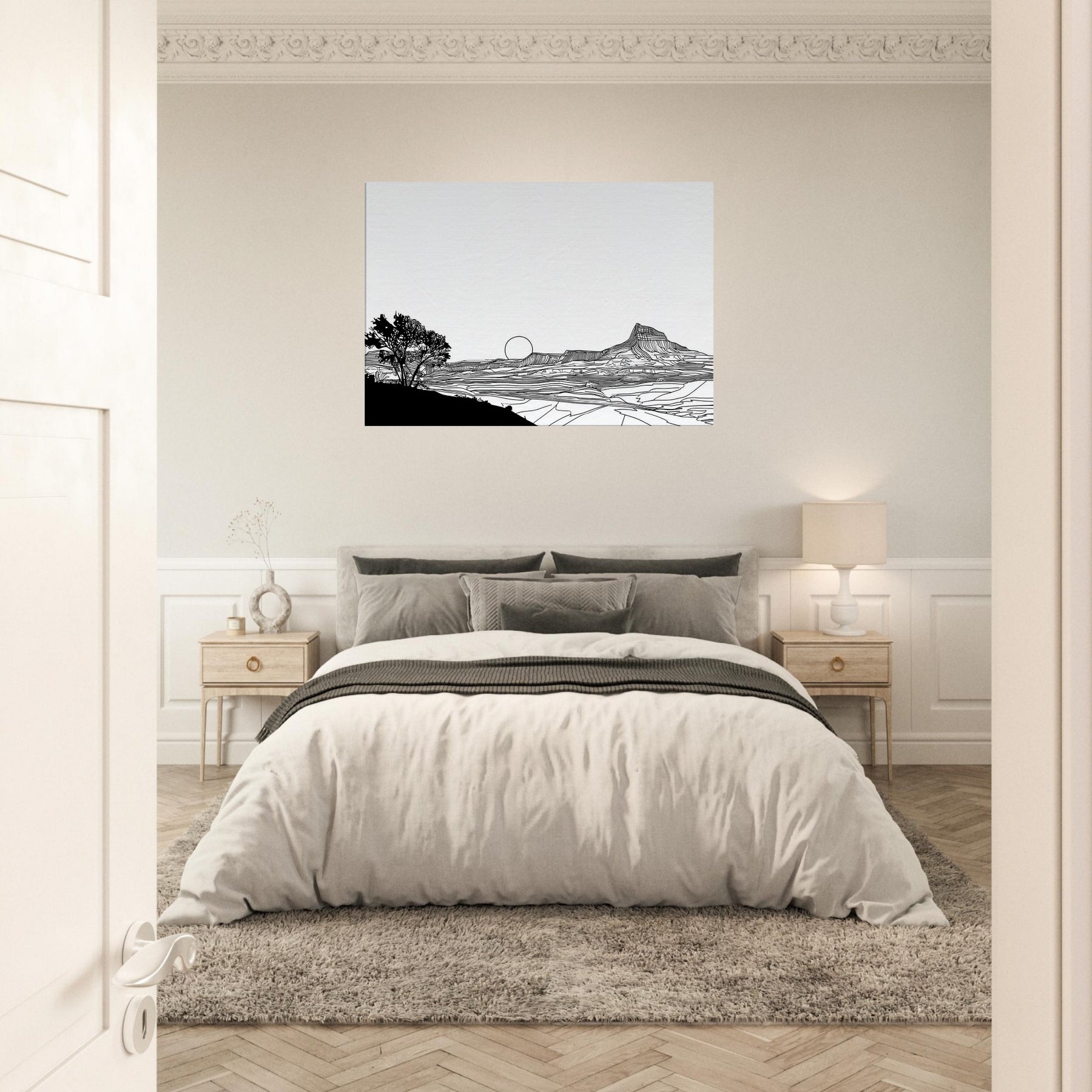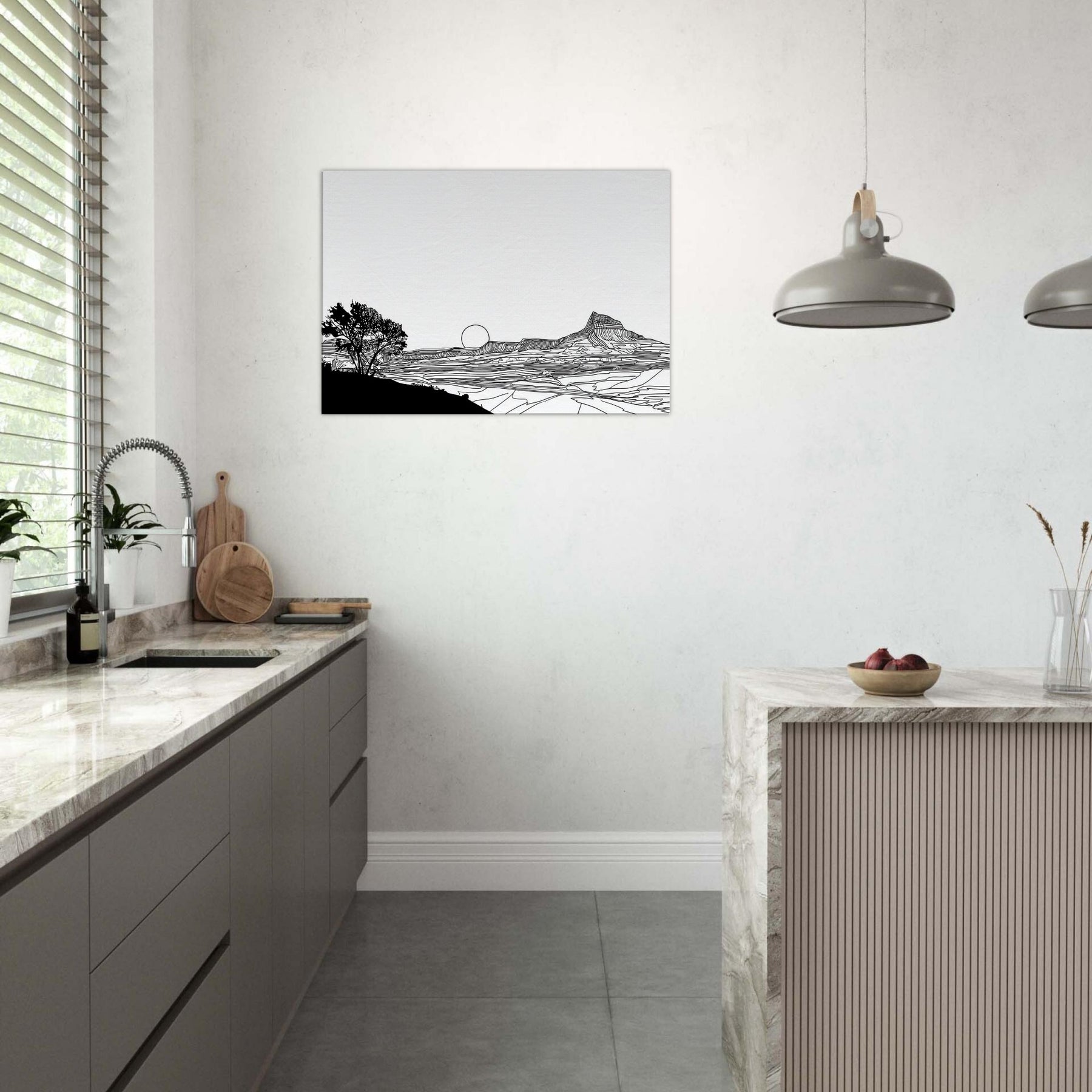 Let the quiet drama of a Sunset unfold in your living space. This line art dissolves into clean arcs and gentle contours, where a solitary tree anchors the foreground and a setting sun lingers on the horizon. The stark black lines against white space invites calm reflection, turning your wall into a window of quiet dusk. Perfect above a sofa or desk, it adds sophistication without shouting, inviting nature’s serenity to breathe through your home and soften modern interiors with timeless elegance.