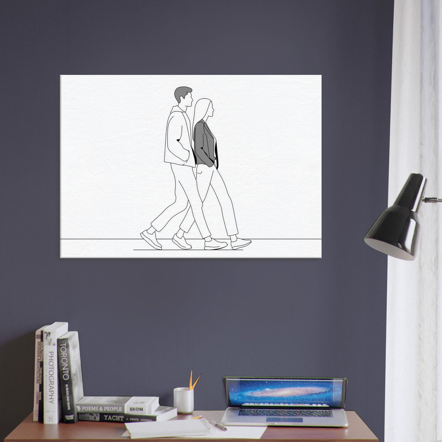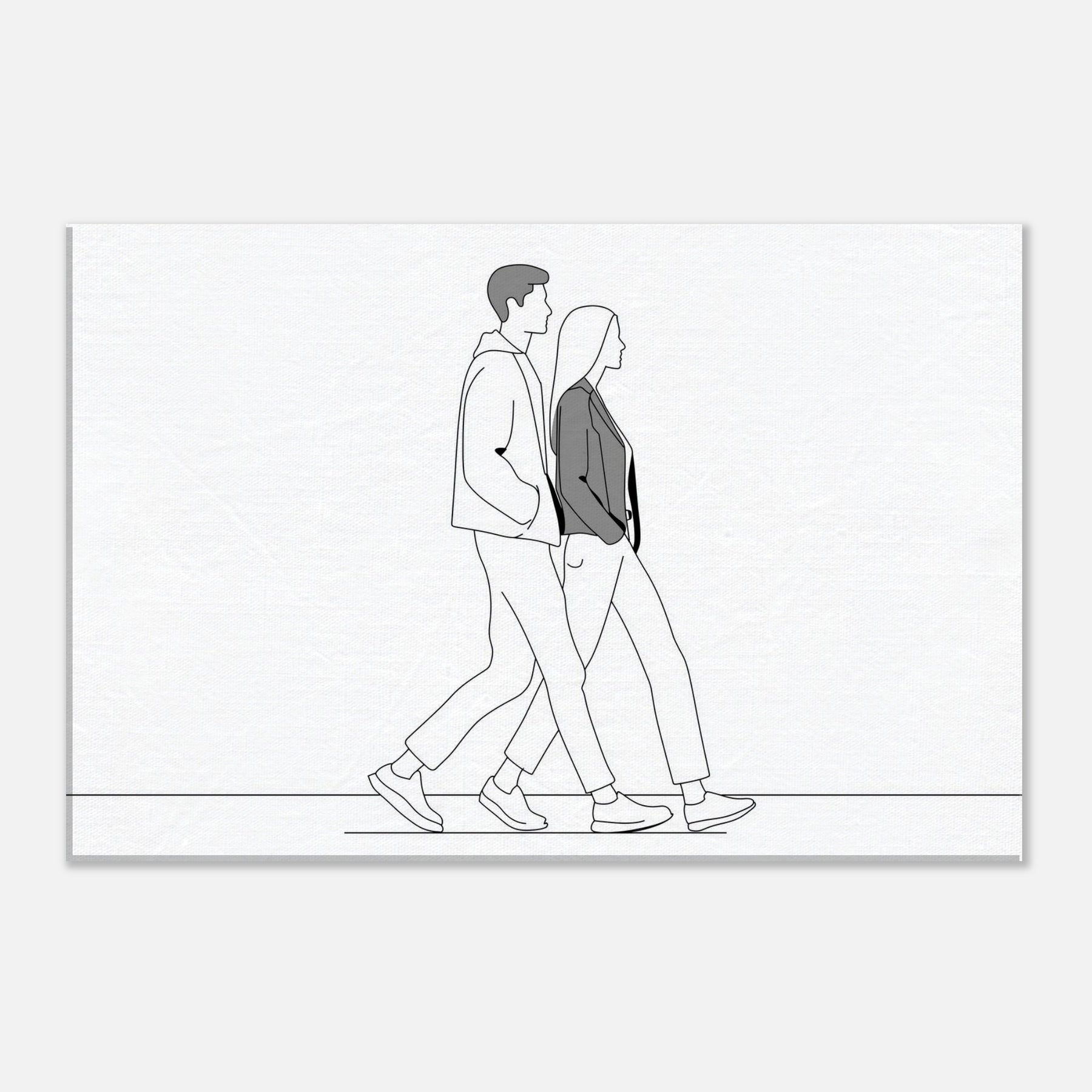 A poised, pared down line drawing captures a Couple Walking, their forms rendered in confident black lines with soft gray shading. The scene exudes calm momentum one step after another creating a minimalist narrative of companionship. It breathes a quiet sophistication into any living space, pairing with modern textiles and warm light. Perfect for a hall, bedroom, or study, this artwork invites reflection and everyday elegance.