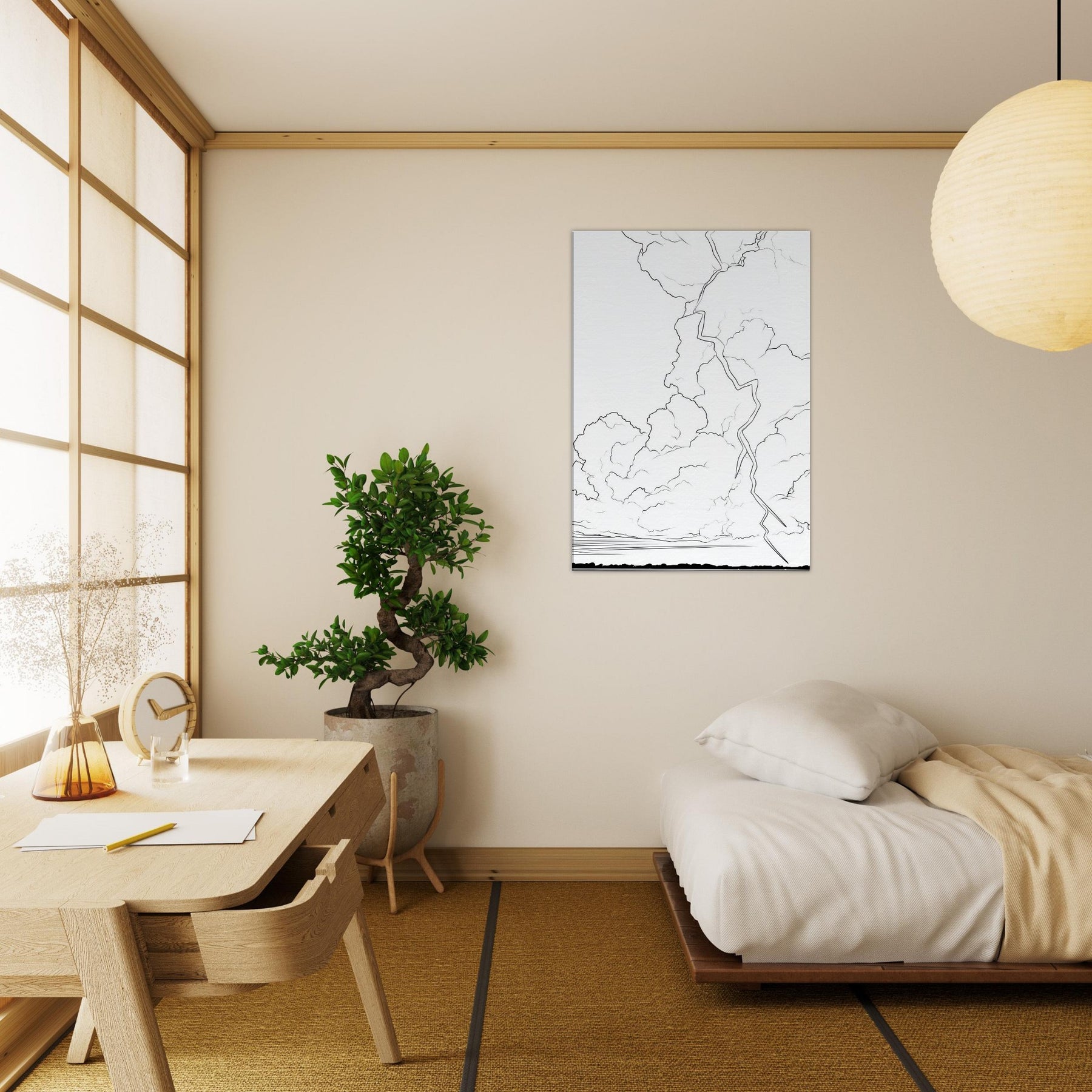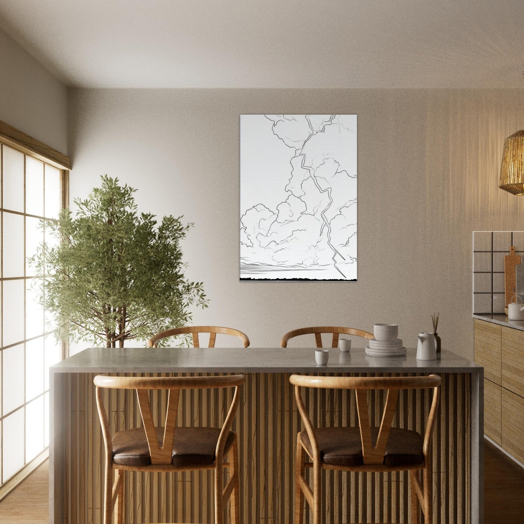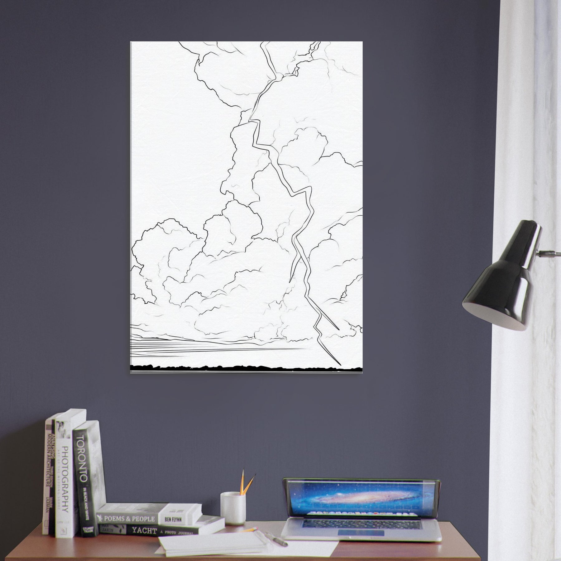 Rendered in precise, uninterrupted lines, this Thunderstorm morphs weather into a study in motion and restraint. The jagged lightning thread cuts through billowing clouds, inviting attention to the drama that hums just beyond the frame. Balanced on a wall, it brings a cool, cinematic atmosphere to any living space calm after the storm, yet alive with energy. Pair it with soft textures and a monochrome palette to create a sanctuary that feels both powerful and serene.