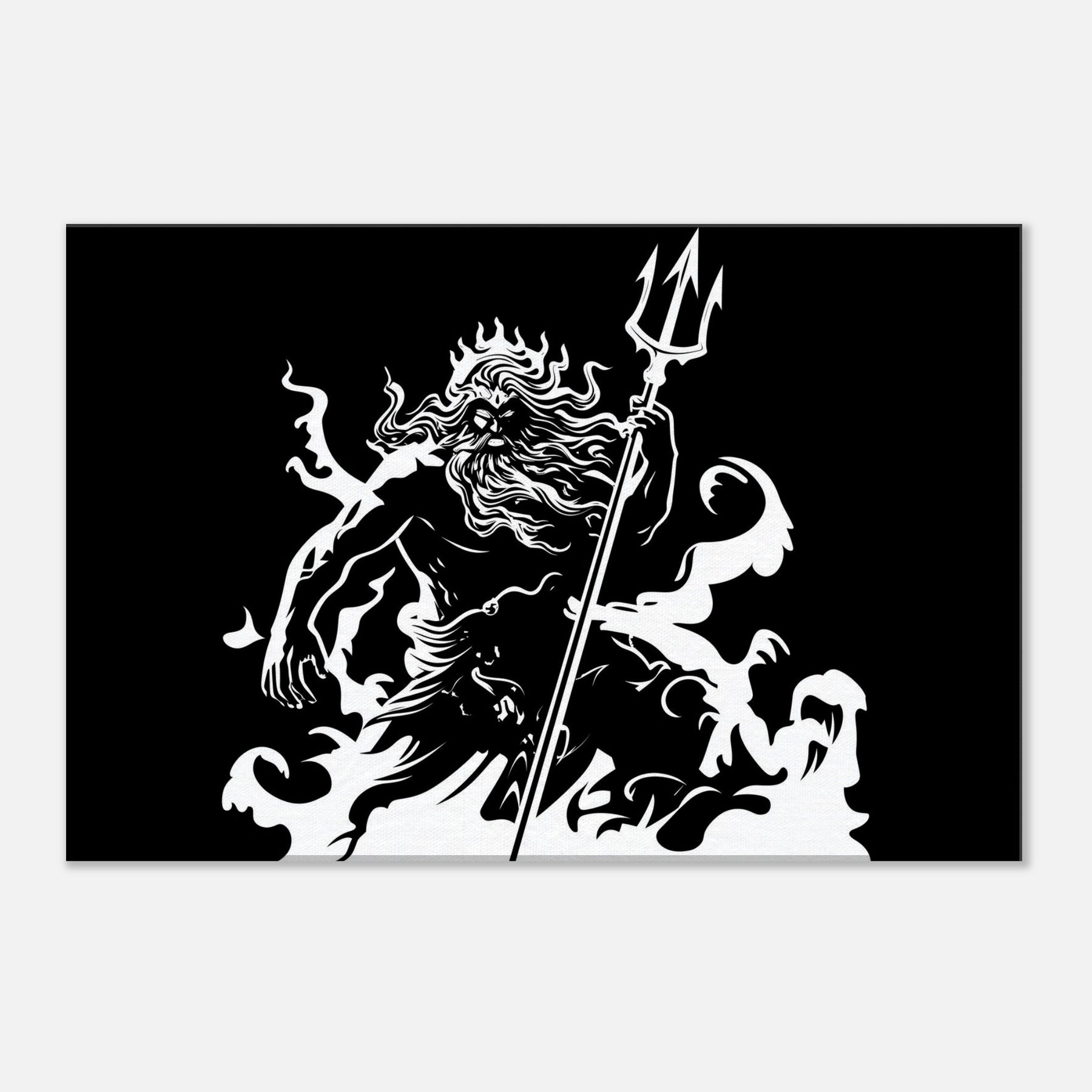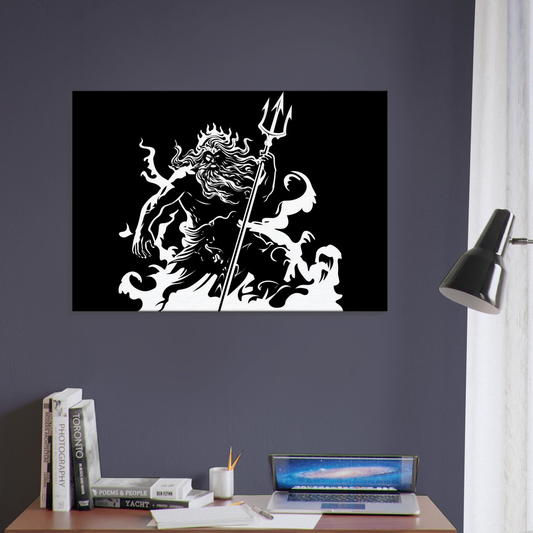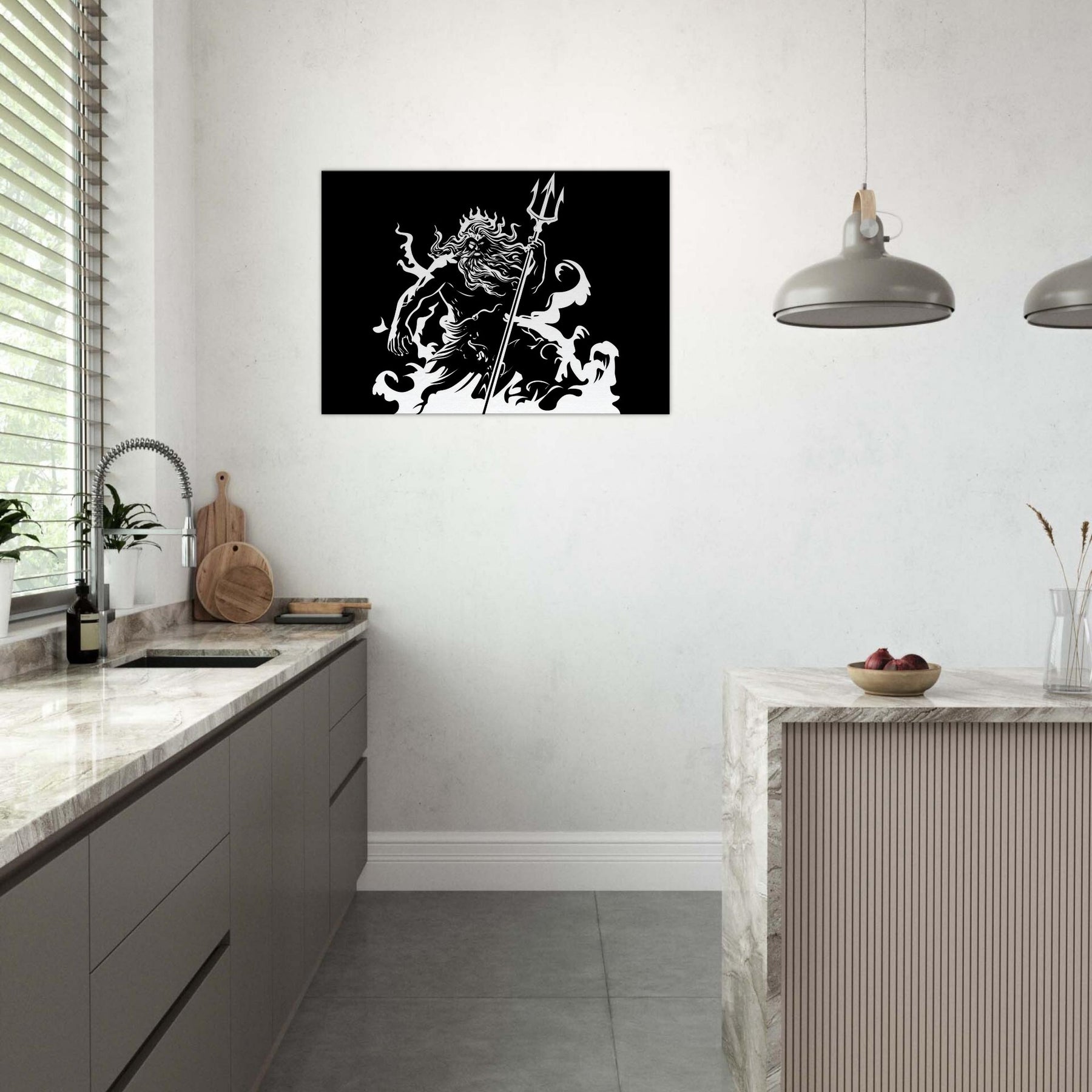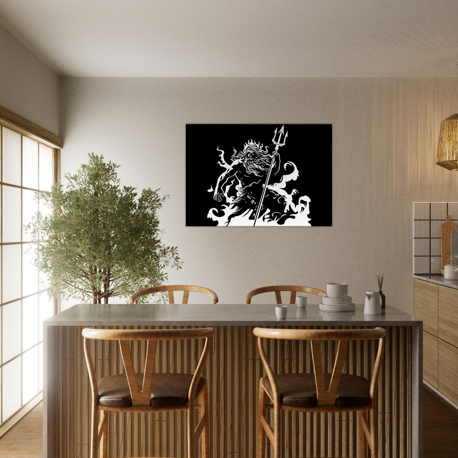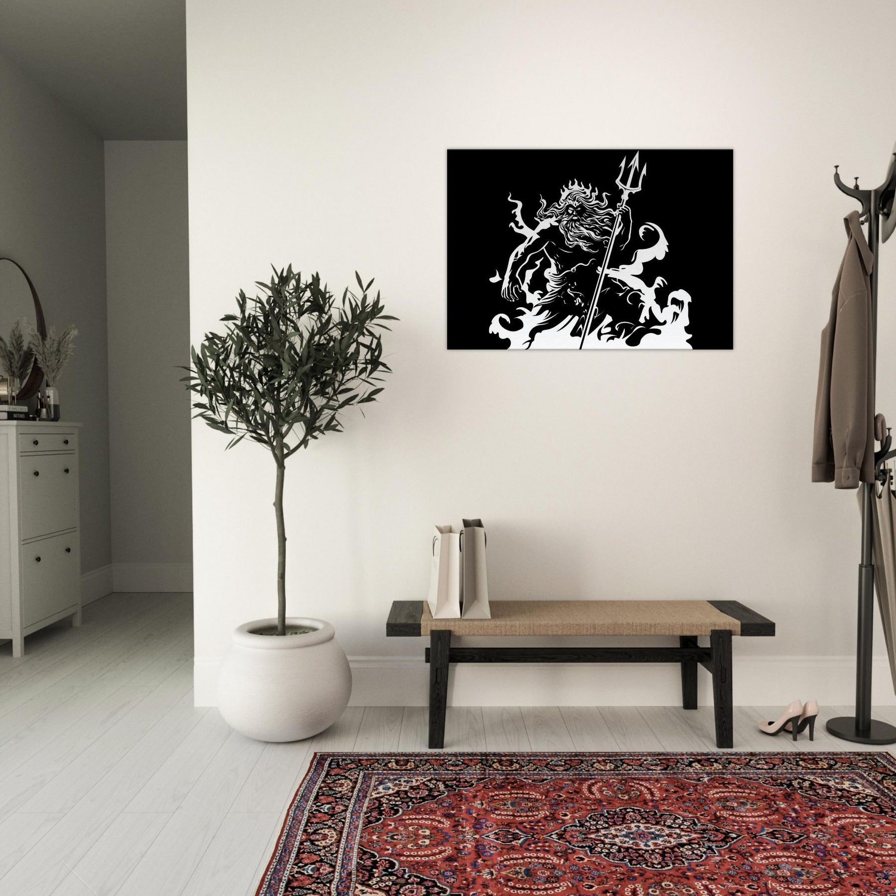Poseidon, God of the Sea and Storms, rises in bold line art, his trident cutting the air as inked waves surge at his feet. The stark black and white composition breathes motion and myth, inviting a meditative gaze that slows time in a busy room. This piece carries the pulse of tides and tempests into your living space, pairing clean, modern lines with ancient legend. Perfect above a sofa or in a study, it lends drama, depth, and a whisper of oceanic calm.