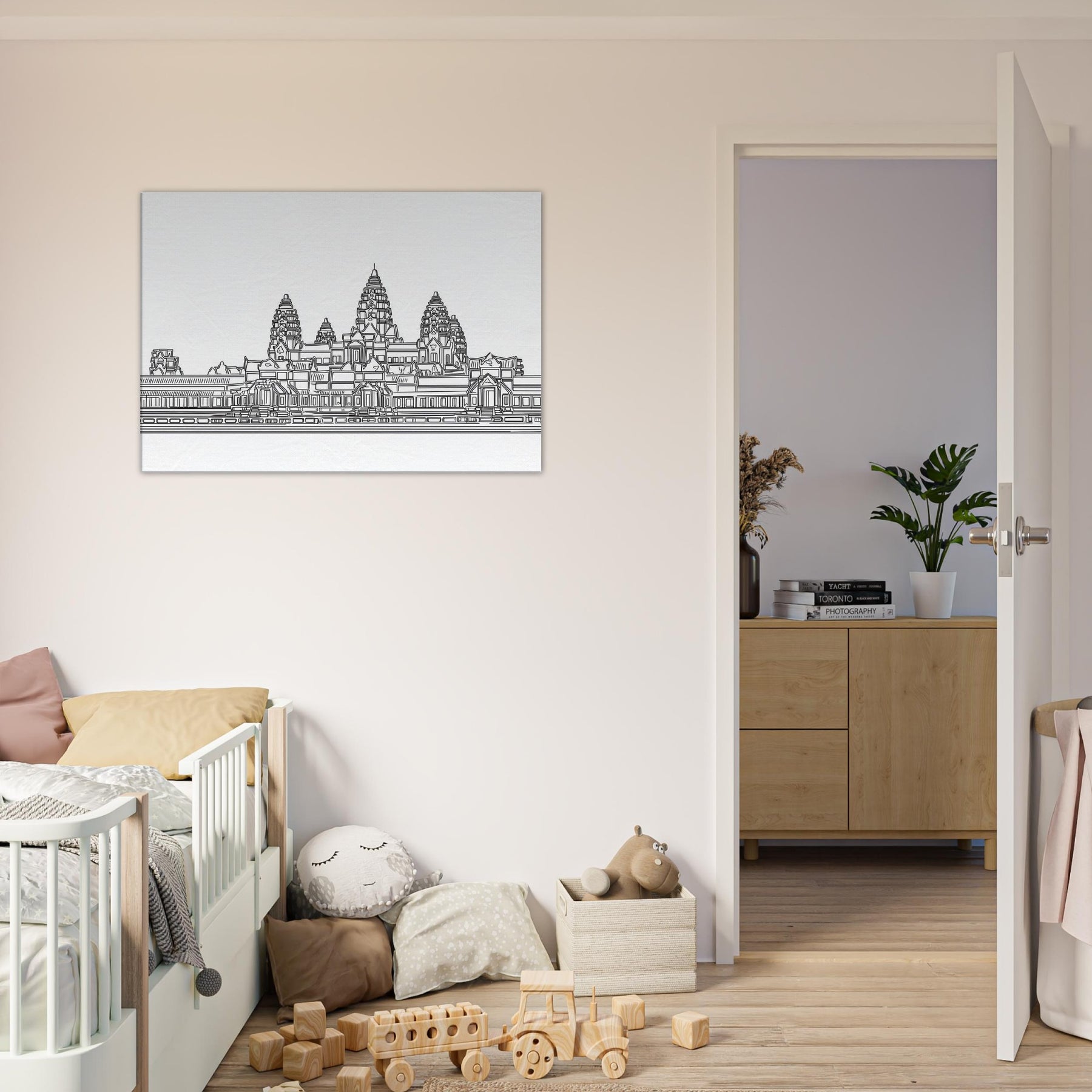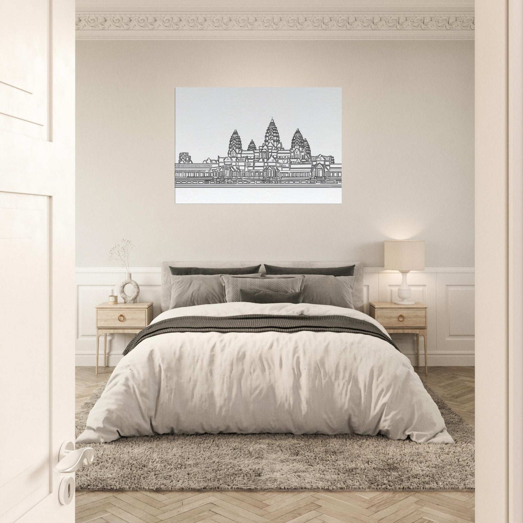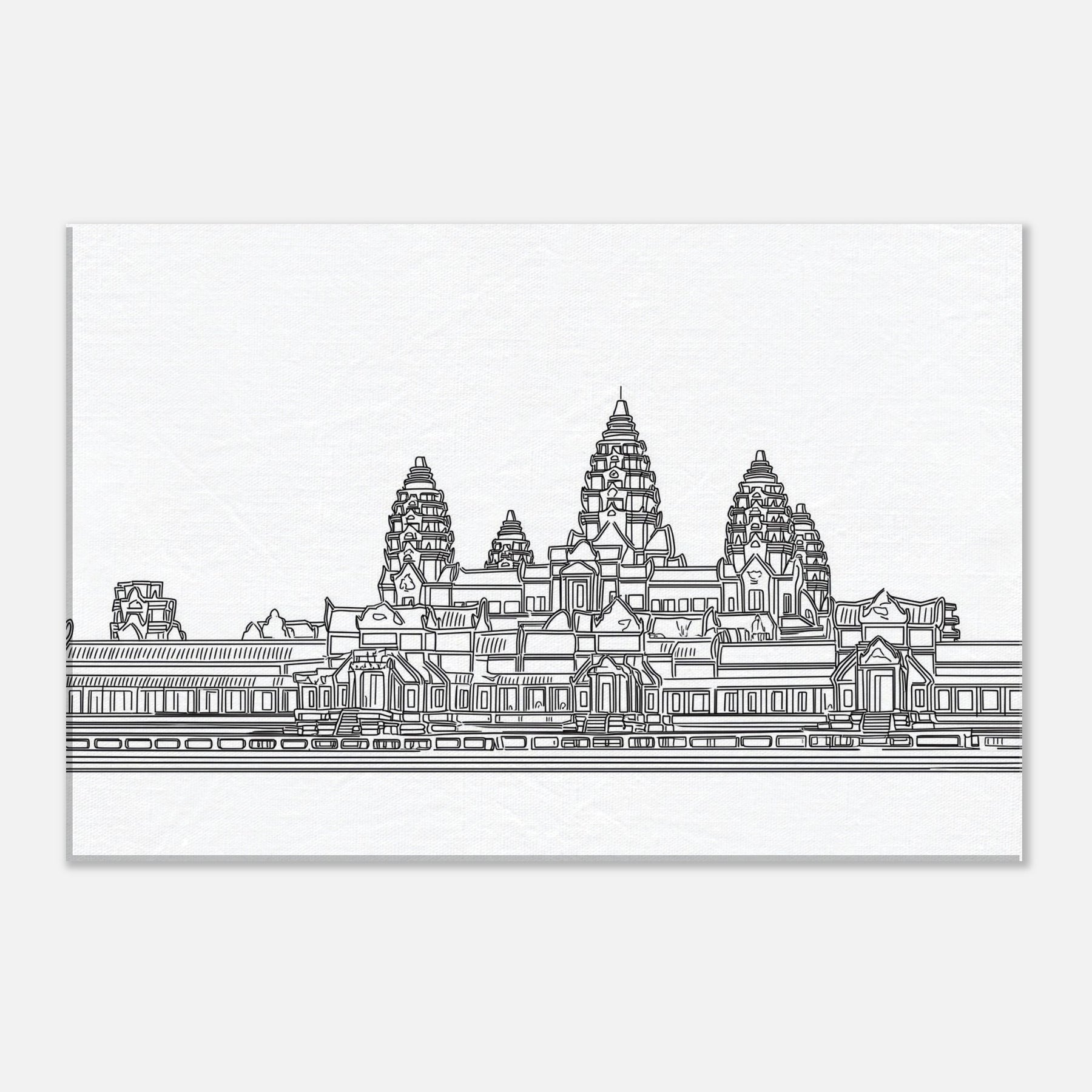 This line art rendering of Angkor Wat traces the temple's iconic towers with disciplined grace, where every contour becomes a whisper of stone and shadow. The clean, continuous lines invite the eye to travel from the reflective plane of the foreground into the spiritual heights, while the absence of color sharpens memory and breath. Hang this piece in a tranquil living space to evoke timeless horizons, quiet contemplation, and architectural travel, a refined invitation to wander within home light and silhouettes.