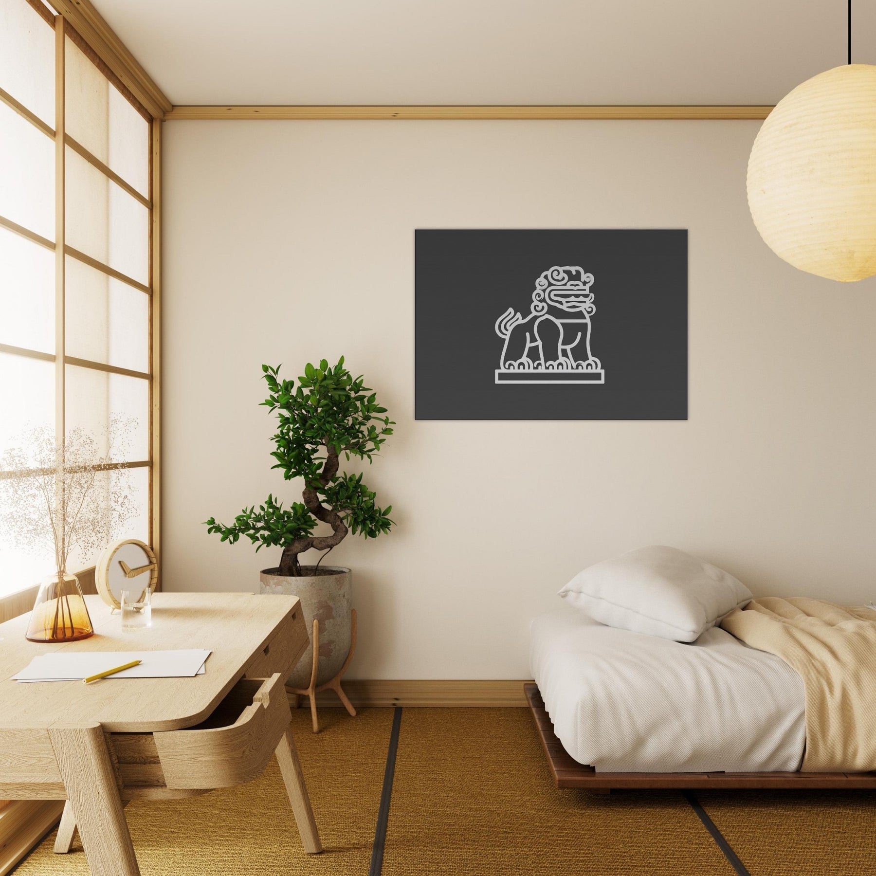 Step into a quiet mythos where tradition meets contemporary line work. This piece centers the Asian Guardian Lion guarding a temple gate, its curling mane and bold silhouette captured in clean white line on a deep charcoal field. The rhythm of the strokes evokes ancient courtyards, incense smoke, and distant bells, while the stark simplicity adds modern calm. Perfect for a living room or study, it brings protection, reverence, and subtle wonder an invitation to pause, breathe, and dwell in timeless legend.