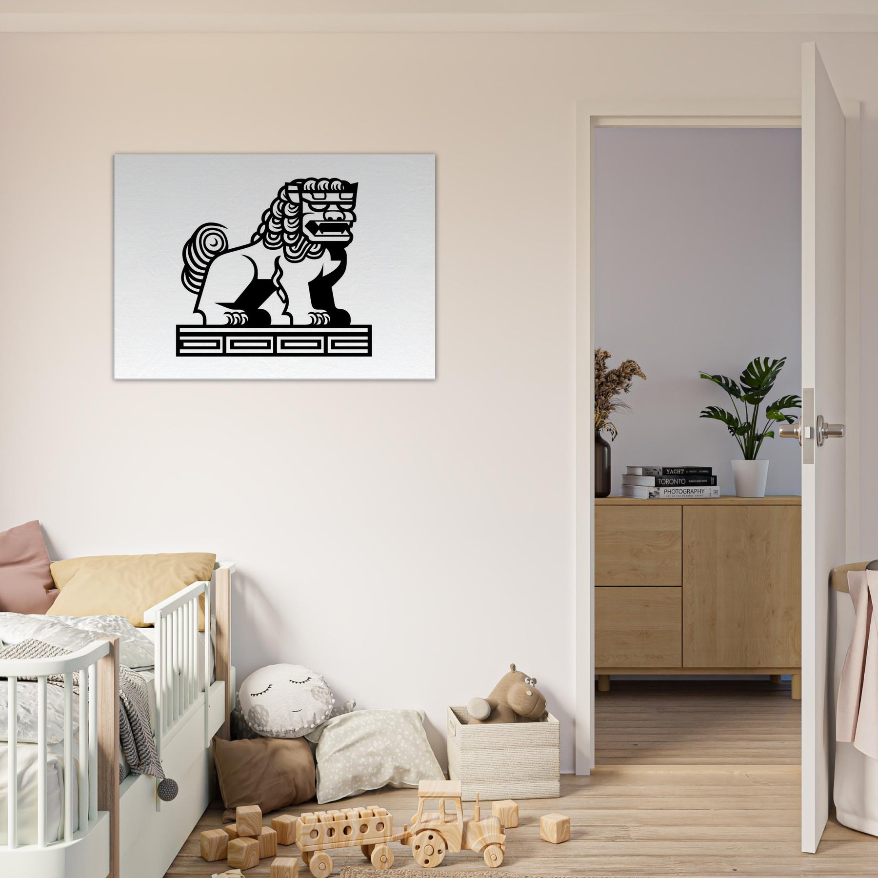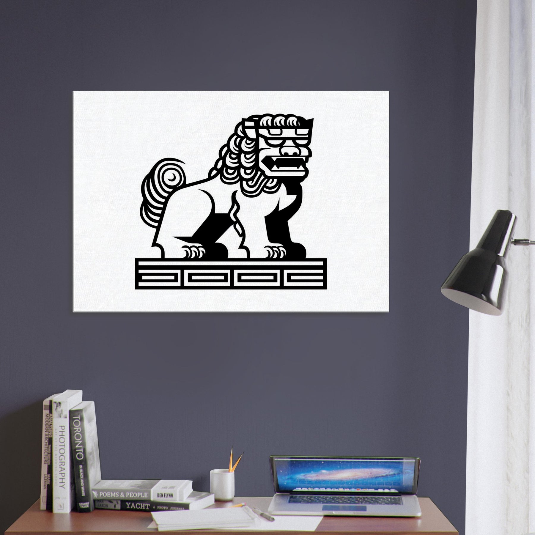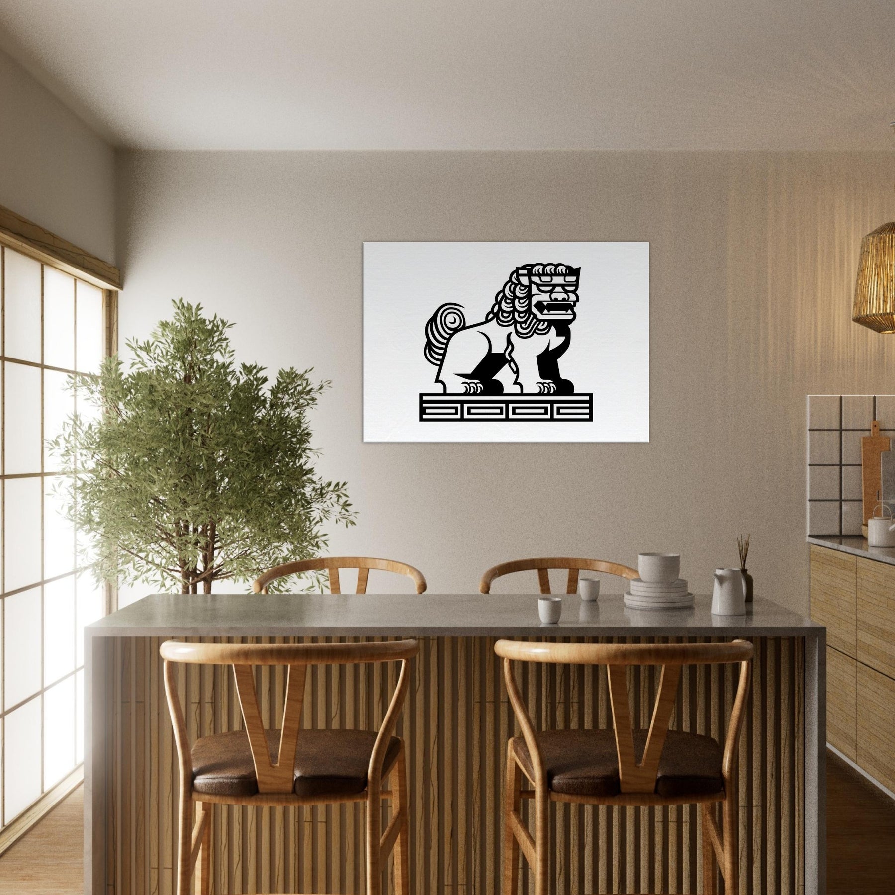 An inked breath of myth, this line art study centers the Asian Guardian Lion (Shishi or Foo Dog) Guarding A Temple Gate with quiet majesty. Bold, unbroken lines carve a temple guarding presence against pristine white, evoking lantern glow and stone scented air. In a living room or study, it brings a sense of protection and timeless myth, guiding conversations and calming the space with its ceremonial poise and elegant restraint.